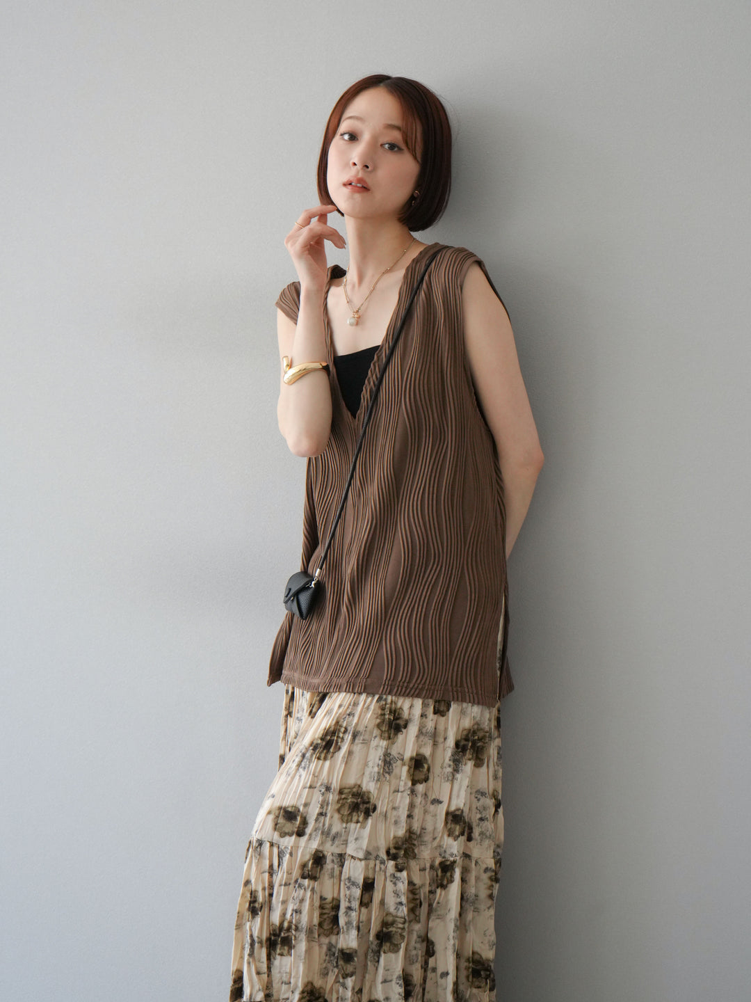[SET]ウェーブパイピングVネックベスト+シフォンフレアスカート(2set)