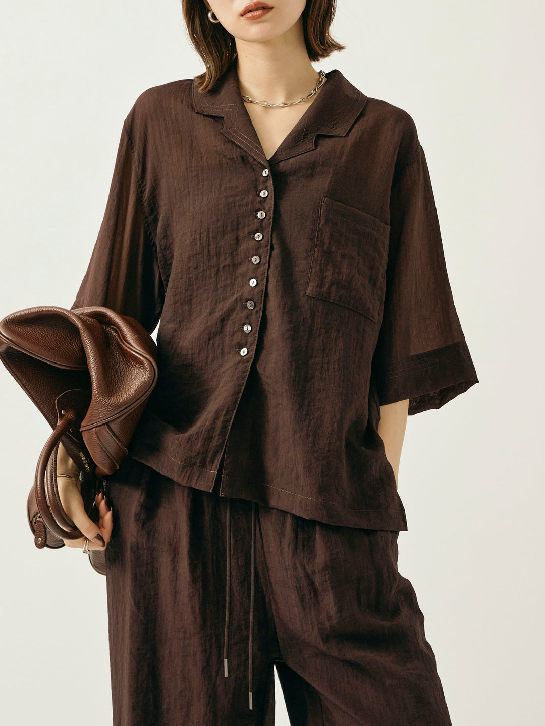 【Allure】[SET]シャイニースラブシアー開襟ハーフシャツ+シャイニースラブシアーワイドパンツ(2set)