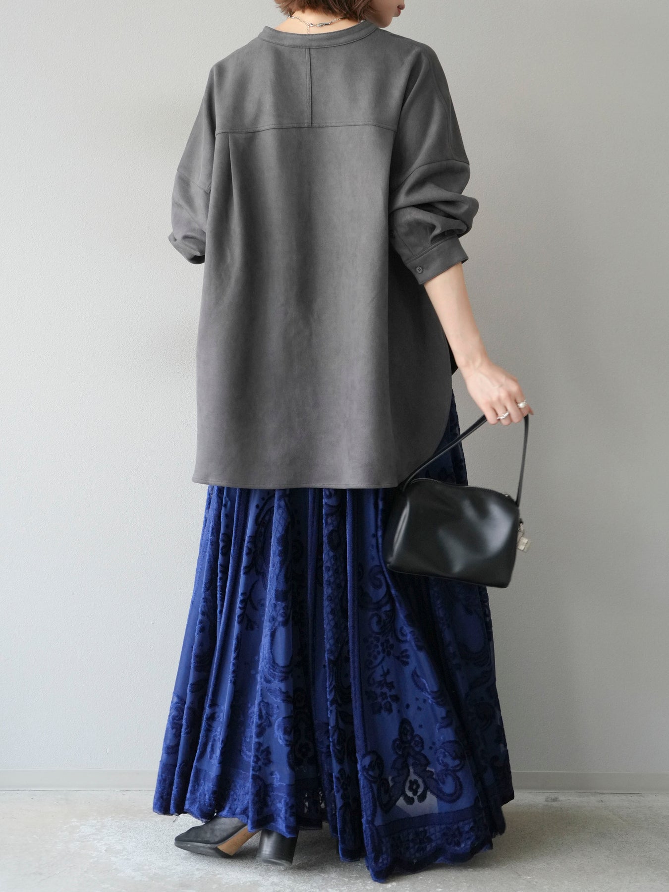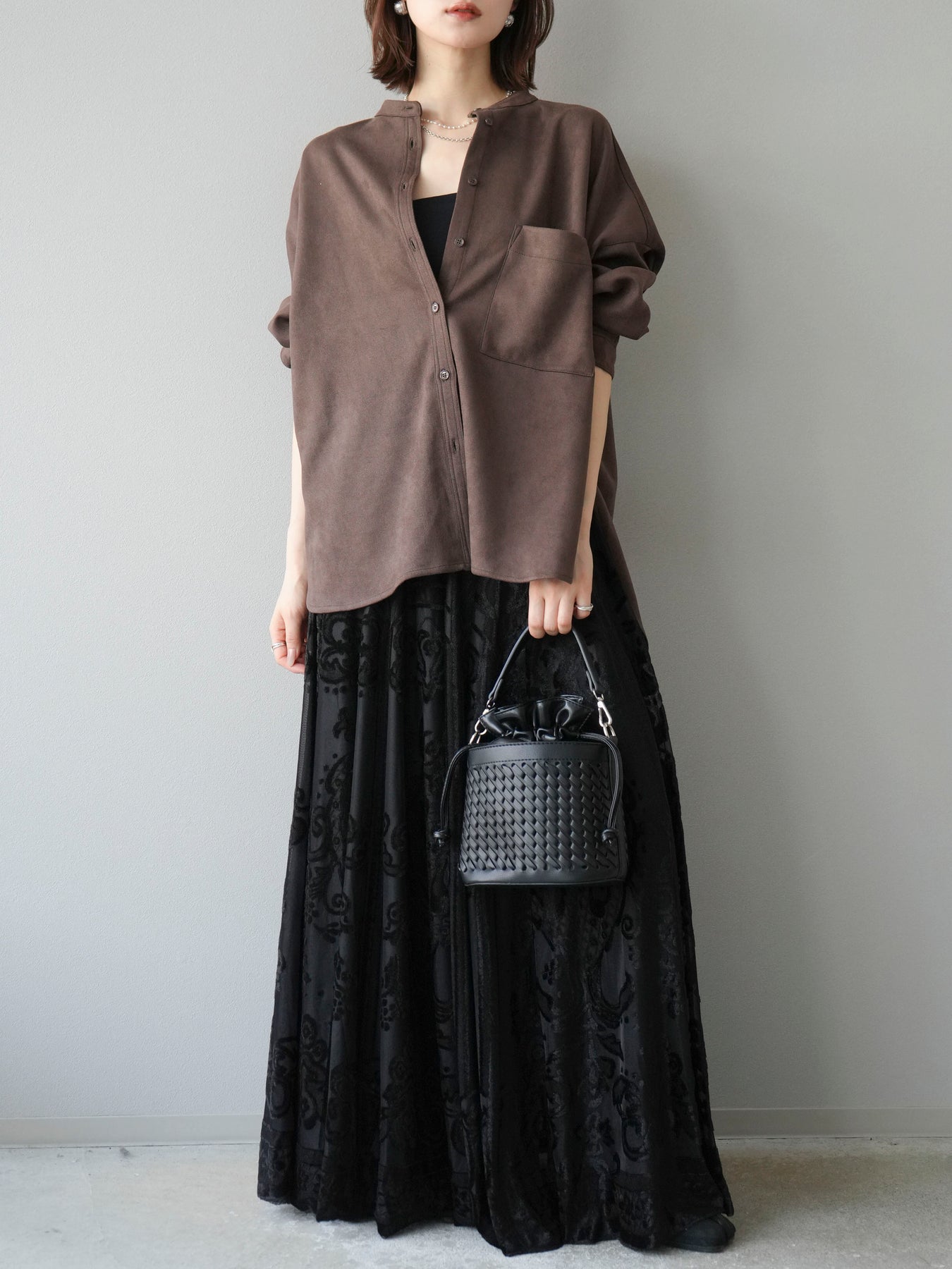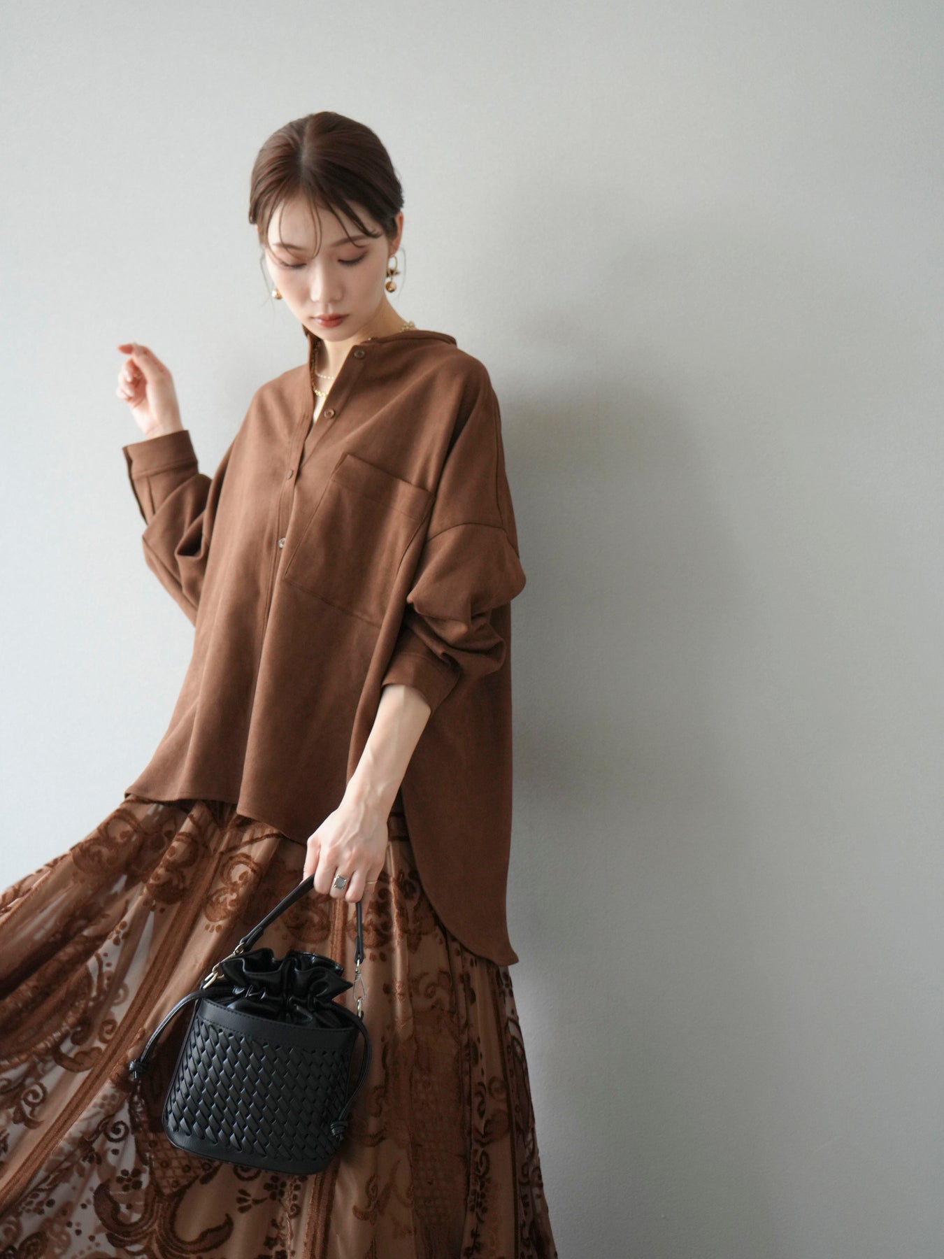 しっとりとしたスエードタッチ素材を使用したバンドカラーオーバーシャツ。柔らかな質感とマットな風合いが上品さを引き立て、カジュアルながらも大人っぽい印象に仕上げます。ゆったりとしたシルエットとドロップショルダーがリラックス感を演出し、抜け感のある着こなしが叶う一枚。前後差のある着丈で、パンツにもスカートにもバランスよく合わせられます。ボタンを閉じてトップス風に、羽織としてラフに着こなしてもサマになる、シーズンレスで活躍する万能アイテムです。 ※ボトムス、キャミソール(インナー)以外の商品は一律でインナーは付属していません。
