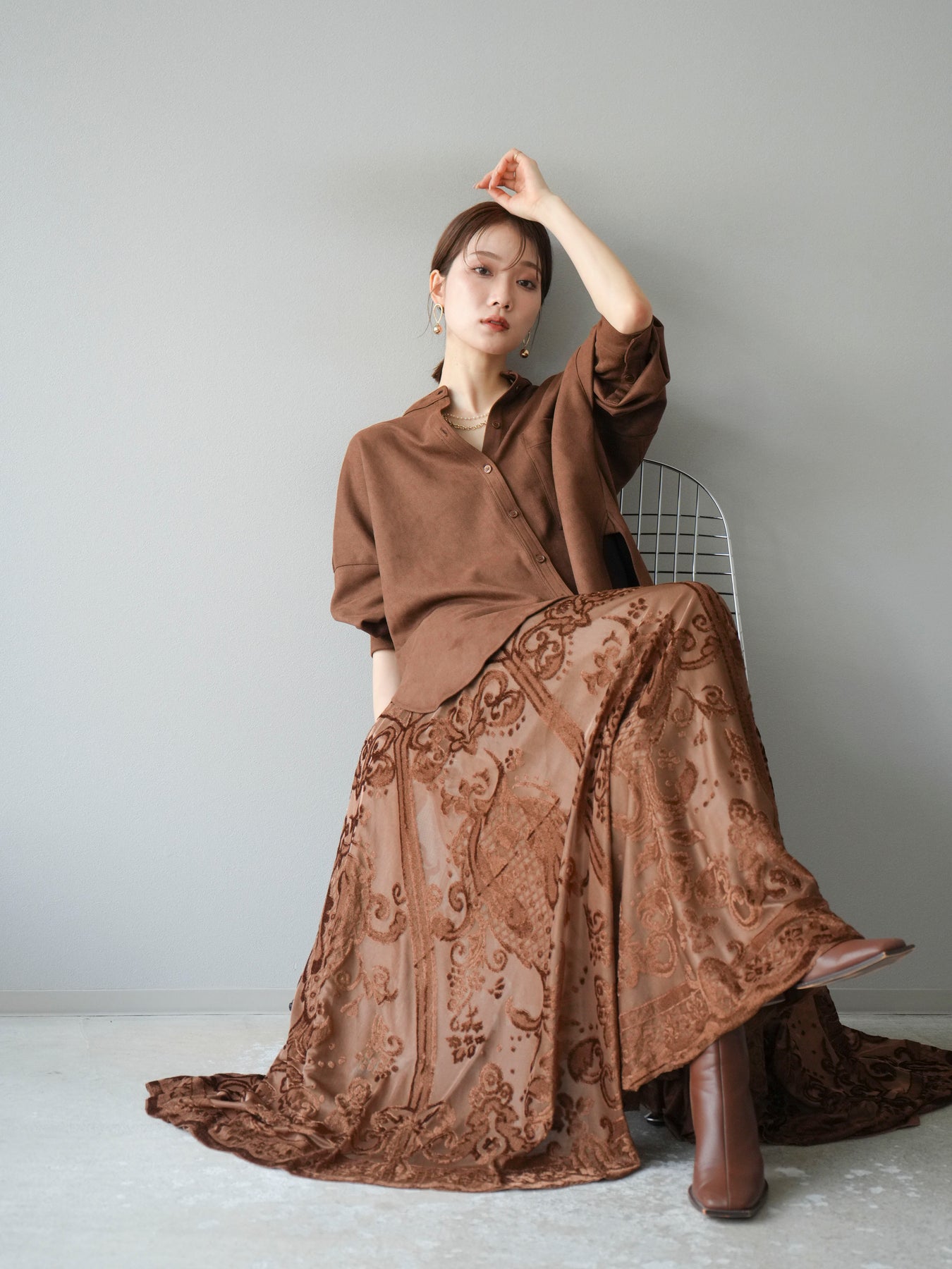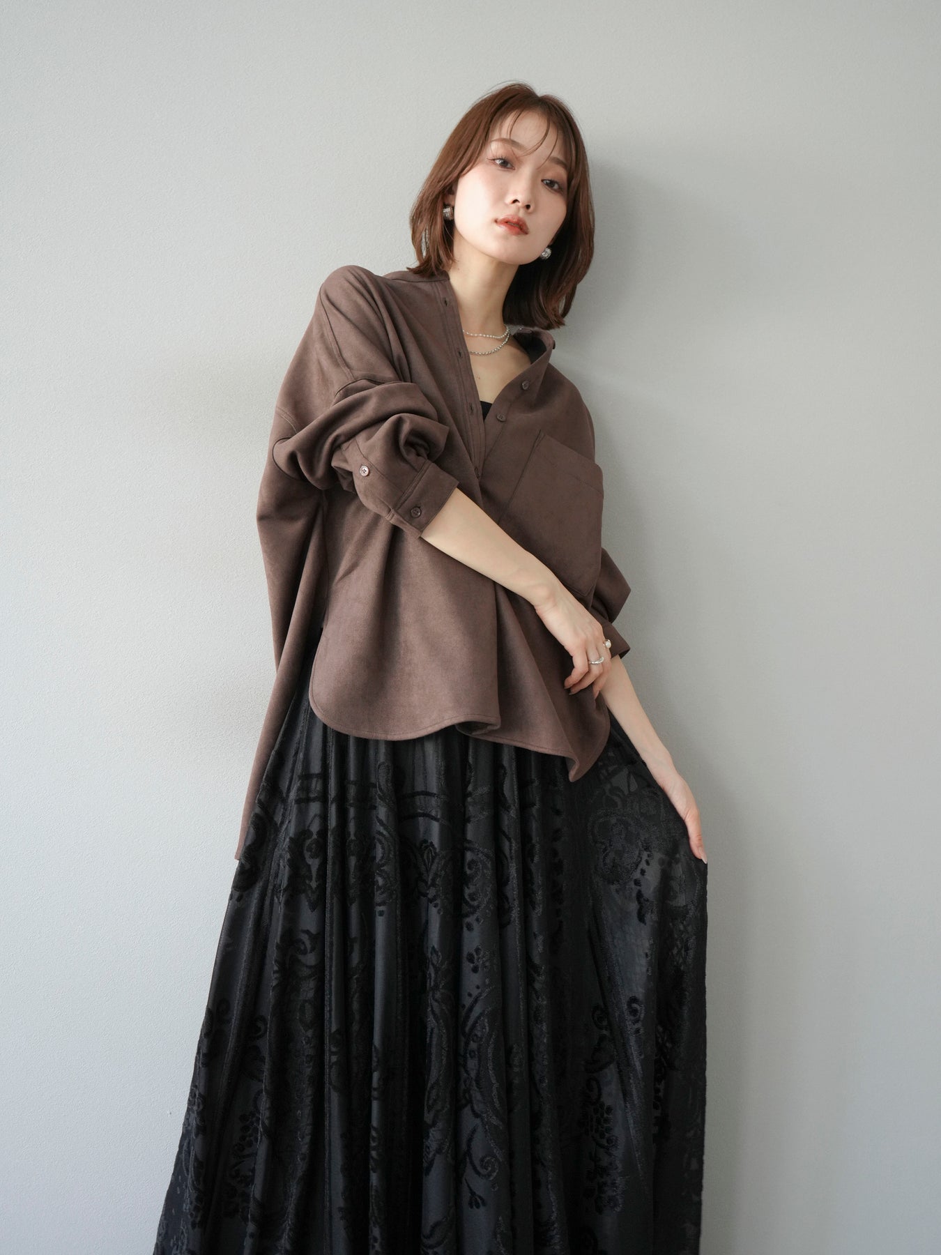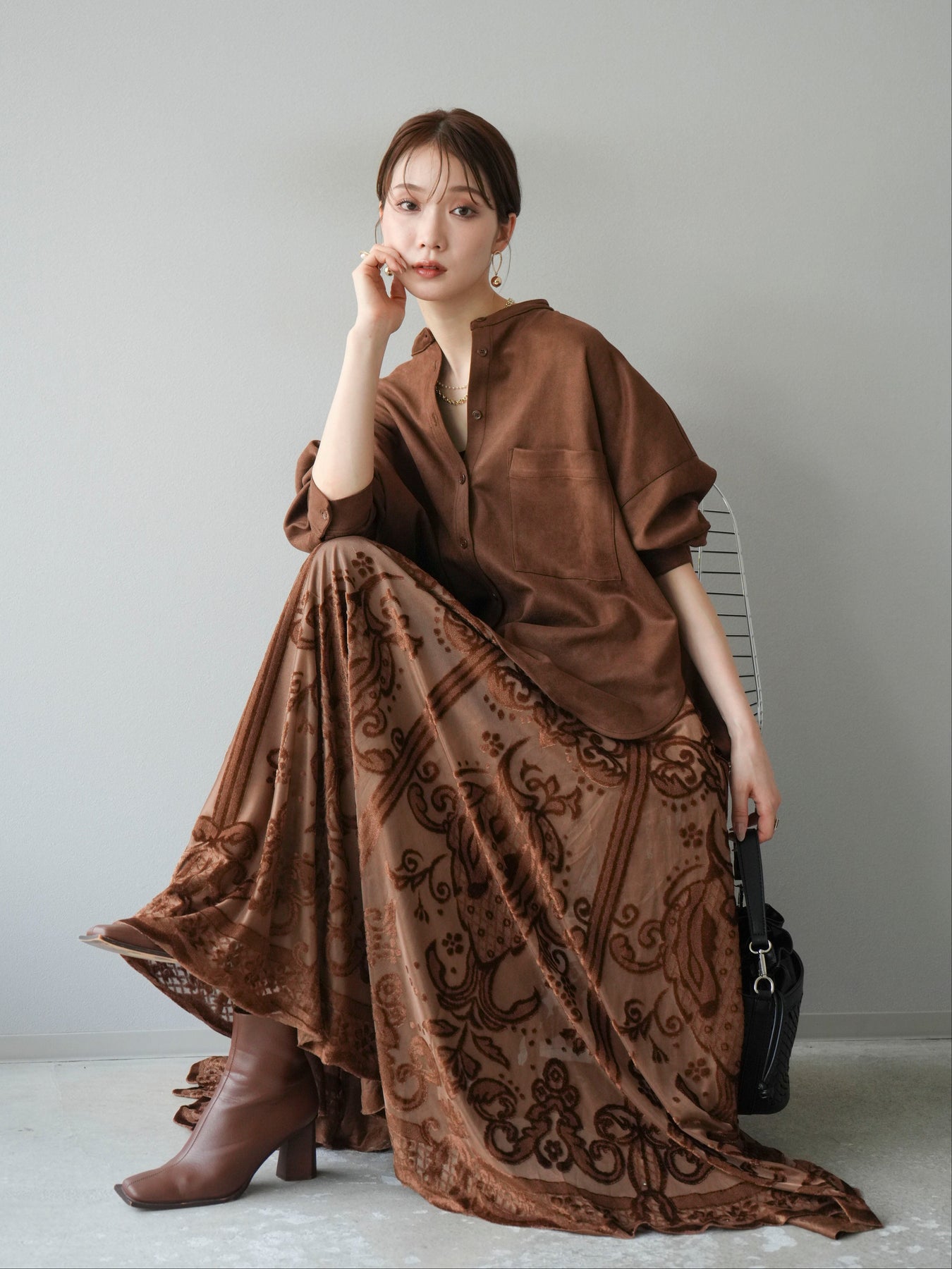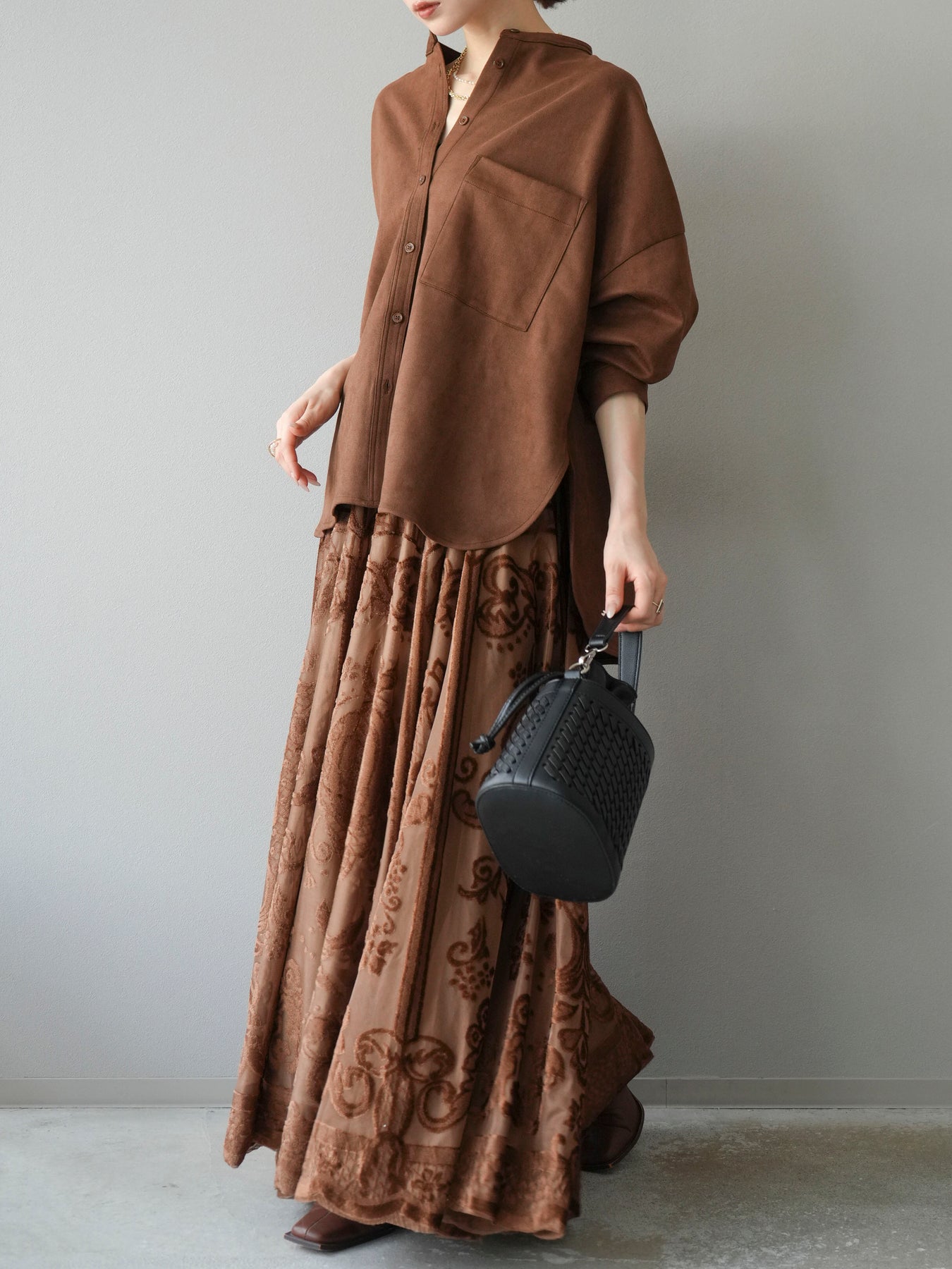 [SET]スエードバンドカラーオーバーシャツ+アンティーク柄フロッキーマキシスカート(2set)