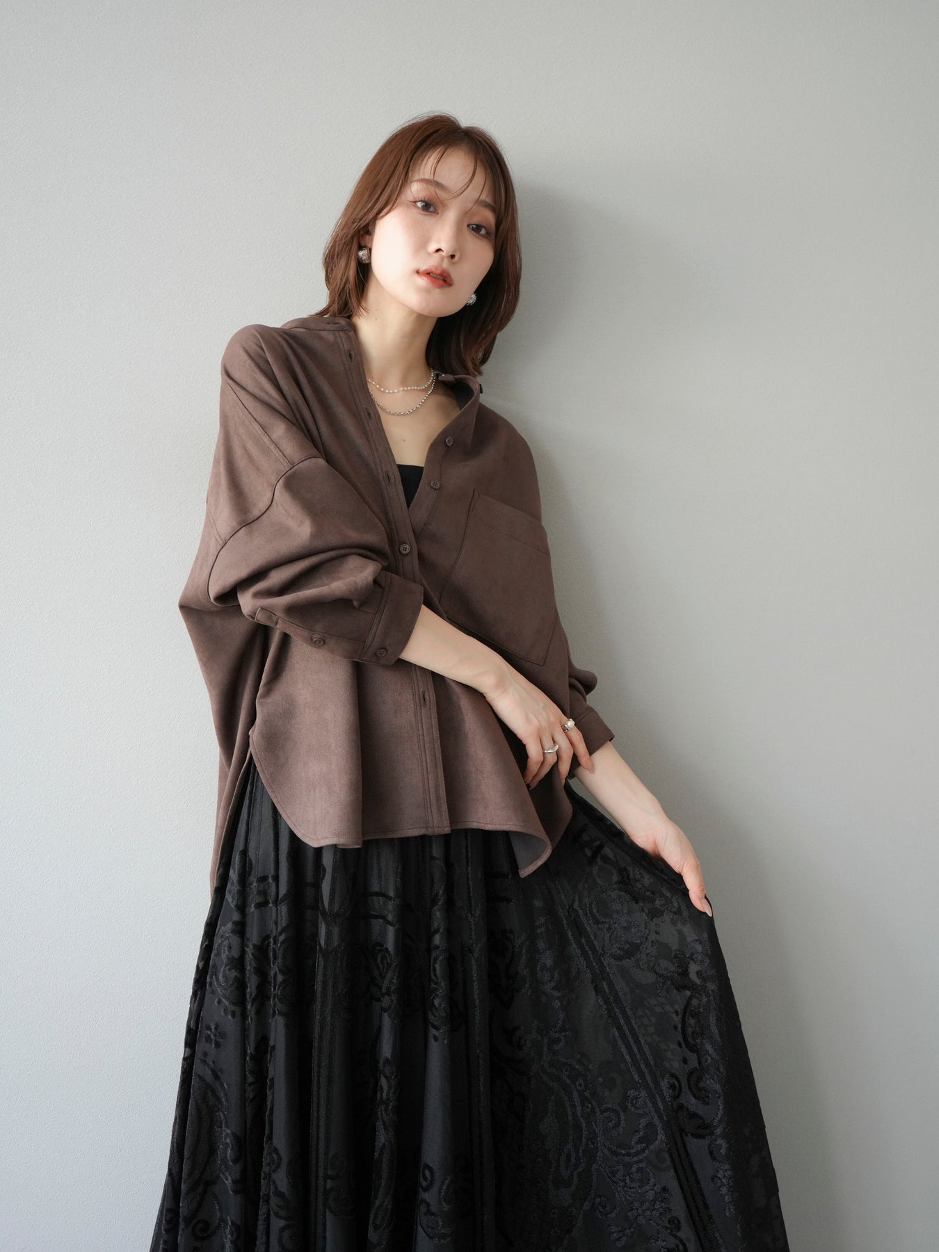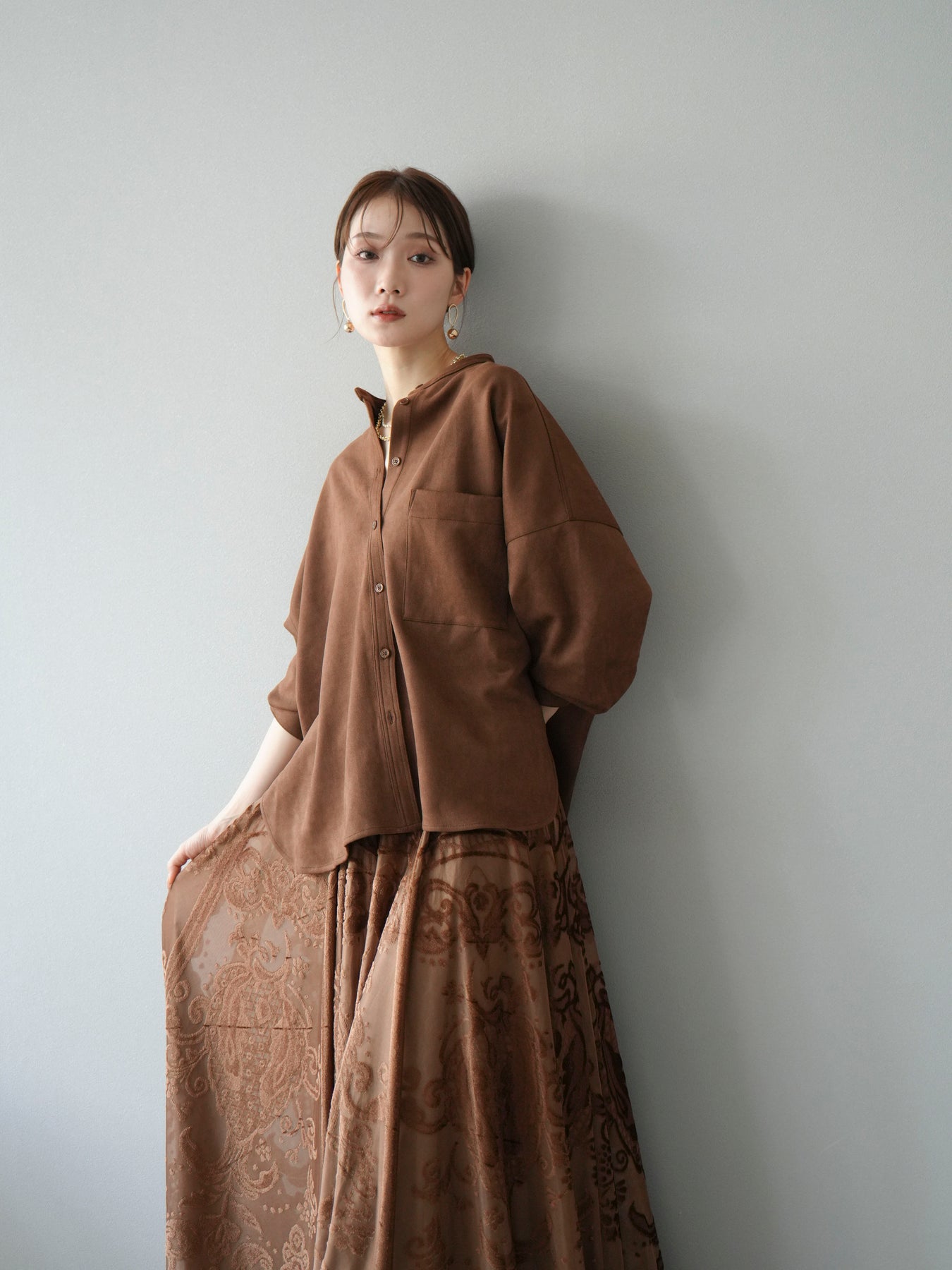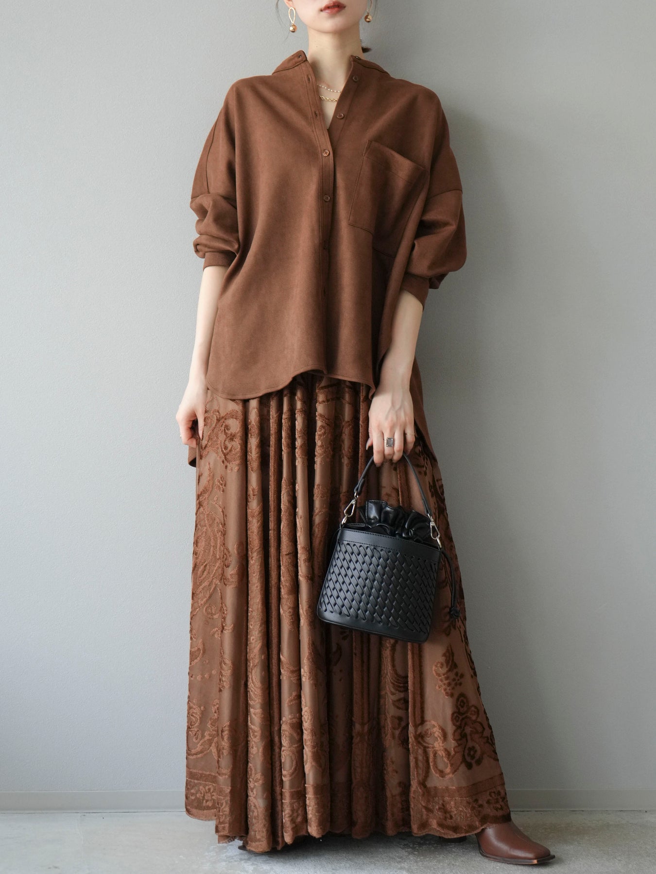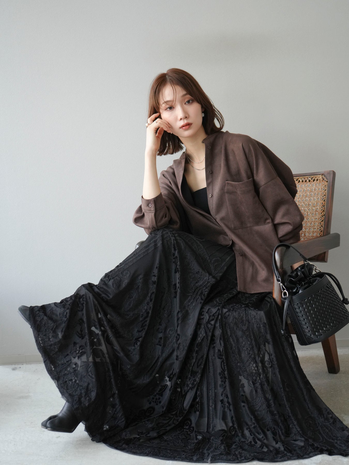 [SET]スエードバンドカラーオーバーシャツ+アンティーク柄フロッキーマキシスカート(2set)
