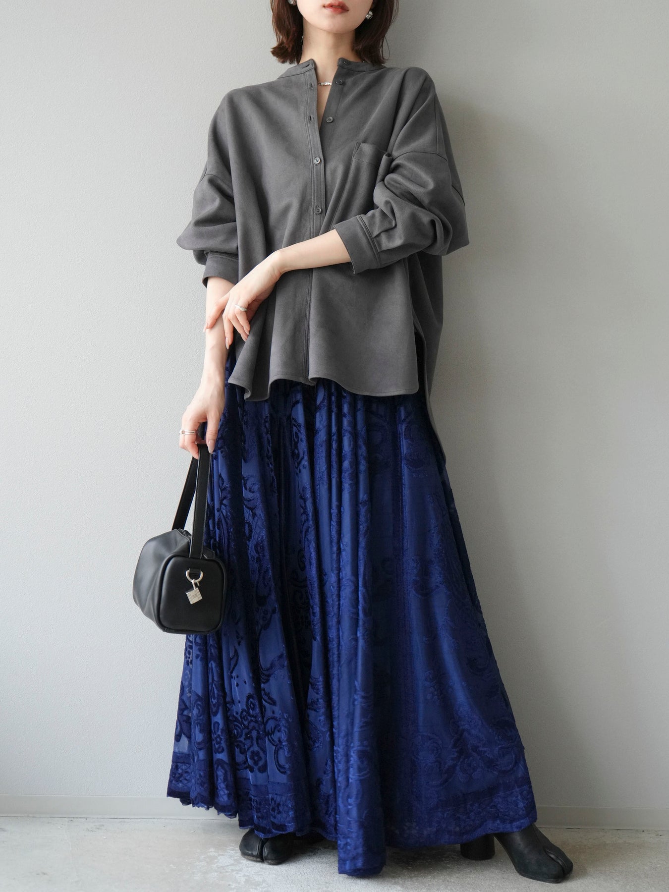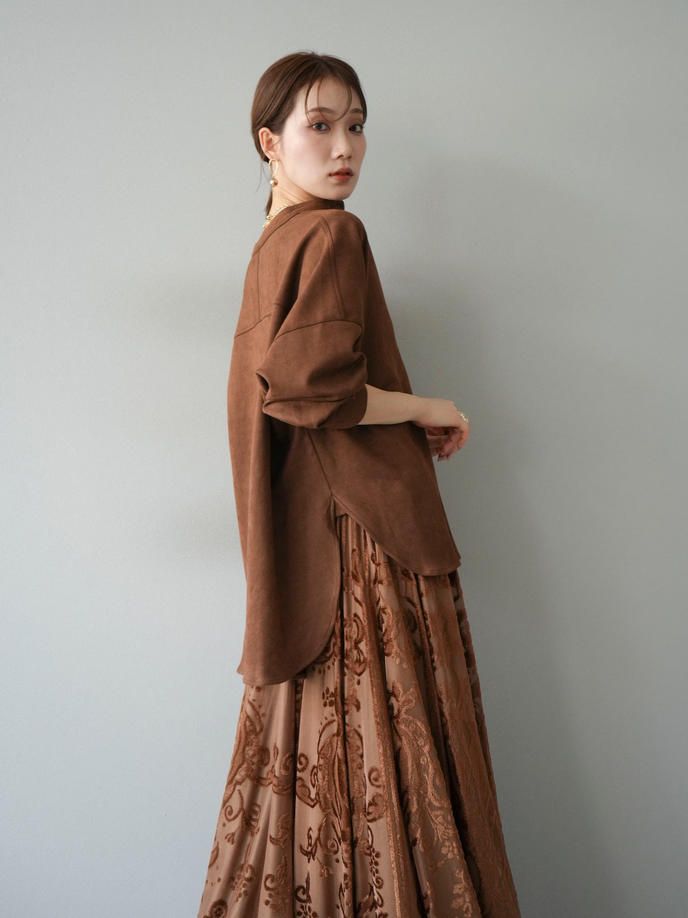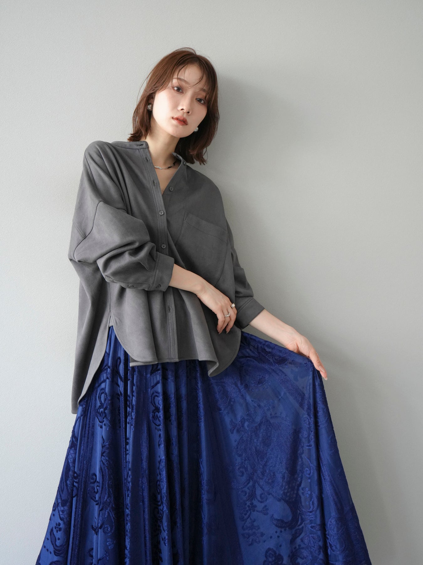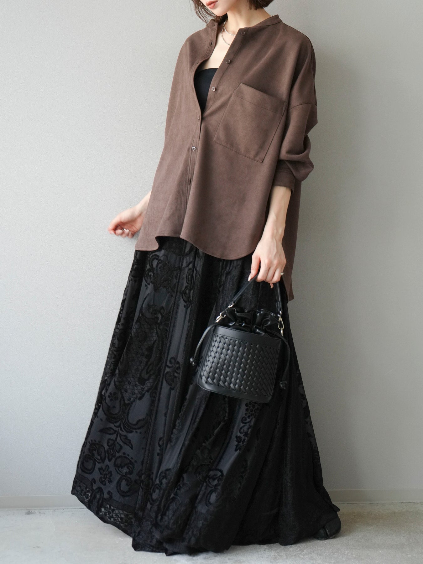[SET]スエードバンドカラーオーバーシャツ+アンティーク柄フロッキーマキシスカート(2set)