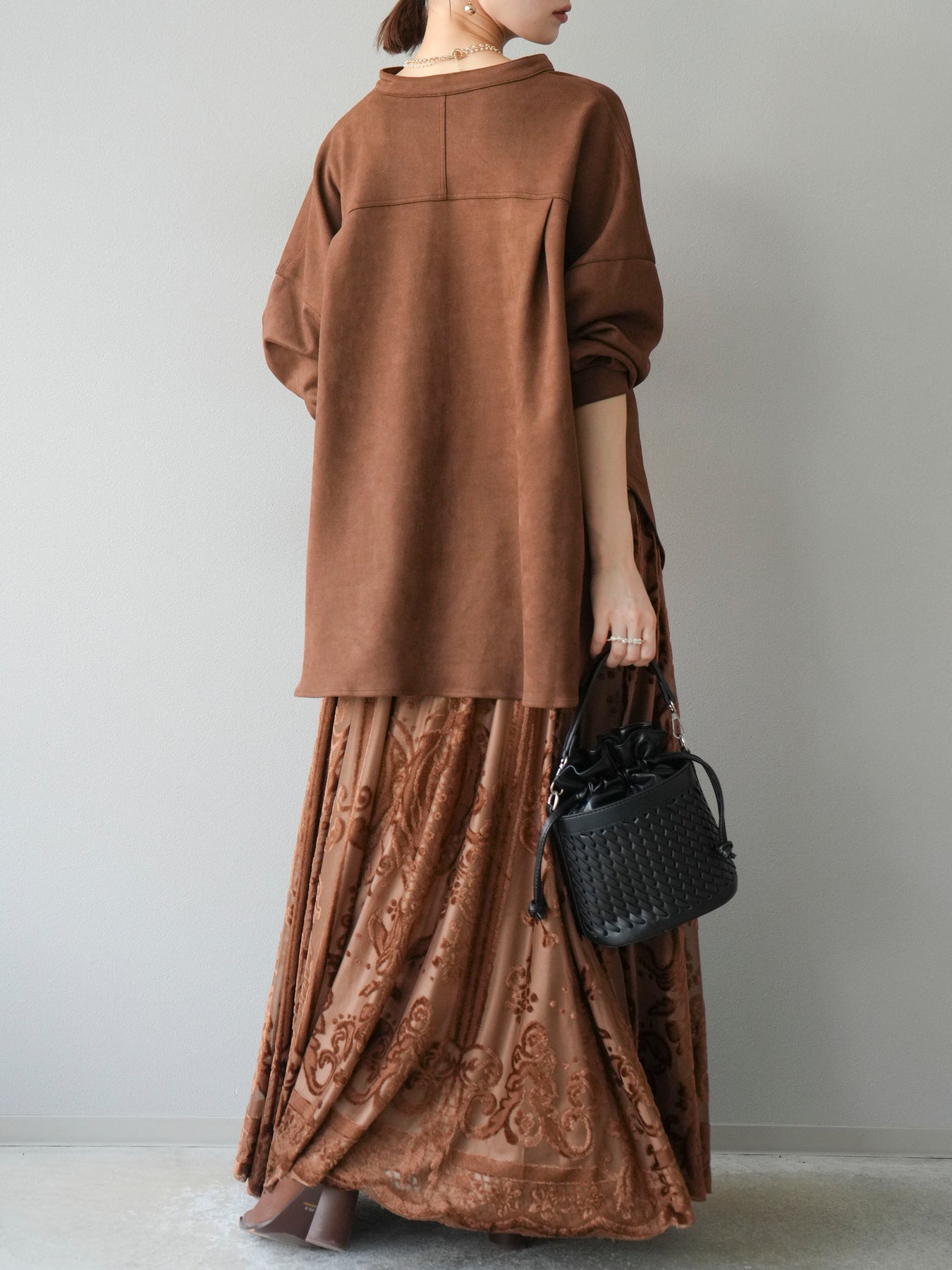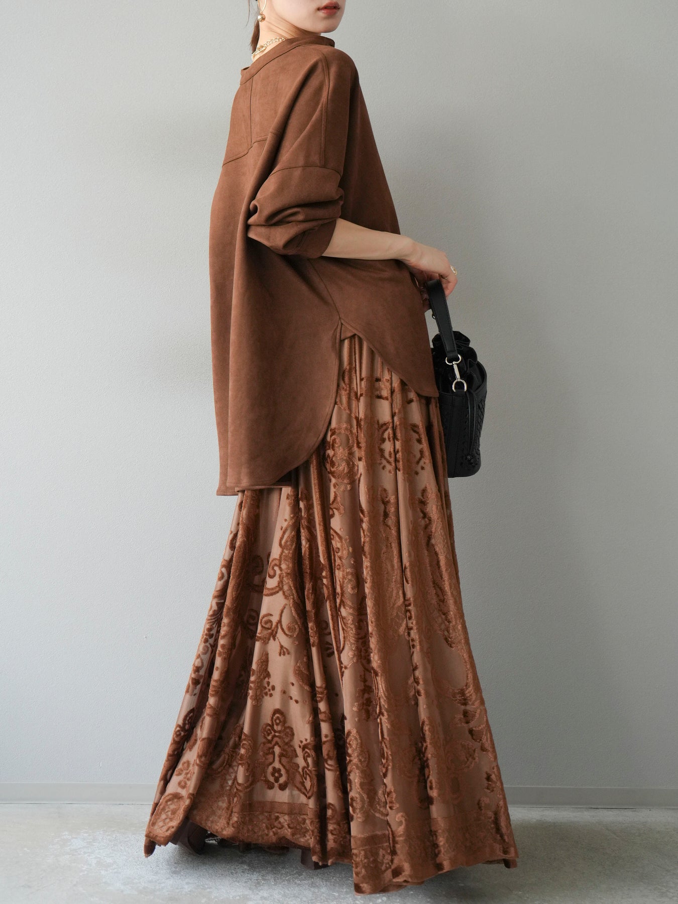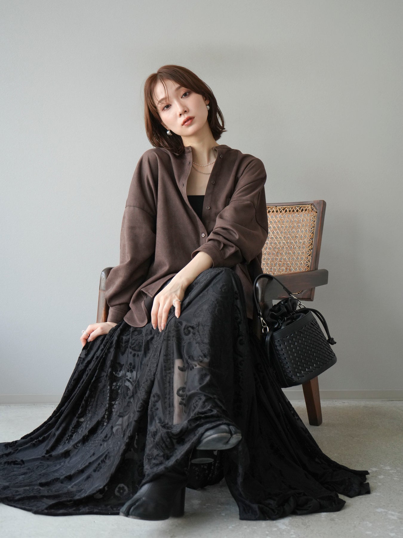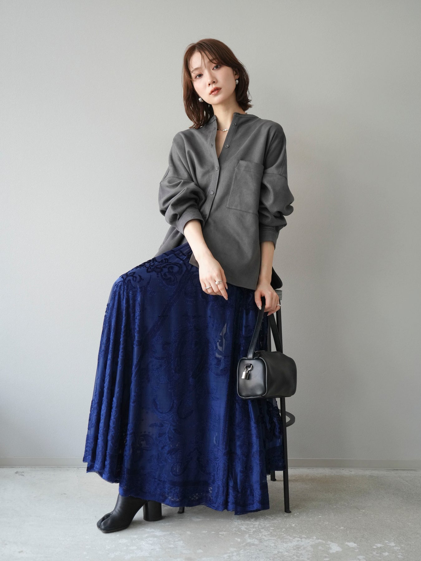 [SET]スエードバンドカラーオーバーシャツ+アンティーク柄フロッキーマキシスカート(2set)