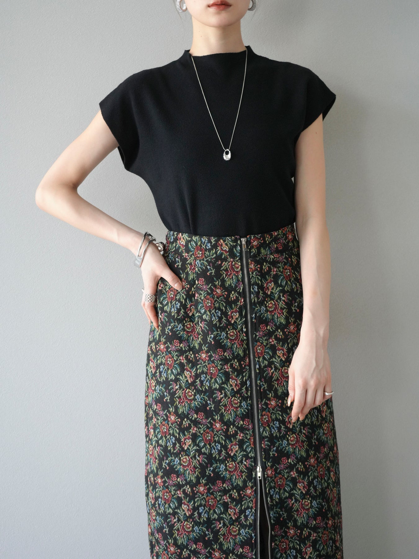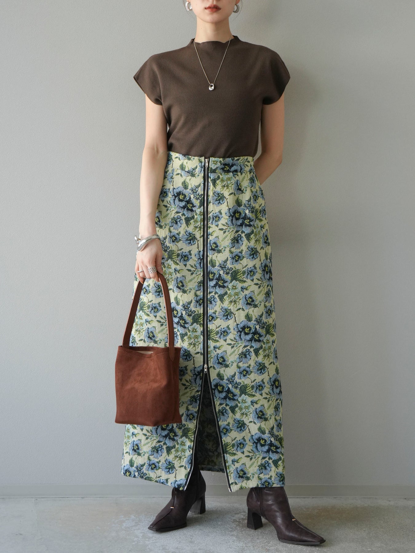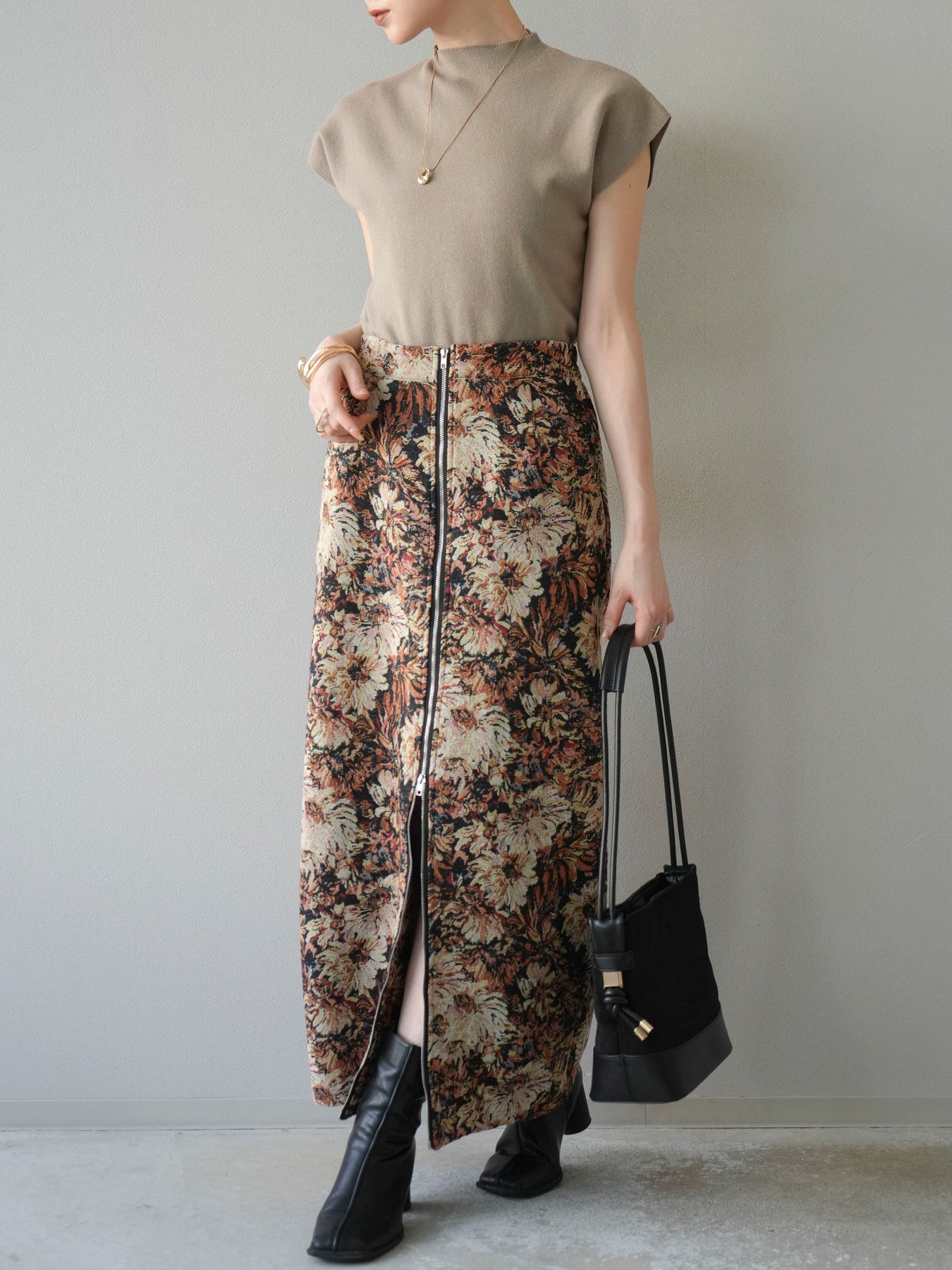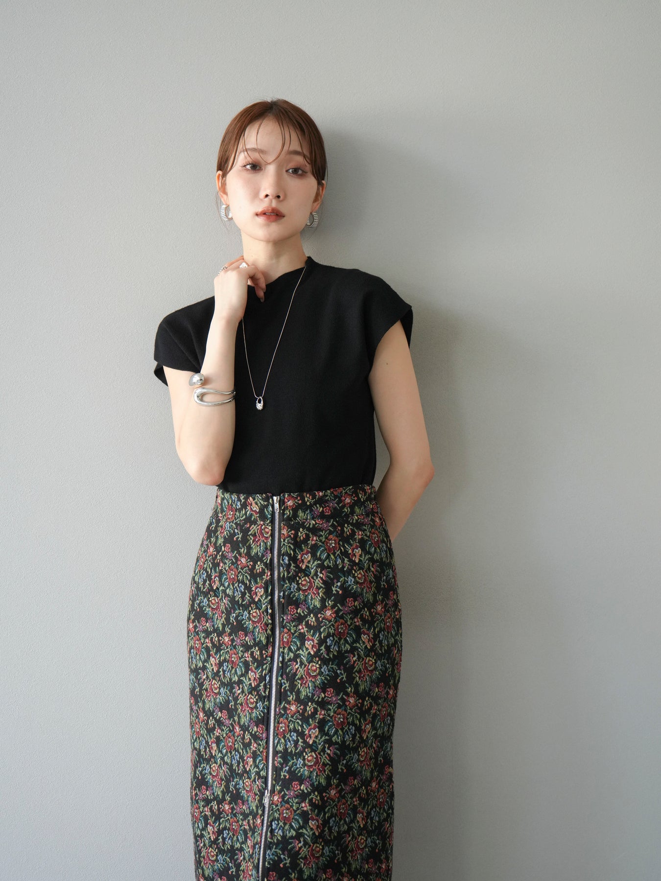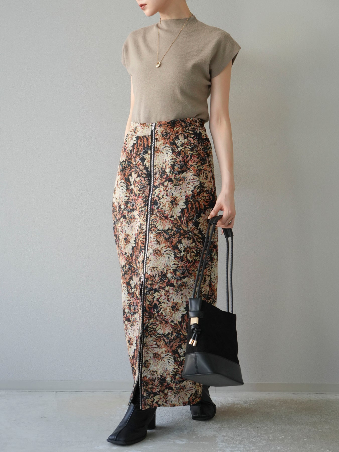 重厚感のあるゴブラン織りで仕立てたフロントジップタイトスカート。クラシカルなフラワーパターンが存在感を放ち、スタイリングに華やかさとヴィンテージライクな雰囲気をプラスします。フロントに施したジップディテールがモードなアクセントとなり、スリットの開き具合を調整して抜け感を演出できるのも魅力。タイトなシルエットながらも程よいストレッチ性があり、動きやすさと美しいラインを両立しています。シンプルなトップスを合わせるだけでコーディネートが完成する、主役級の一枚です。