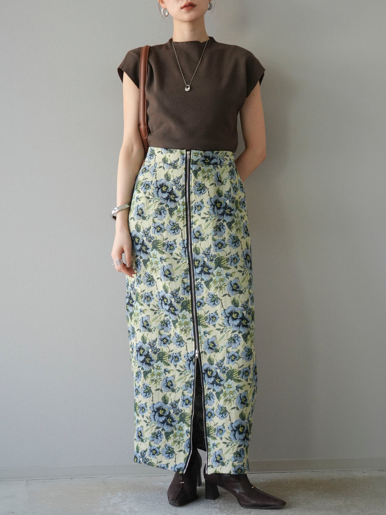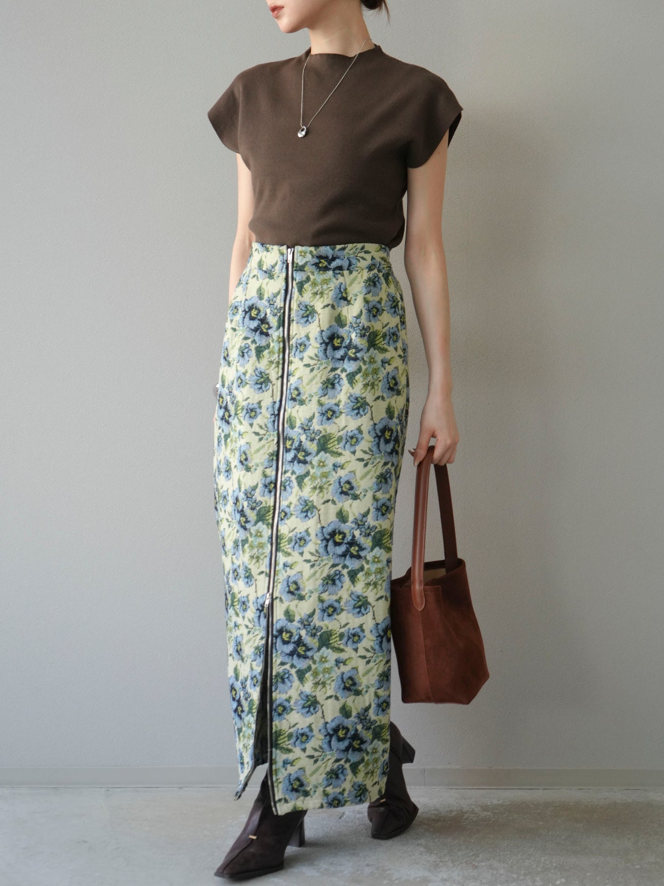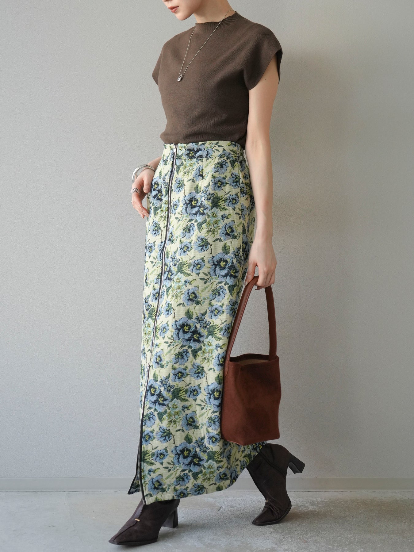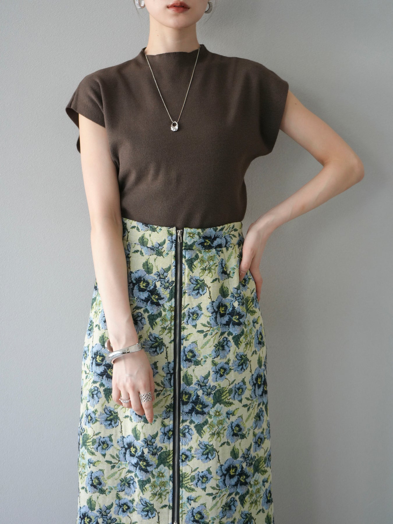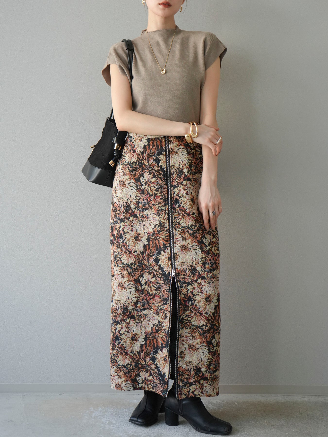 重厚感のあるゴブラン織りで仕立てたフロントジップタイトスカート。クラシカルなフラワーパターンが存在感を放ち、スタイリングに華やかさとヴィンテージライクな雰囲気をプラスします。フロントに施したジップディテールがモードなアクセントとなり、スリットの開き具合を調整して抜け感を演出できるのも魅力。タイトなシルエットながらも程よいストレッチ性があり、動きやすさと美しいラインを両立しています。シンプルなトップスを合わせるだけでコーディネートが完成する、主役級の一枚です。