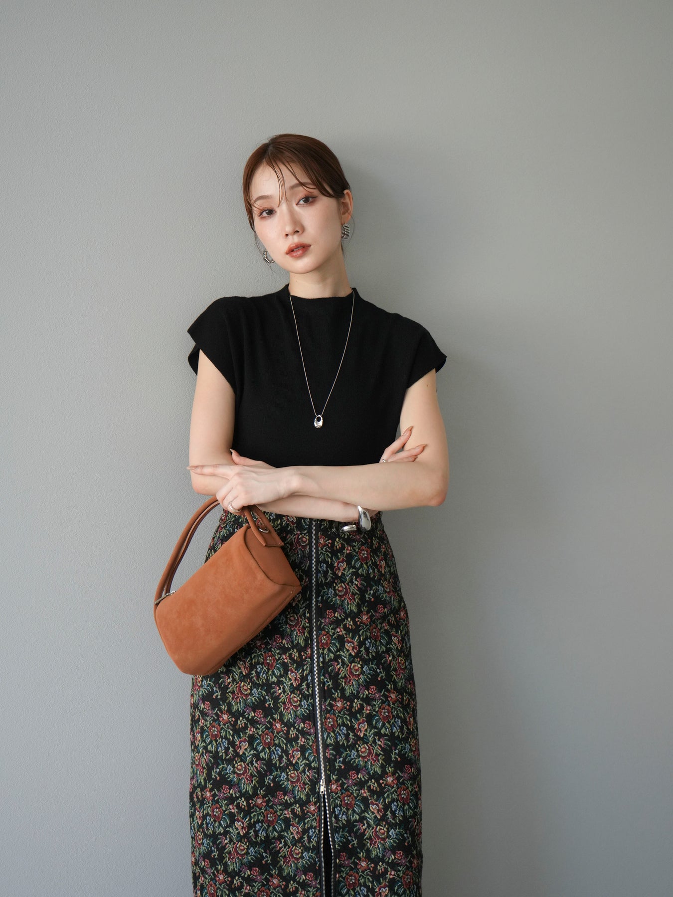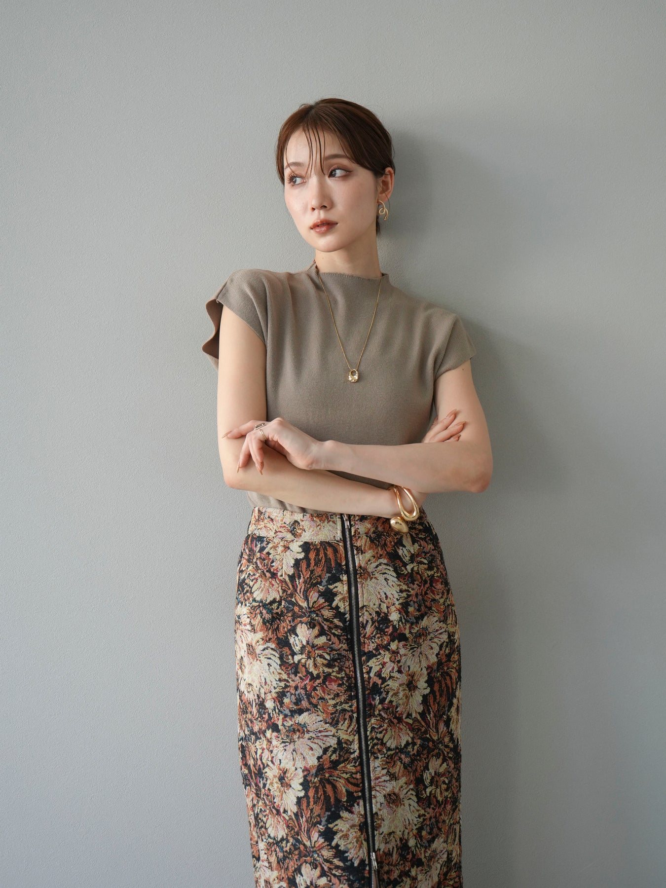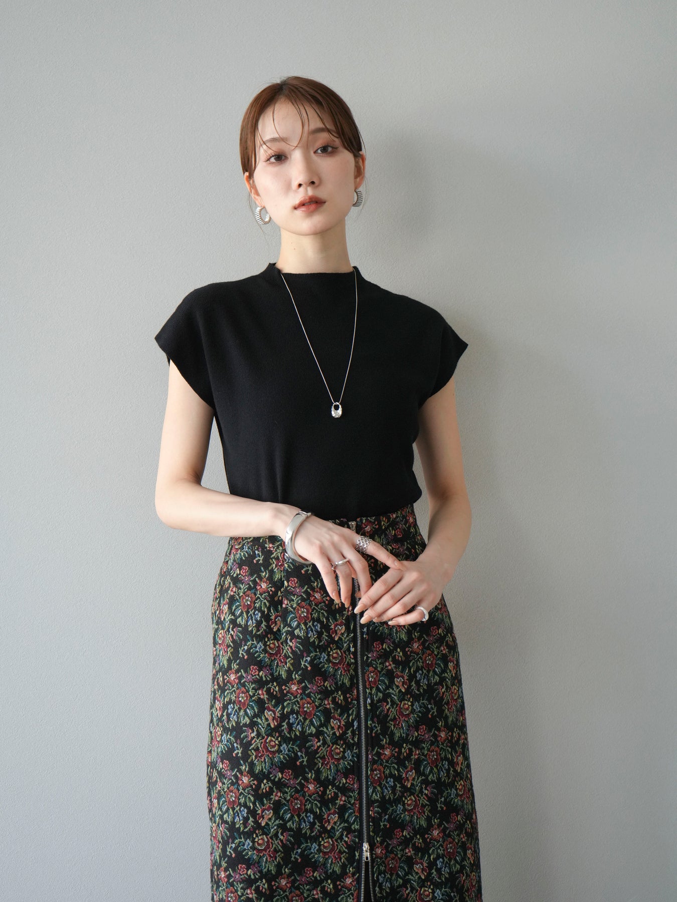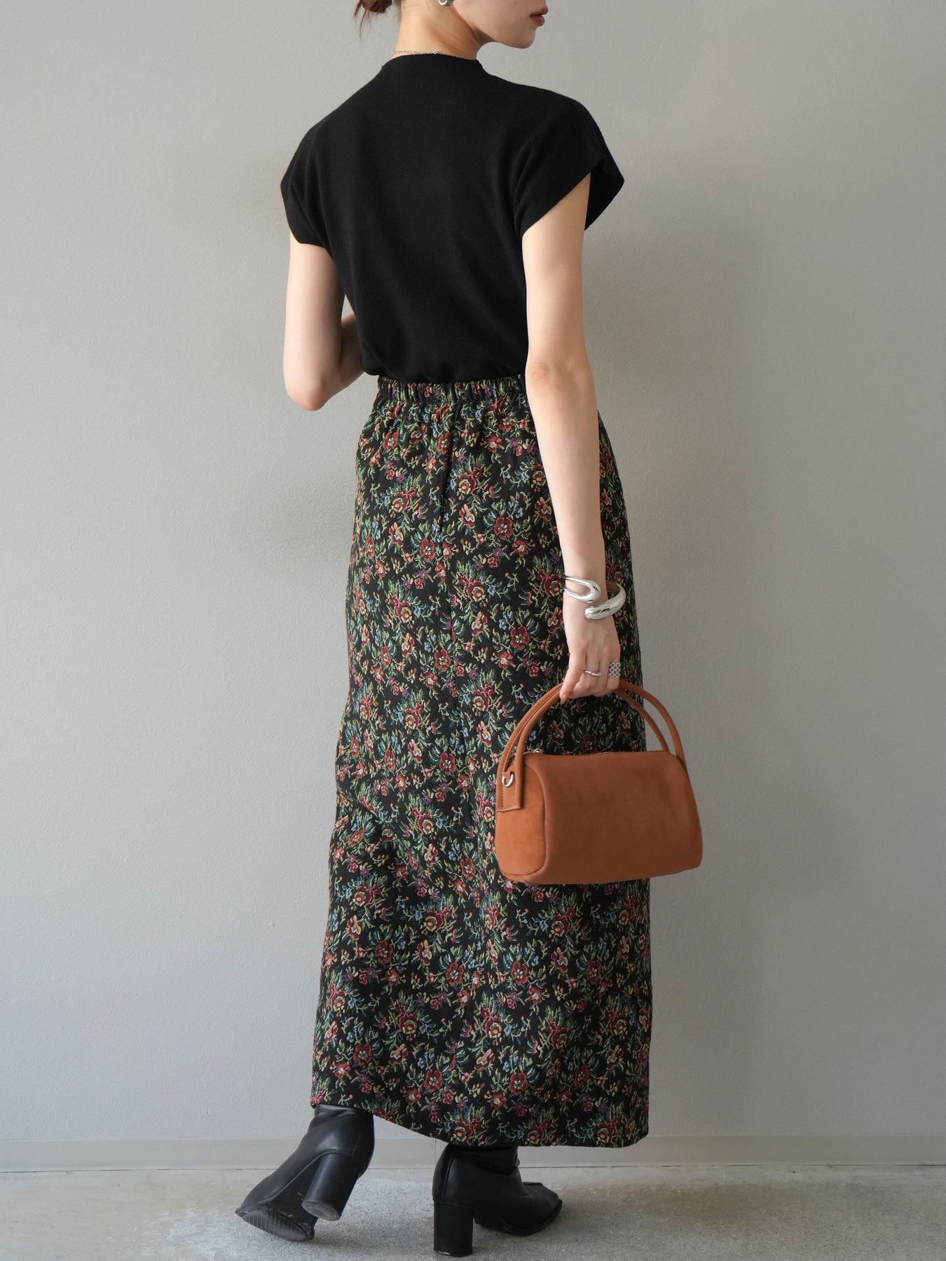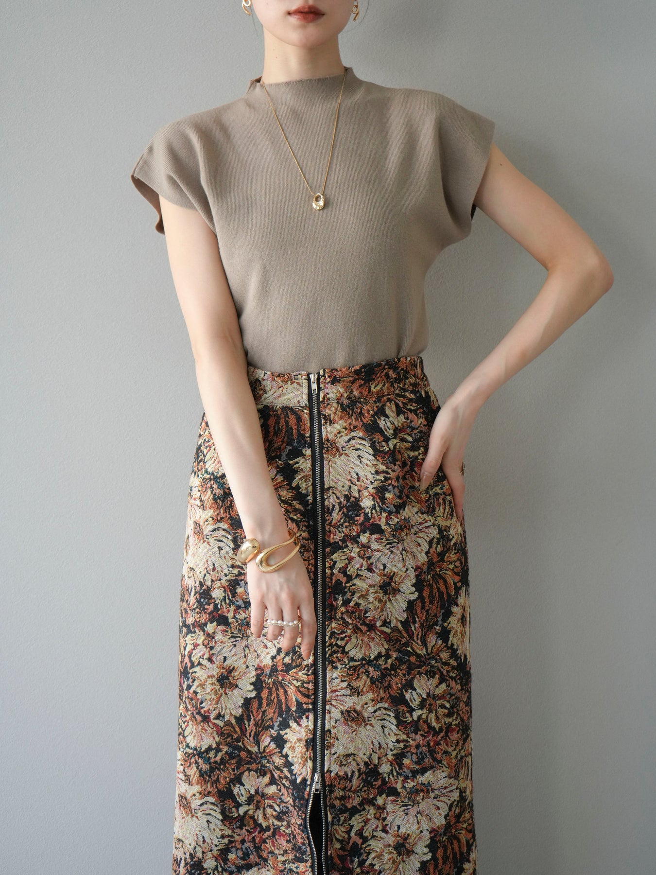 重厚感のあるゴブラン織りで仕立てたフロントジップタイトスカート。クラシカルなフラワーパターンが存在感を放ち、スタイリングに華やかさとヴィンテージライクな雰囲気をプラスします。フロントに施したジップディテールがモードなアクセントとなり、スリットの開き具合を調整して抜け感を演出できるのも魅力。タイトなシルエットながらも程よいストレッチ性があり、動きやすさと美しいラインを両立しています。シンプルなトップスを合わせるだけでコーディネートが完成する、主役級の一枚です。