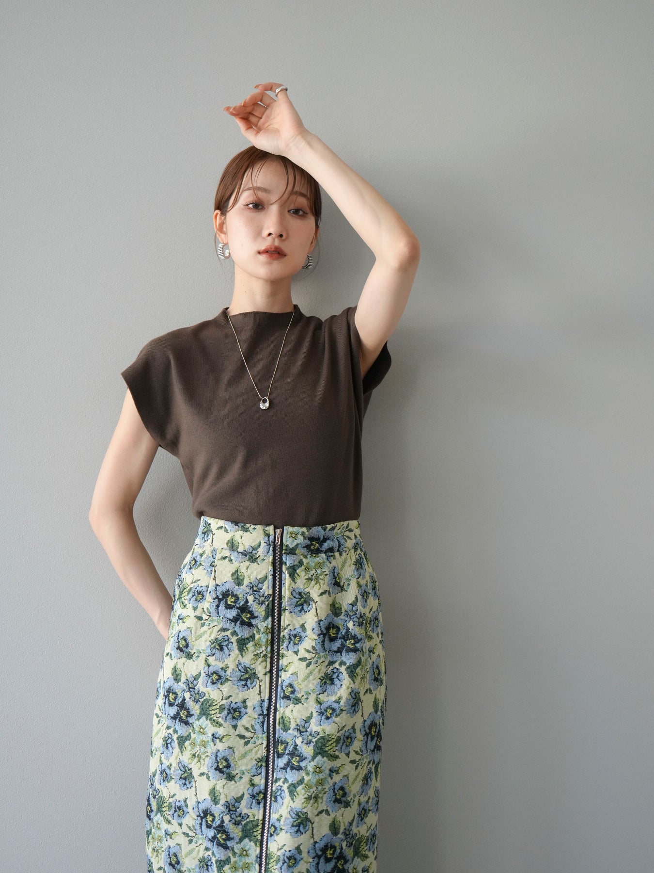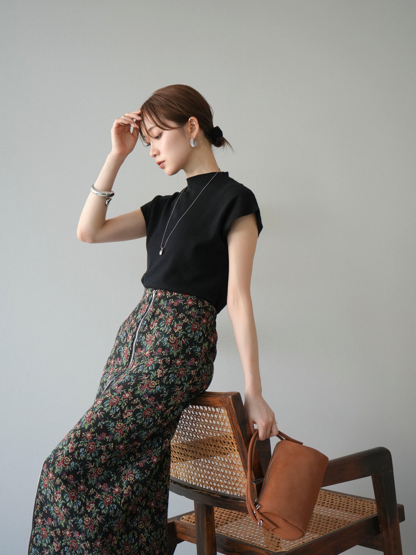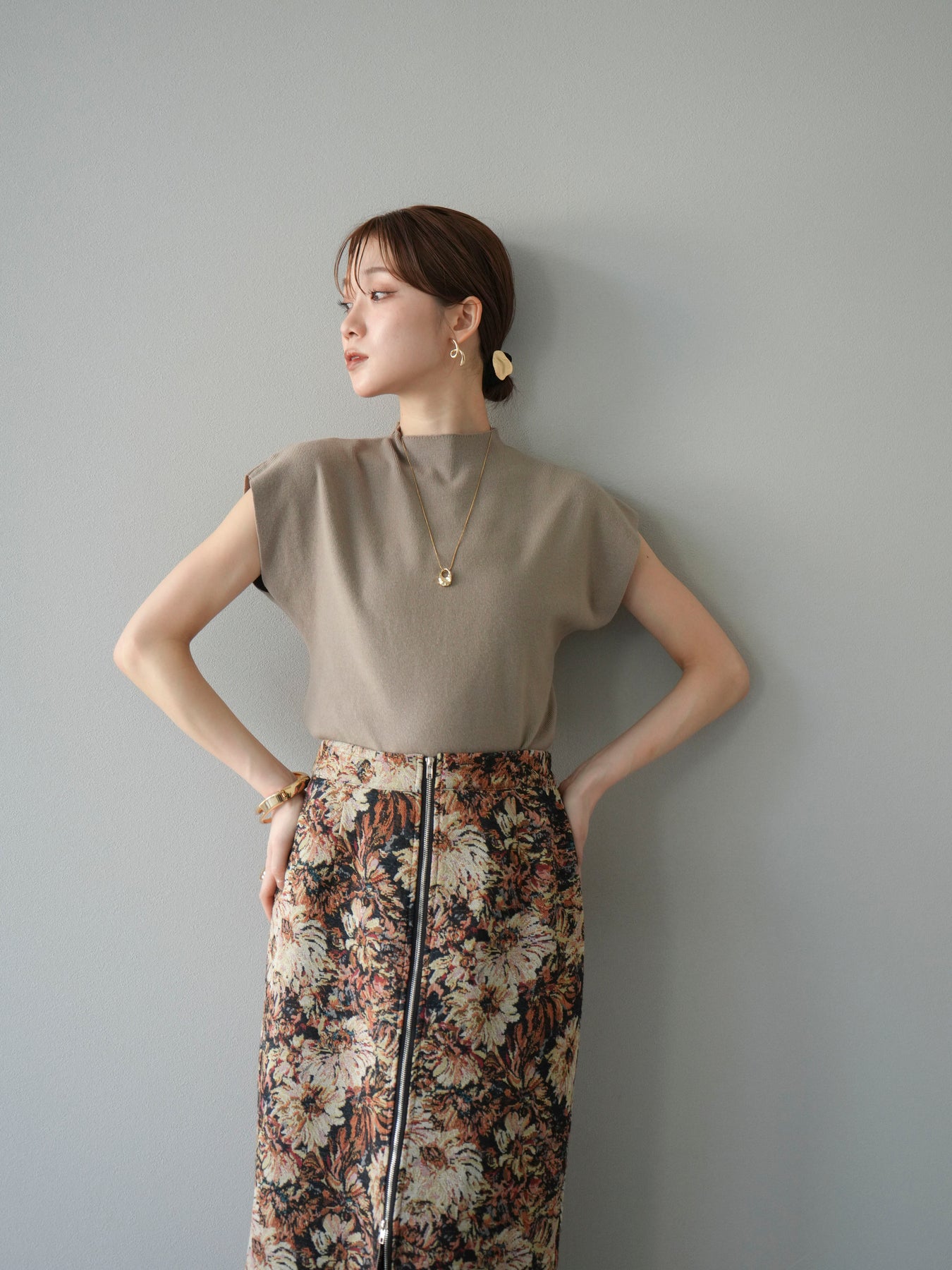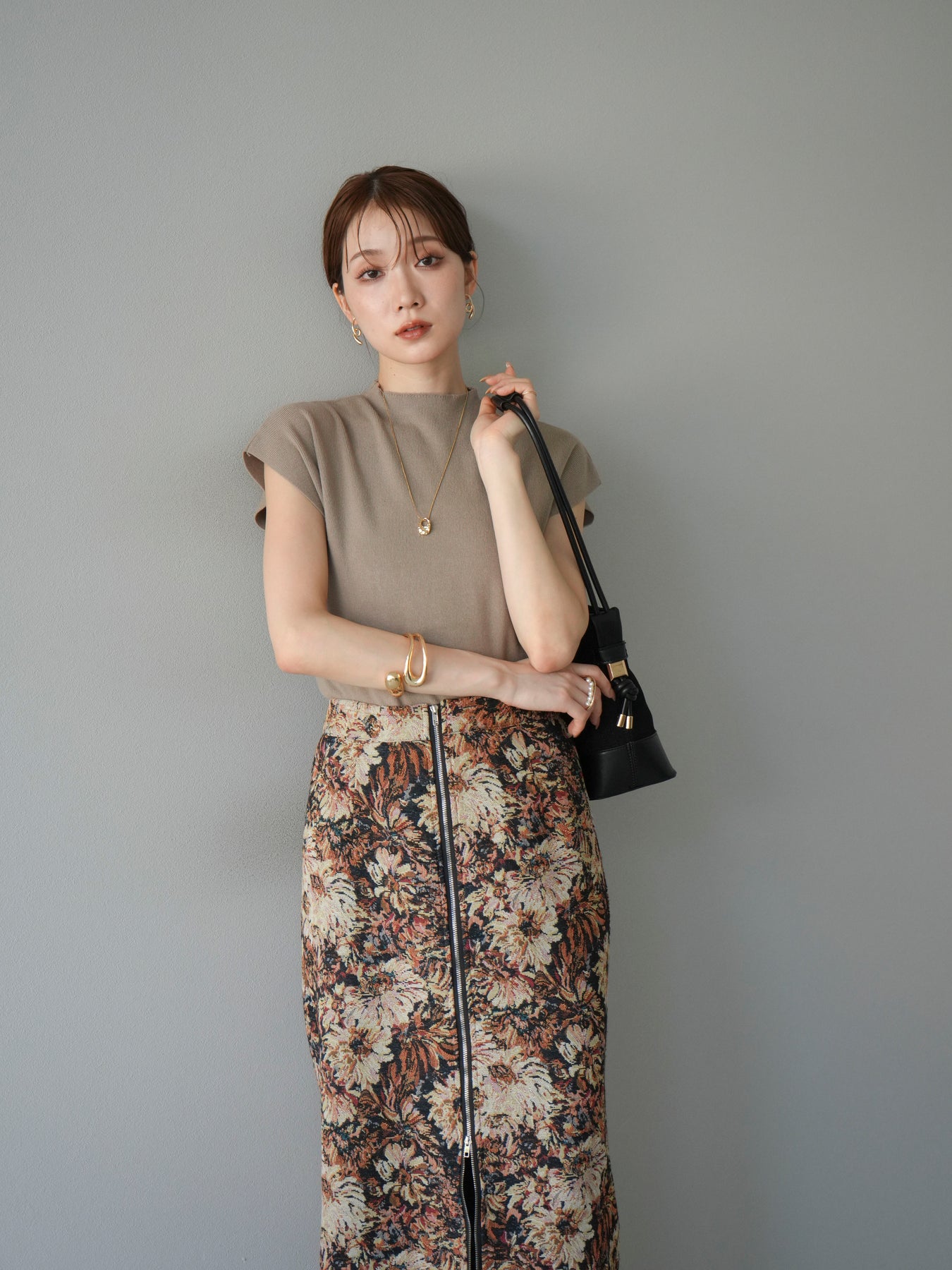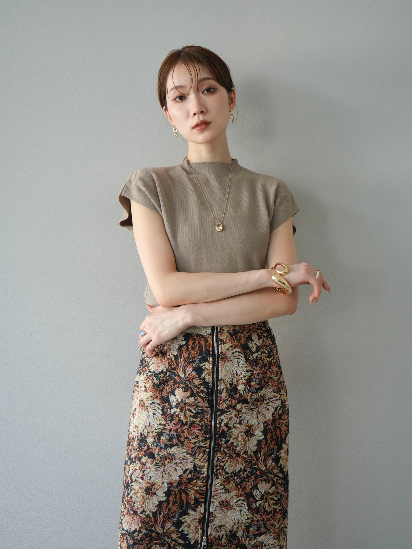 重厚感のあるゴブラン織りで仕立てたフロントジップタイトスカート。クラシカルなフラワーパターンが存在感を放ち、スタイリングに華やかさとヴィンテージライクな雰囲気をプラスします。フロントに施したジップディテールがモードなアクセントとなり、スリットの開き具合を調整して抜け感を演出できるのも魅力。タイトなシルエットながらも程よいストレッチ性があり、動きやすさと美しいラインを両立しています。シンプルなトップスを合わせるだけでコーディネートが完成する、主役級の一枚です。