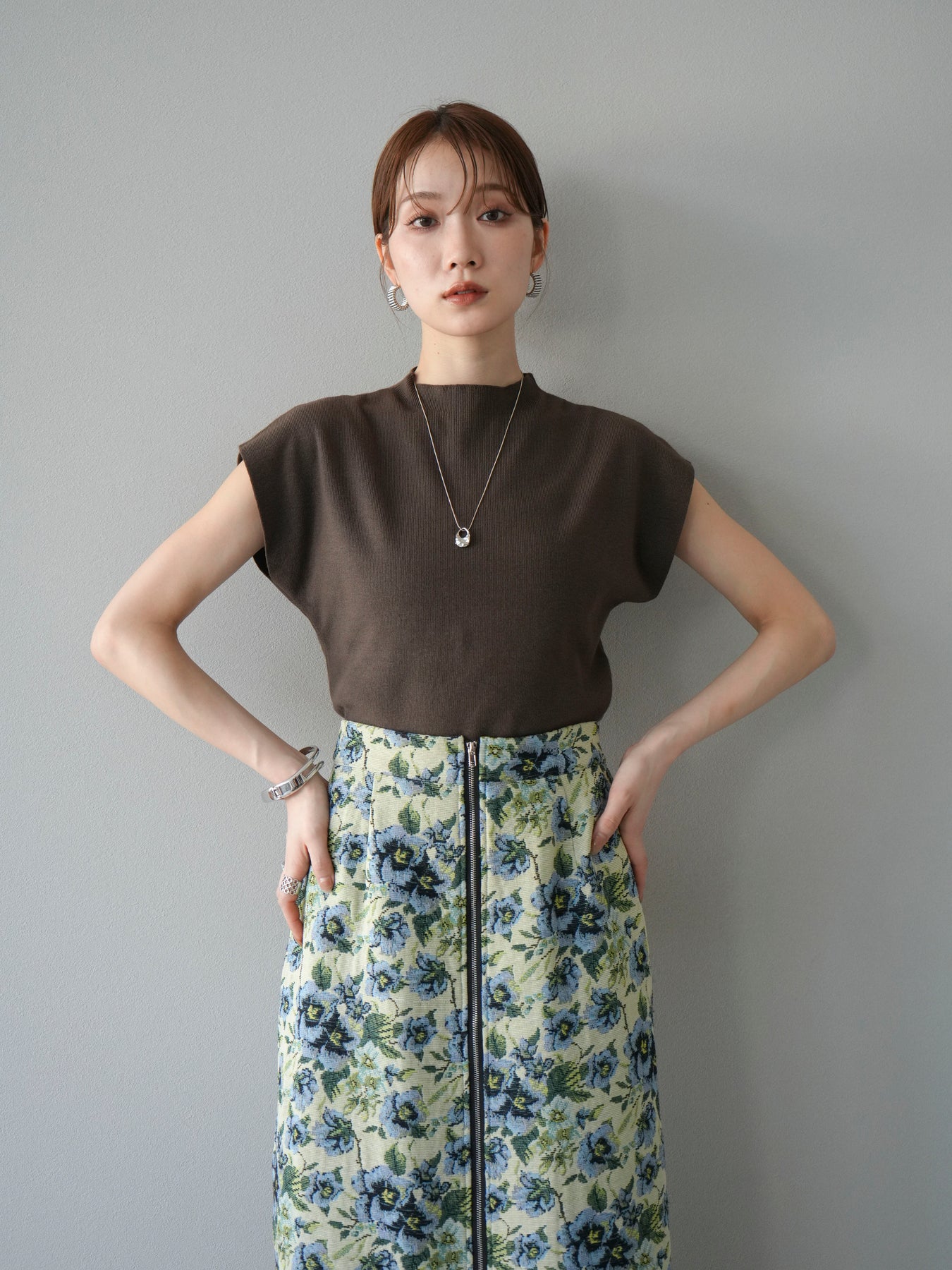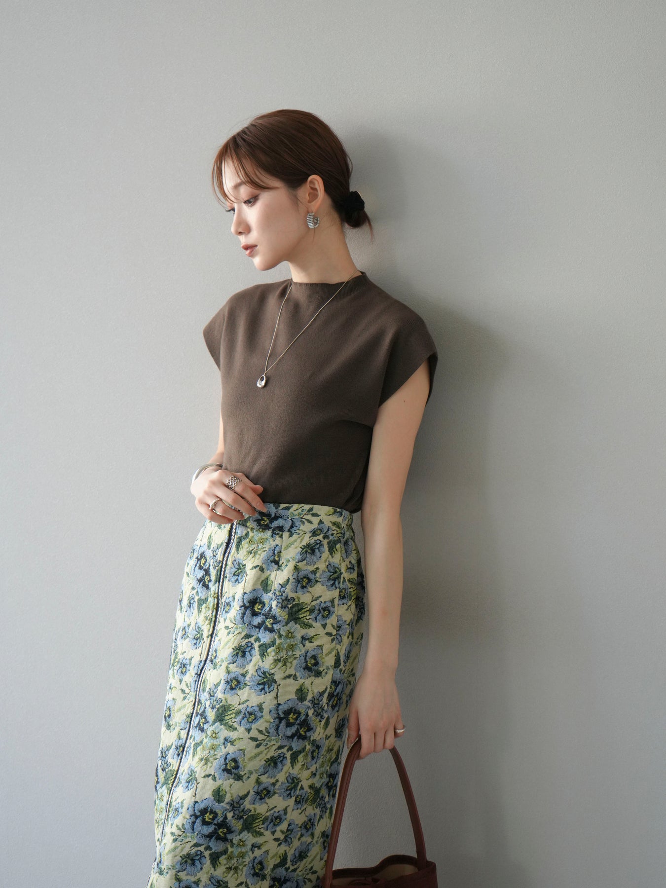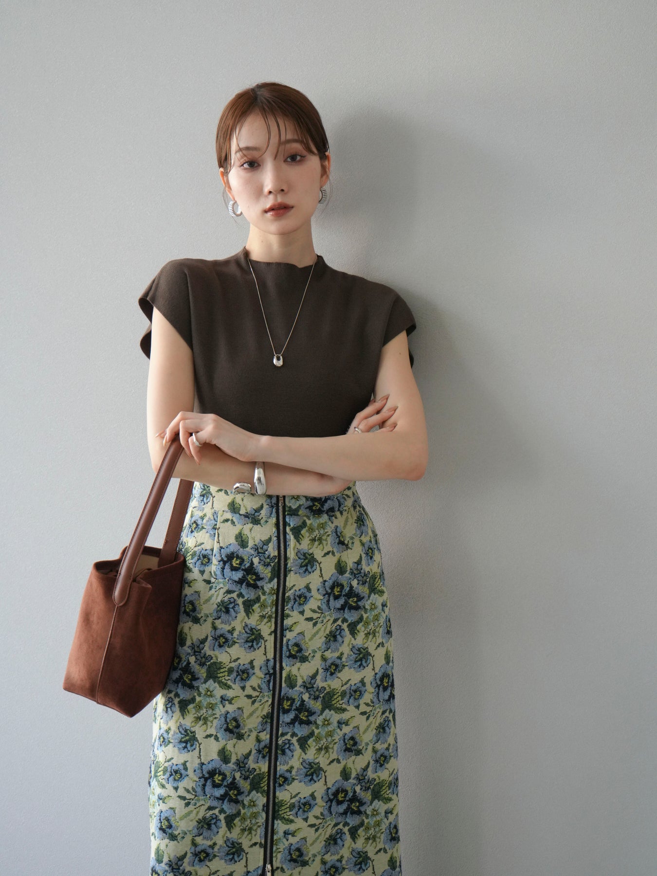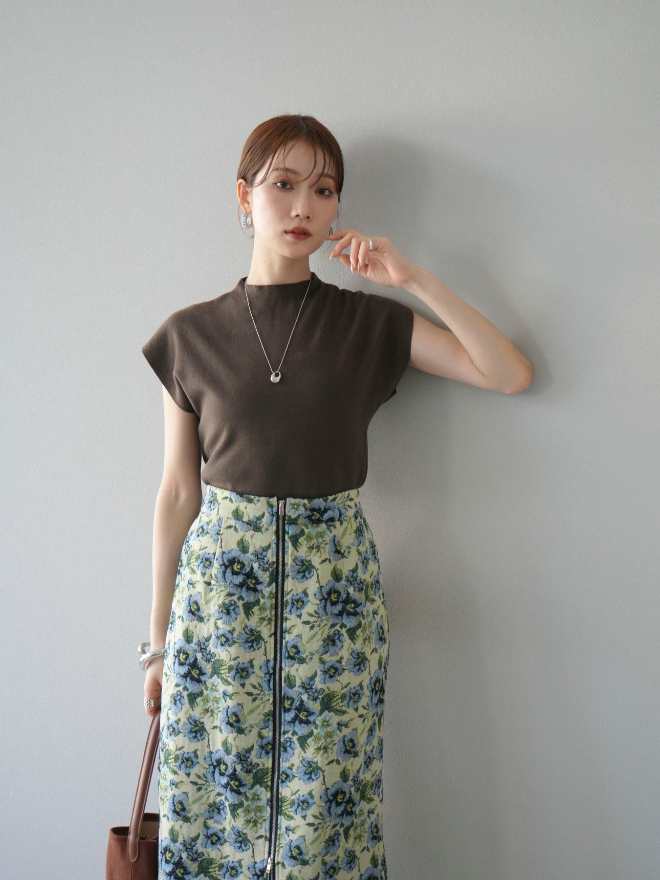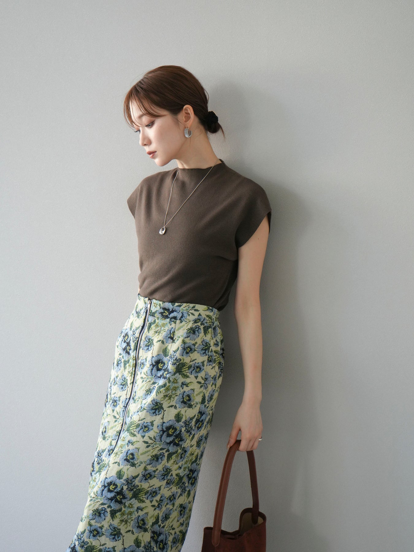 重厚感のあるゴブラン織りで仕立てたフロントジップタイトスカート。クラシカルなフラワーパターンが存在感を放ち、スタイリングに華やかさとヴィンテージライクな雰囲気をプラスします。フロントに施したジップディテールがモードなアクセントとなり、スリットの開き具合を調整して抜け感を演出できるのも魅力。タイトなシルエットながらも程よいストレッチ性があり、動きやすさと美しいラインを両立しています。シンプルなトップスを合わせるだけでコーディネートが完成する、主役級の一枚です。