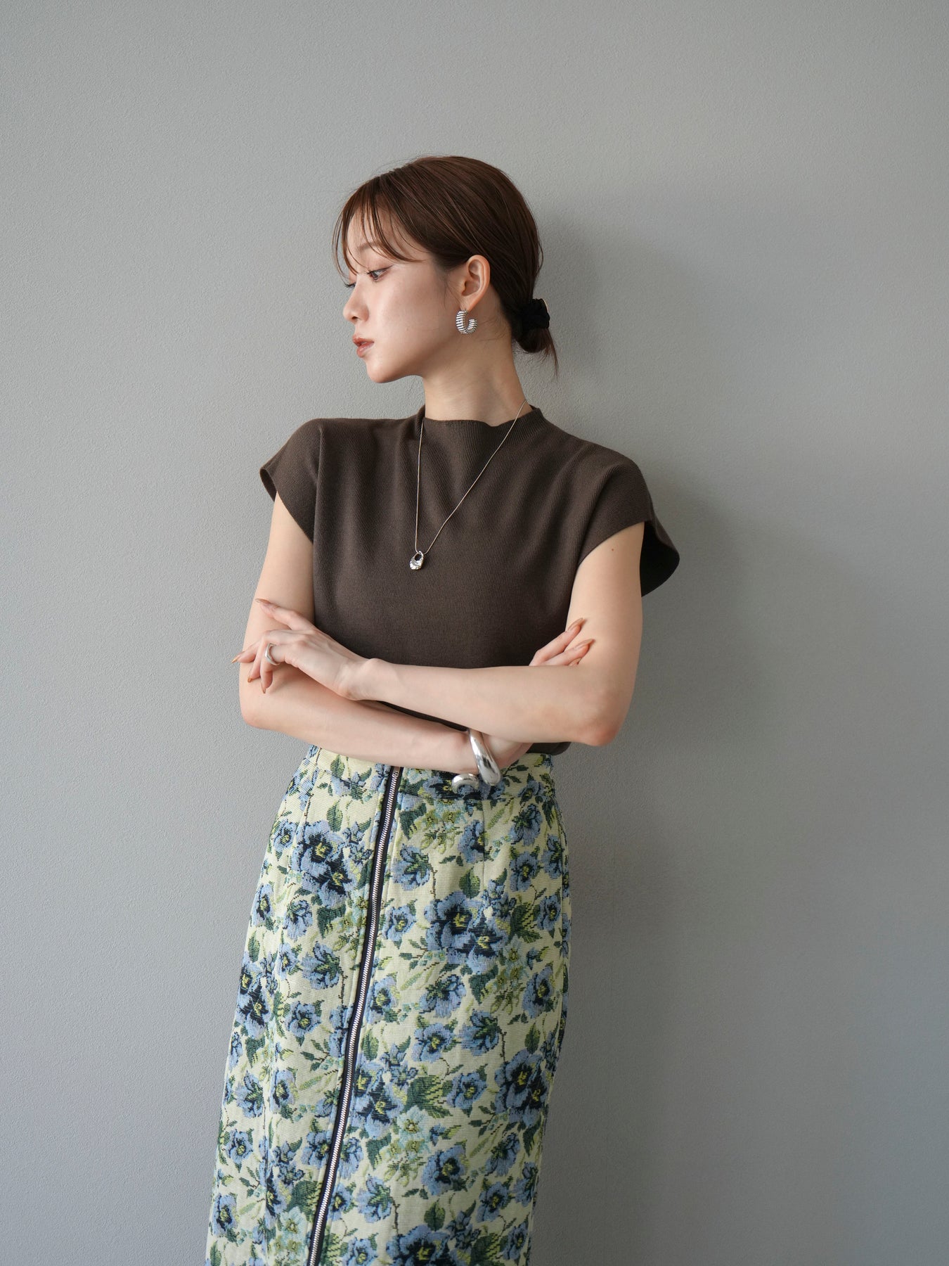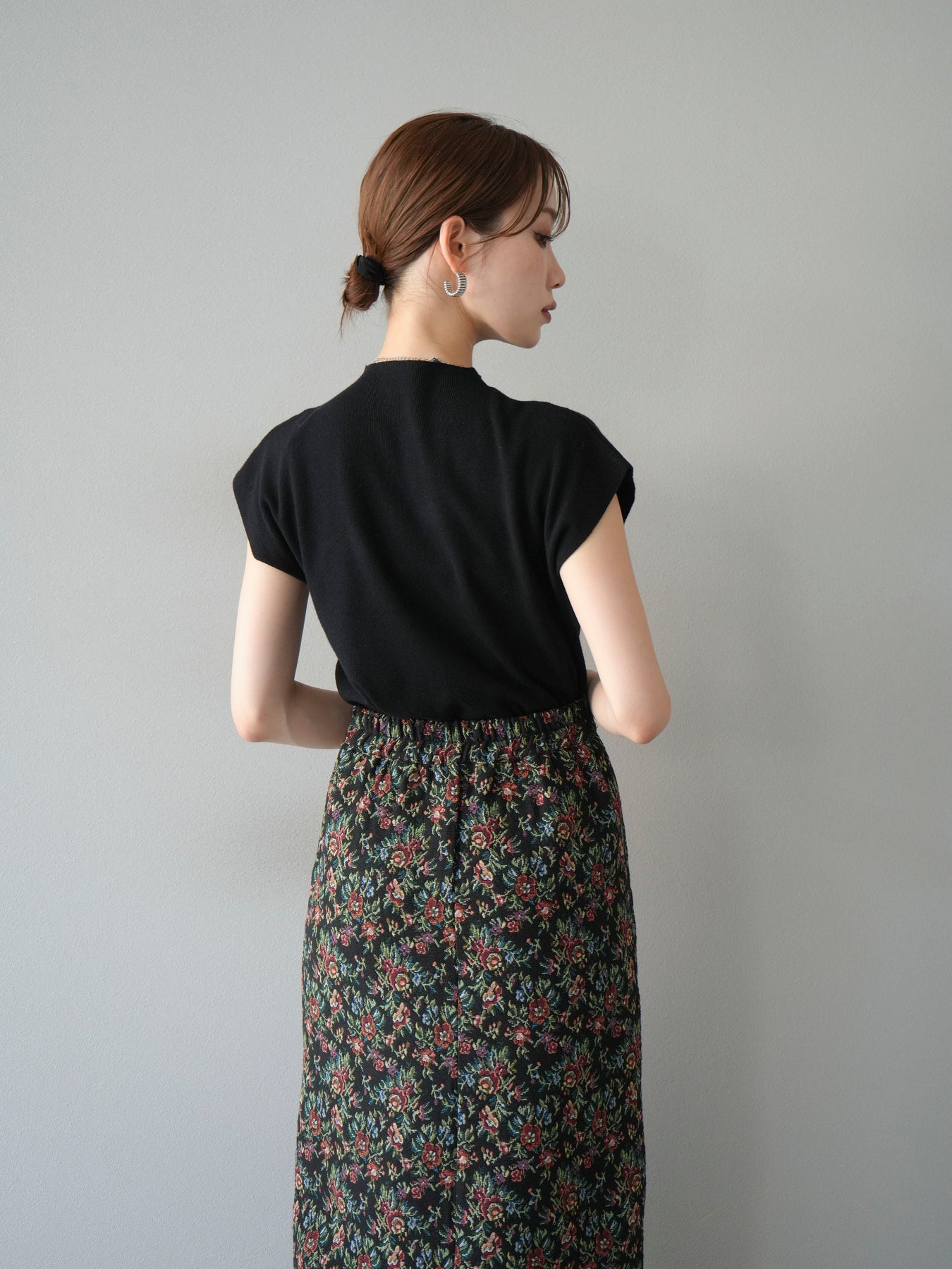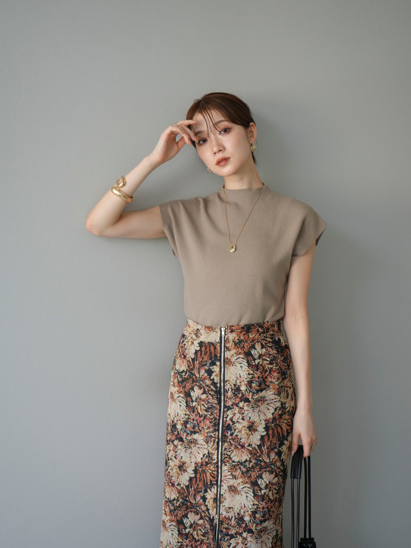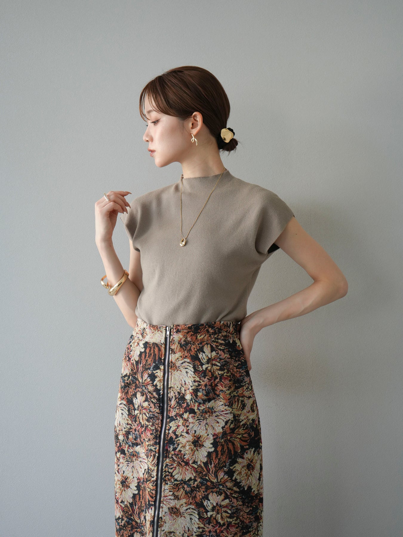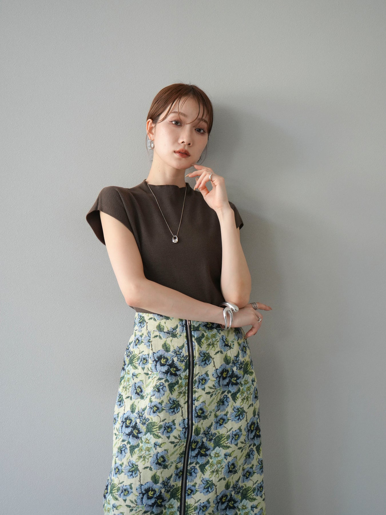 重厚感のあるゴブラン織りで仕立てたフロントジップタイトスカート。クラシカルなフラワーパターンが存在感を放ち、スタイリングに華やかさとヴィンテージライクな雰囲気をプラスします。フロントに施したジップディテールがモードなアクセントとなり、スリットの開き具合を調整して抜け感を演出できるのも魅力。タイトなシルエットながらも程よいストレッチ性があり、動きやすさと美しいラインを両立しています。シンプルなトップスを合わせるだけでコーディネートが完成する、主役級の一枚です。