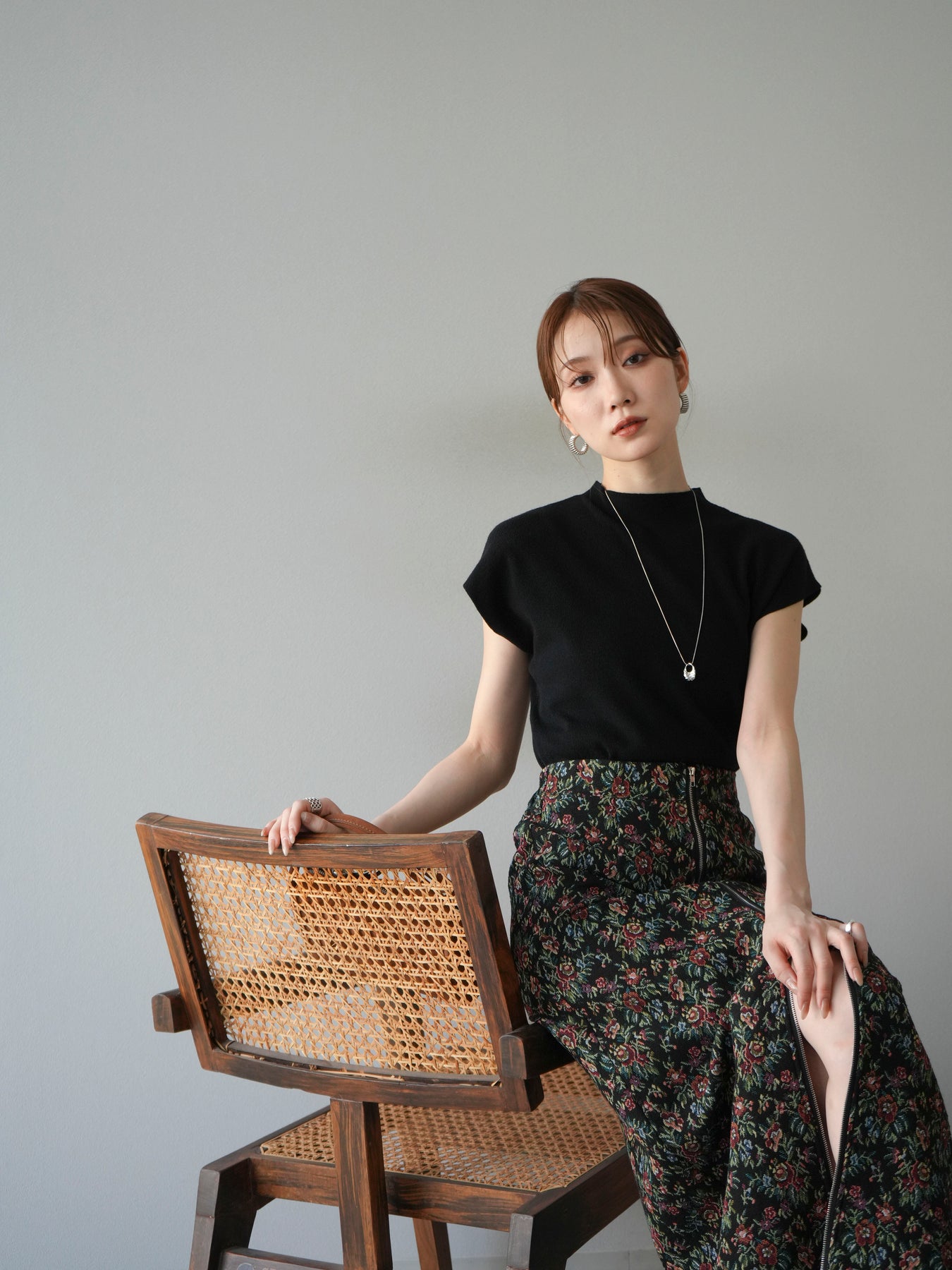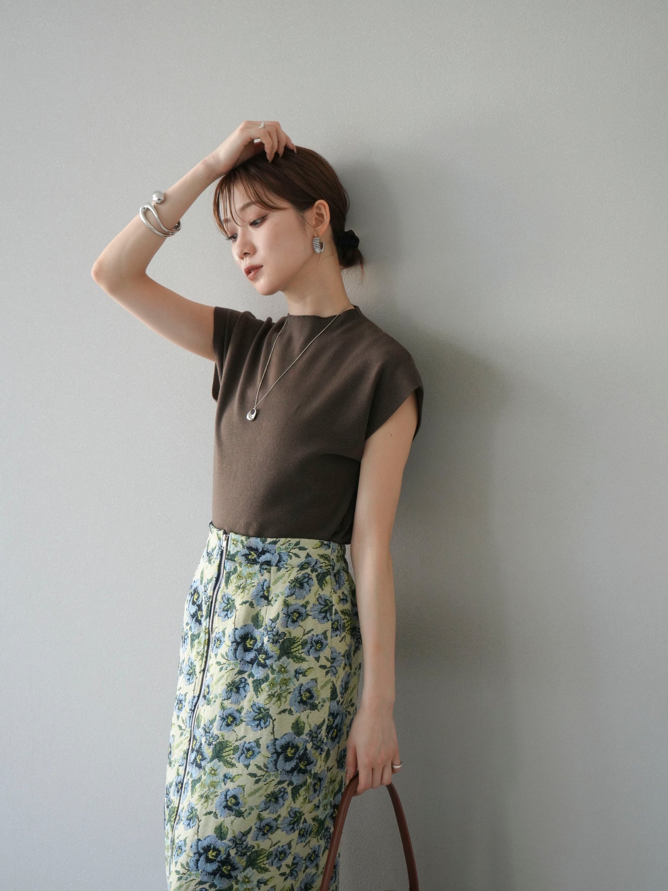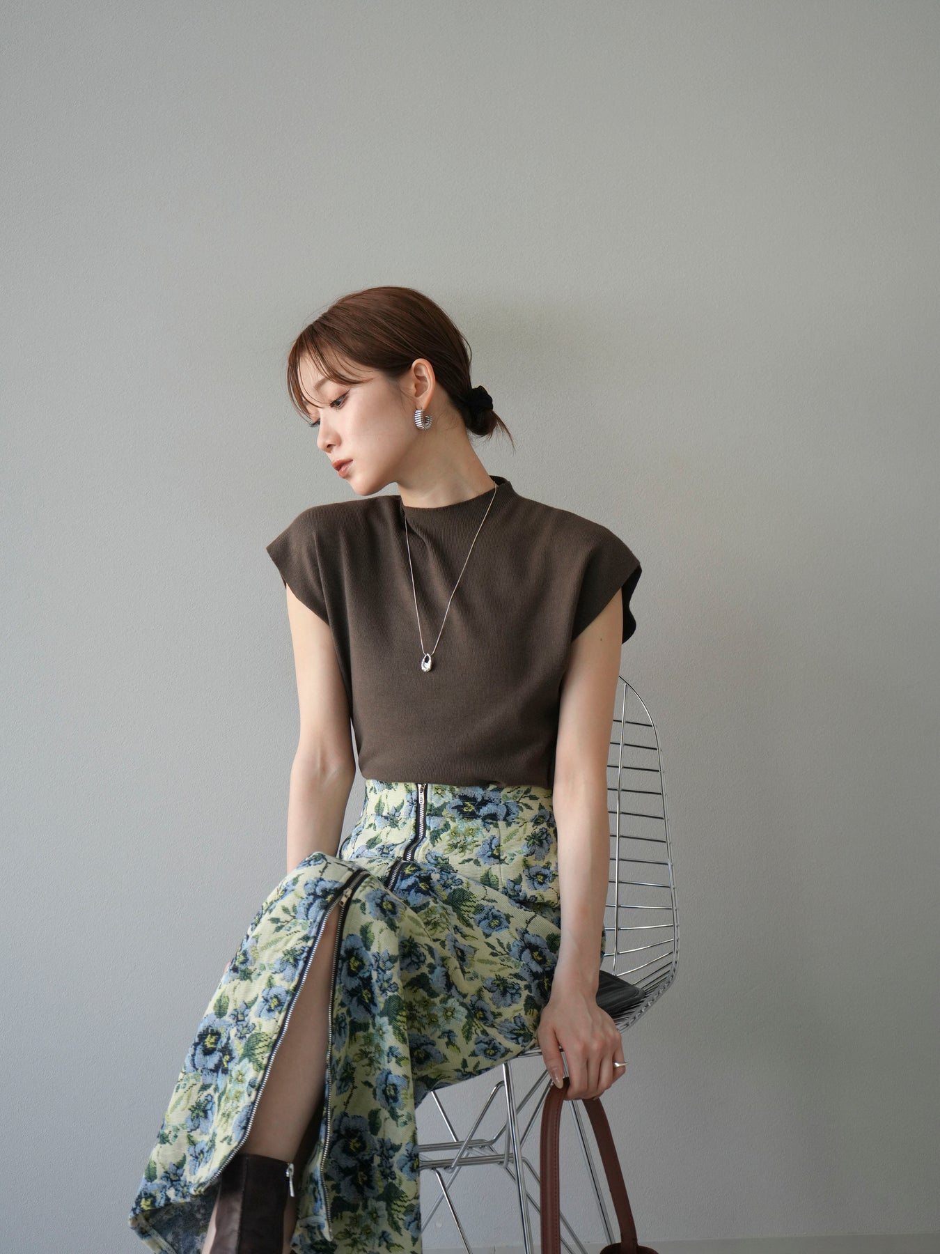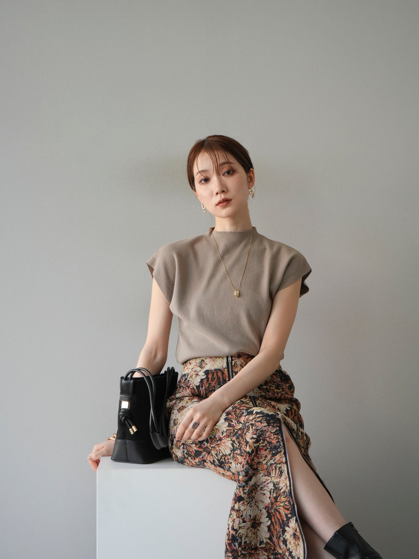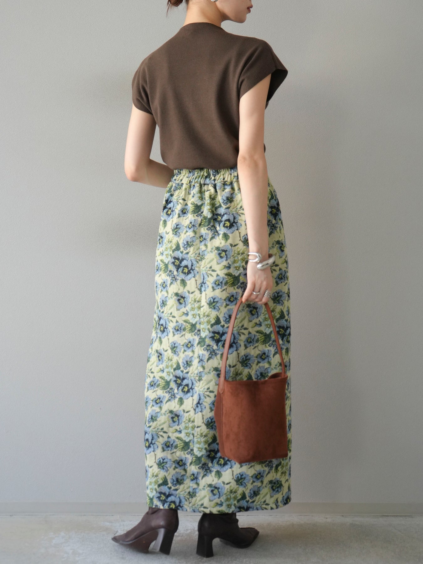 重厚感のあるゴブラン織りで仕立てたフロントジップタイトスカート。クラシカルなフラワーパターンが存在感を放ち、スタイリングに華やかさとヴィンテージライクな雰囲気をプラスします。フロントに施したジップディテールがモードなアクセントとなり、スリットの開き具合を調整して抜け感を演出できるのも魅力。タイトなシルエットながらも程よいストレッチ性があり、動きやすさと美しいラインを両立しています。シンプルなトップスを合わせるだけでコーディネートが完成する、主役級の一枚です。