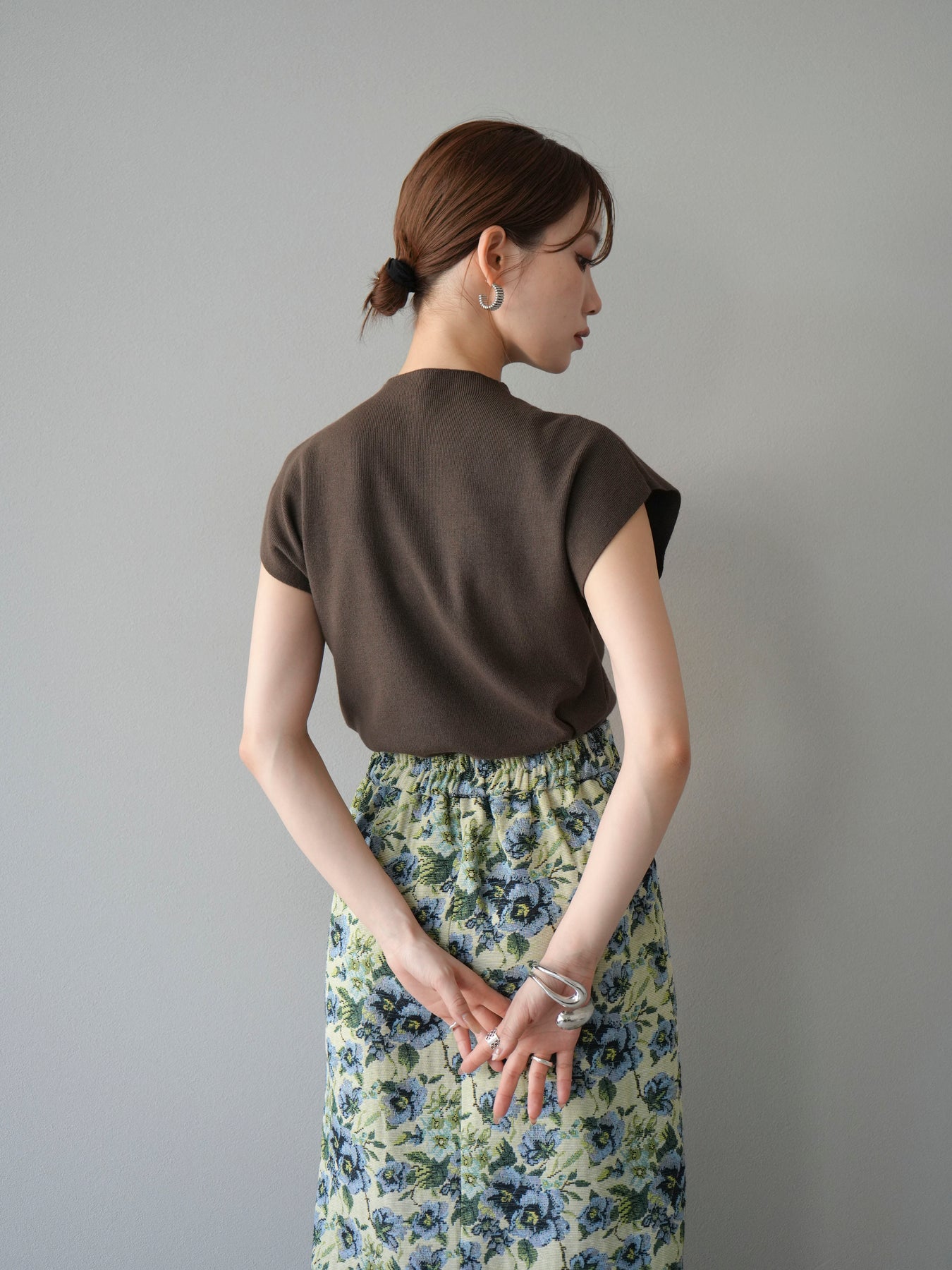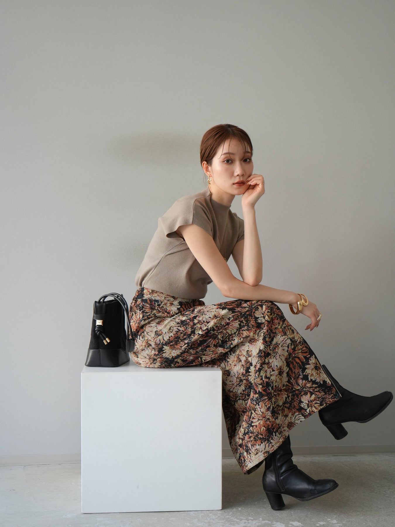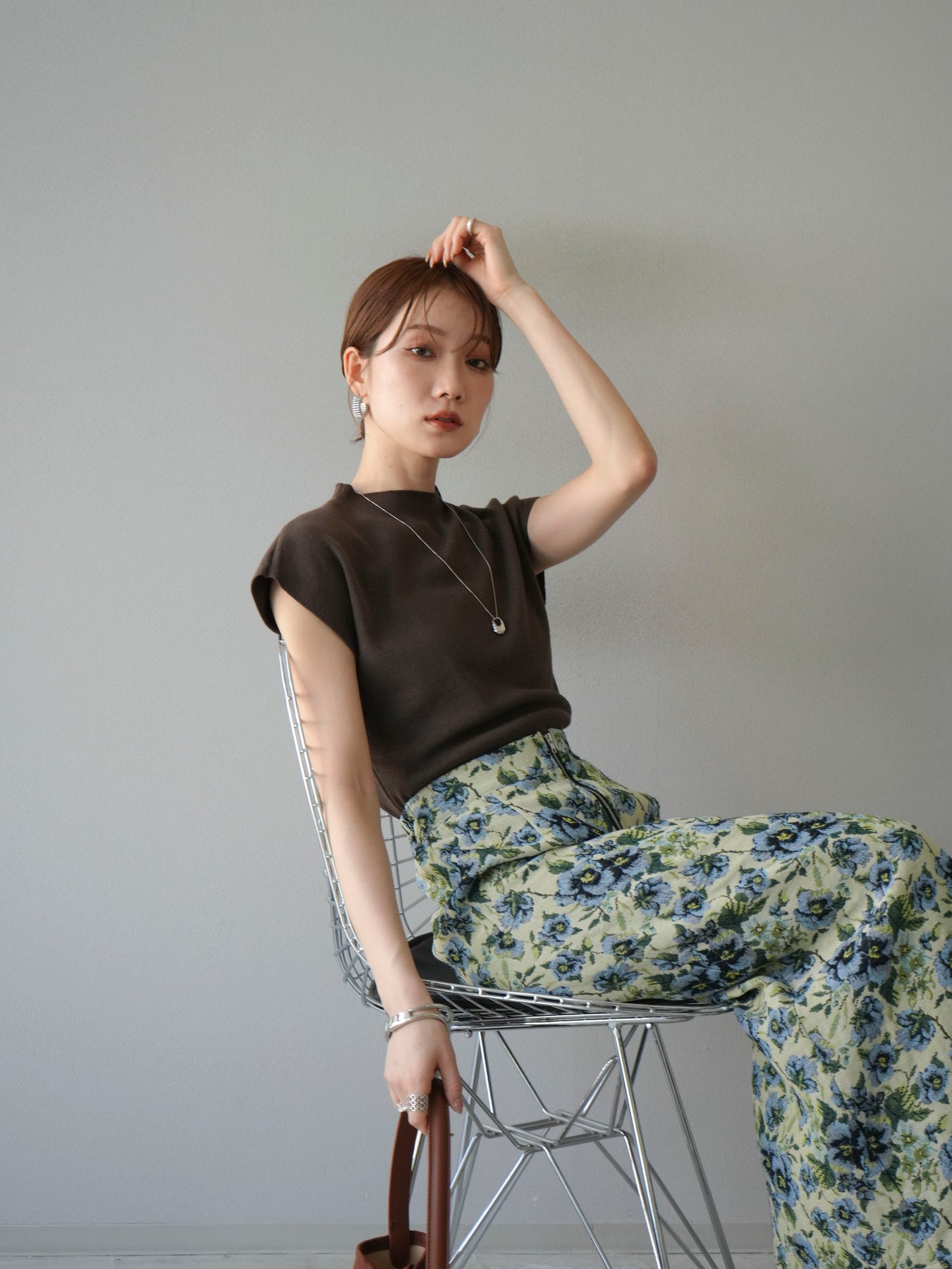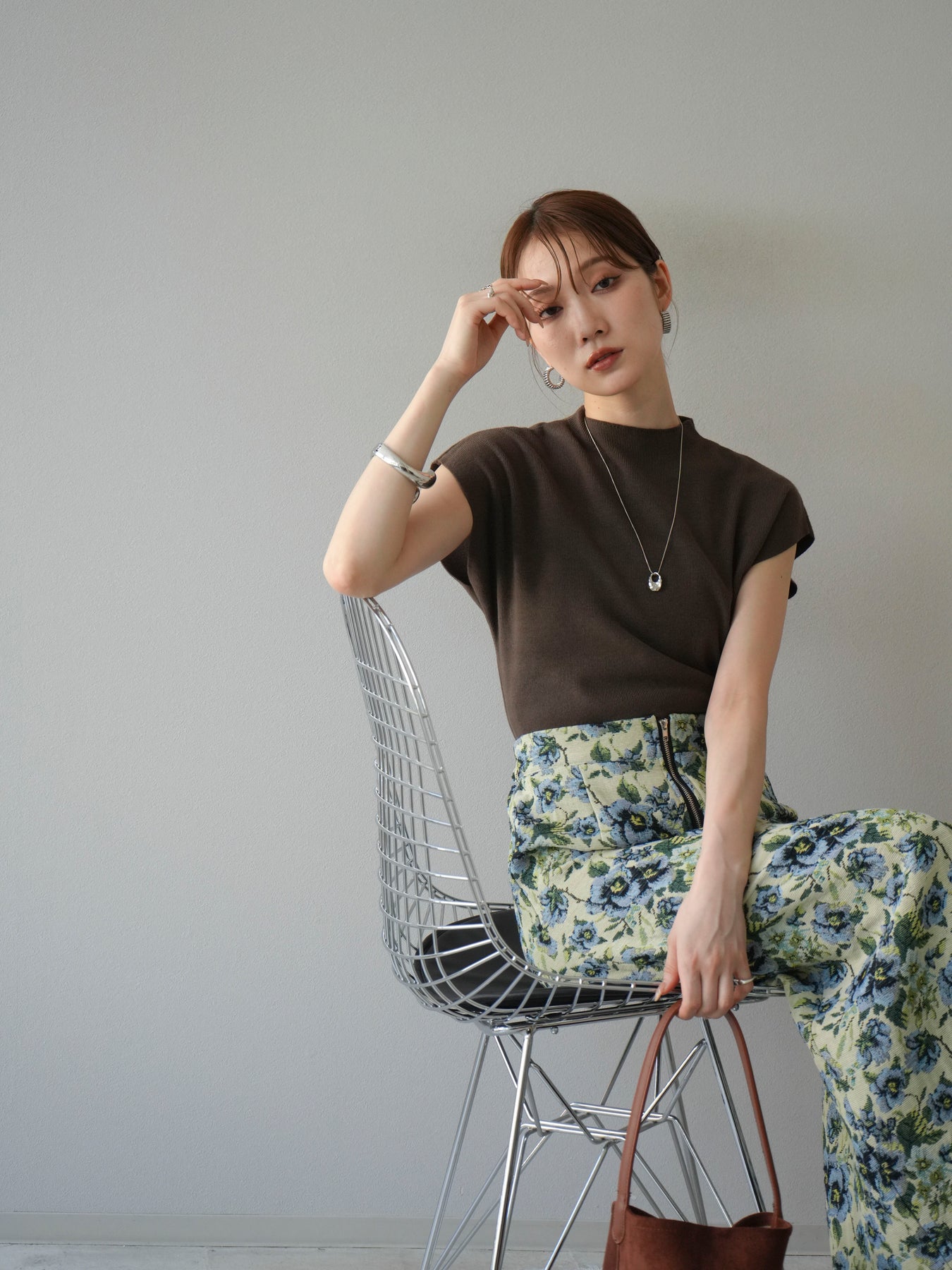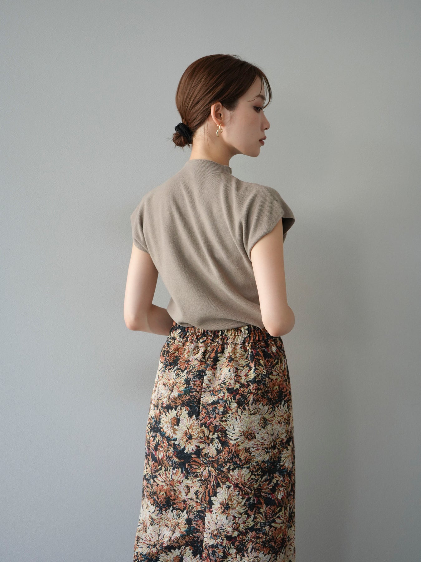 重厚感のあるゴブラン織りで仕立てたフロントジップタイトスカート。クラシカルなフラワーパターンが存在感を放ち、スタイリングに華やかさとヴィンテージライクな雰囲気をプラスします。フロントに施したジップディテールがモードなアクセントとなり、スリットの開き具合を調整して抜け感を演出できるのも魅力。タイトなシルエットながらも程よいストレッチ性があり、動きやすさと美しいラインを両立しています。シンプルなトップスを合わせるだけでコーディネートが完成する、主役級の一枚です。
