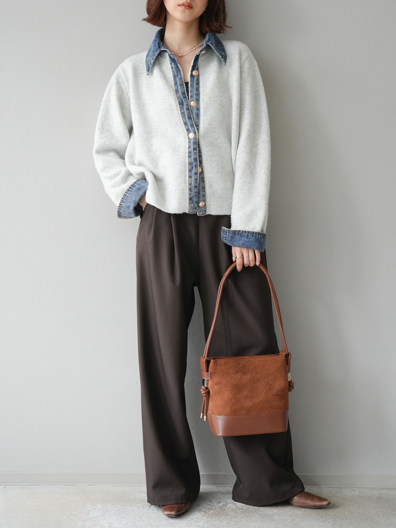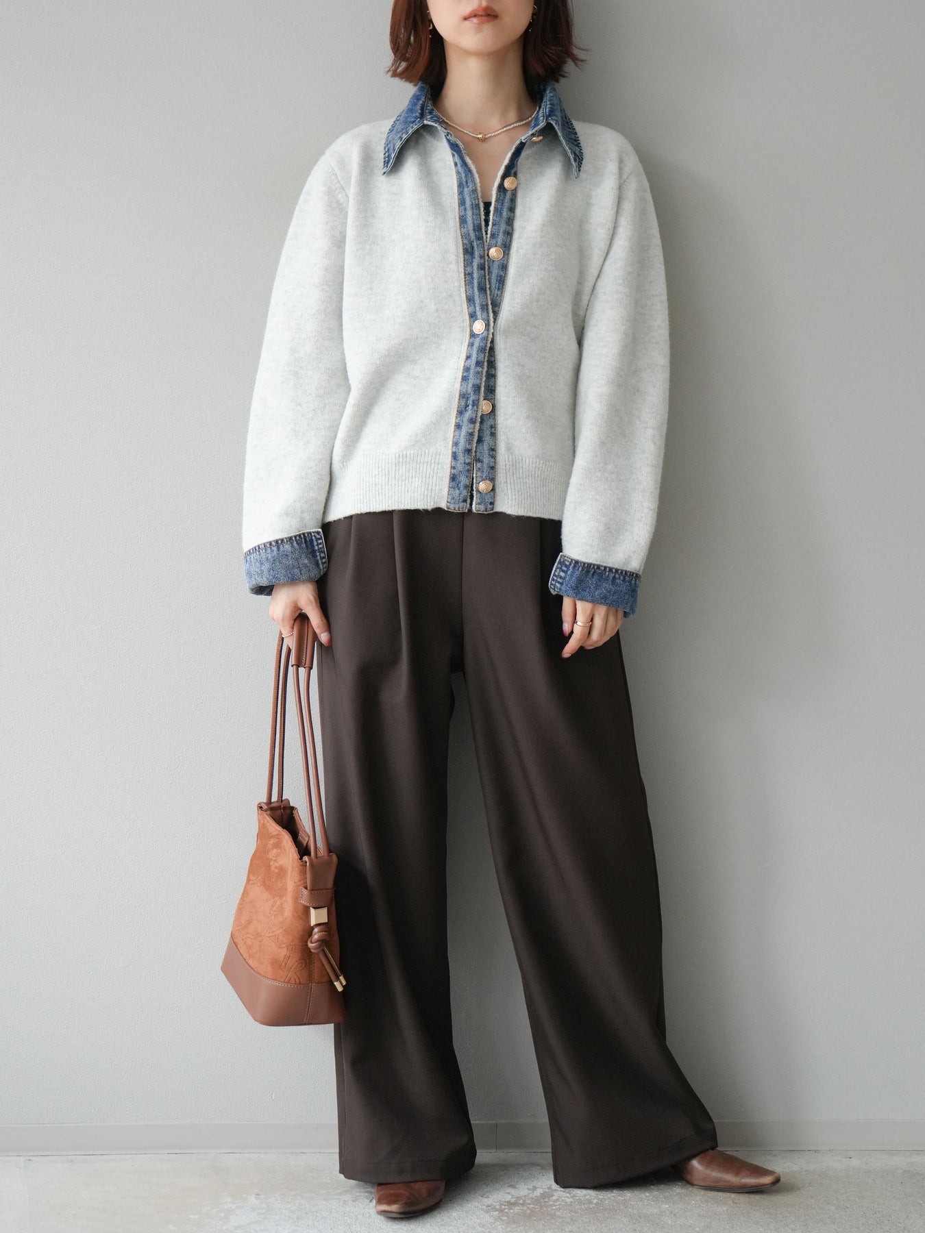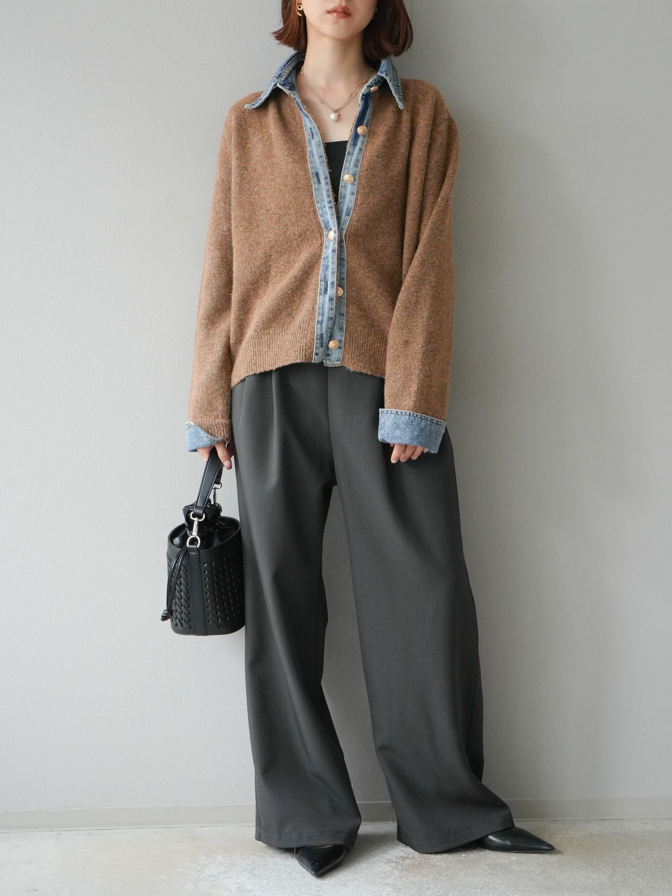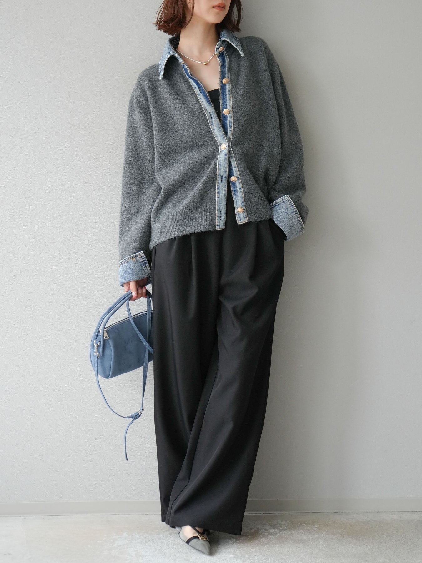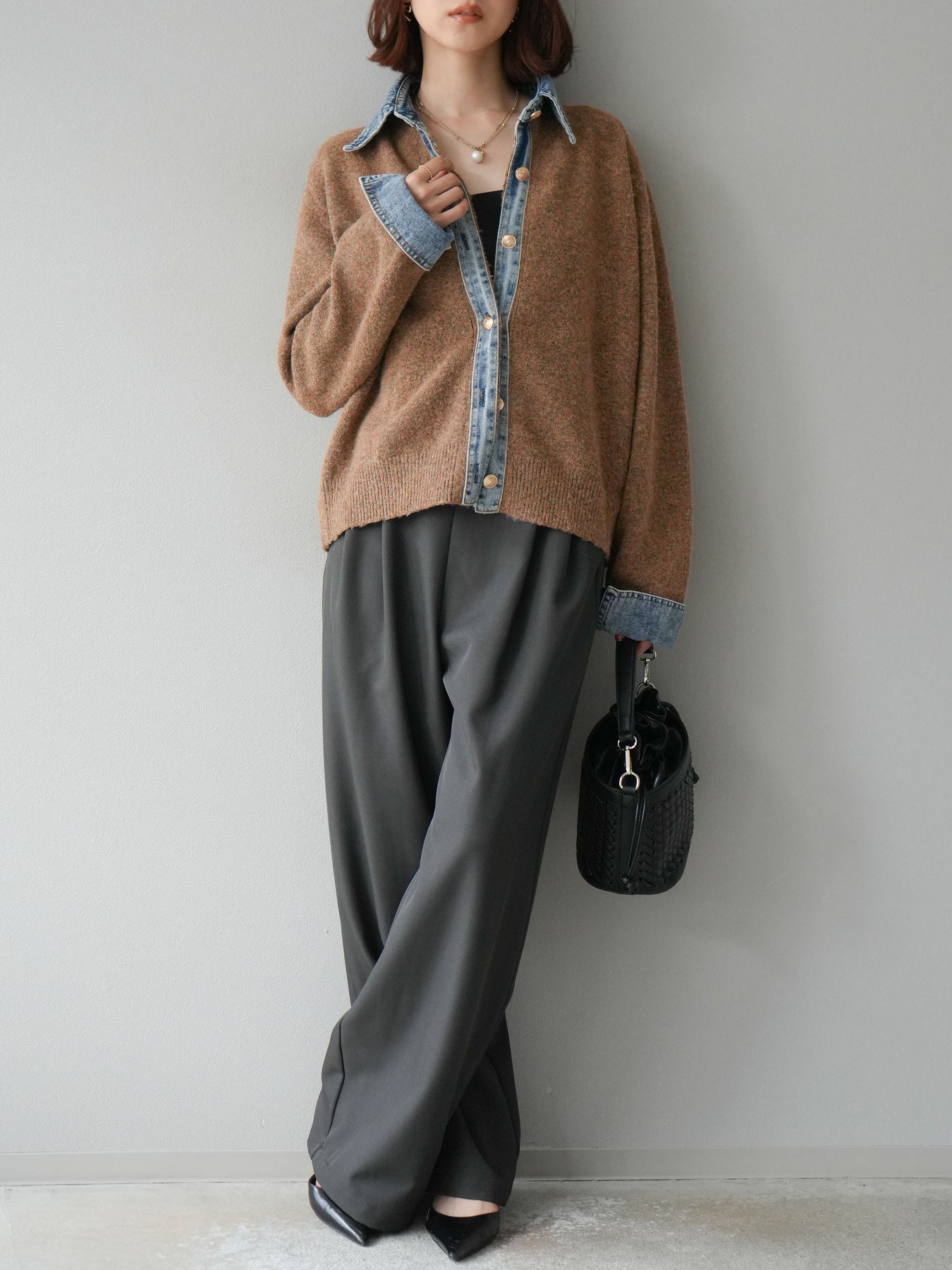 [SET]デニム襟ボタンニットカーディガン+エステルタックワイドパンツ(2set)