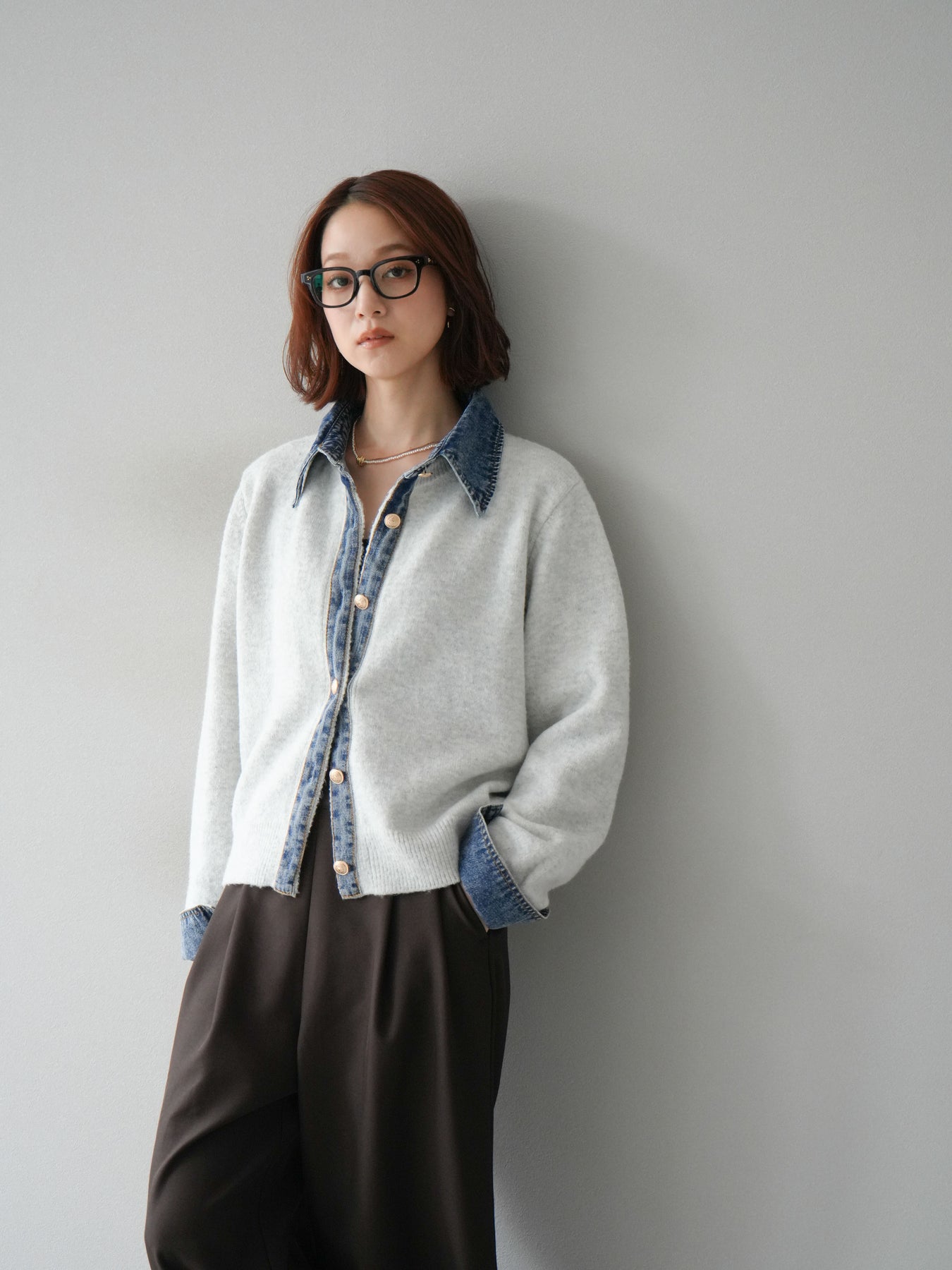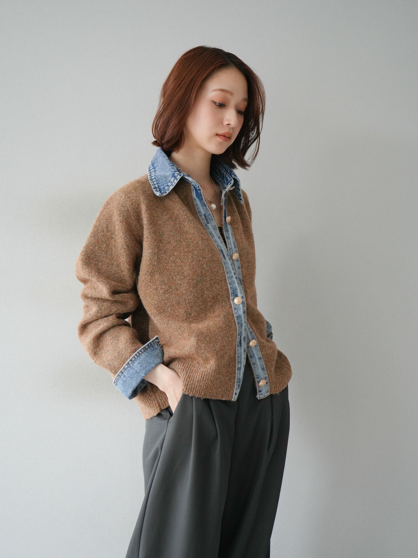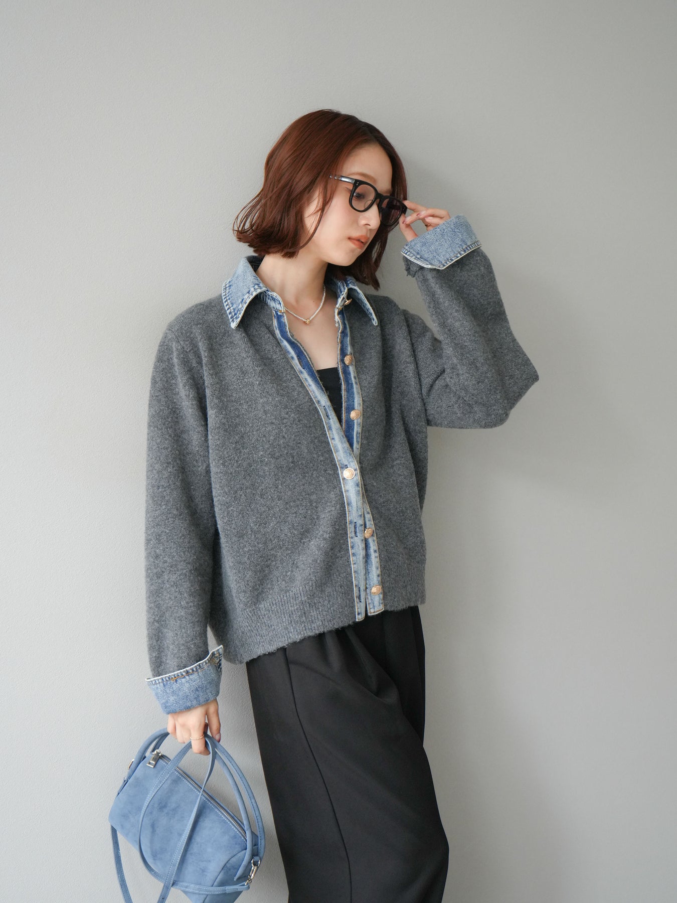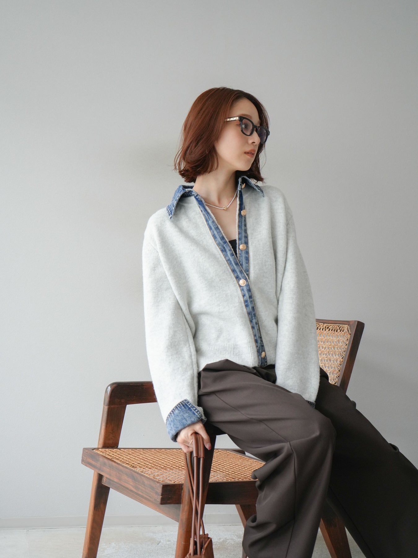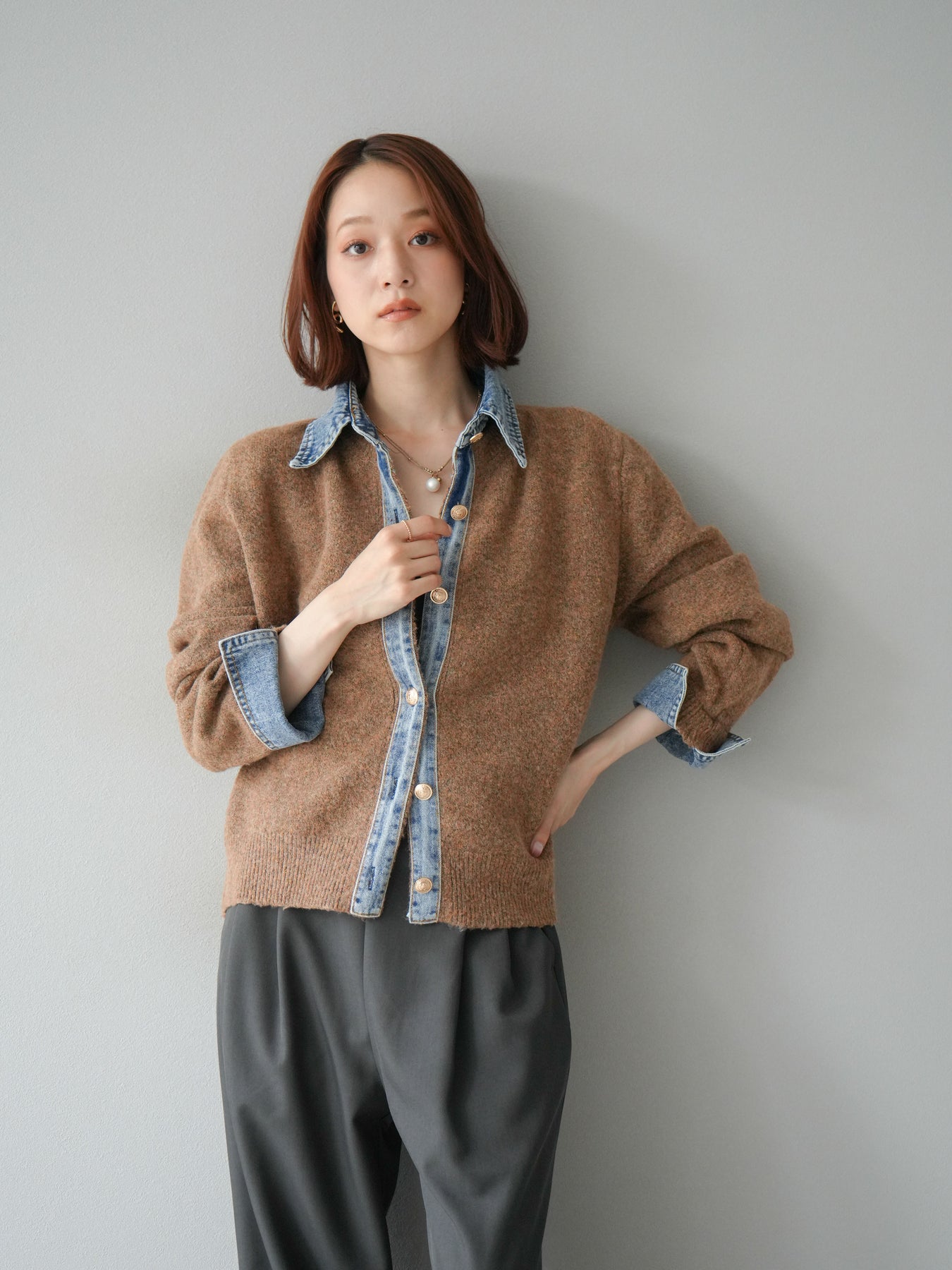 柔らかなニットにデニム素材を組み合わせた、遊び心のあるデザインカーディガン。襟・前立て・袖口に施されたデニムがアクセントとなり、シンプルなシルエットにメリハリをプラスしています。ほどよいゆとりのあるサイズ感で、羽織りとしても一枚着としても活躍。カジュアルながらも大人っぽさを感じさせる一枚で、デイリーコーデの主役になるアイテムです。 ※ボトムス、キャミソール(インナー)以外の商品は一律でインナーは付属していません。
