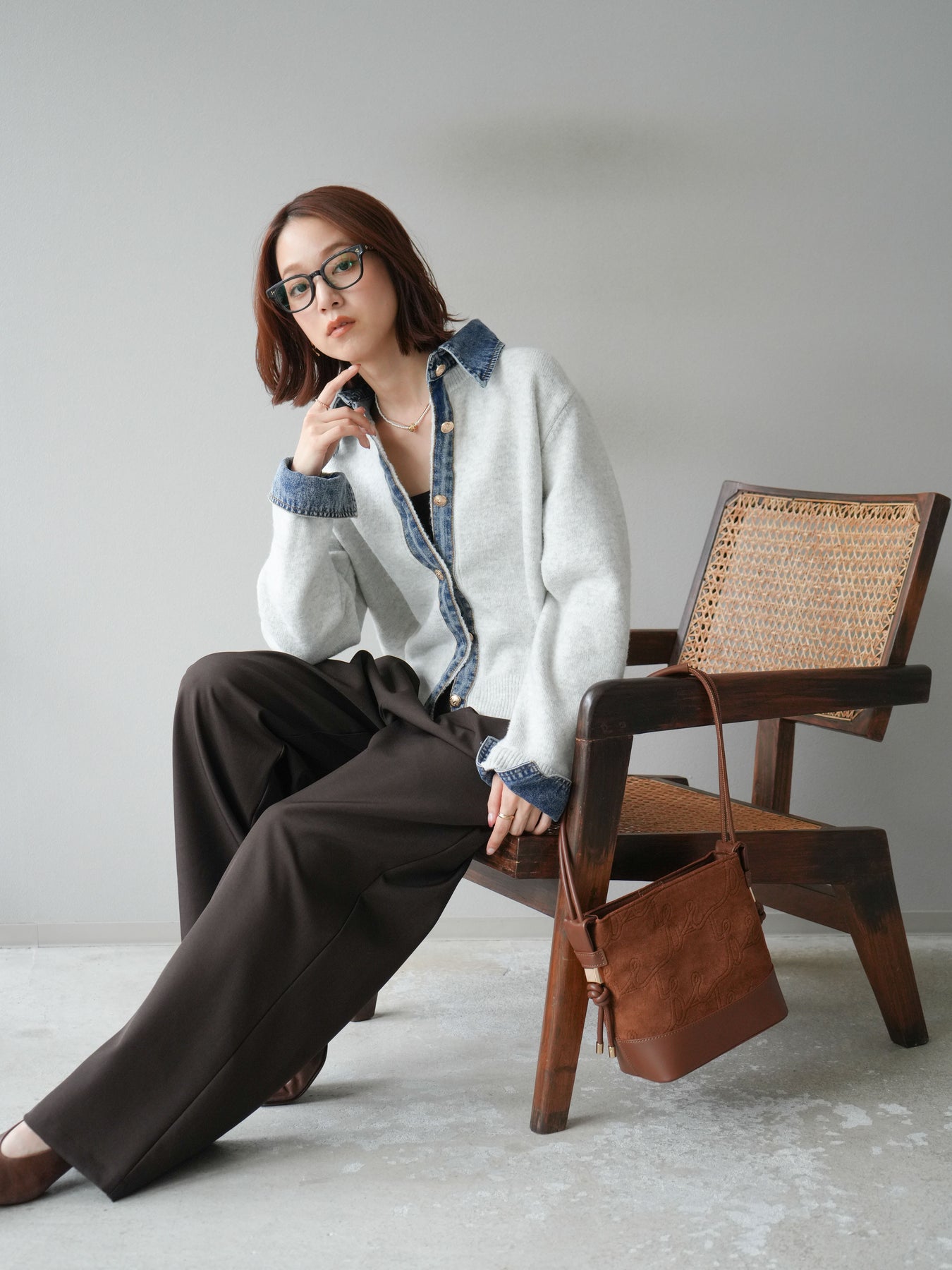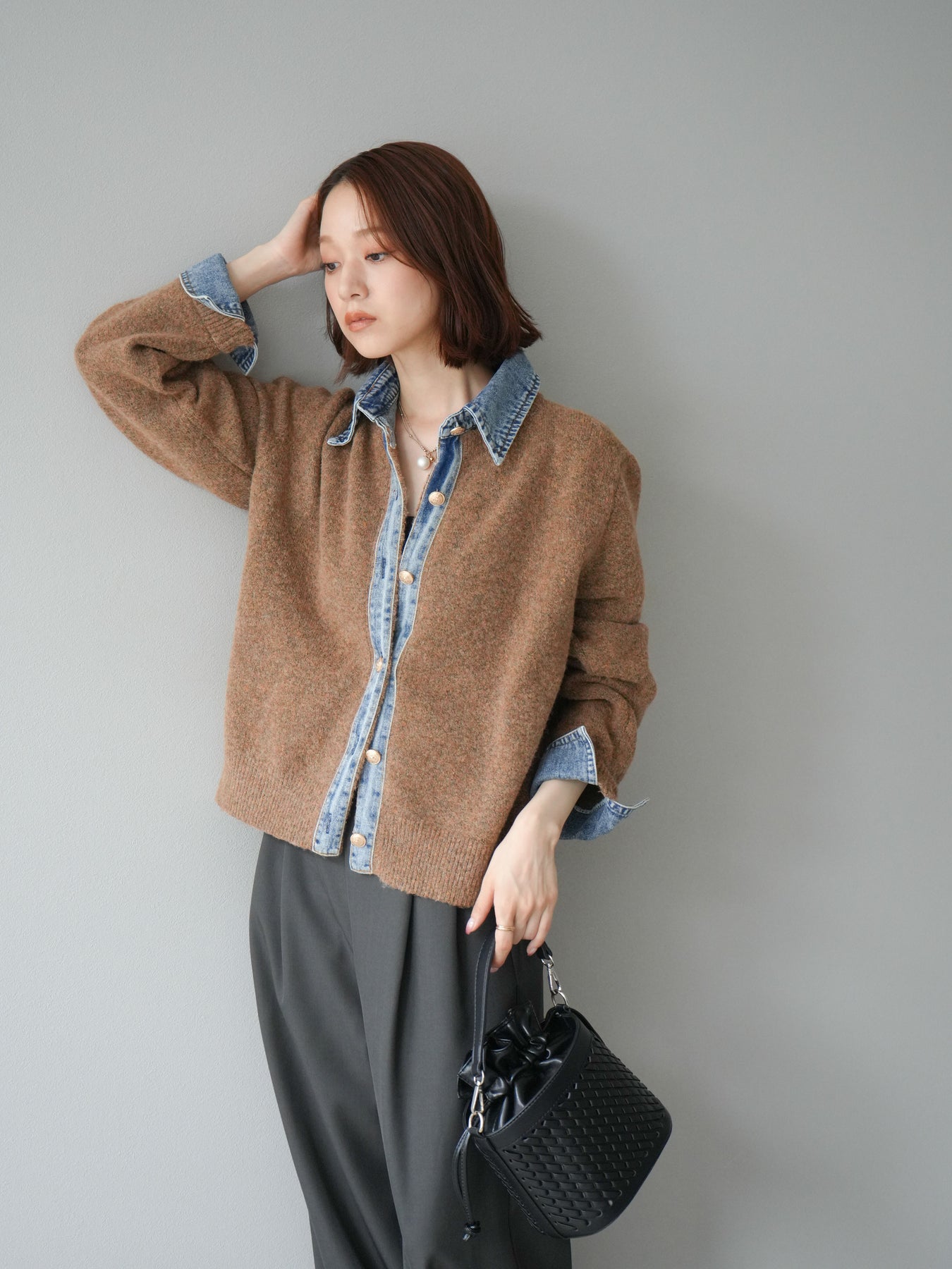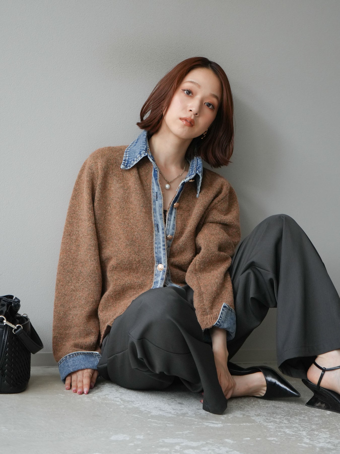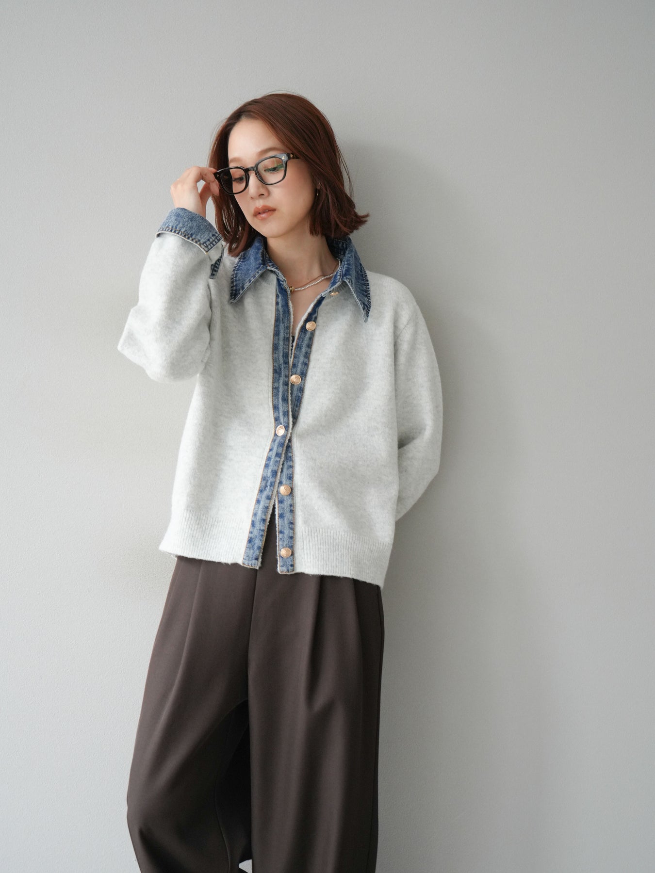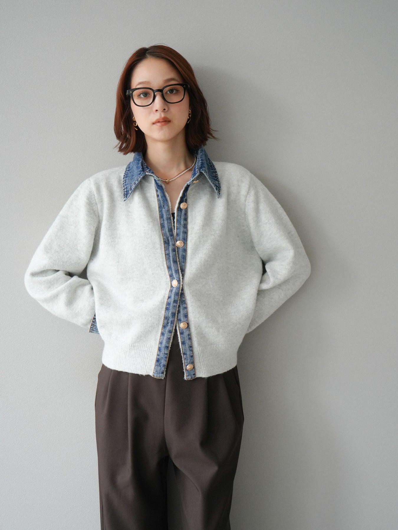 柔らかなニットにデニム素材を組み合わせた、遊び心のあるデザインカーディガン。襟・前立て・袖口に施されたデニムがアクセントとなり、シンプルなシルエットにメリハリをプラスしています。ほどよいゆとりのあるサイズ感で、羽織りとしても一枚着としても活躍。カジュアルながらも大人っぽさを感じさせる一枚で、デイリーコーデの主役になるアイテムです。 ※ボトムス、キャミソール(インナー)以外の商品は一律でインナーは付属していません。