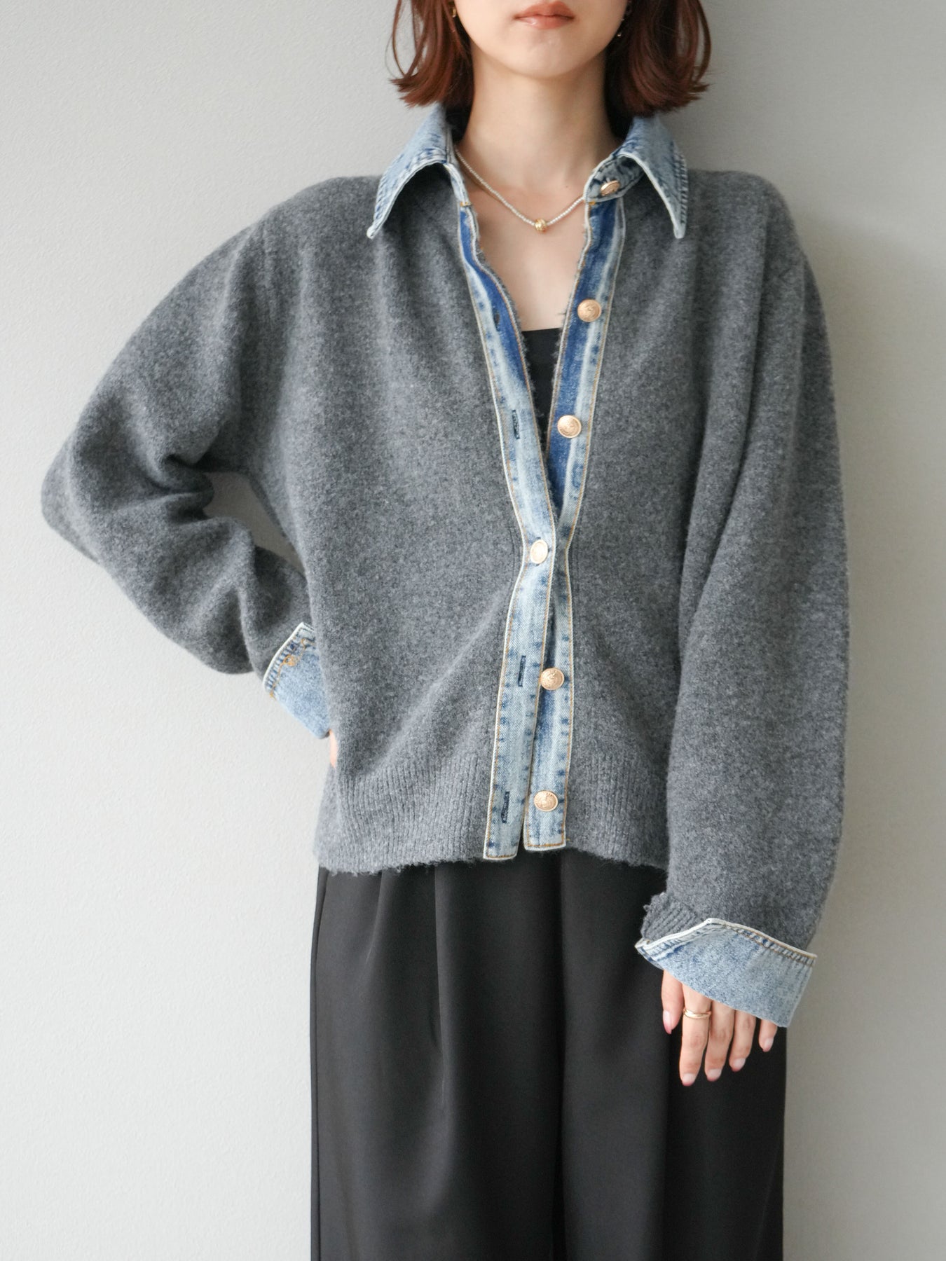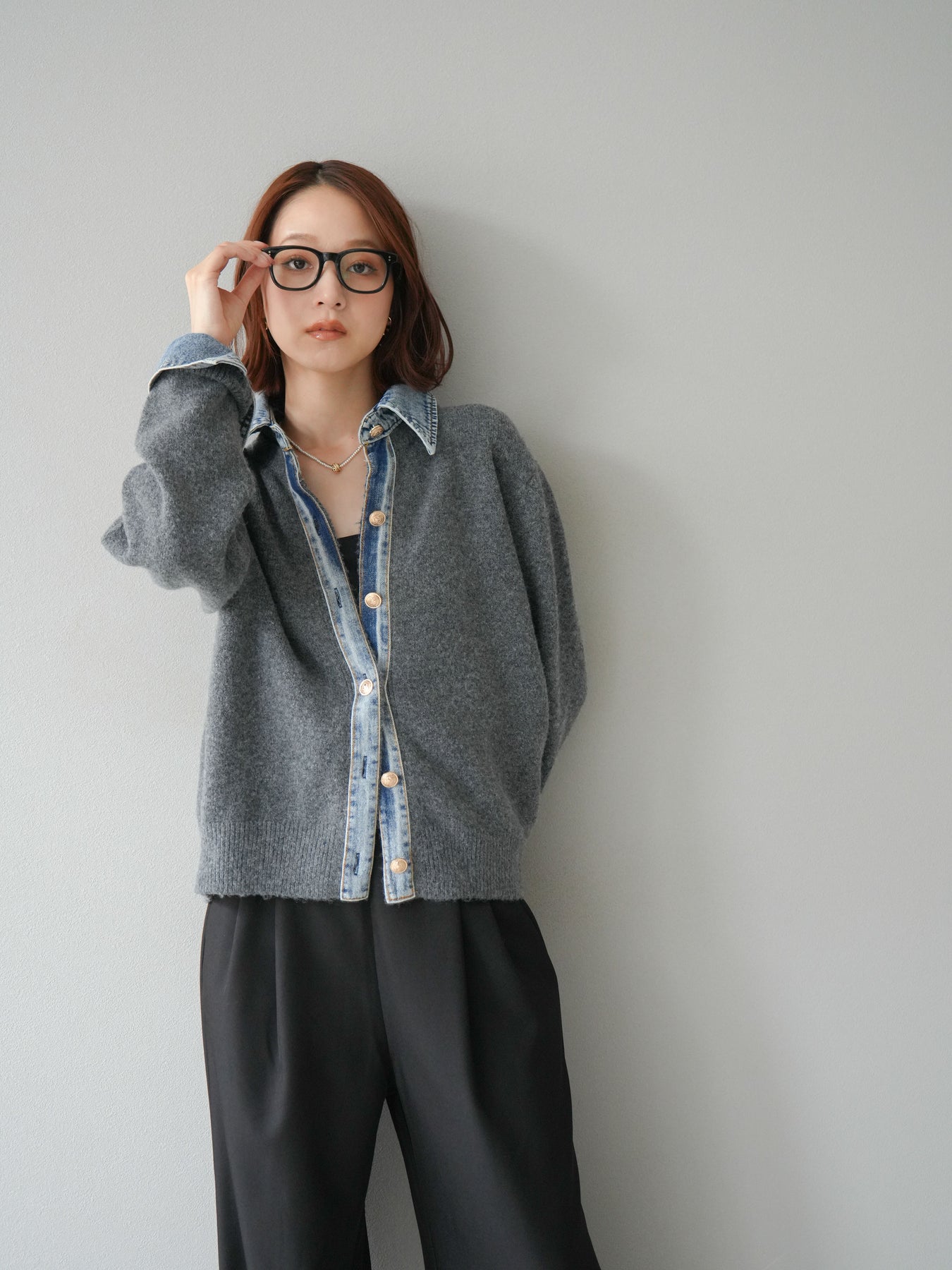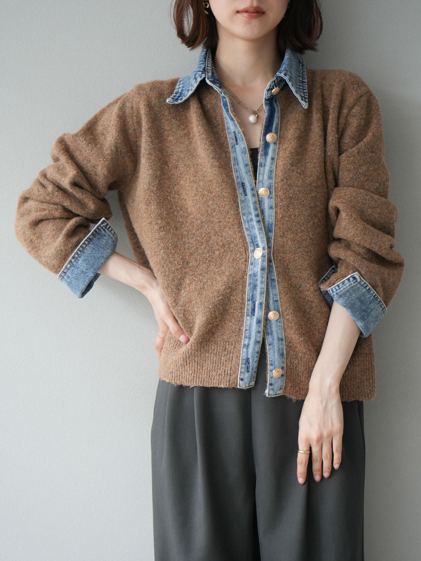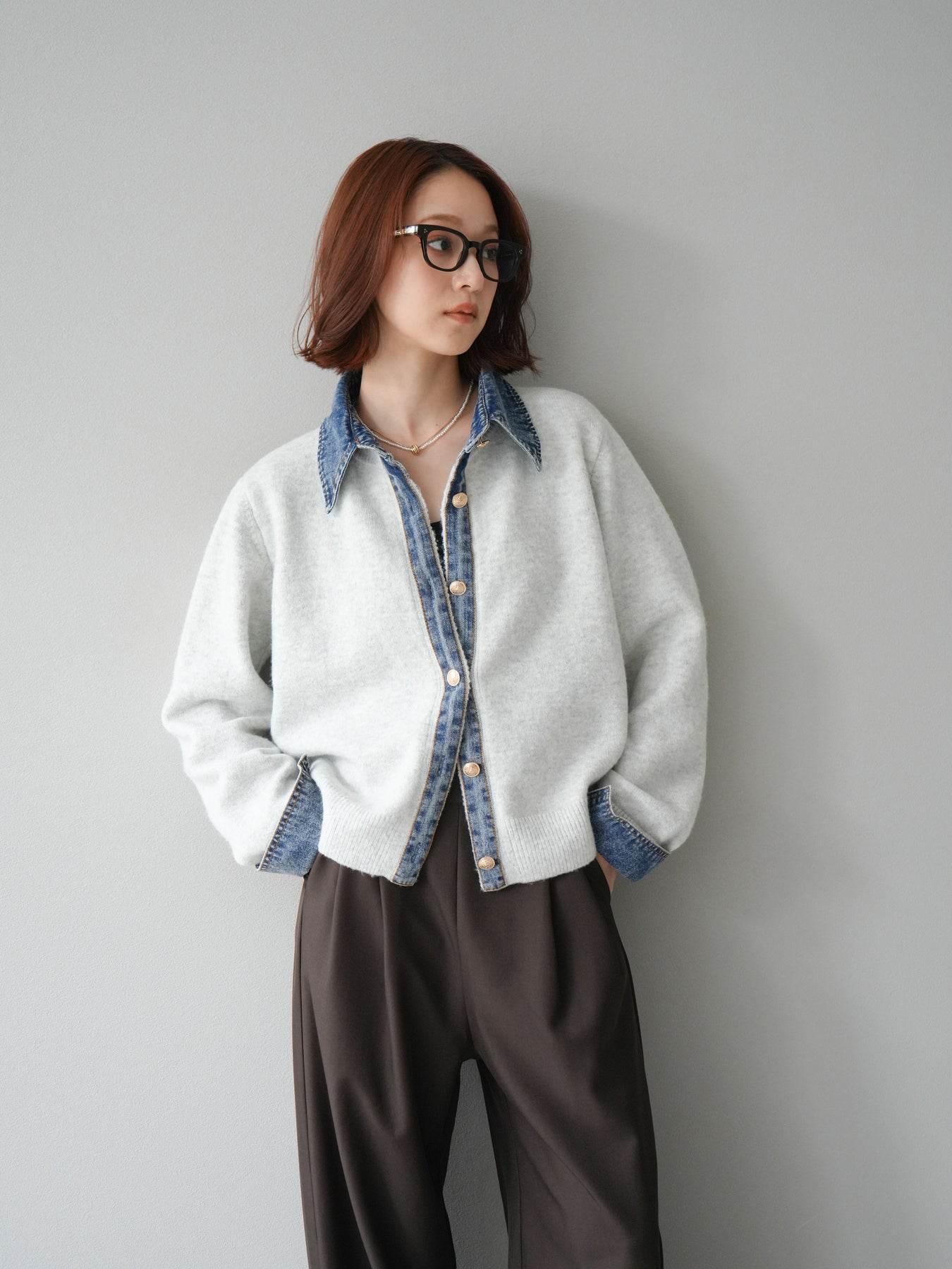 柔らかなニットにデニム素材を組み合わせた、遊び心のあるデザインカーディガン。襟・前立て・袖口に施されたデニムがアクセントとなり、シンプルなシルエットにメリハリをプラスしています。ほどよいゆとりのあるサイズ感で、羽織りとしても一枚着としても活躍。カジュアルながらも大人っぽさを感じさせる一枚で、デイリーコーデの主役になるアイテムです。 ※ボトムス、キャミソール(インナー)以外の商品は一律でインナーは付属していません。