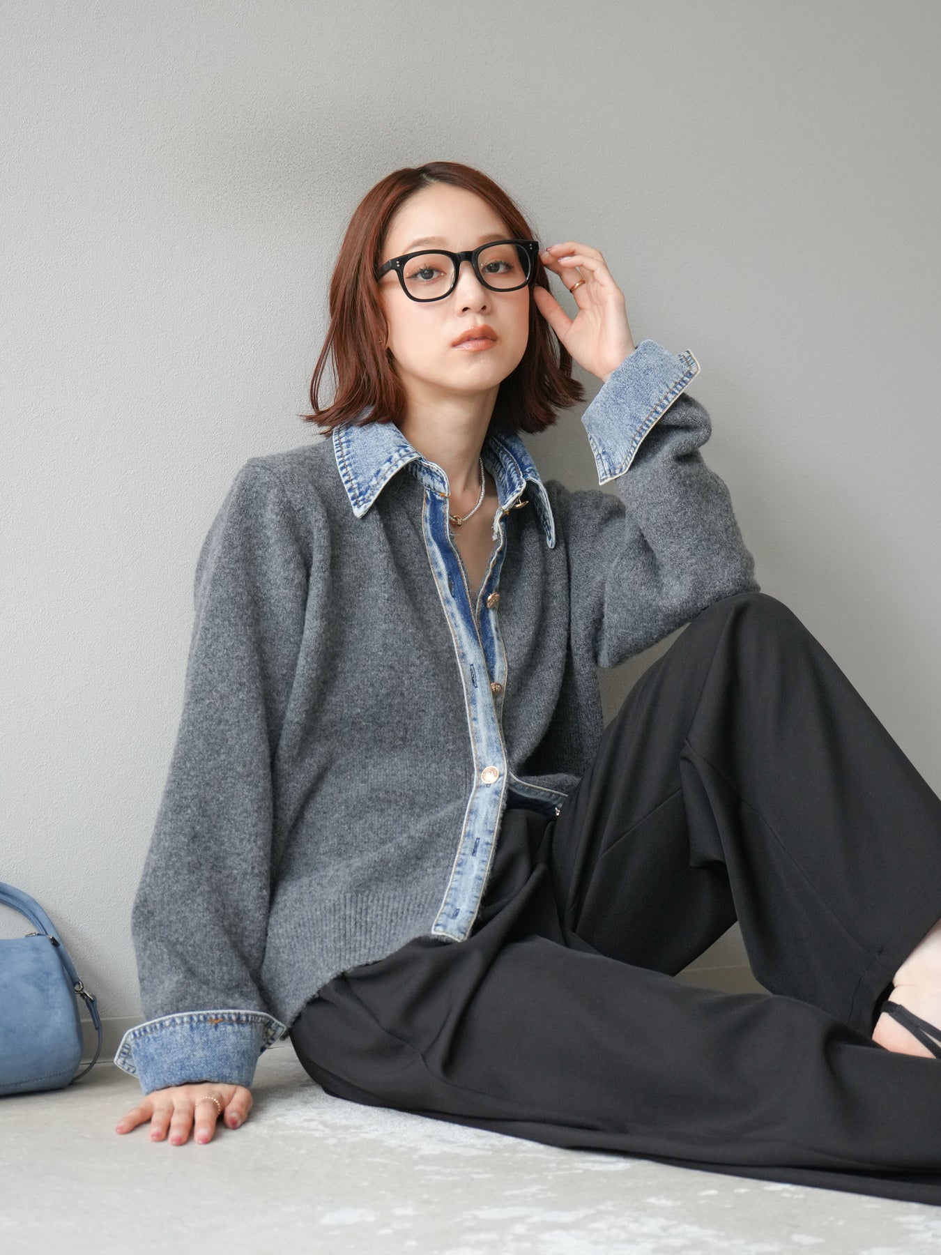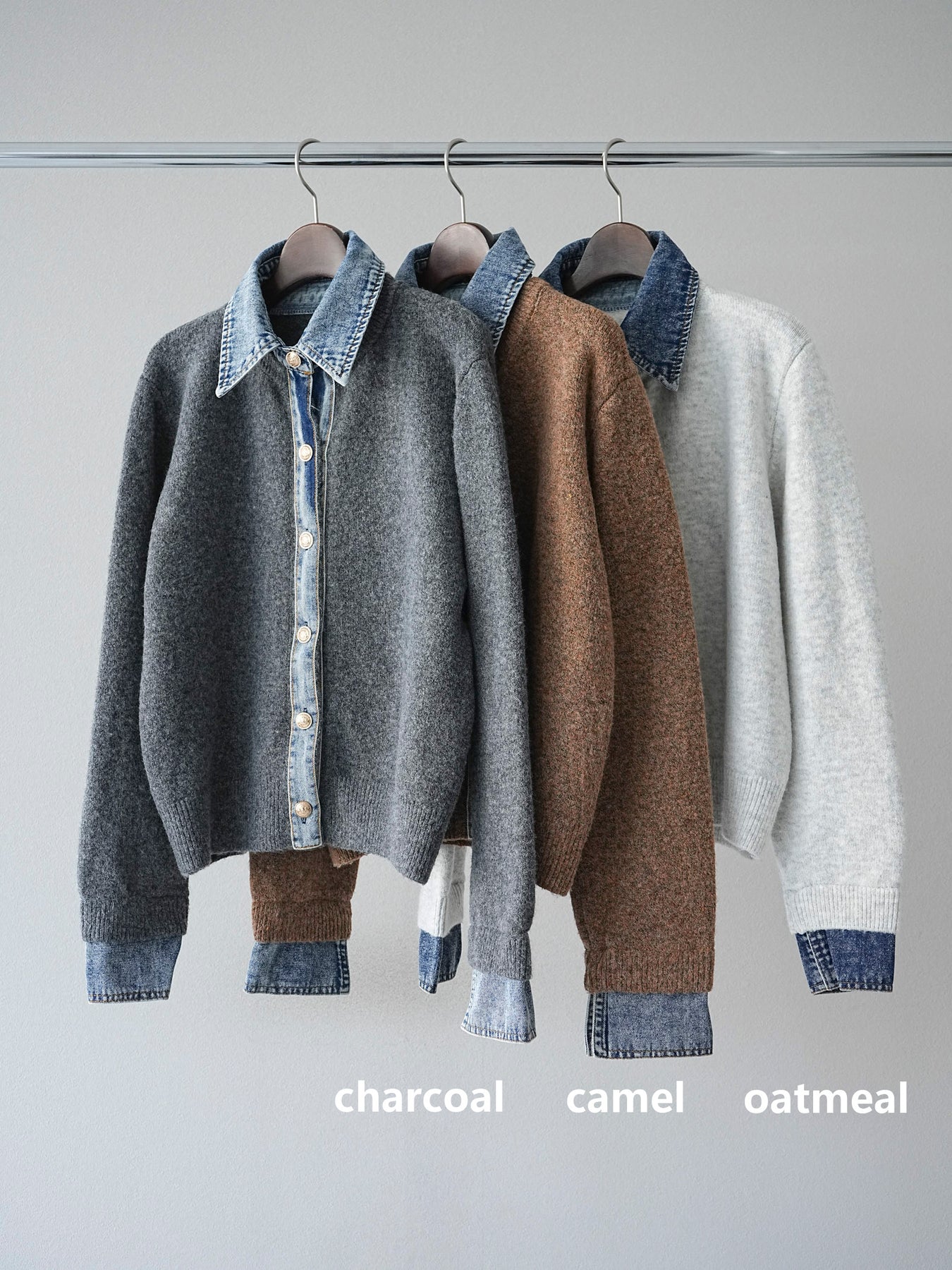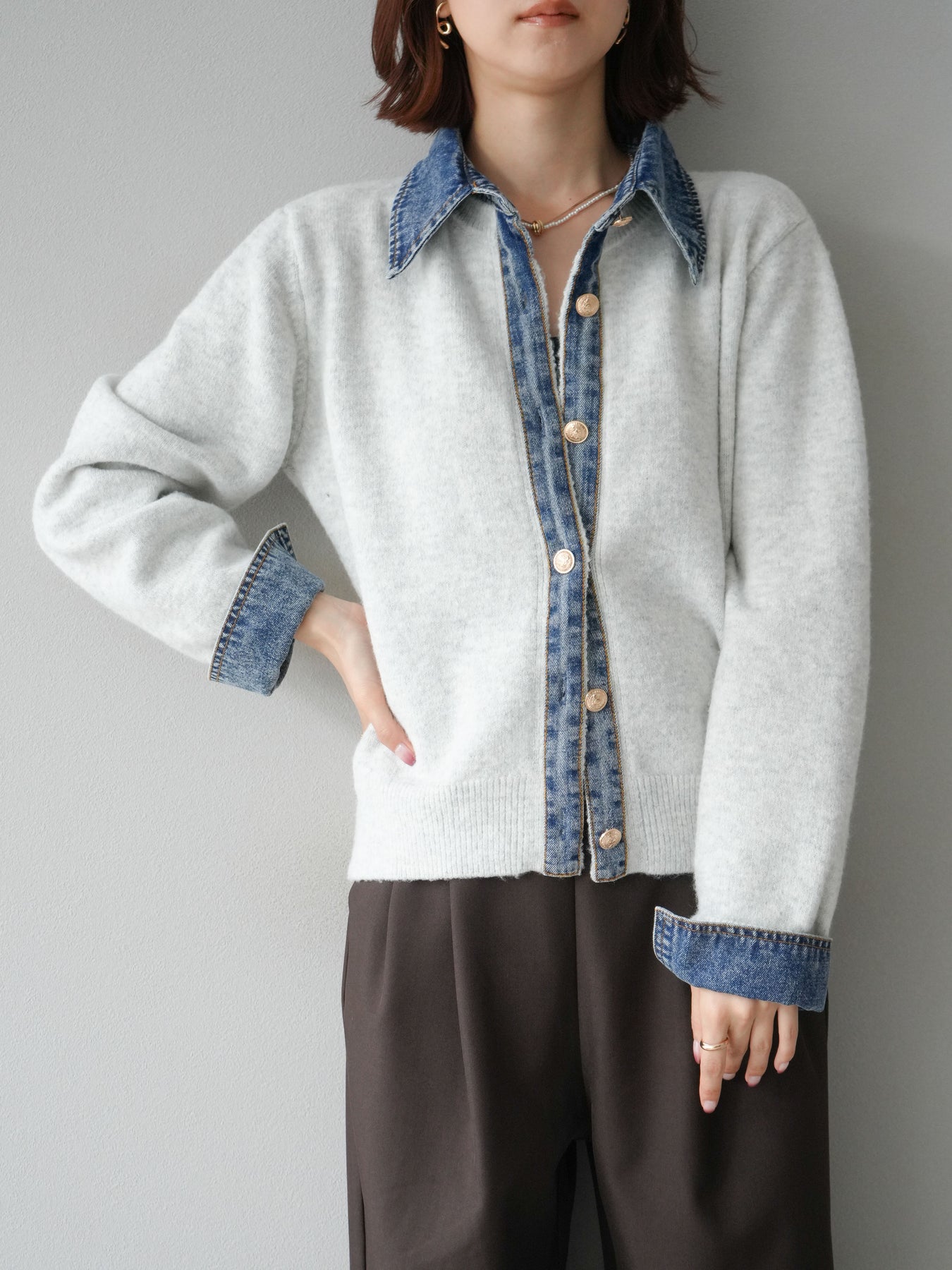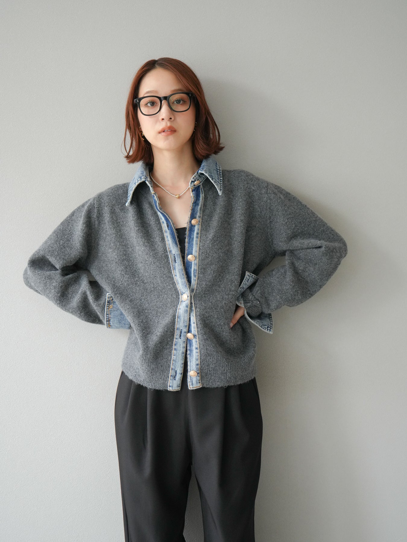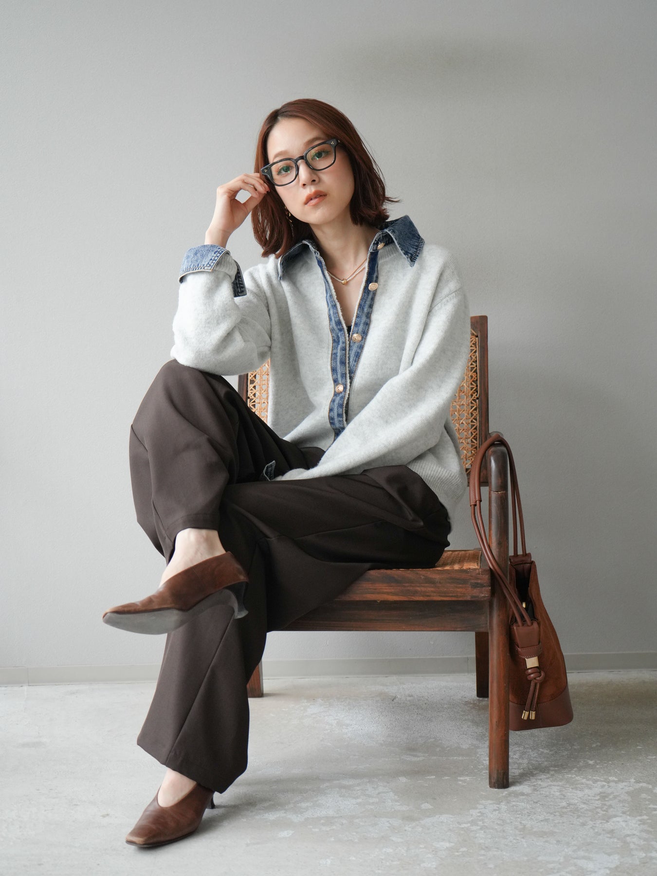 柔らかなニットにデニム素材を組み合わせた、遊び心のあるデザインカーディガン。襟・前立て・袖口に施されたデニムがアクセントとなり、シンプルなシルエットにメリハリをプラスしています。ほどよいゆとりのあるサイズ感で、羽織りとしても一枚着としても活躍。カジュアルながらも大人っぽさを感じさせる一枚で、デイリーコーデの主役になるアイテムです。 ※ボトムス、キャミソール(インナー)以外の商品は一律でインナーは付属していません。