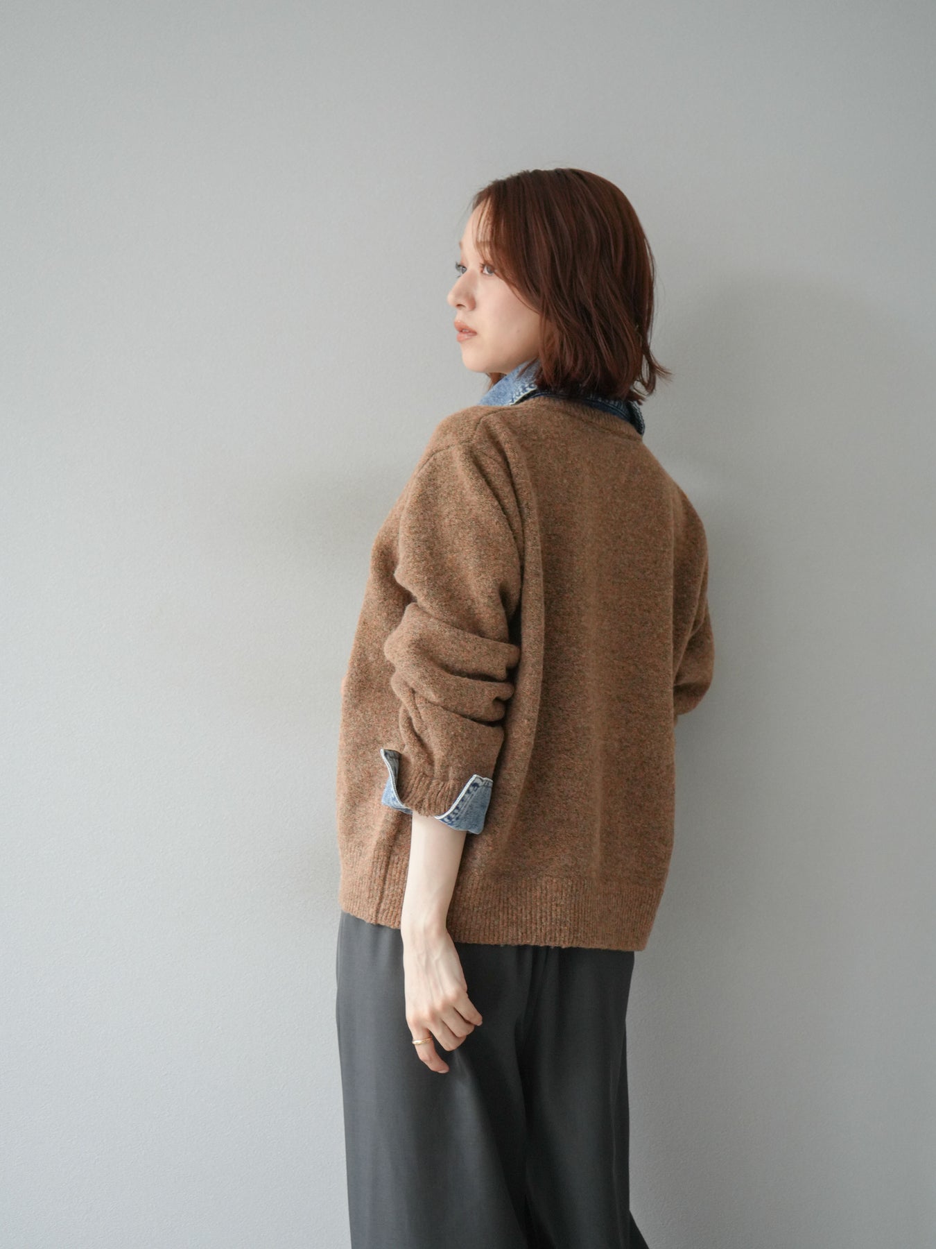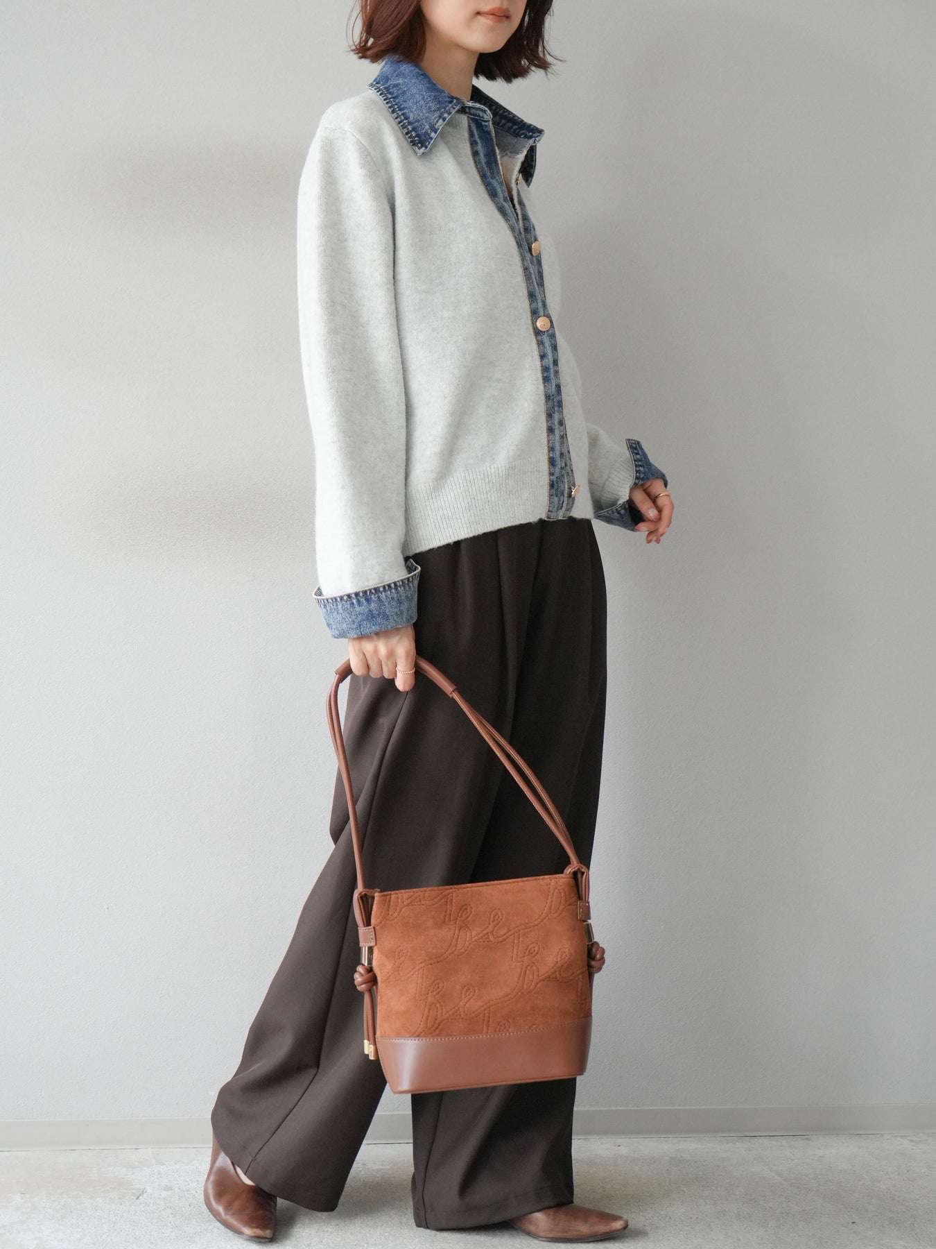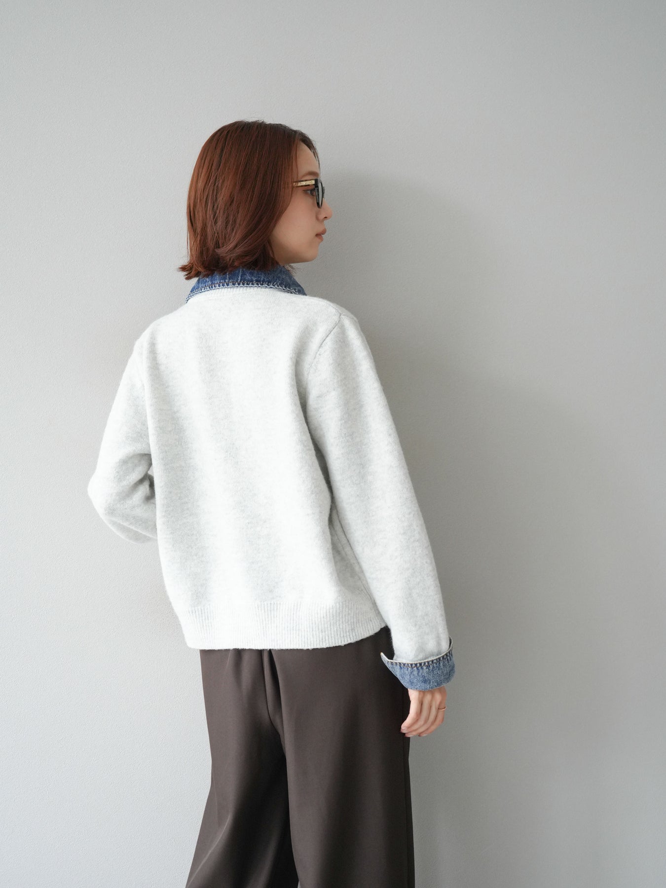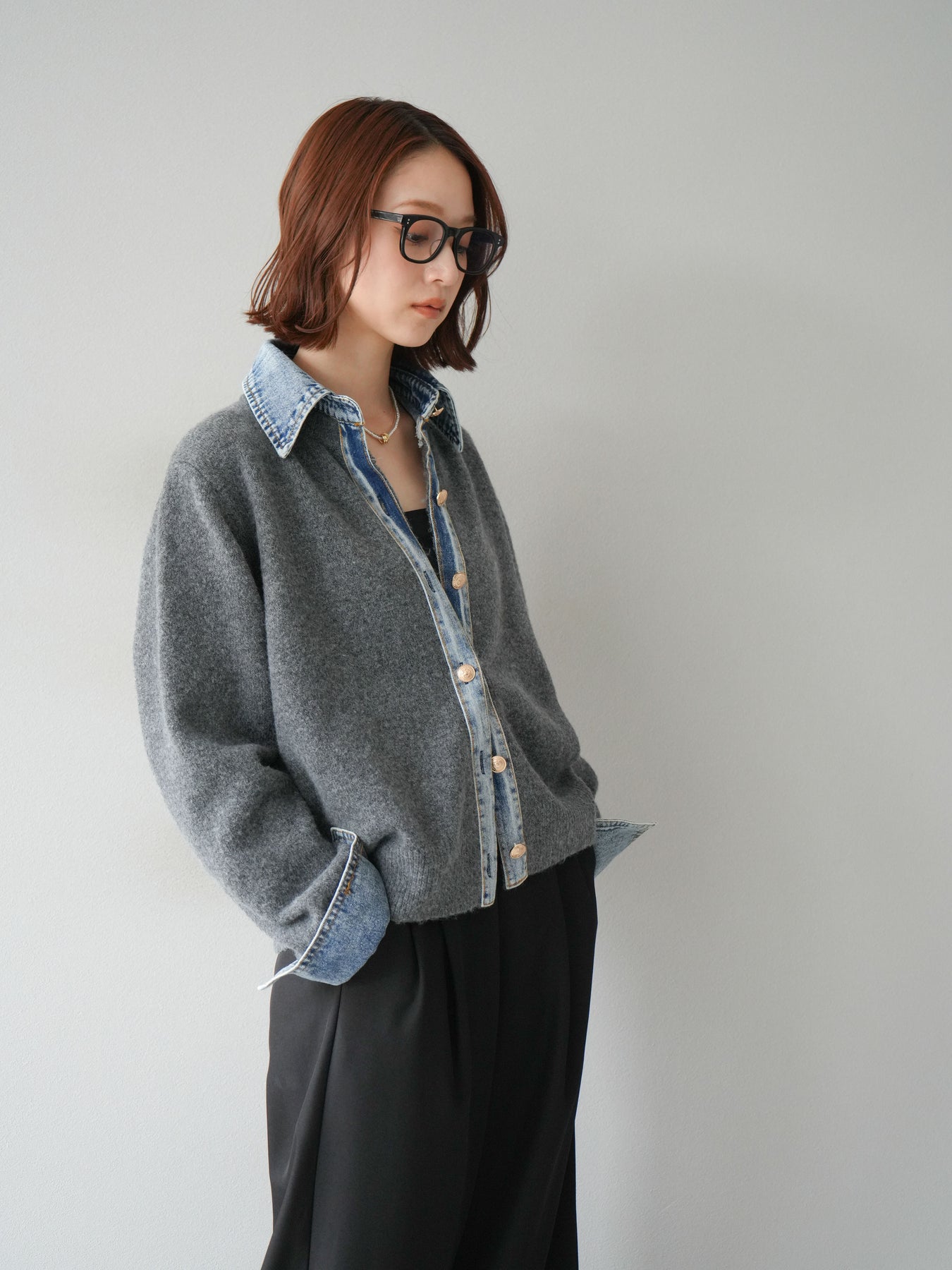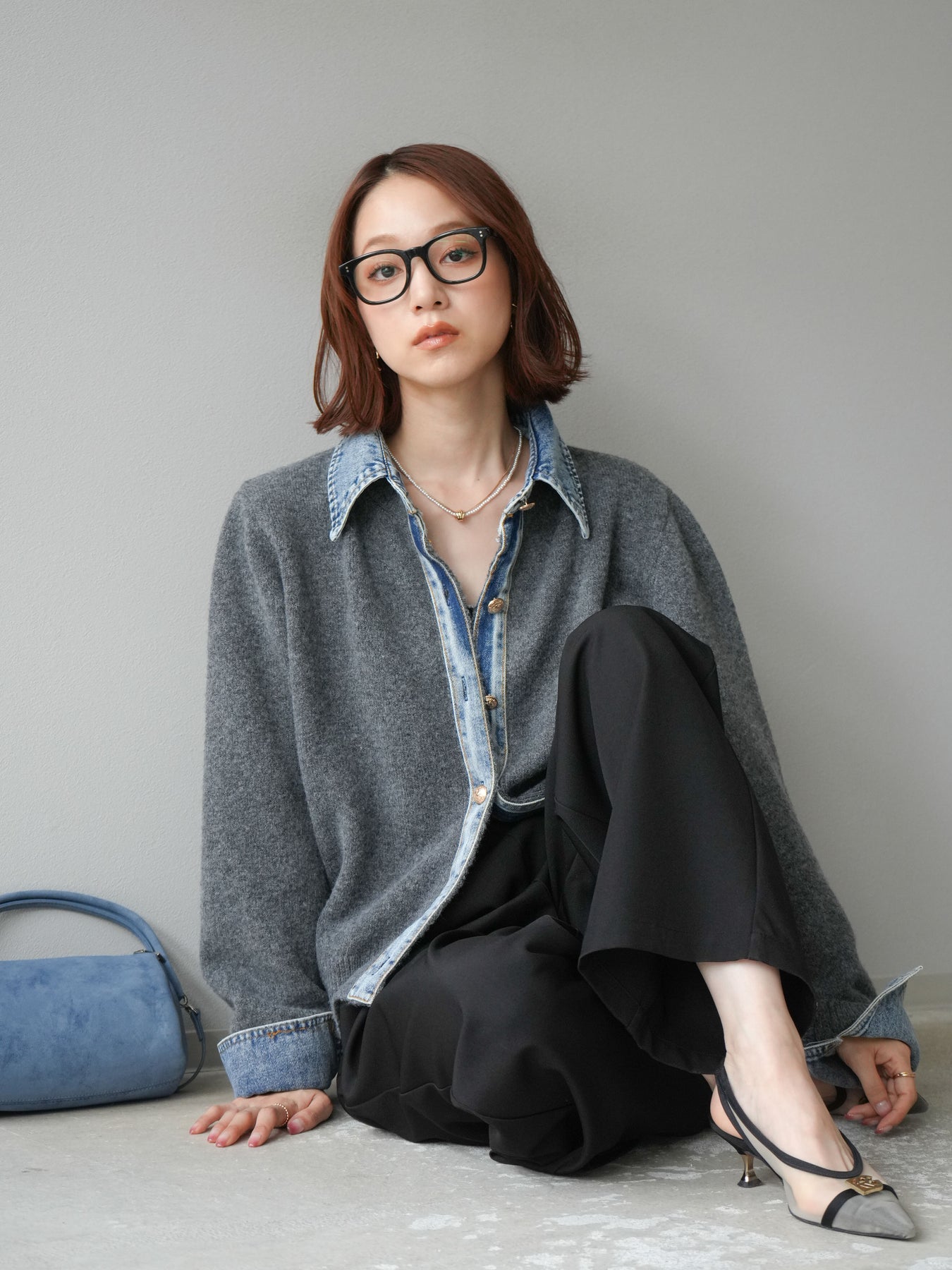 柔らかなニットにデニム素材を組み合わせた、遊び心のあるデザインカーディガン。襟・前立て・袖口に施されたデニムがアクセントとなり、シンプルなシルエットにメリハリをプラスしています。ほどよいゆとりのあるサイズ感で、羽織りとしても一枚着としても活躍。カジュアルながらも大人っぽさを感じさせる一枚で、デイリーコーデの主役になるアイテムです。 ※ボトムス、キャミソール(インナー)以外の商品は一律でインナーは付属していません。