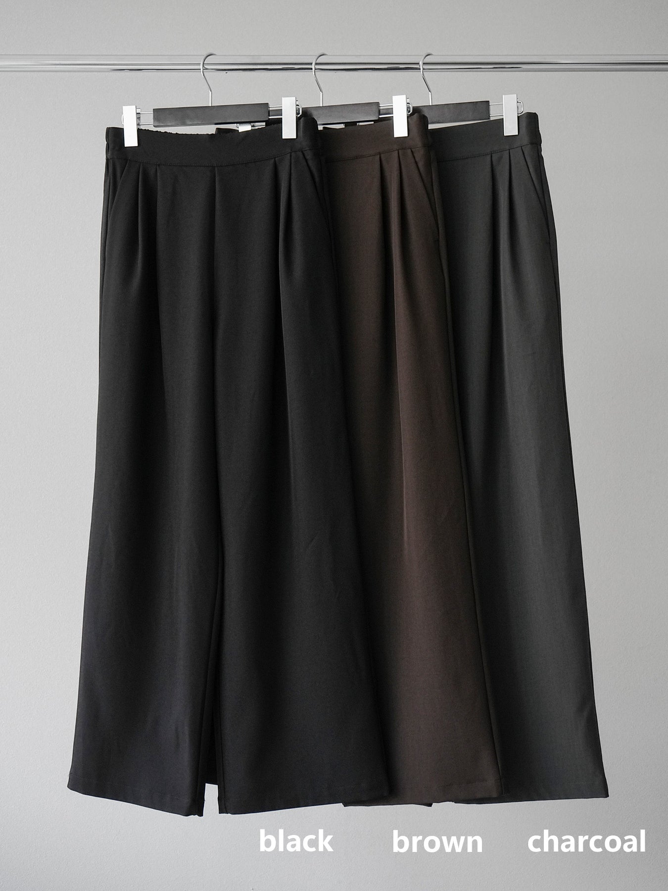 さらりとしたエステル素材で仕立てたワイドパンツ。ウエスト部分に施したタックが立体感を生み、ゆったりとしたシルエットながらも上品な印象に仕上げています。落ち感のある素材が脚のラインをすっきりと見せ、快適な穿き心地と美しいシルエットを両立。シンプルで合わせやすく、カジュアルからきれいめまで幅広いスタイリングに活躍する万能アイテムです。