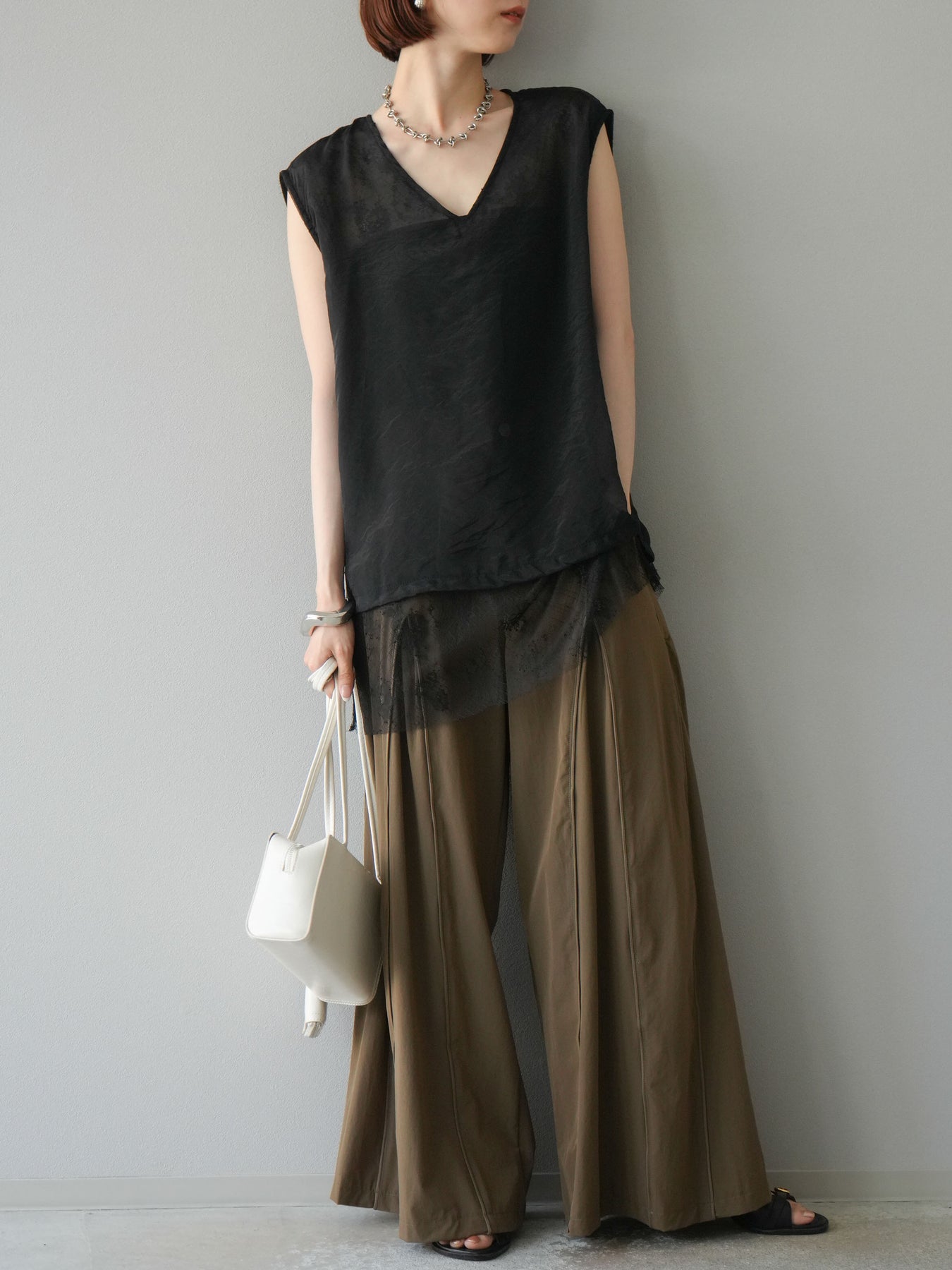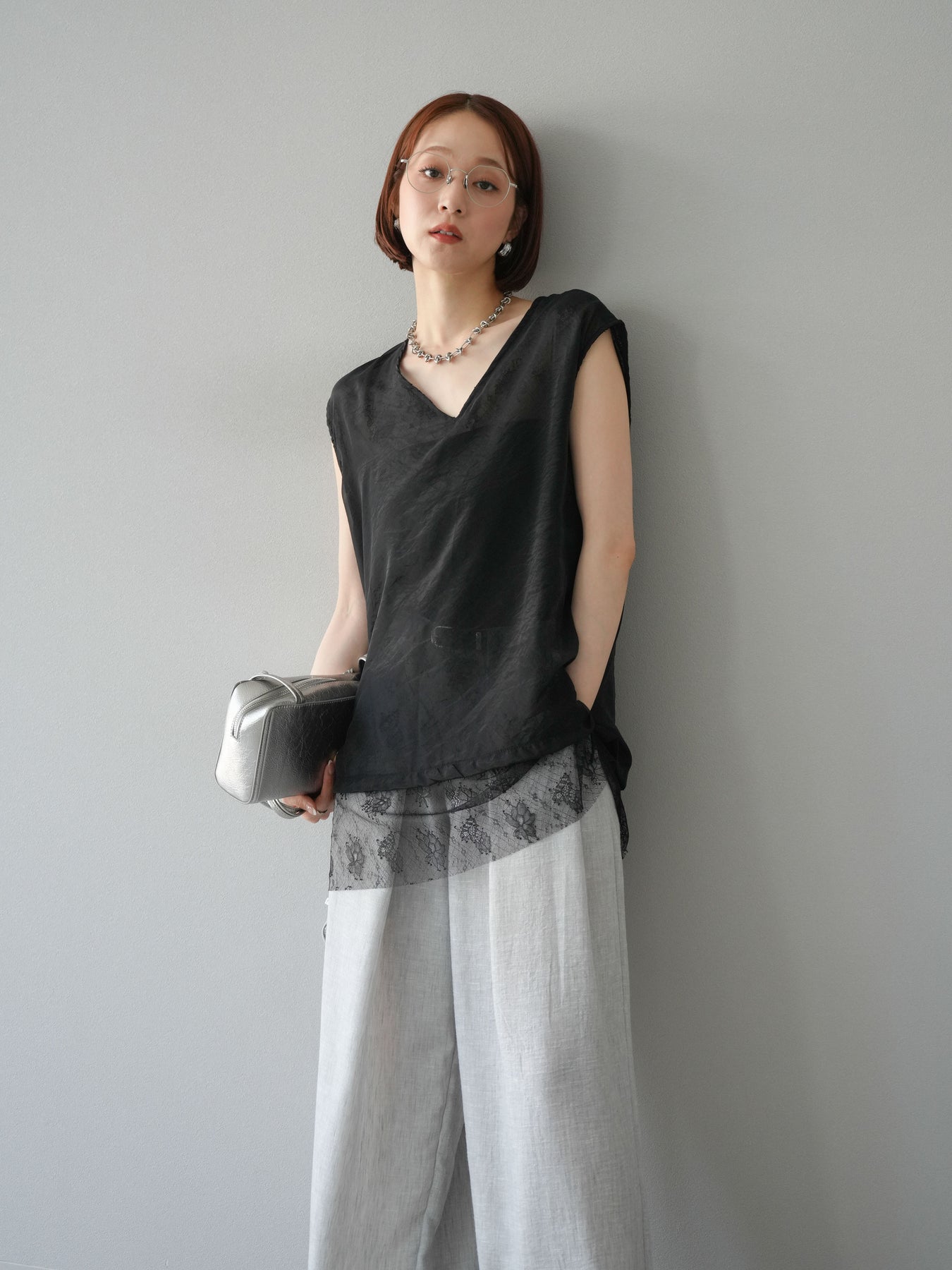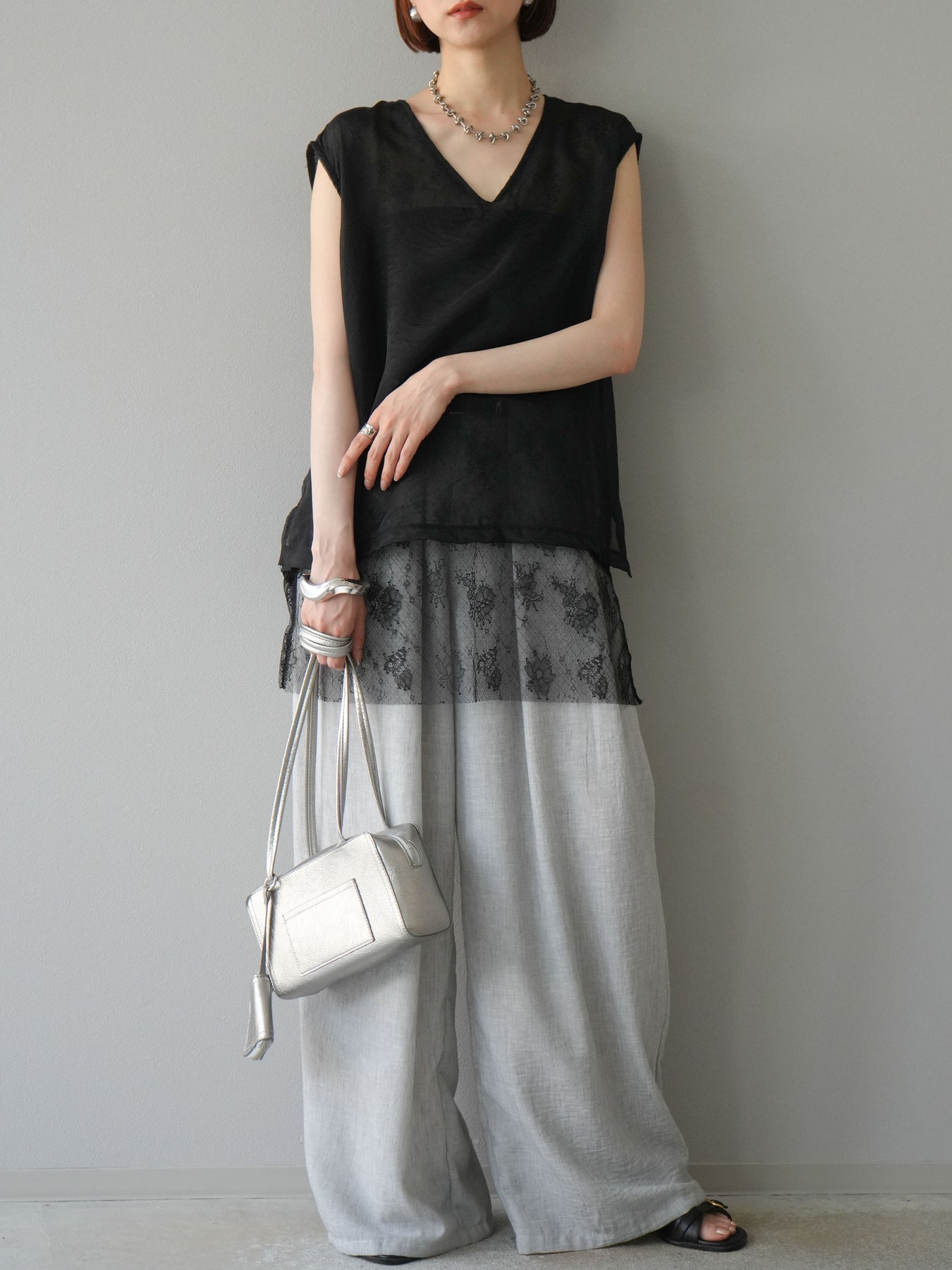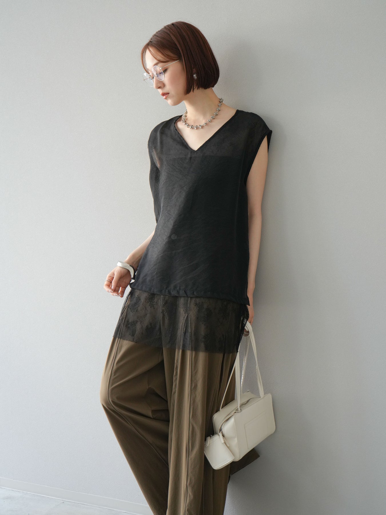 繊細なフラワーレースにオーガンジーを重ねた、透明感あふれるレイヤードトップス。ほどよく深めのVネックラインがデコルテをきれいに見せ、フェミニンで抜け感のあるスタイルに仕上がります。 裾からのぞくレースが軽やかなアクセントとなり、シンプルながらも奥行きのあるデザインに。パンツにもスカートにも合わせやすく、キャミソールやインナーとのレイヤードを楽しめる一枚です。 女性らしい雰囲気を纏いながらも、リラックス感のある着心地が魅力です。 ※ボトムス、キャミソール(インナー)以外の商品は一律でインナーは付属していません。
