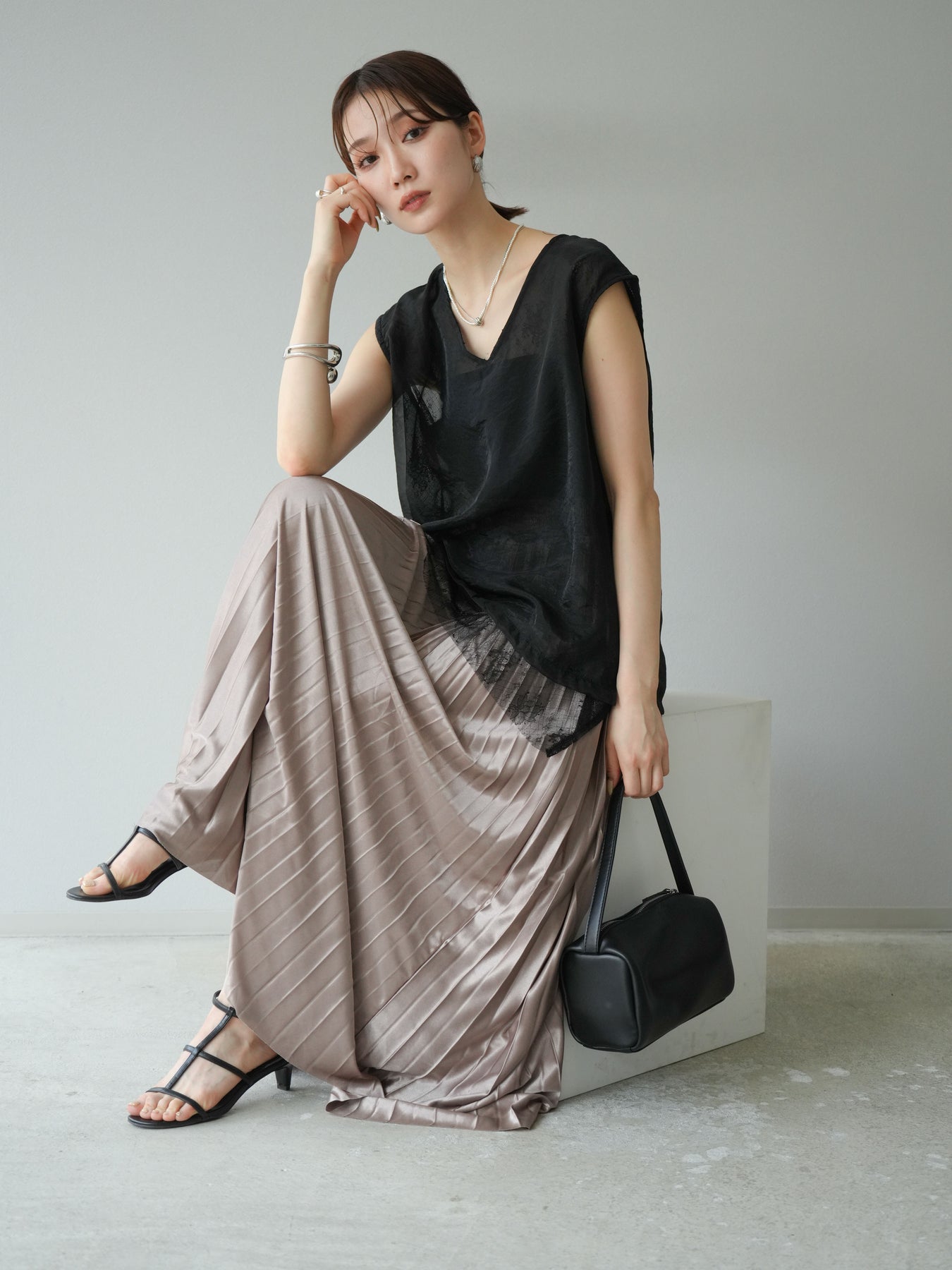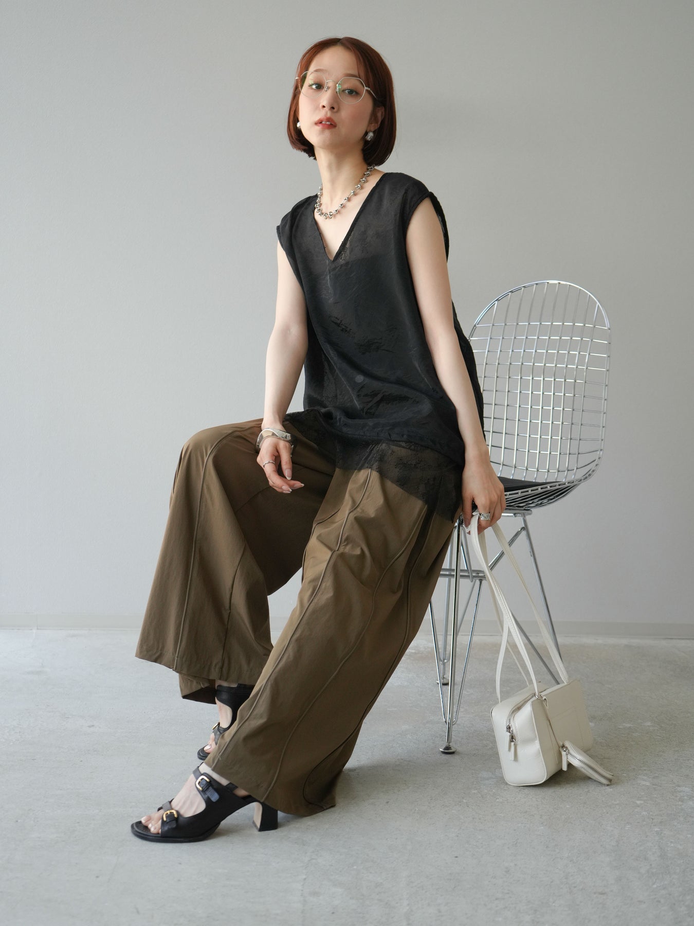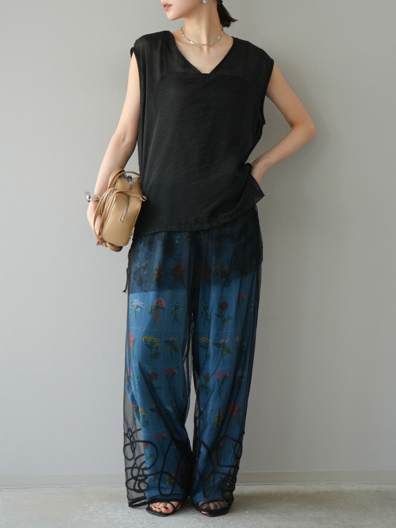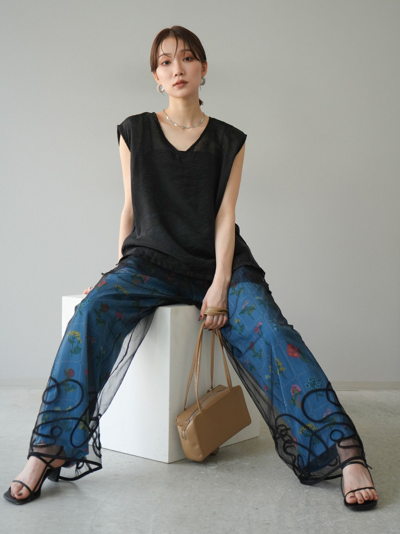 繊細なフラワーレースにオーガンジーを重ねた、透明感あふれるレイヤードトップス。ほどよく深めのVネックラインがデコルテをきれいに見せ、フェミニンで抜け感のあるスタイルに仕上がります。 裾からのぞくレースが軽やかなアクセントとなり、シンプルながらも奥行きのあるデザインに。パンツにもスカートにも合わせやすく、キャミソールやインナーとのレイヤードを楽しめる一枚です。 女性らしい雰囲気を纏いながらも、リラックス感のある着心地が魅力です。 ※ボトムス、キャミソール(インナー)以外の商品は一律でインナーは付属していません。
