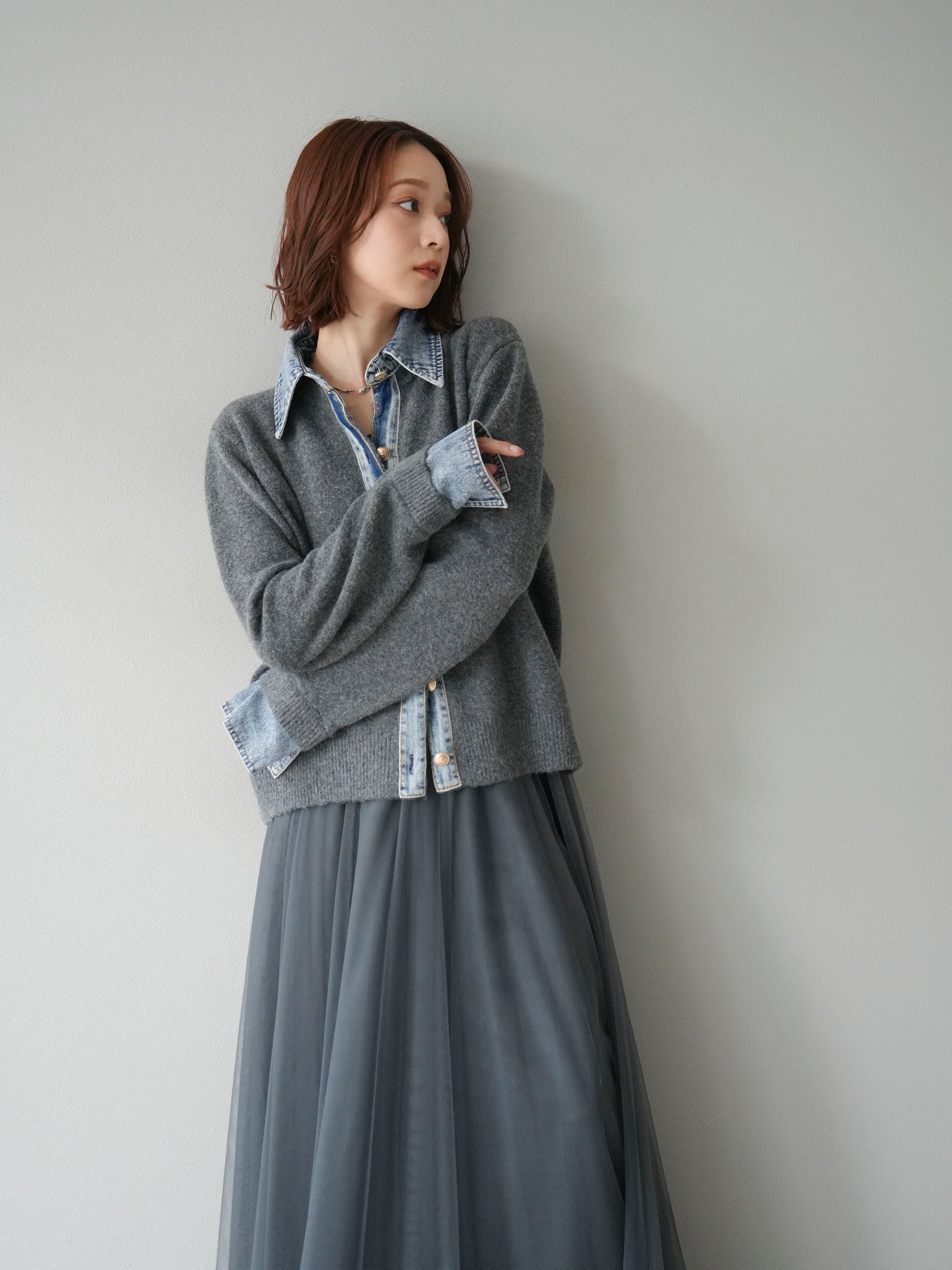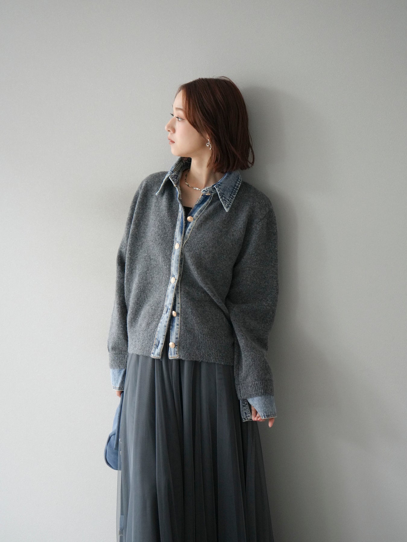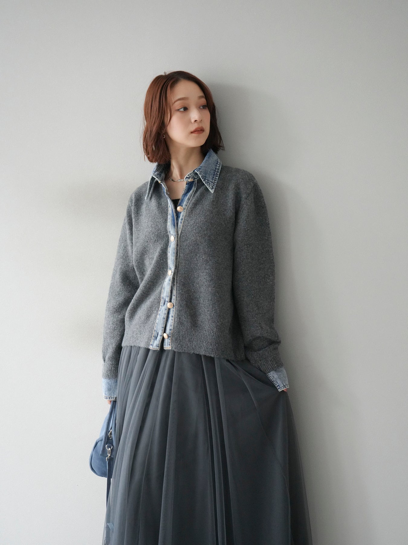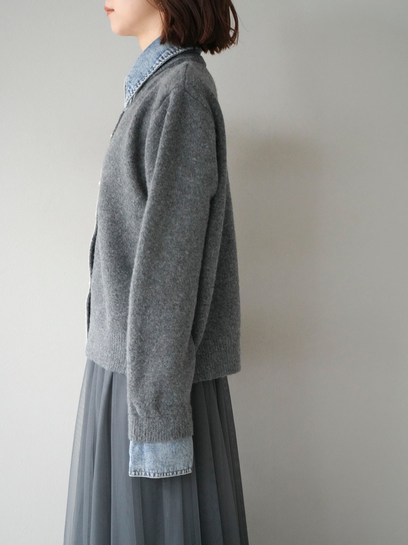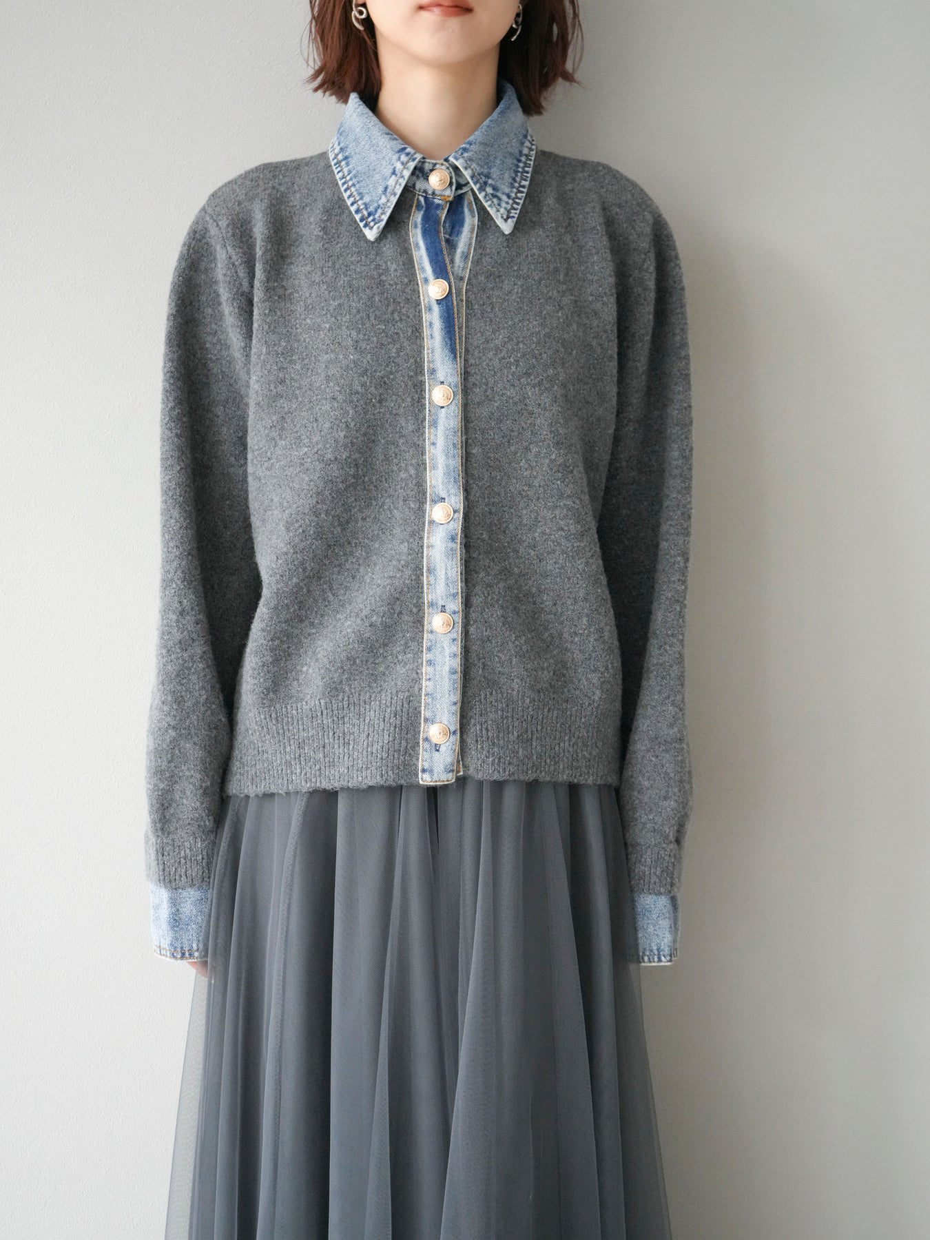 [予約]デニム襟ボタンニットカーディガン/チャコール