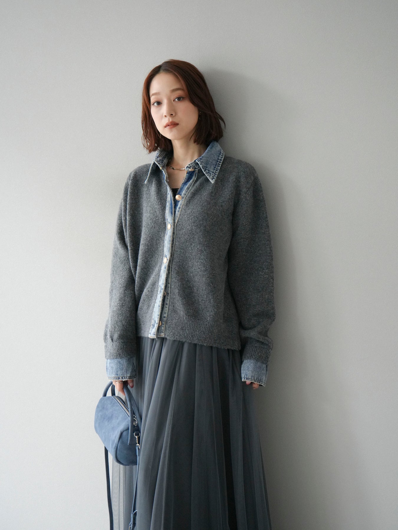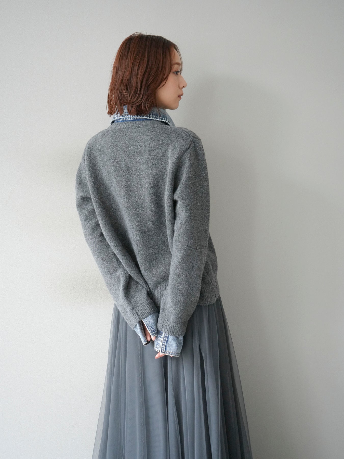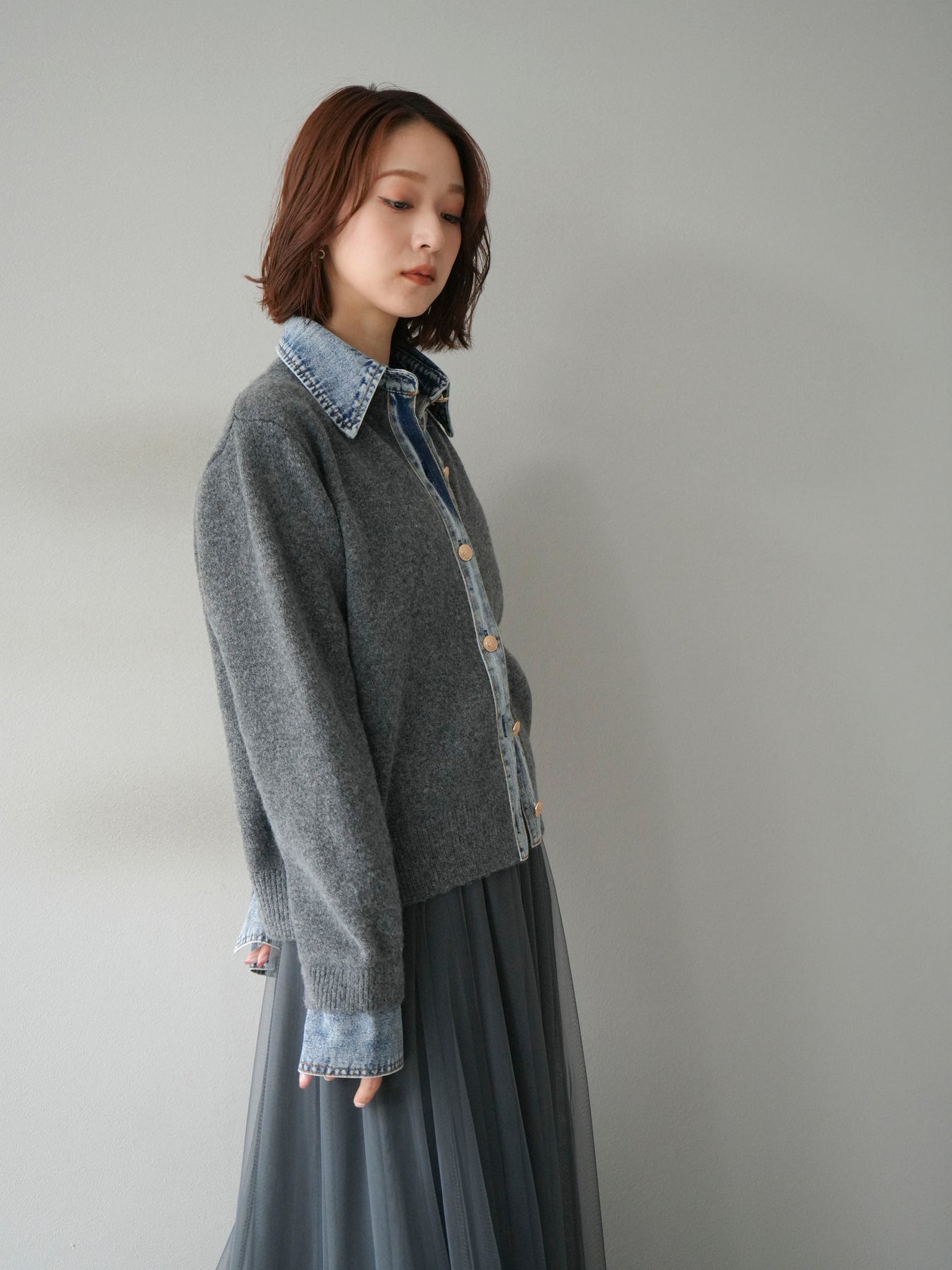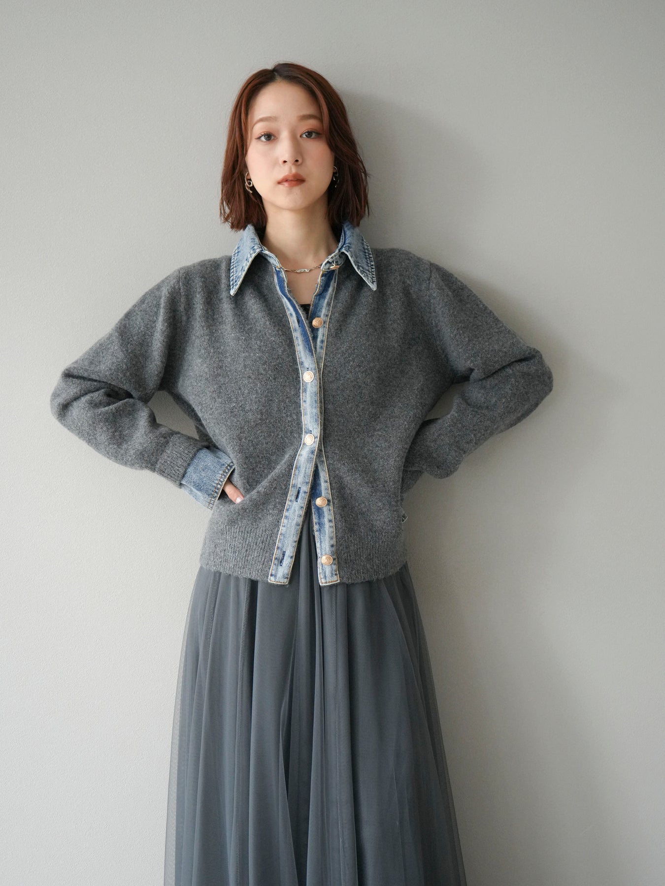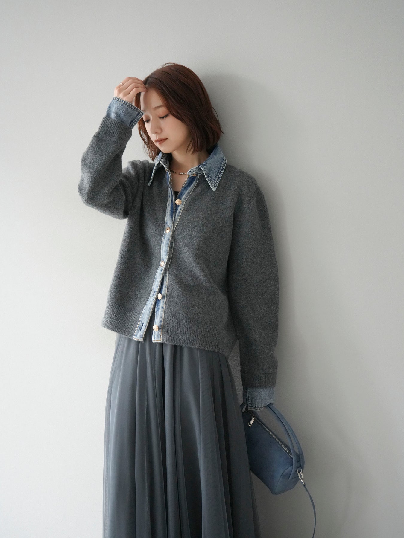 [予約]デニム襟ボタンニットカーディガン/チャコール