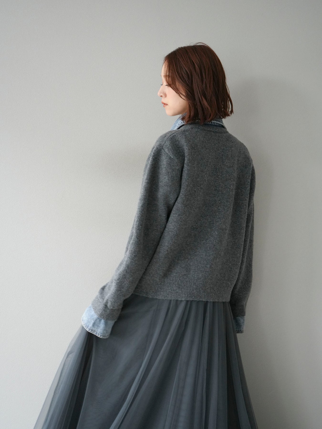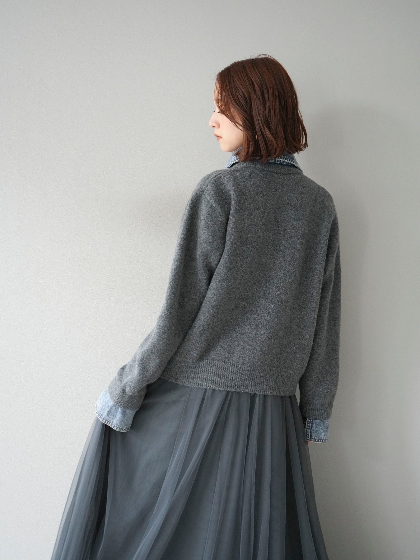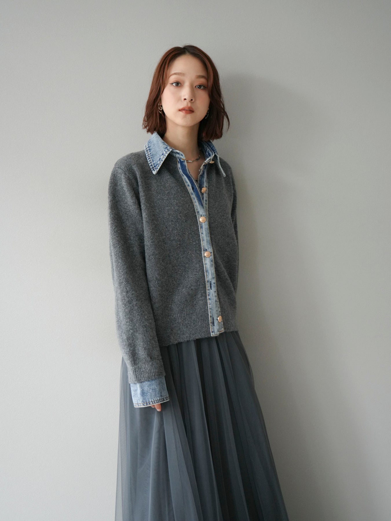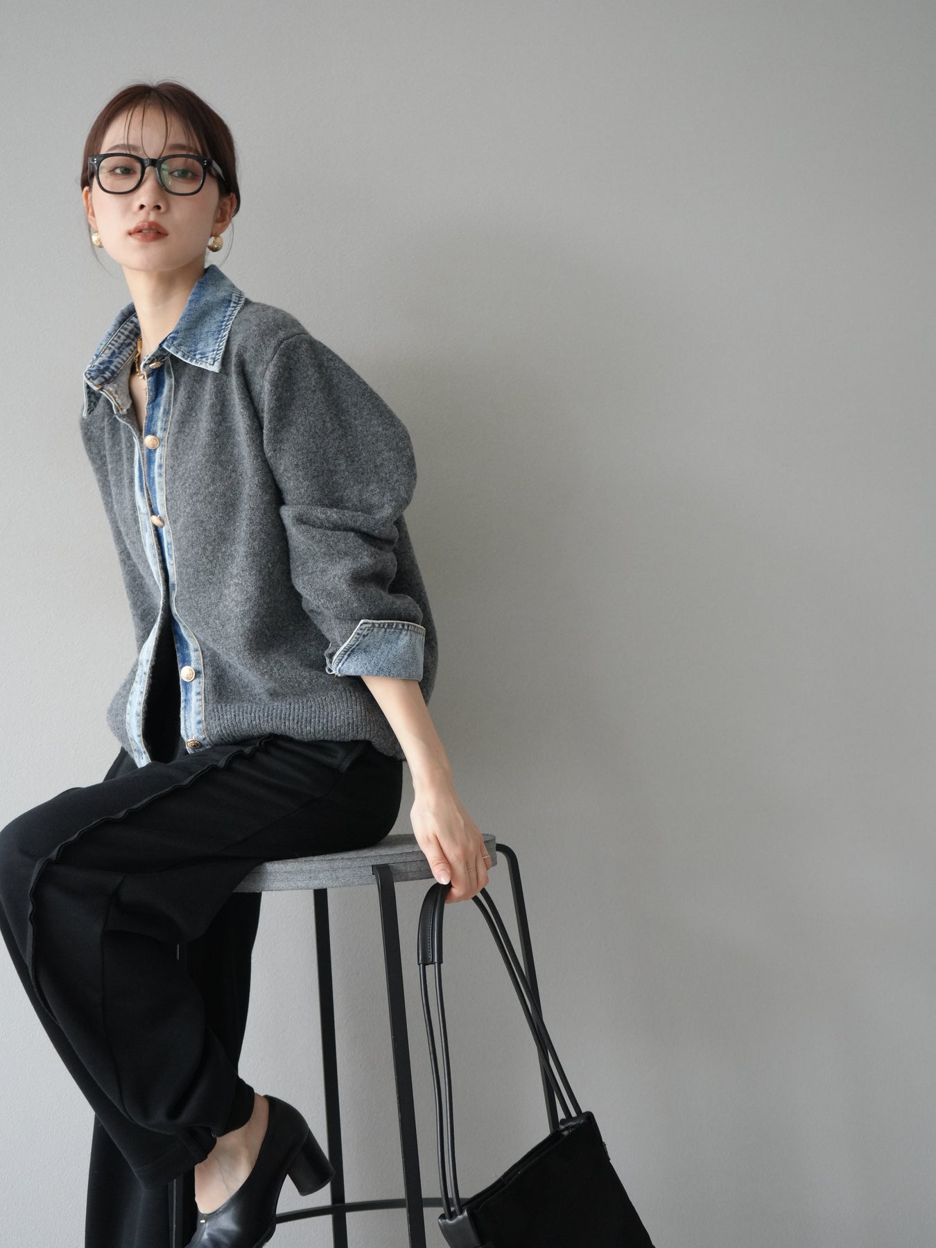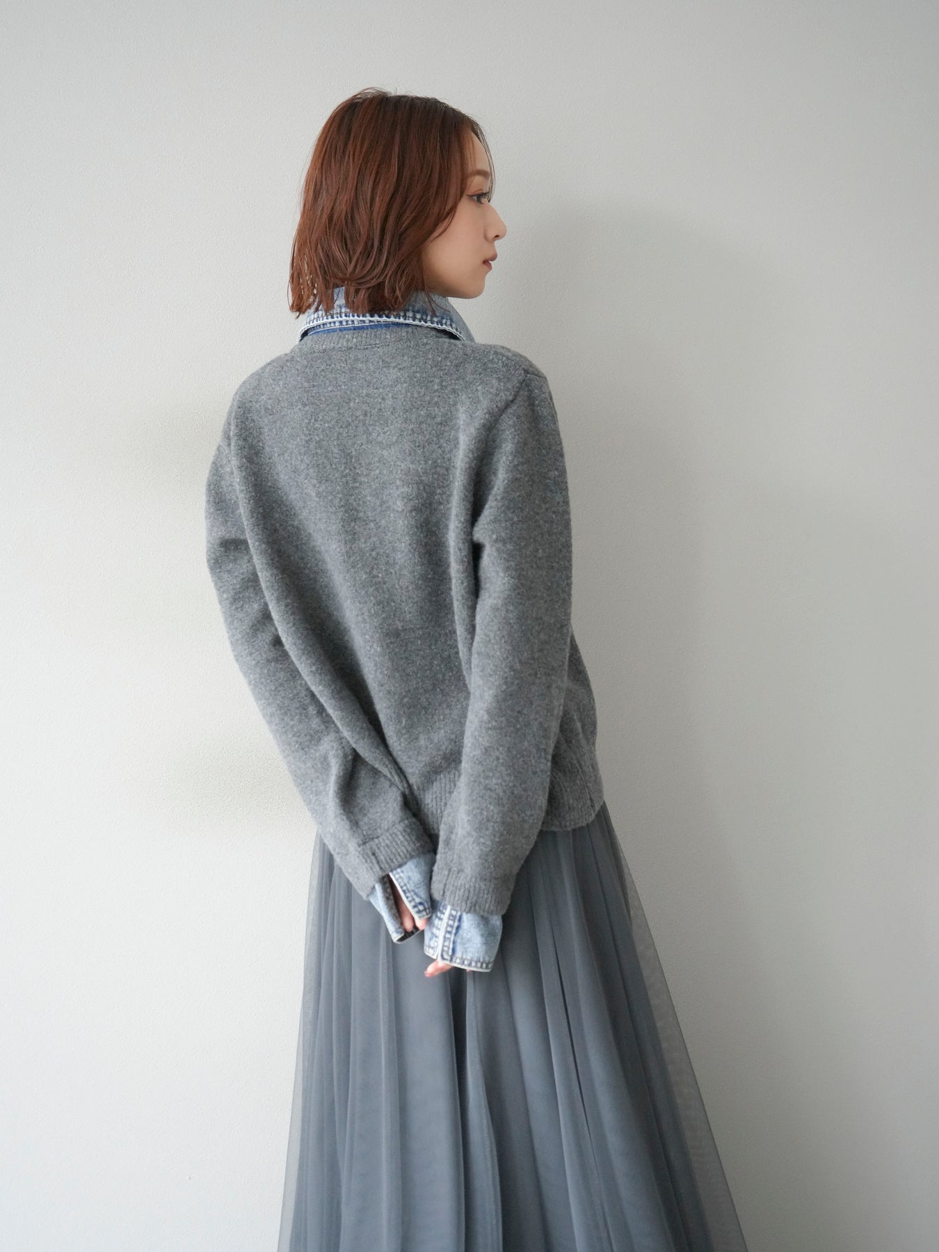 [予約]デニム襟ボタンニットカーディガン/チャコール