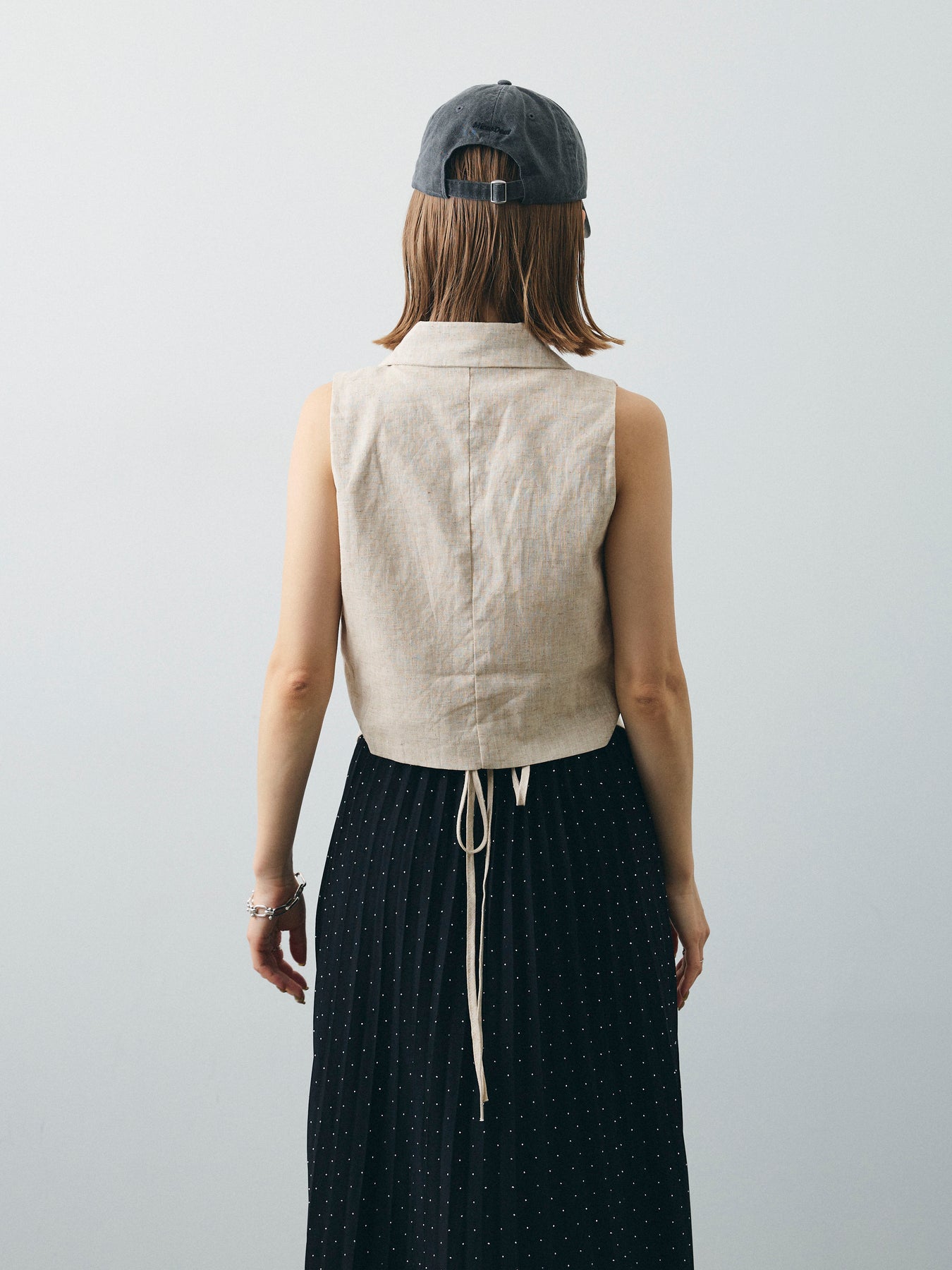 ナチュラルな風合いが魅力のリネンライク素材で仕立てた、テーラードデザインのジレ。 クラシカルなラペルとフロントボタンに、ウエストのドロストコードがアクセントを添えた、女性らしさとマニッシュさを兼ね備えた1枚です。 シャープなシルエットながら、背中のリボンでシルエット調整が可能。 コンパクトすぎない程よいサイズ感で、インナー次第でロングシーズン活躍します。 Tシャツやノースリーブとのレイヤードはもちろん、ワンピースに重ねたり、同素材パンツとセットアップ風に着こなすのもおすすめ。 シンプルながらも存在感のあるスタイリングが完成する、着回し力の高いアイテムです。