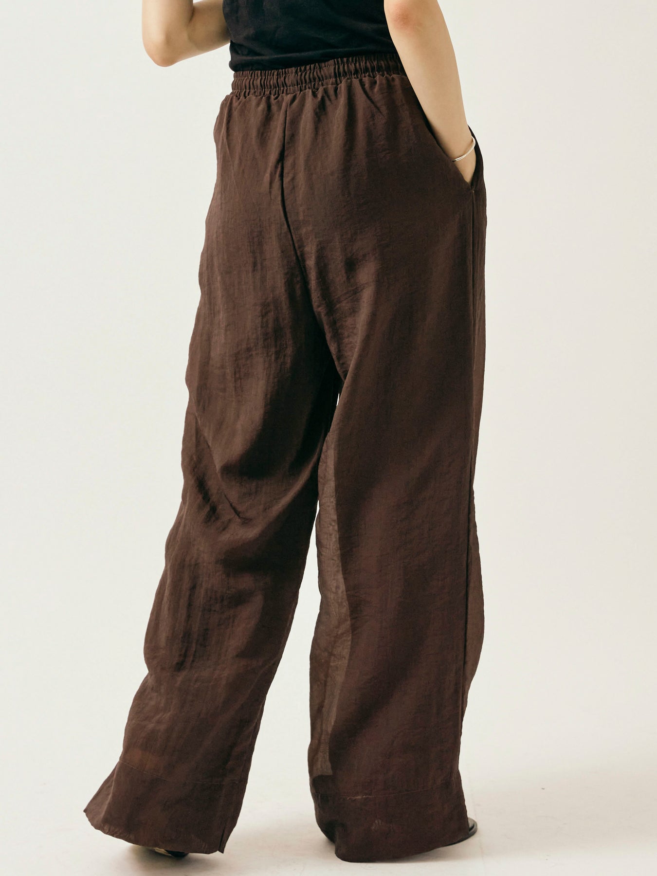 ほどよい光沢感とシボ感が魅力のシャイニースラブ素材を使用したワイドパンツ。 動くたびに揺れる軽やかな生地感と、シアーな透け感が抜け感をプラスします。 ウエストはゴム+ドローストリング仕様でストレスフリーな穿き心地。 Tシャツやブラウスはもちろん、ワンピースとのレイヤードにも活躍する1本です。