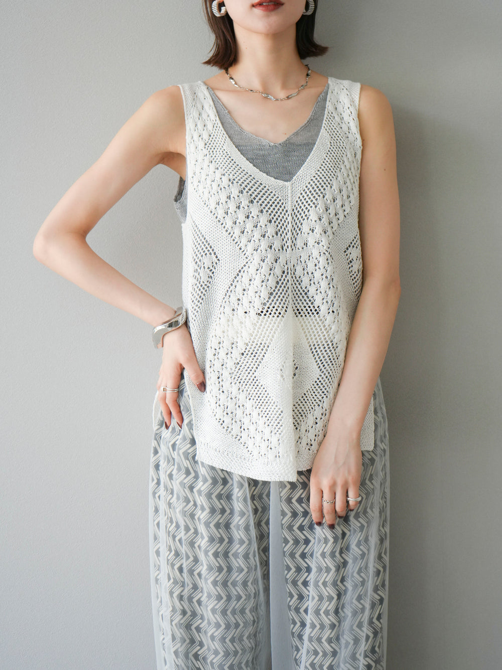 [予約]透かし編みレイヤードニットトップス/ホワイト