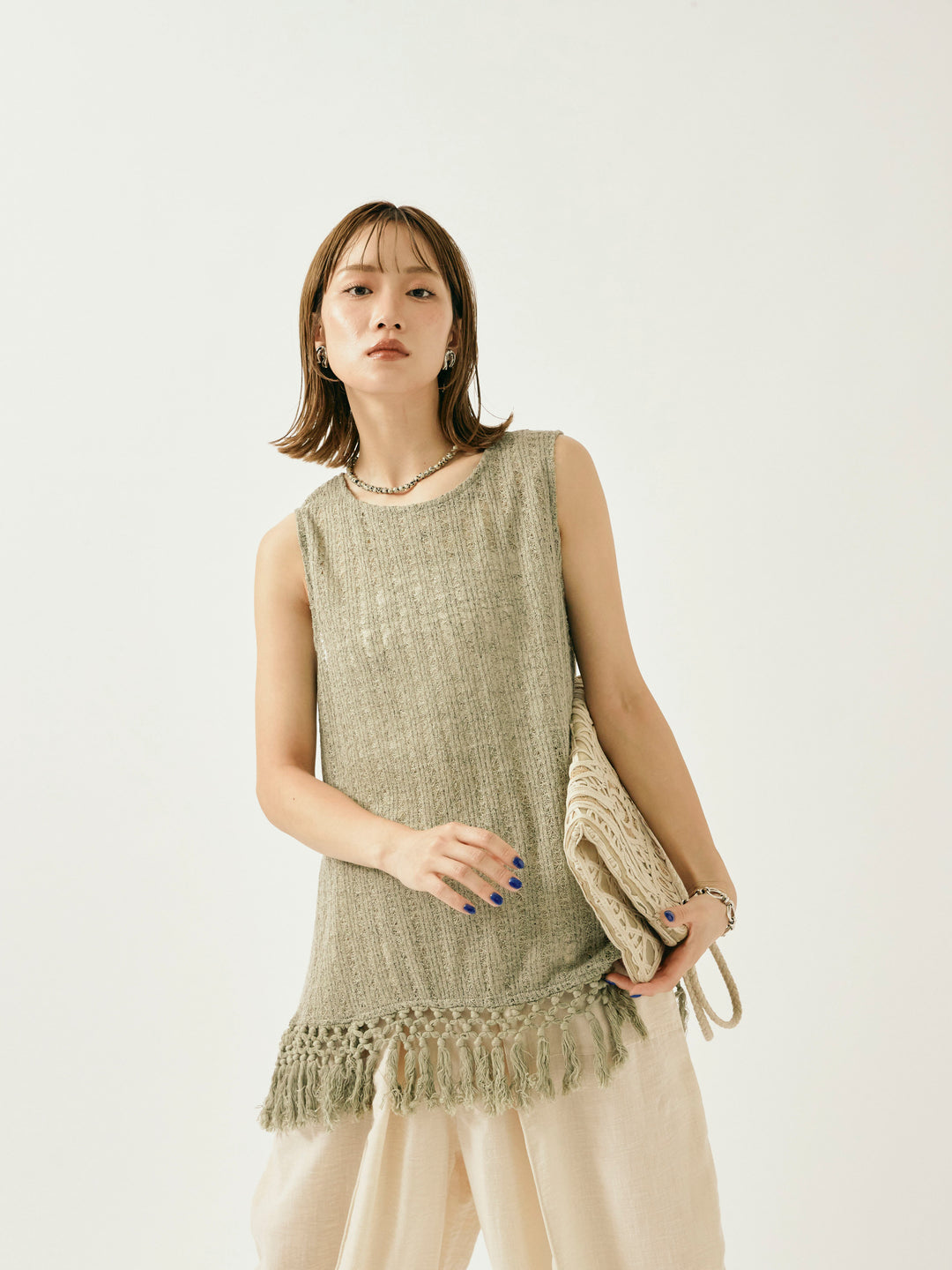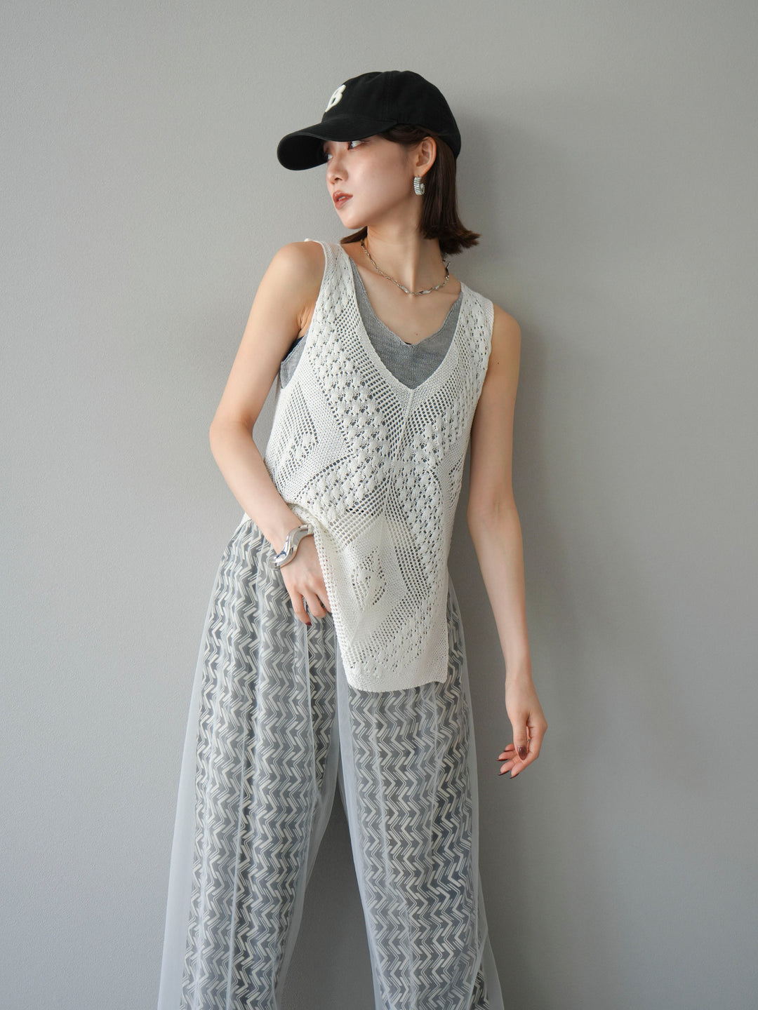 [予約]フリンジ透かし編みニットベスト/ホワイト