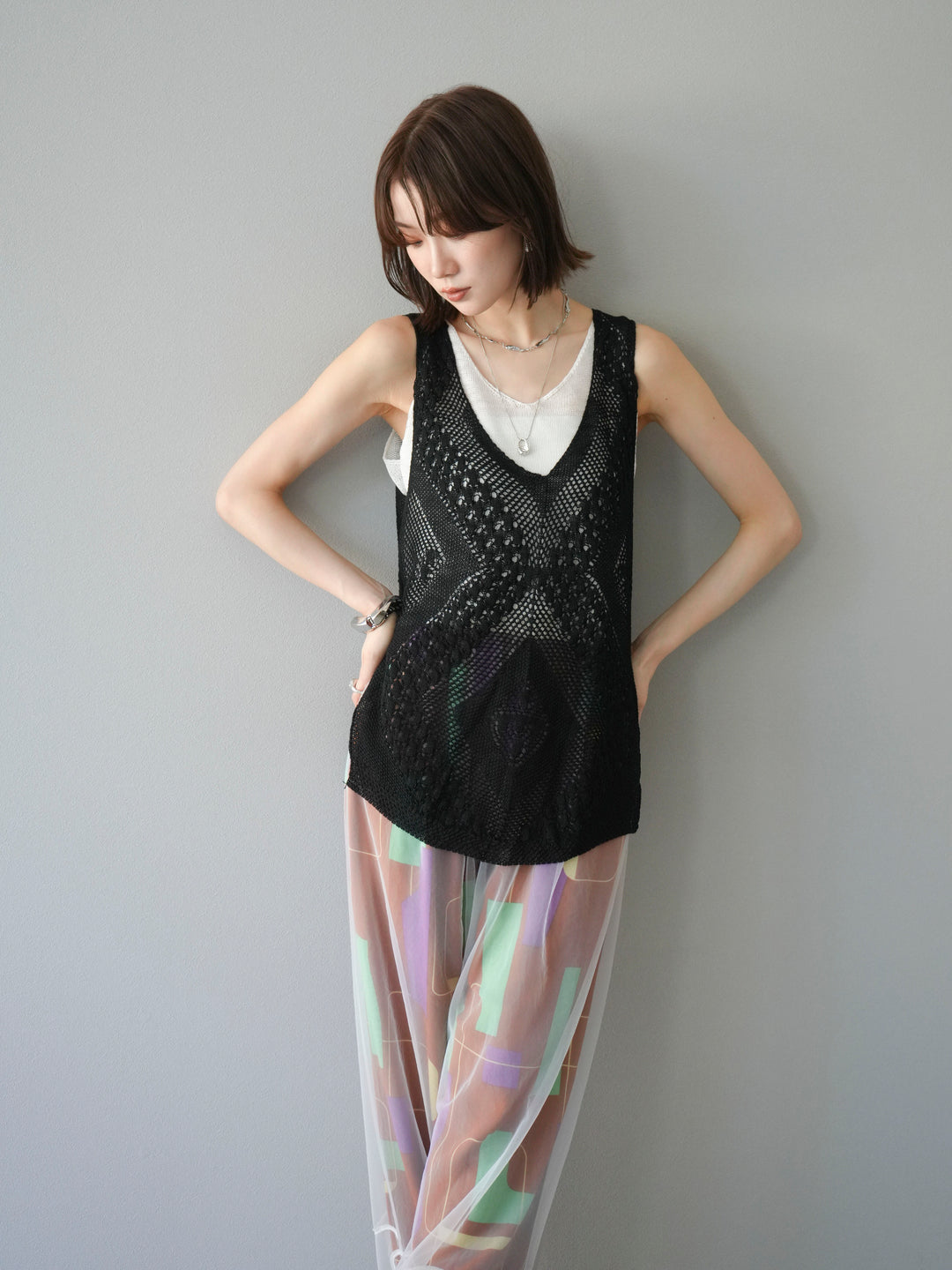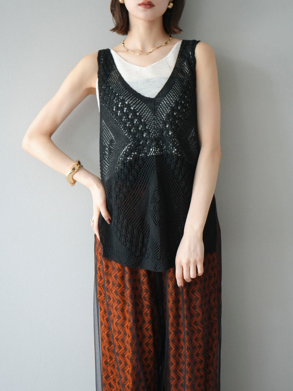 [予約]透かし編みレイヤードニットトップス/ブラック