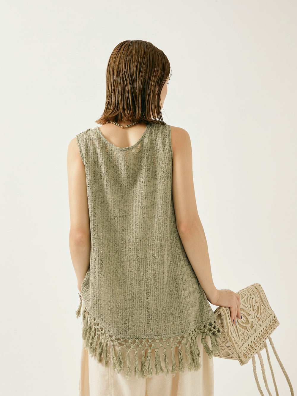 [予約]フリンジ透かし編みニットベスト/カーキ