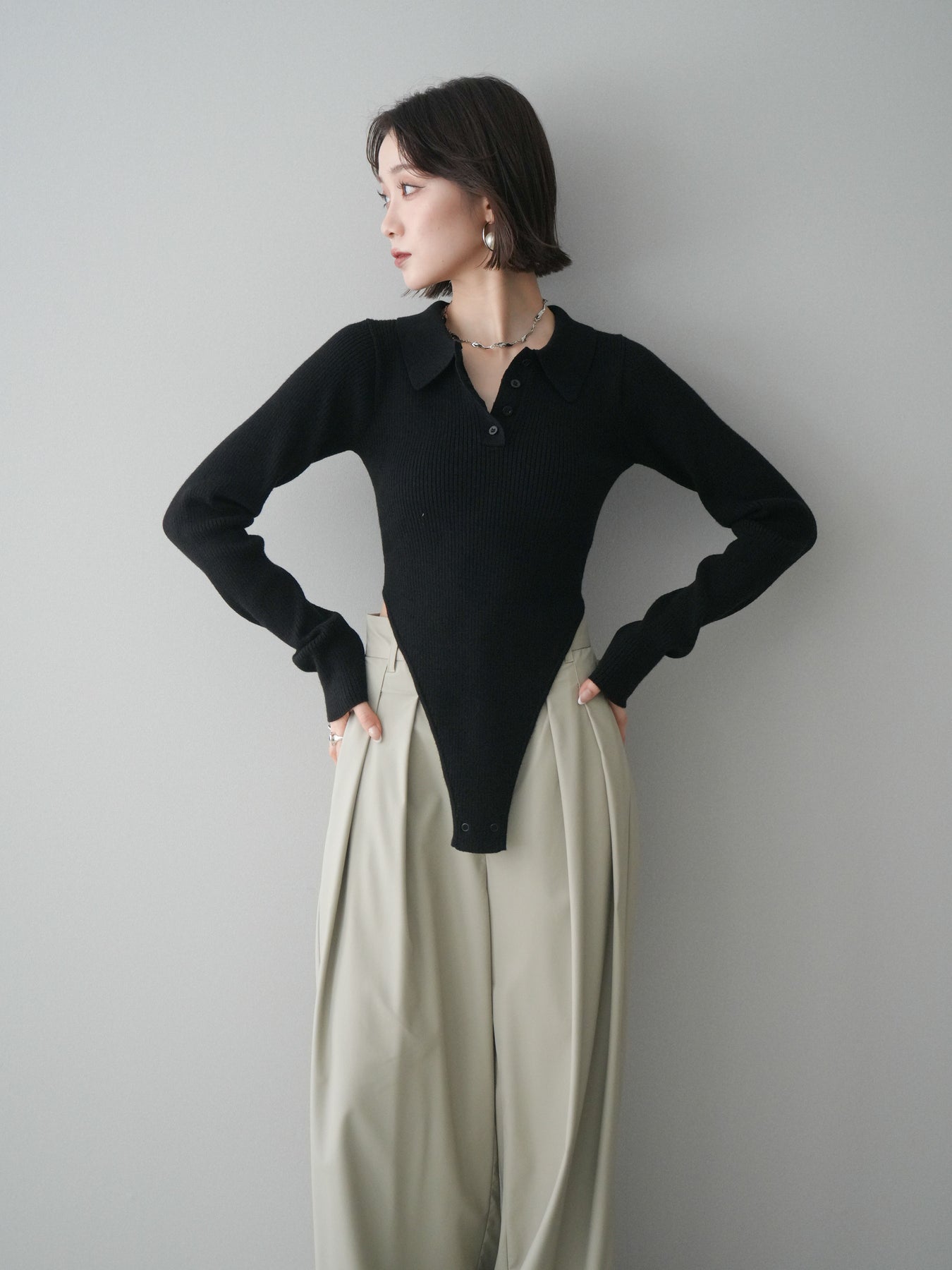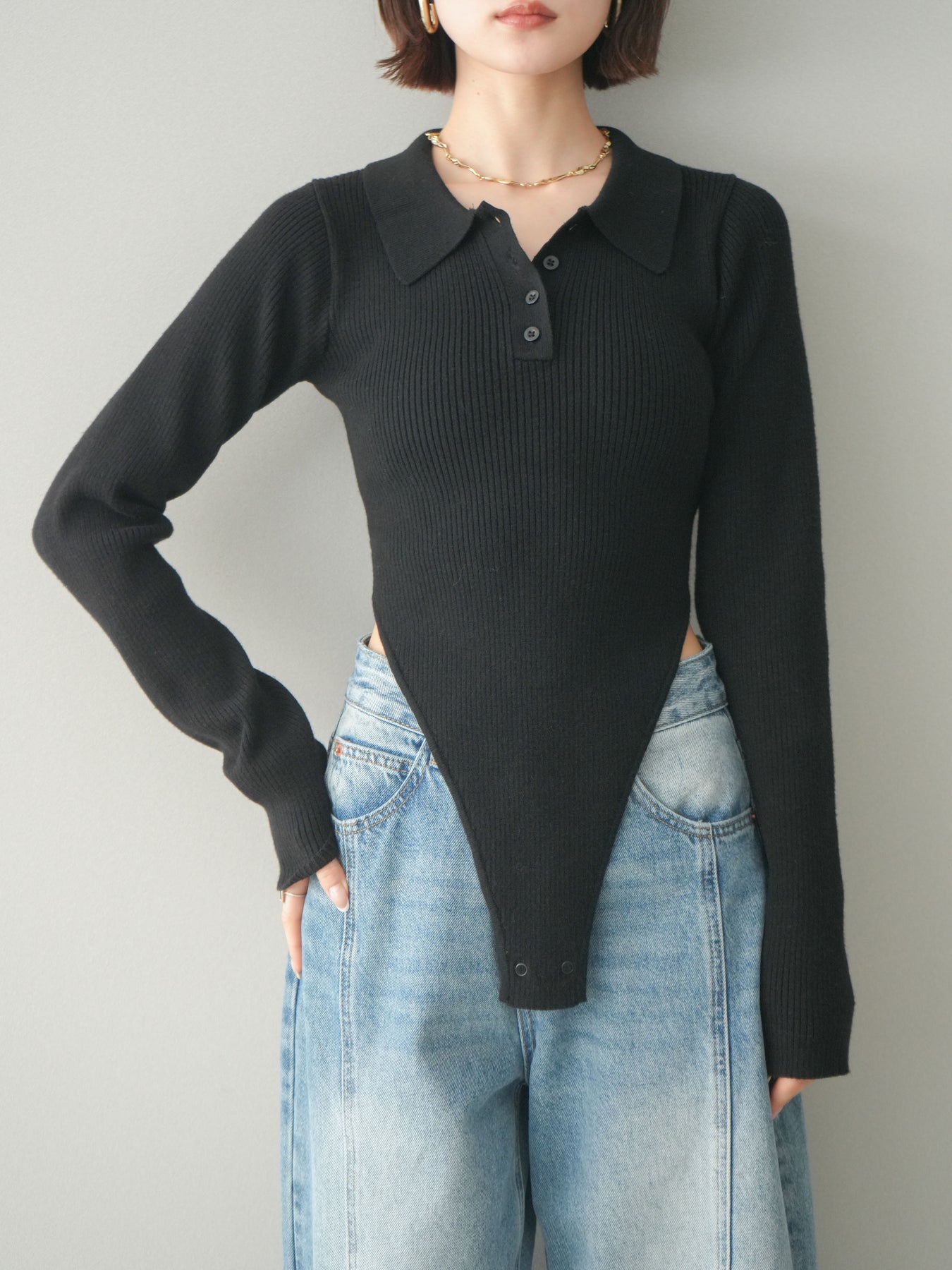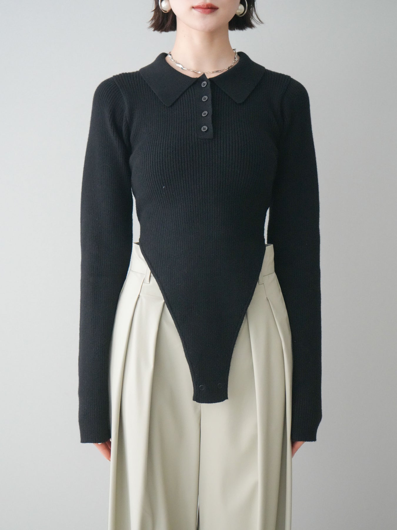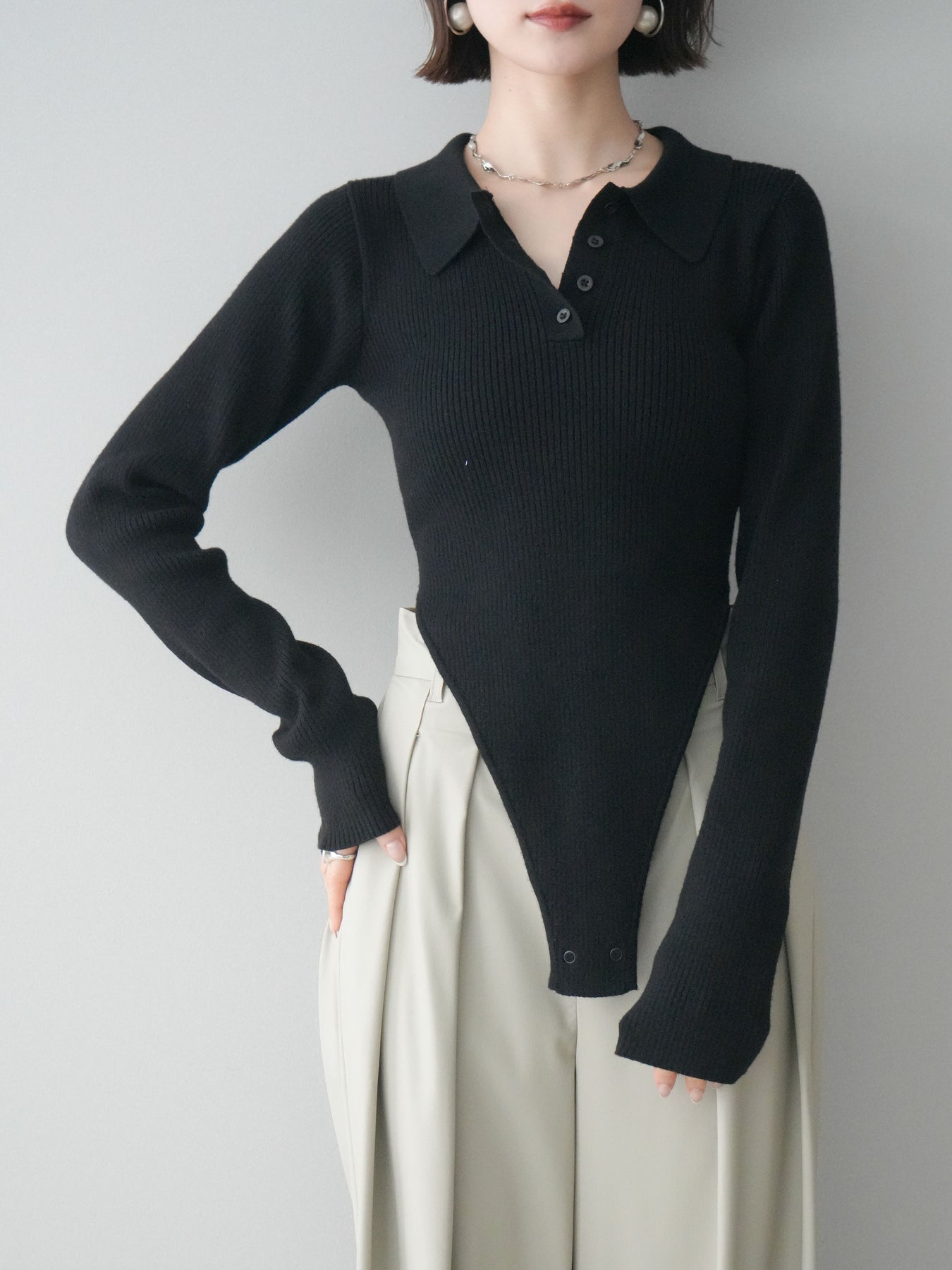 [予約]リブポロニットボディスーツ/black