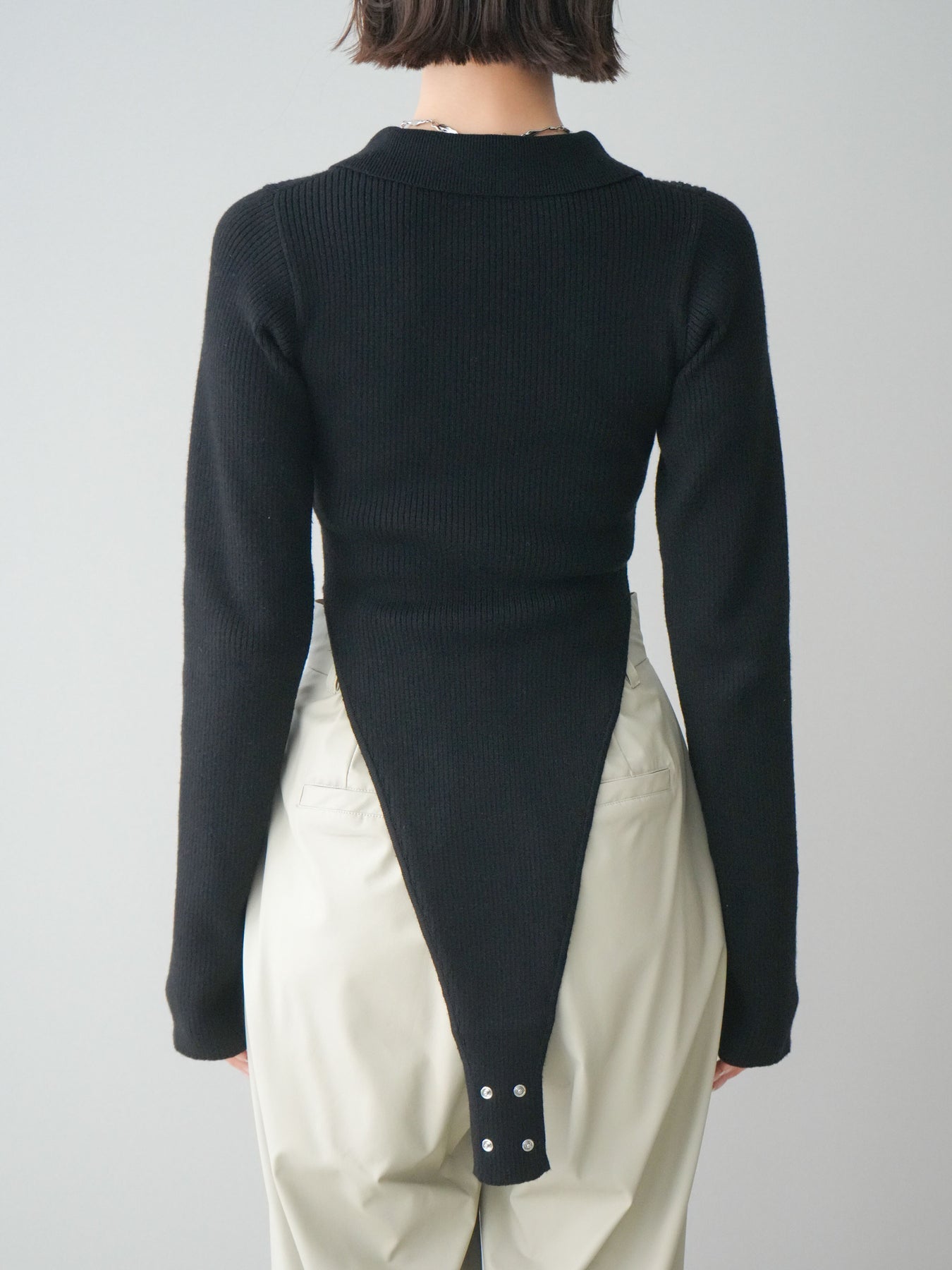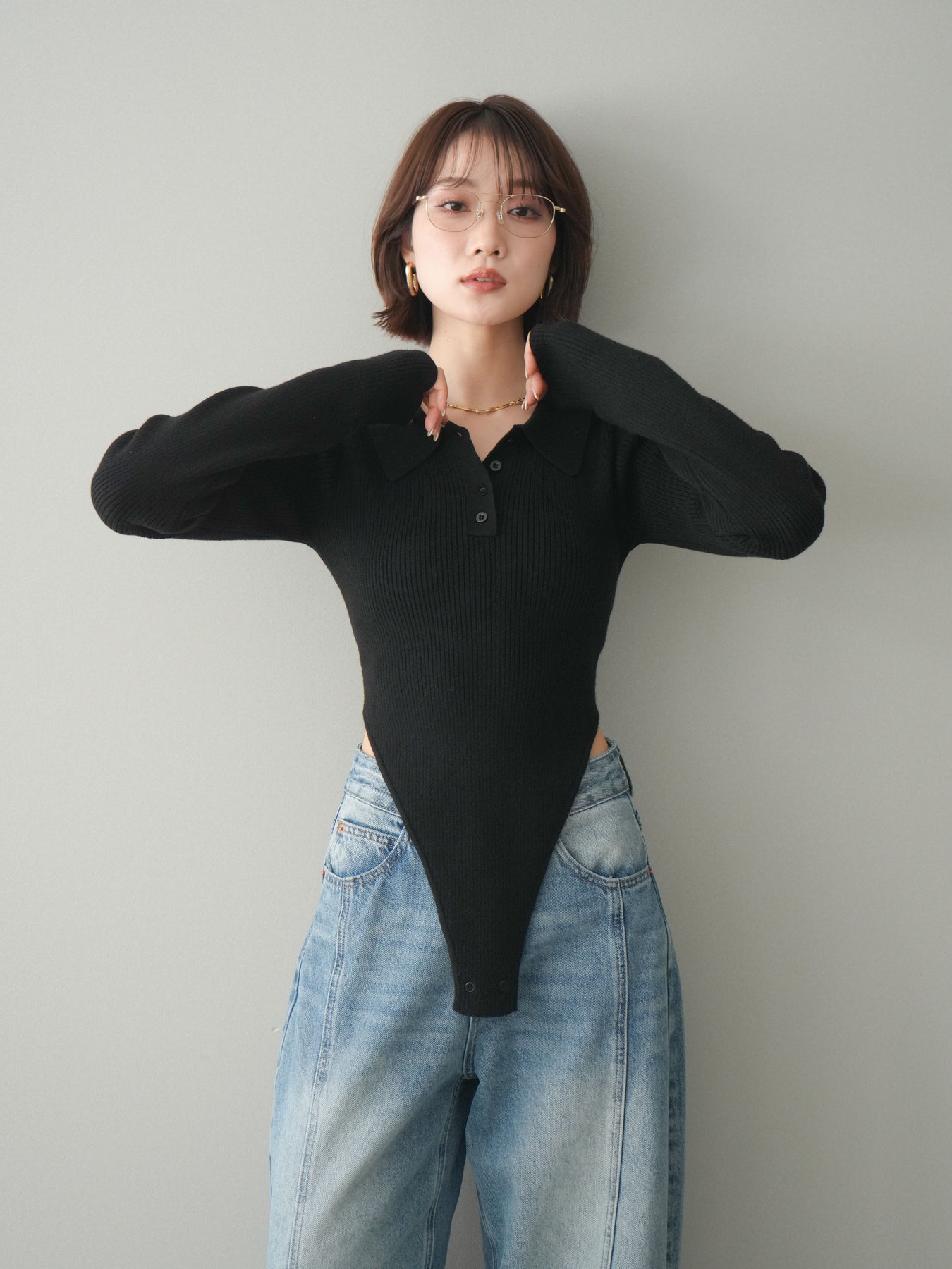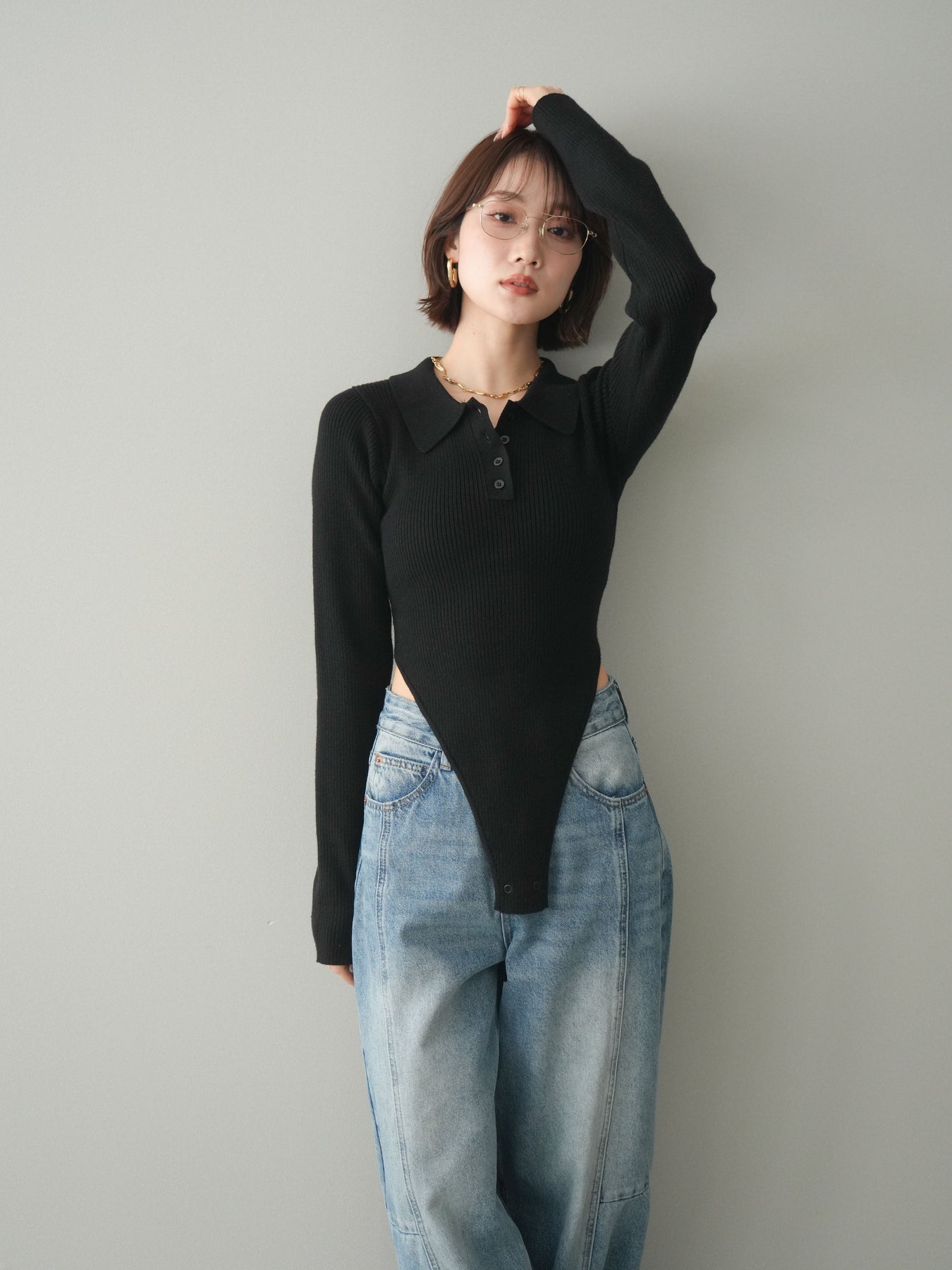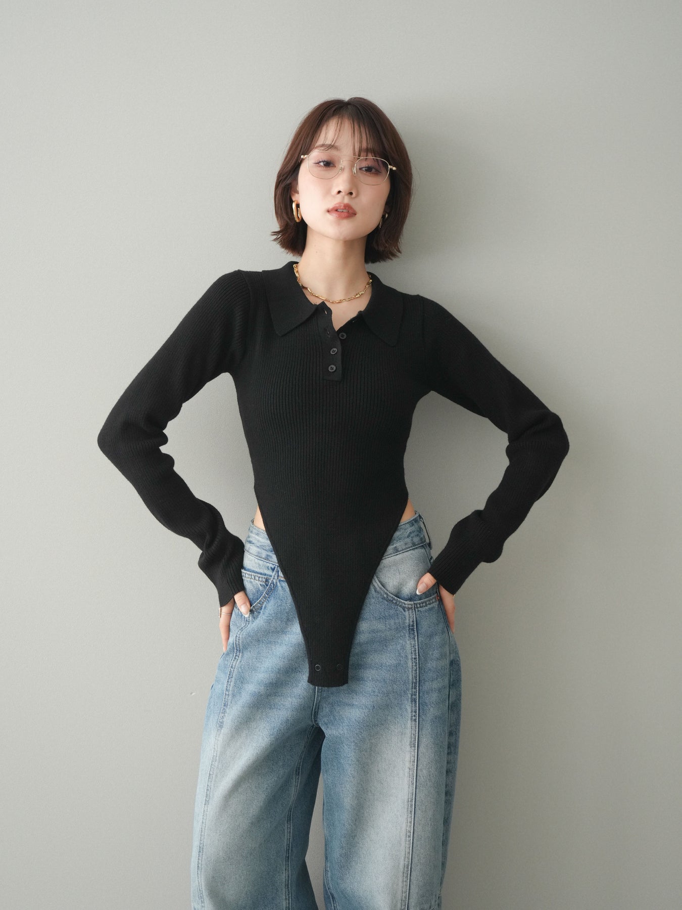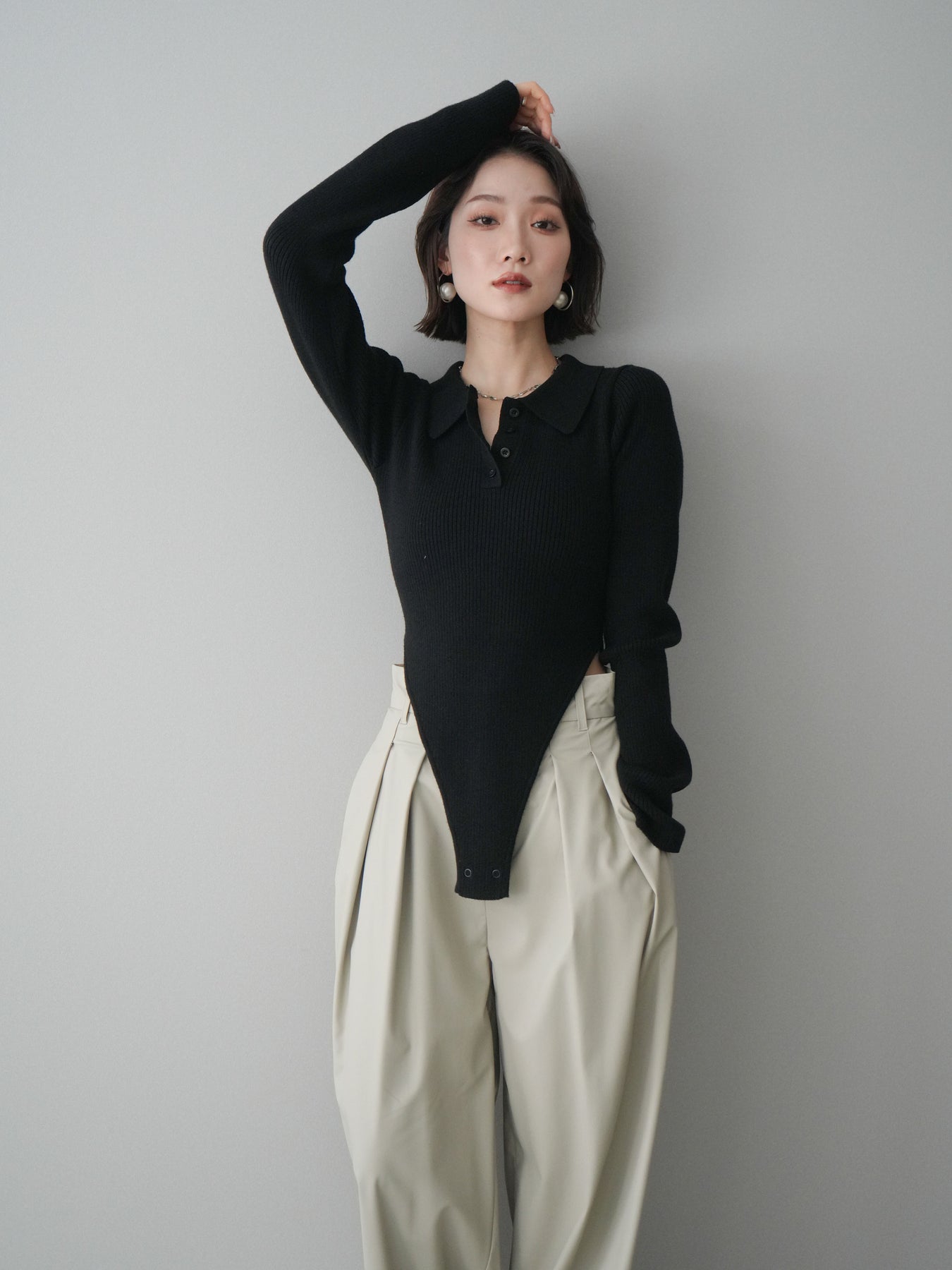 [予約]リブポロニットボディスーツ/black