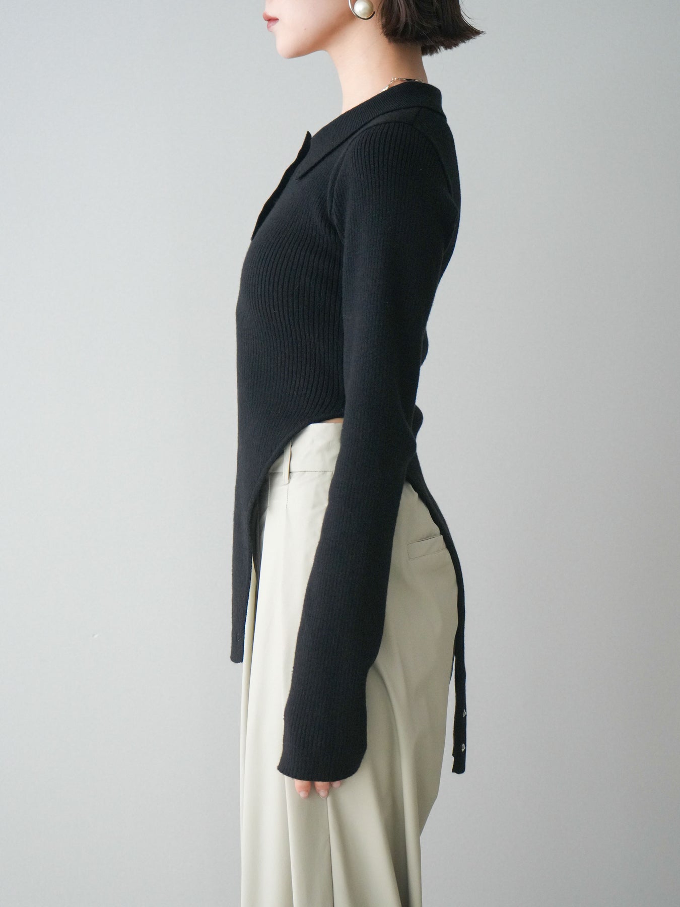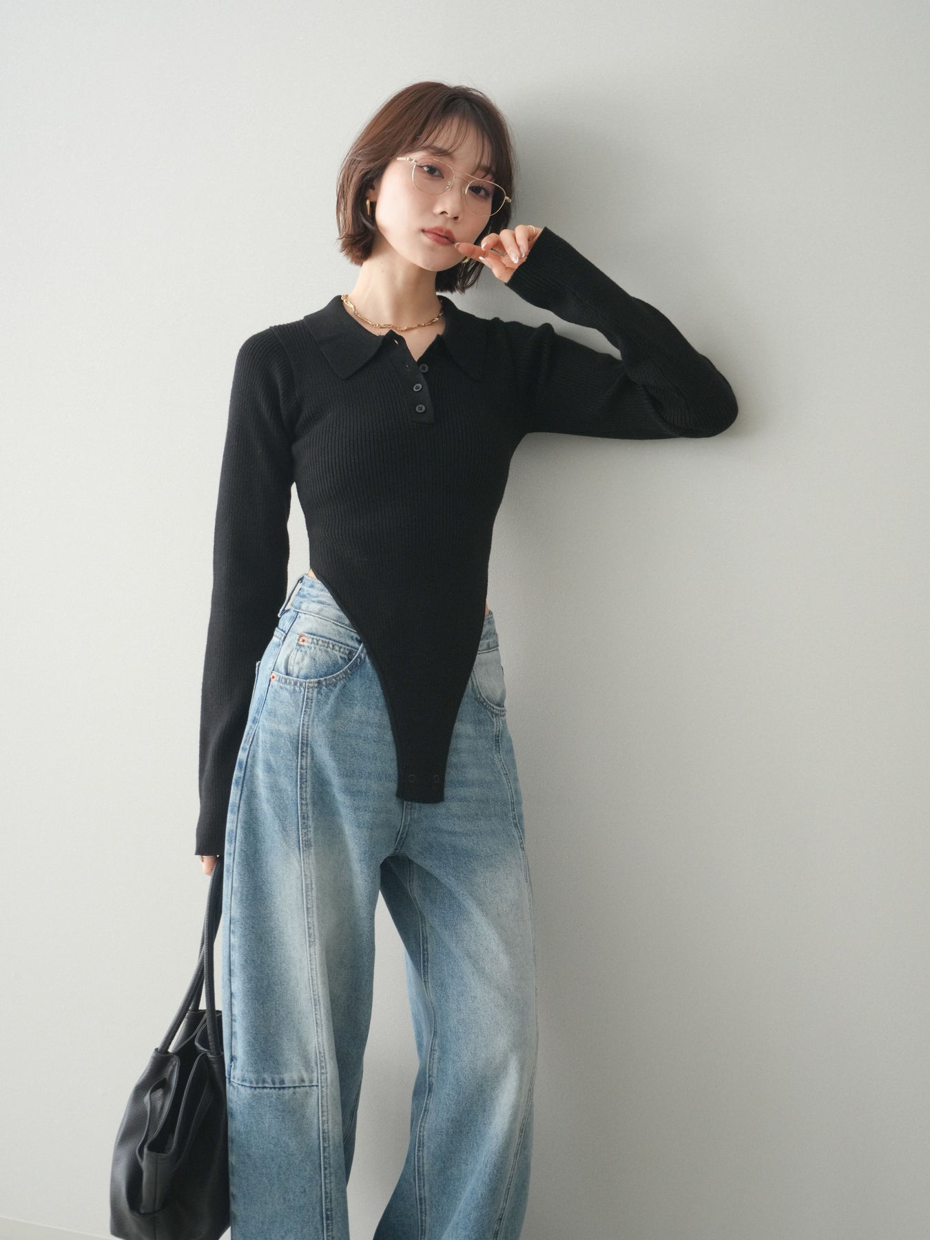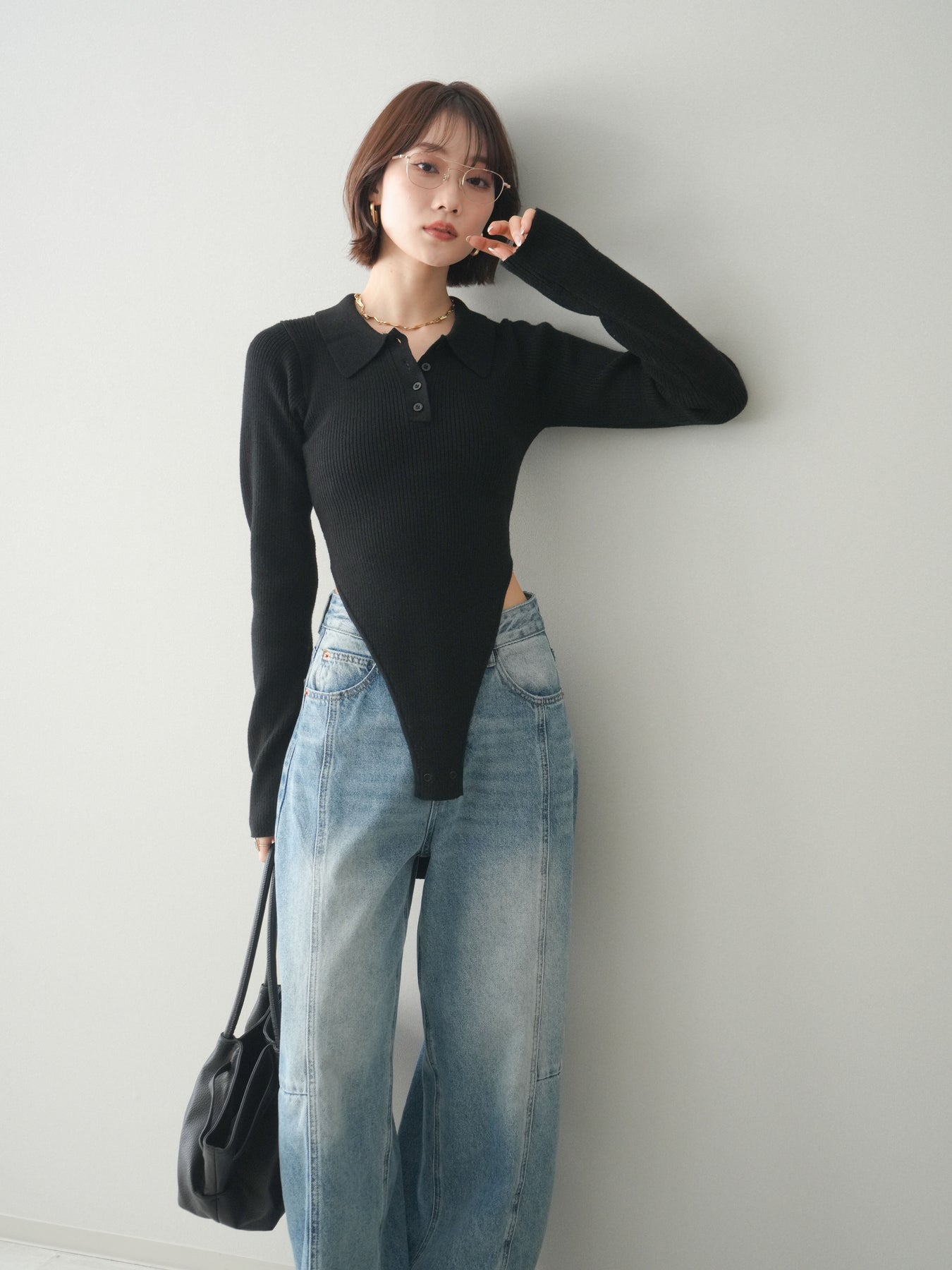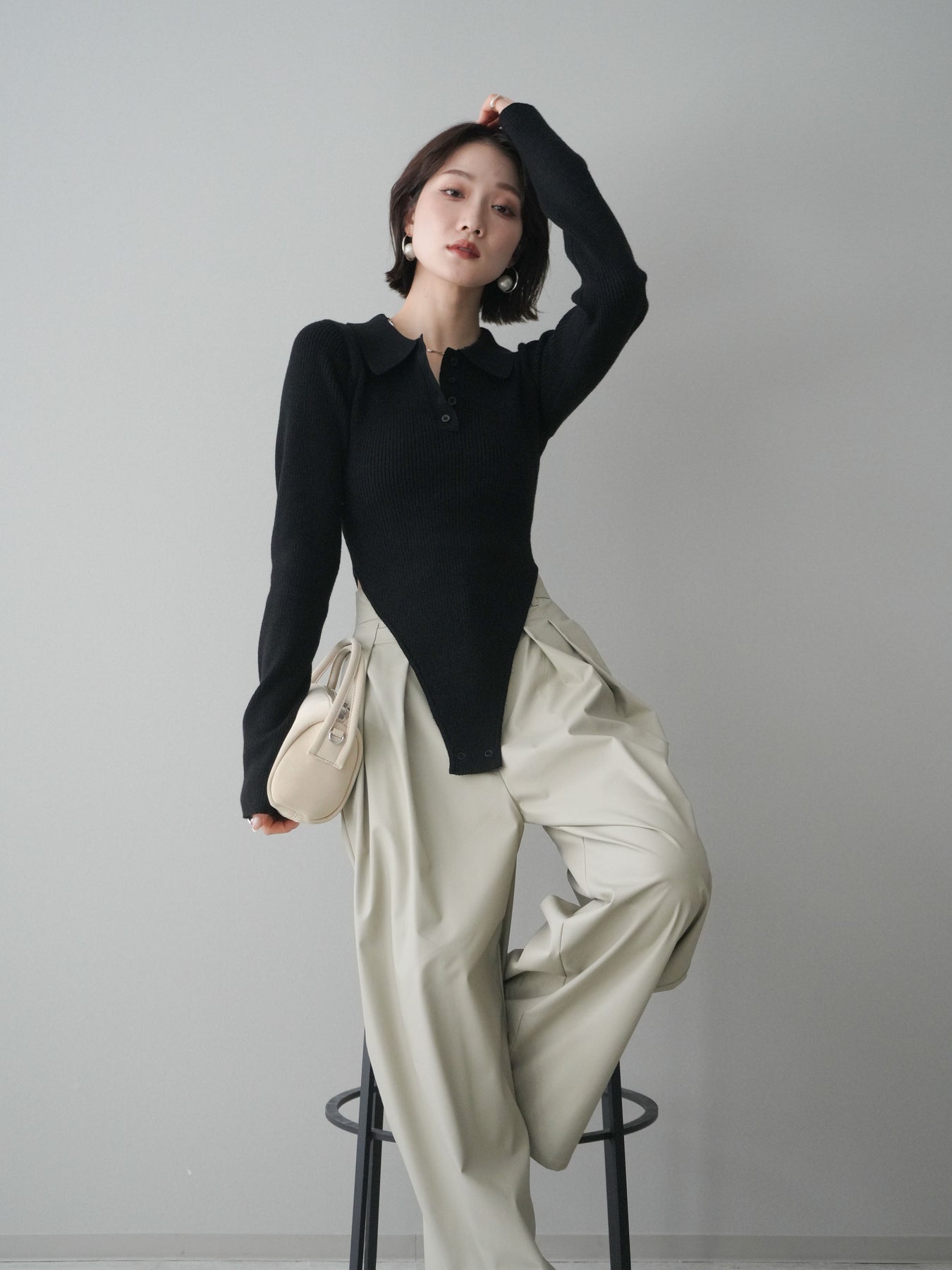 [予約]リブポロニットボディスーツ/black