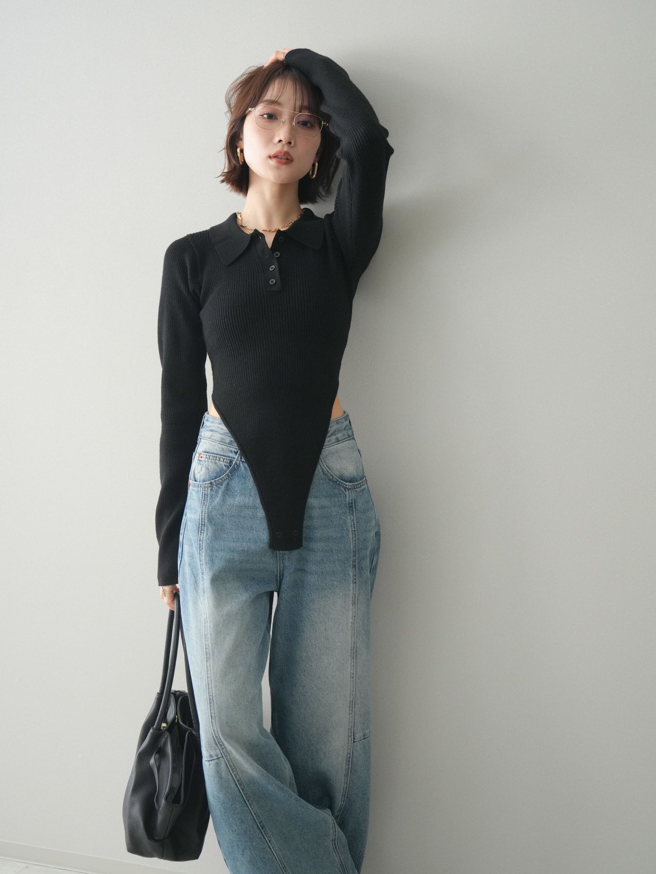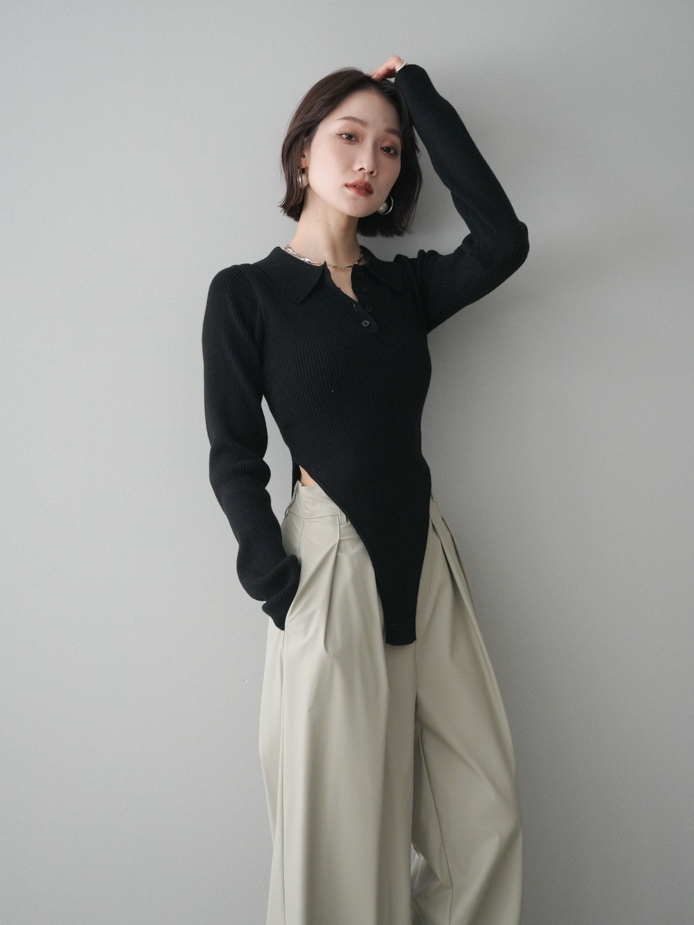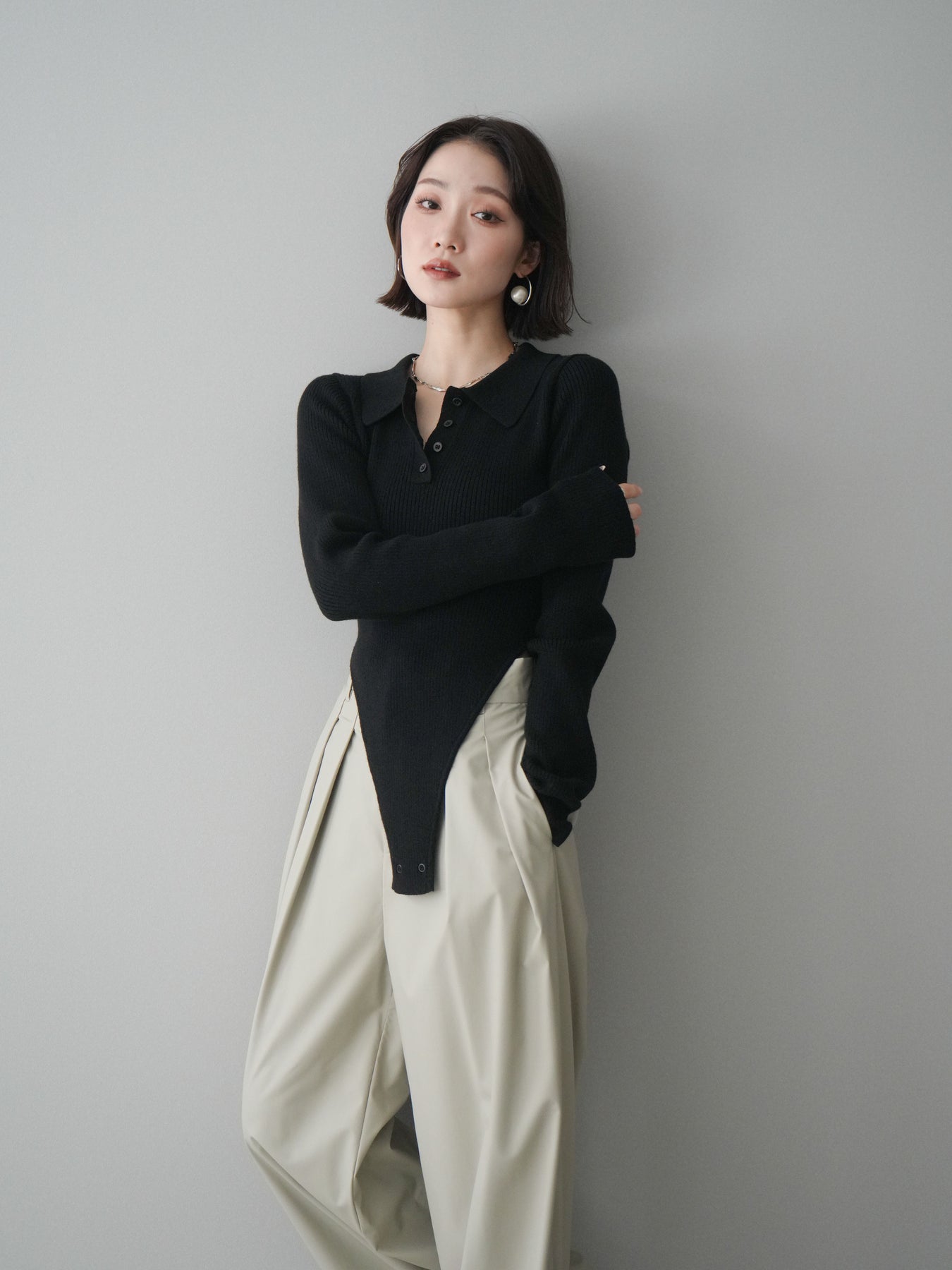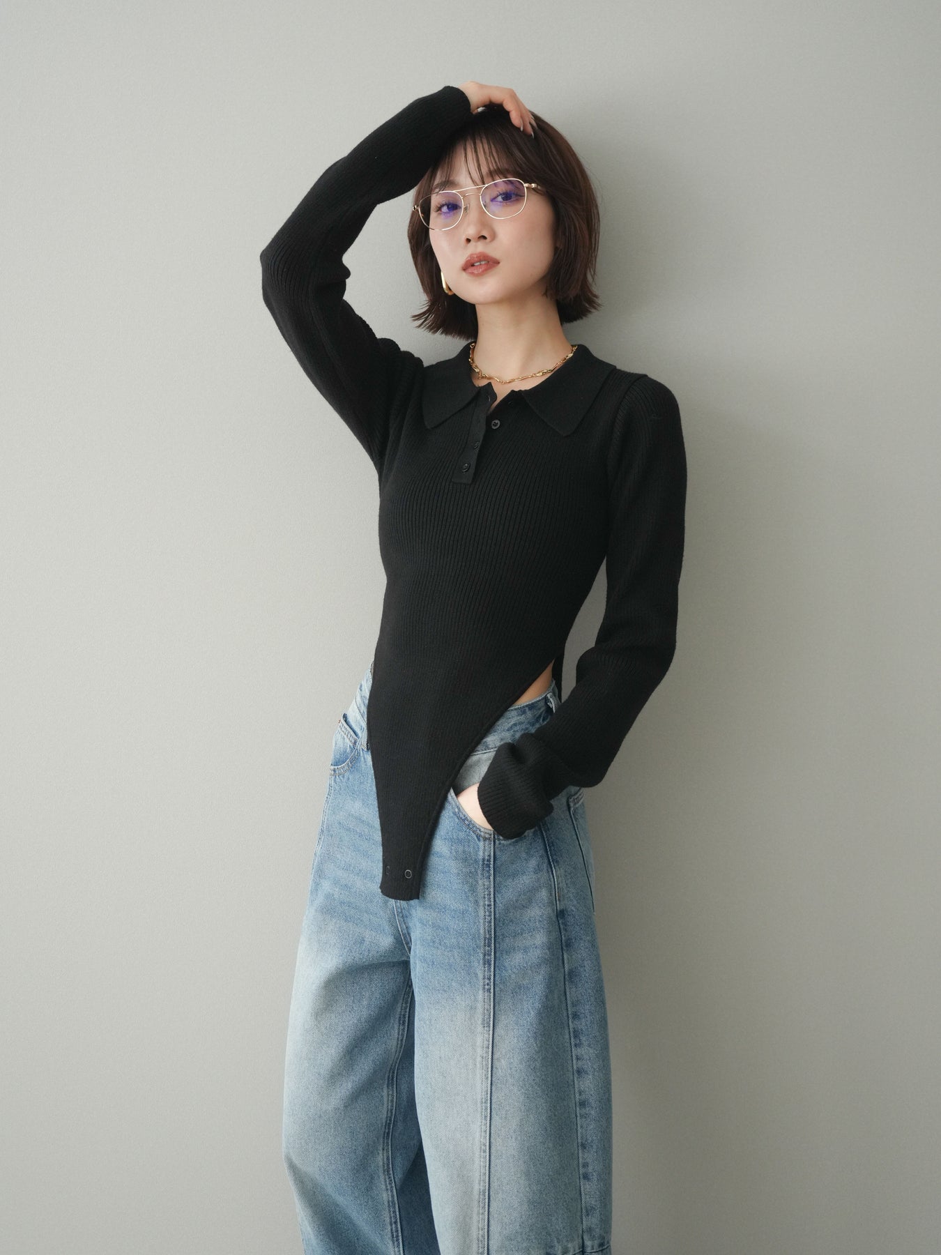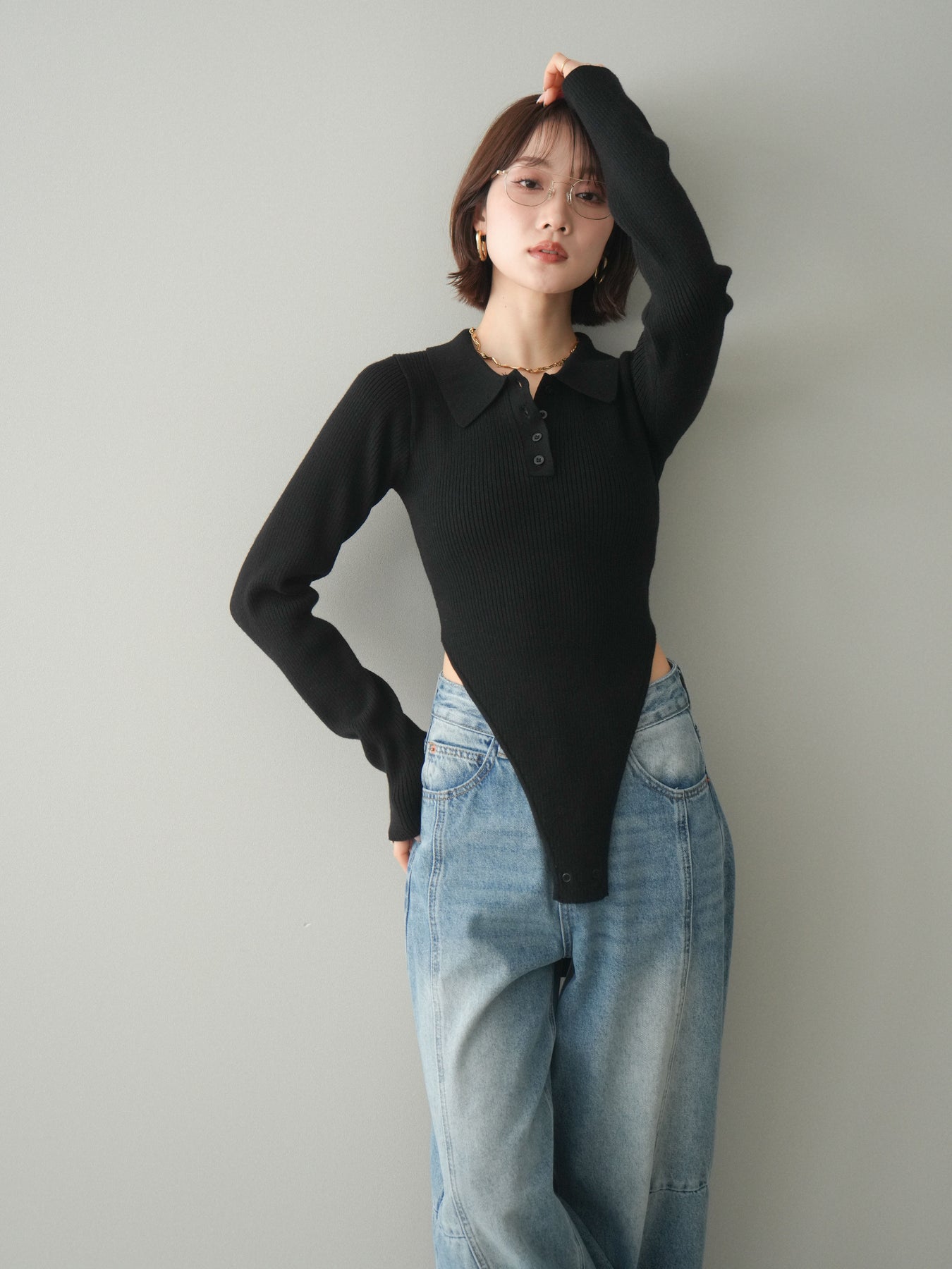 [予約]リブポロニットボディスーツ/black