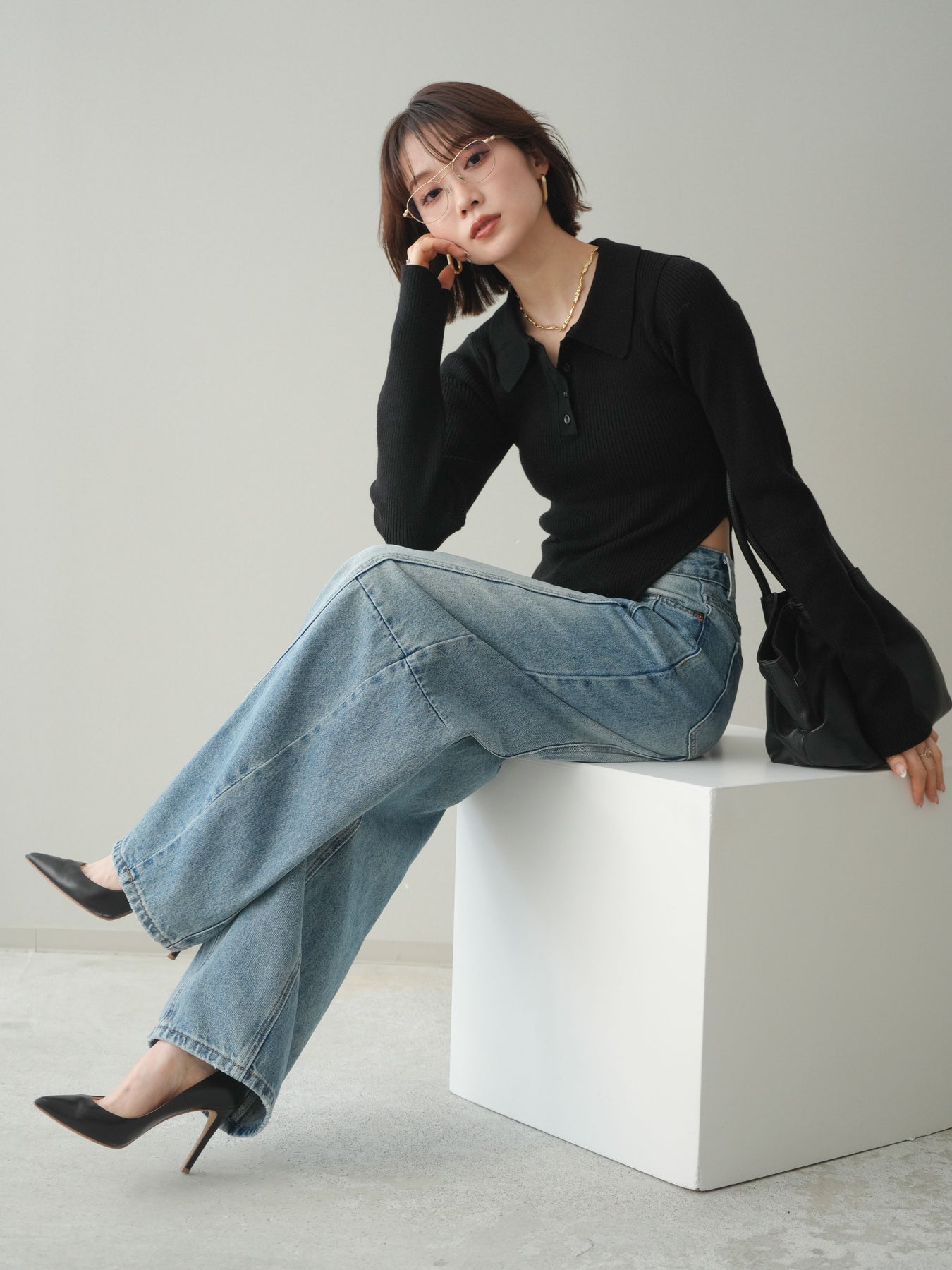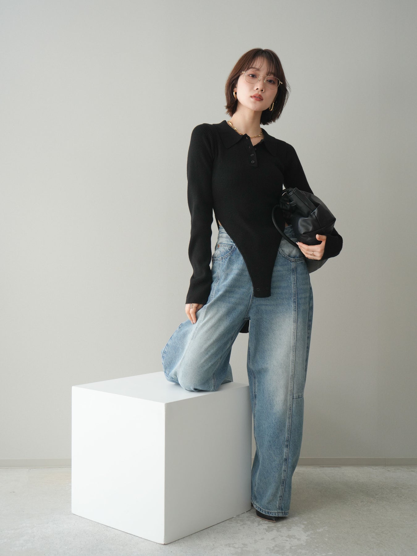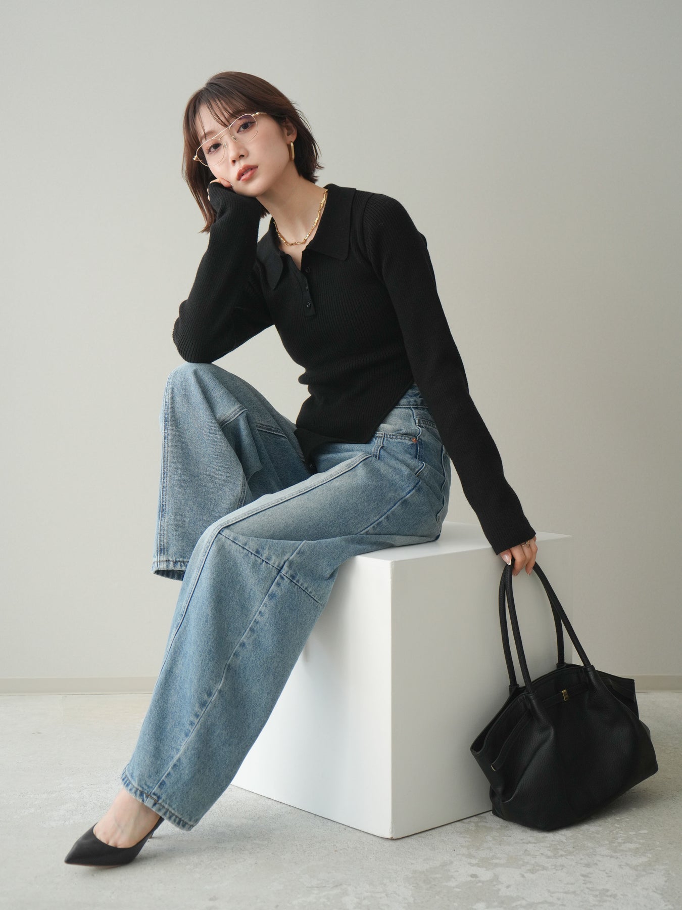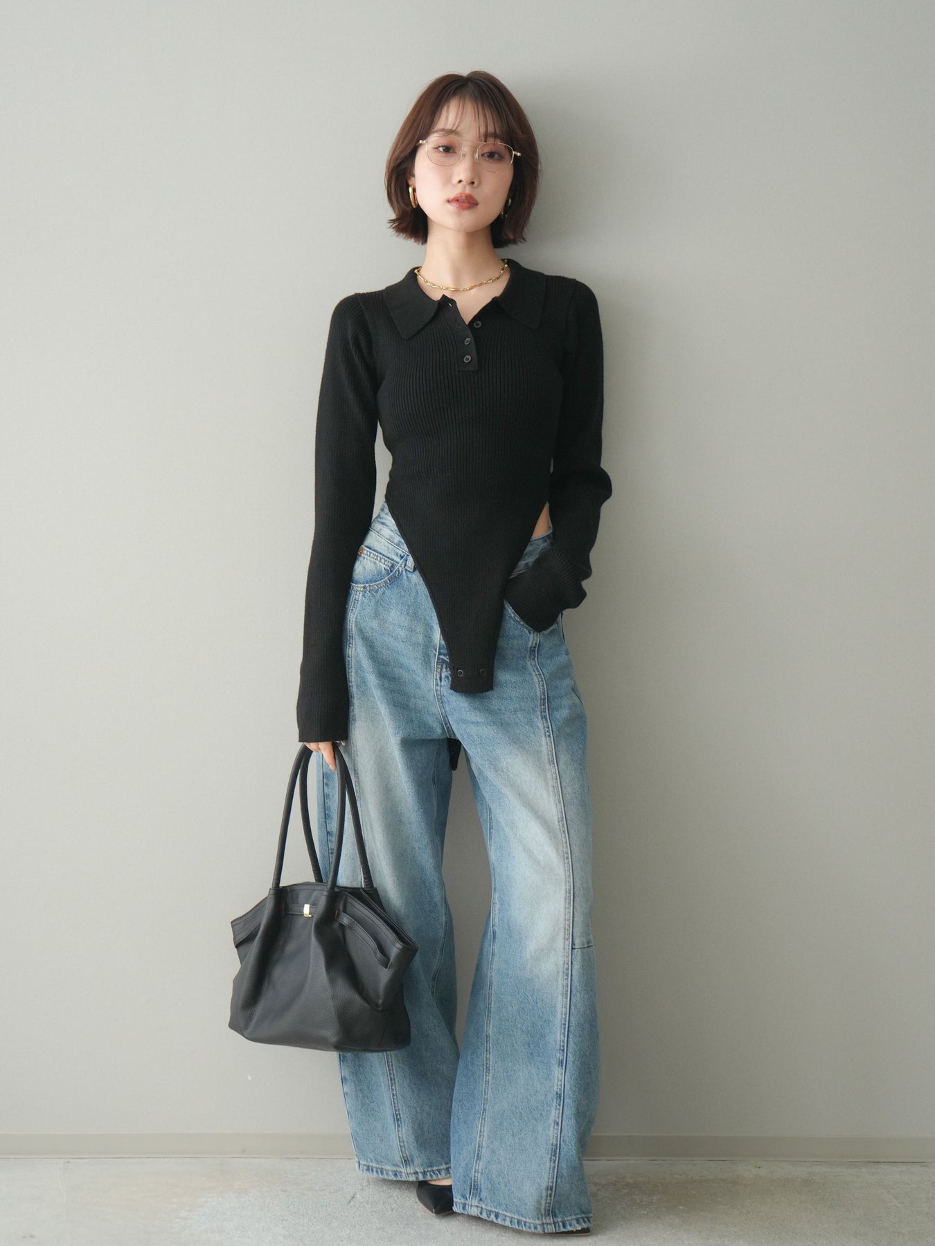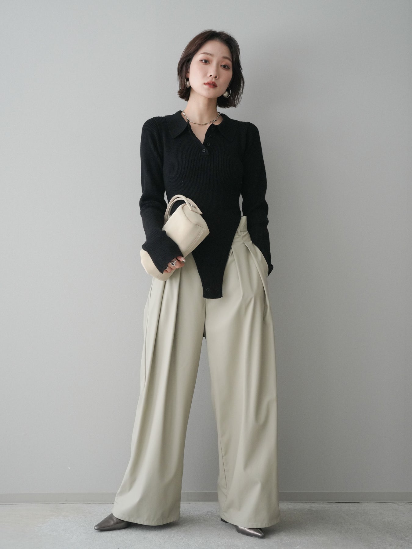 [予約]リブポロニットボディスーツ/black