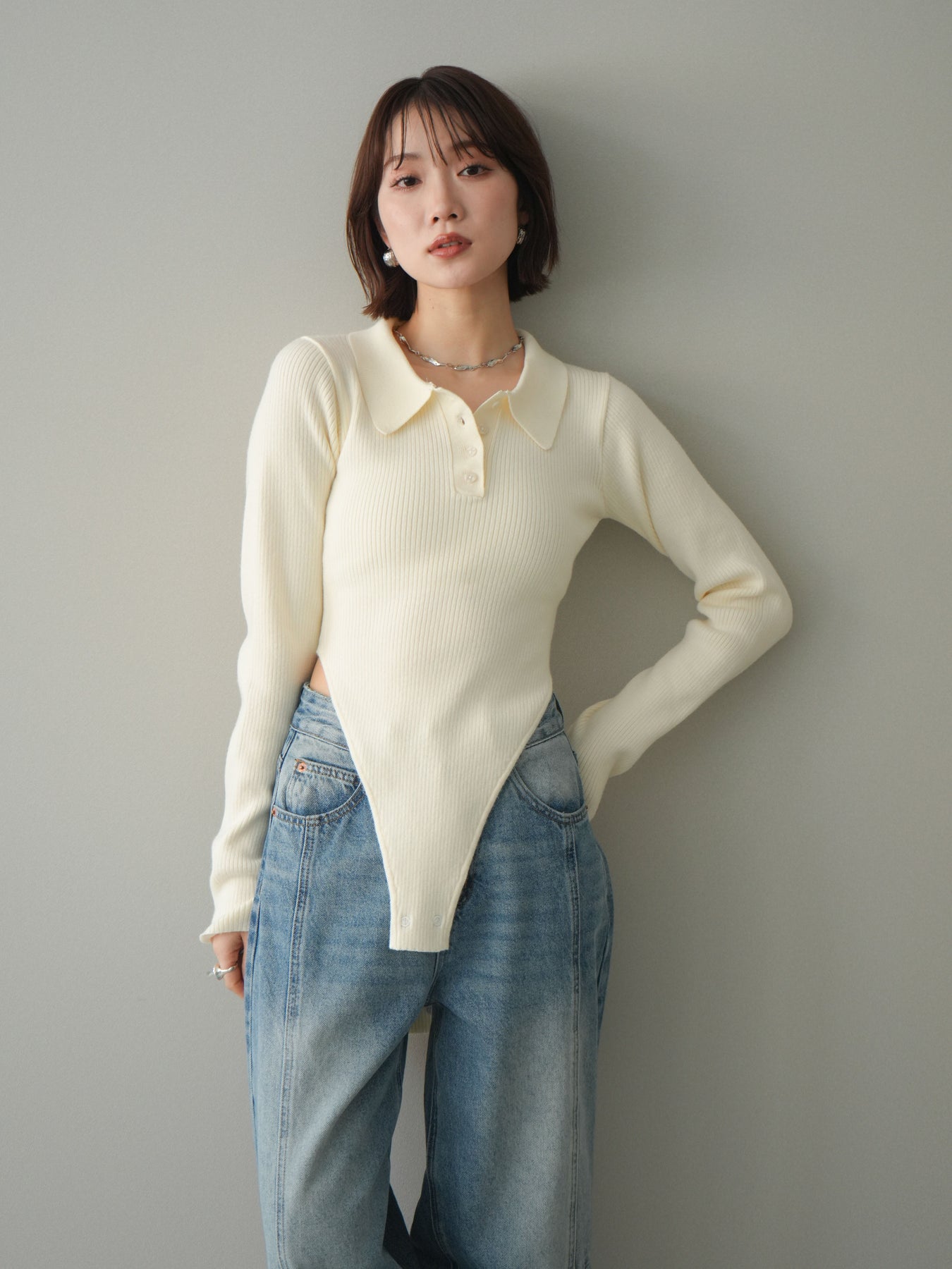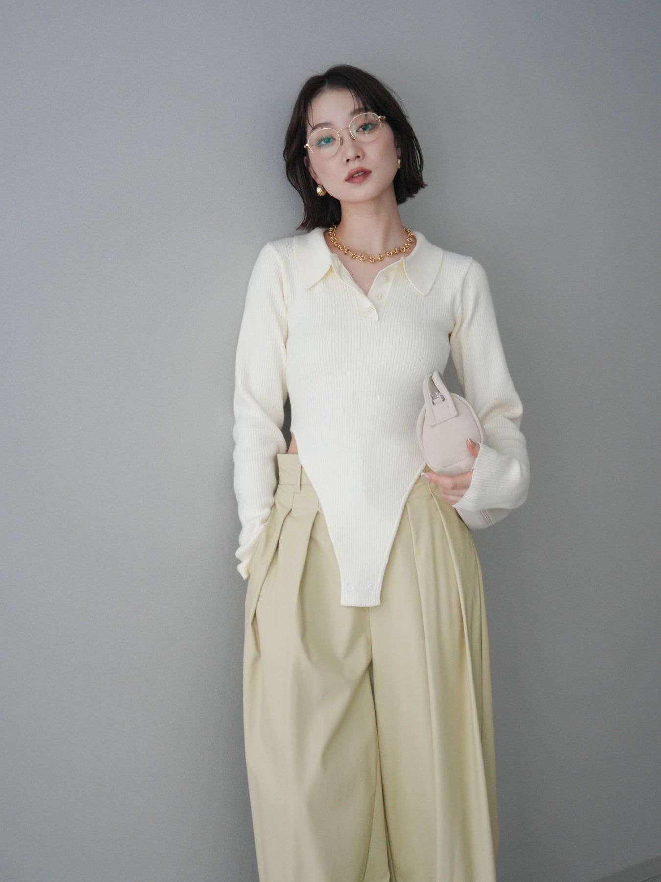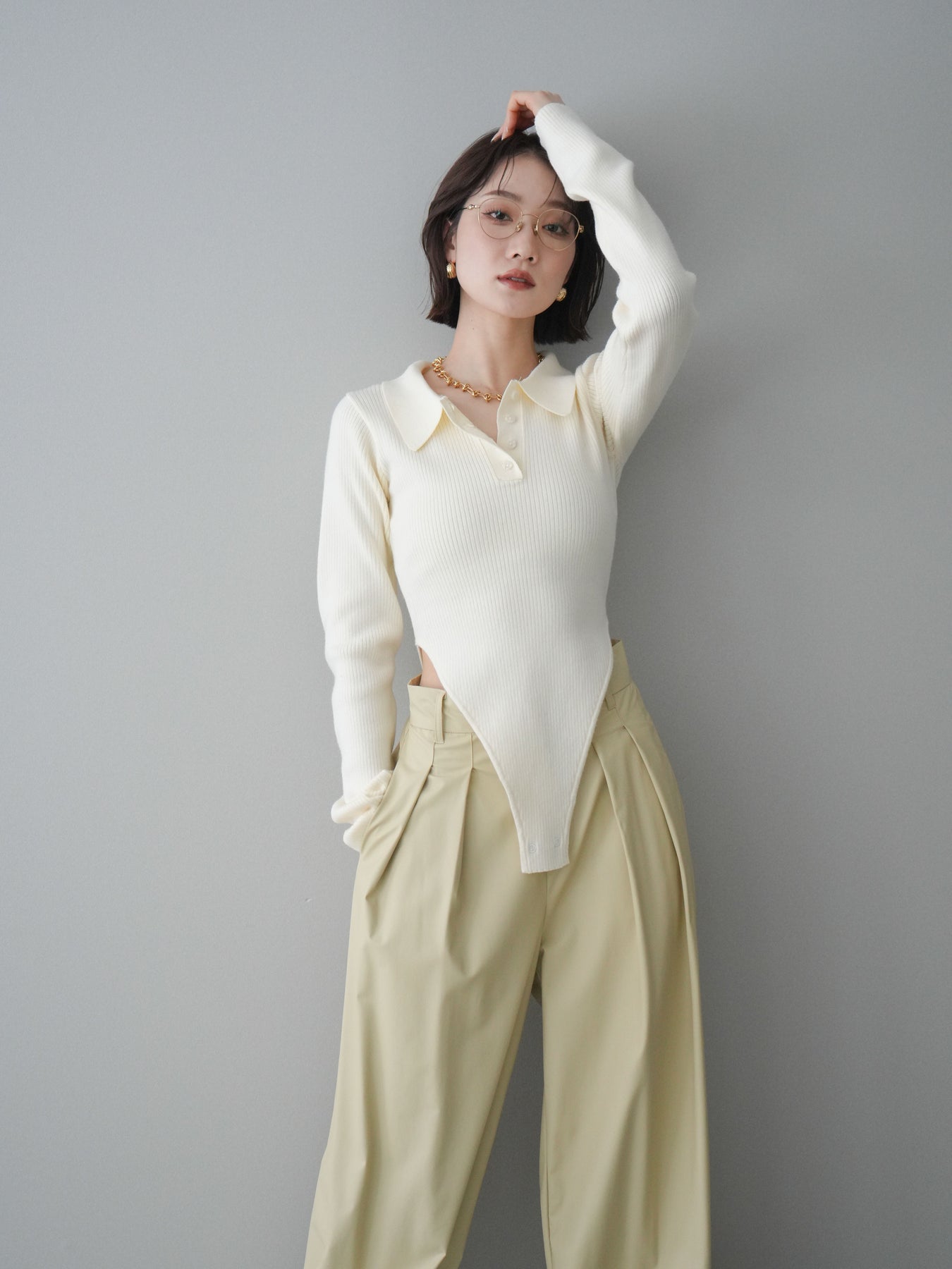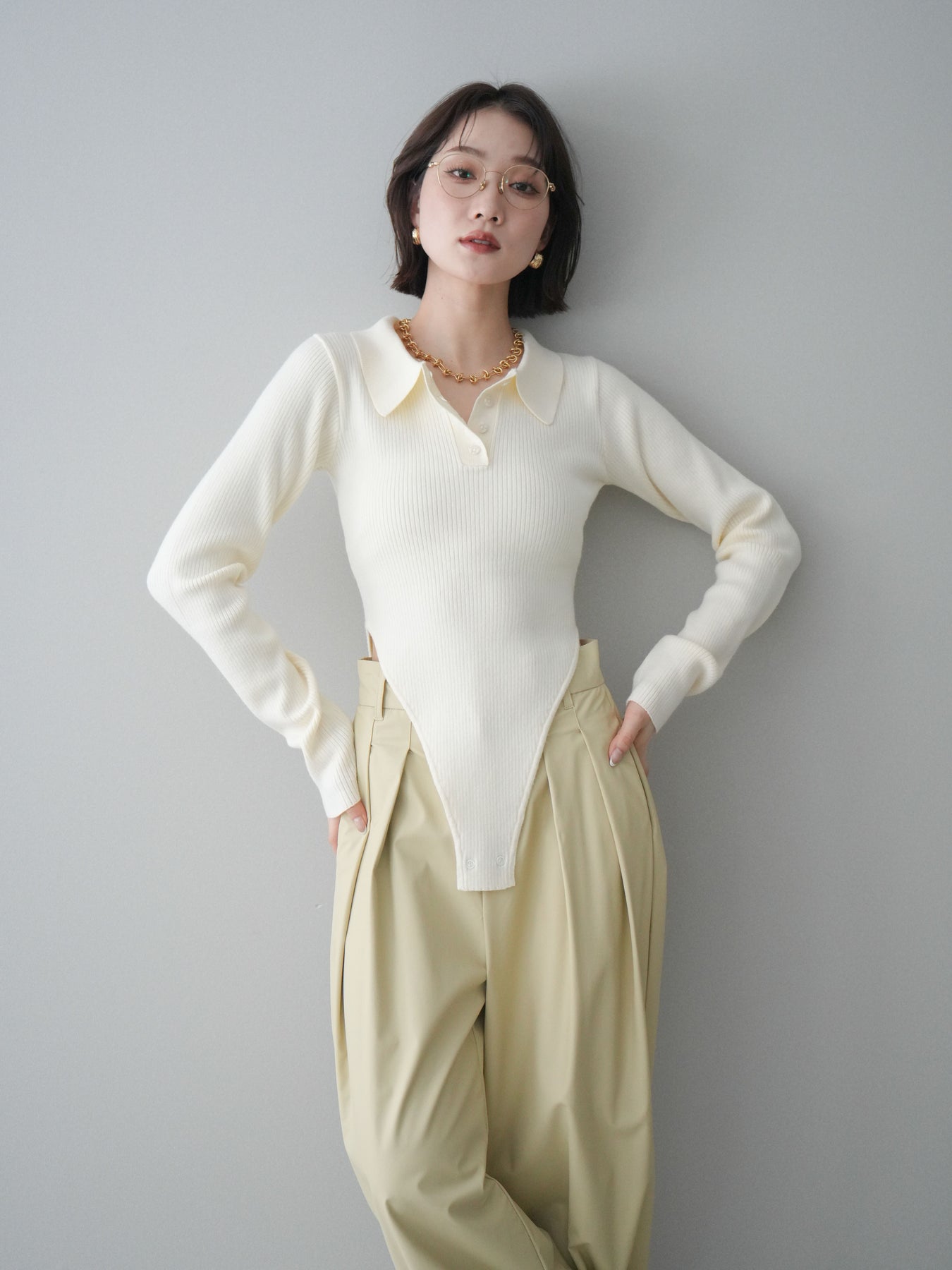 [予約]リブポロニットボディスーツ/ivory