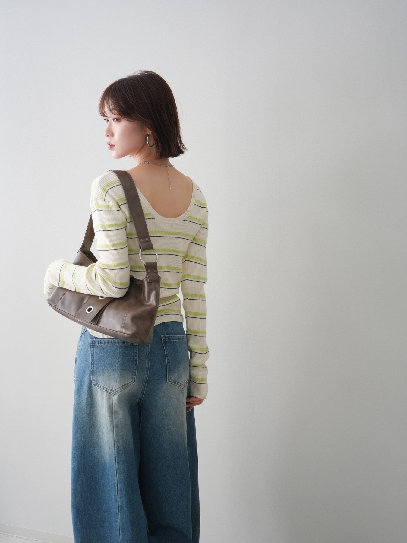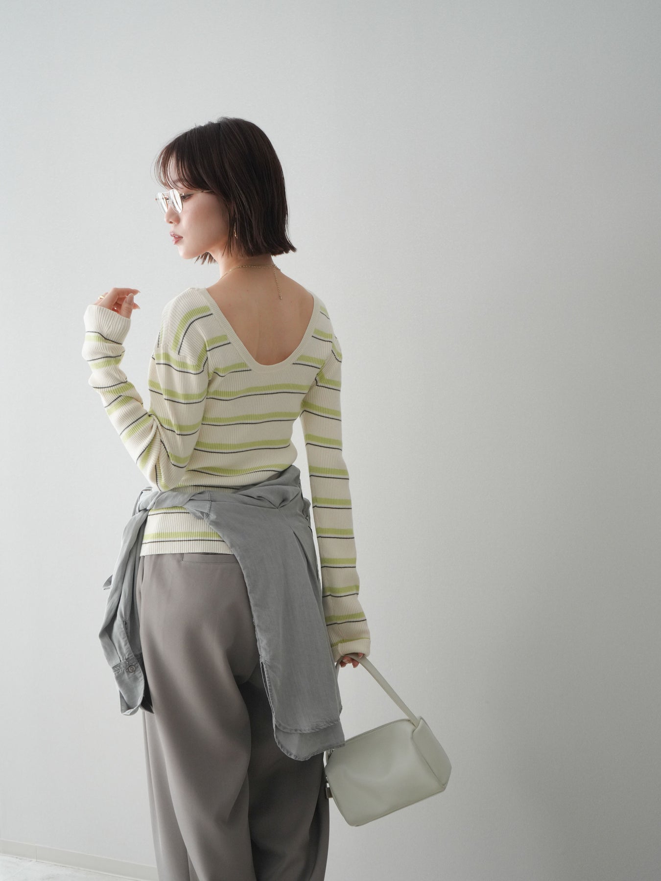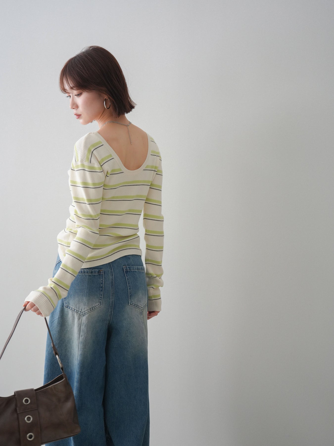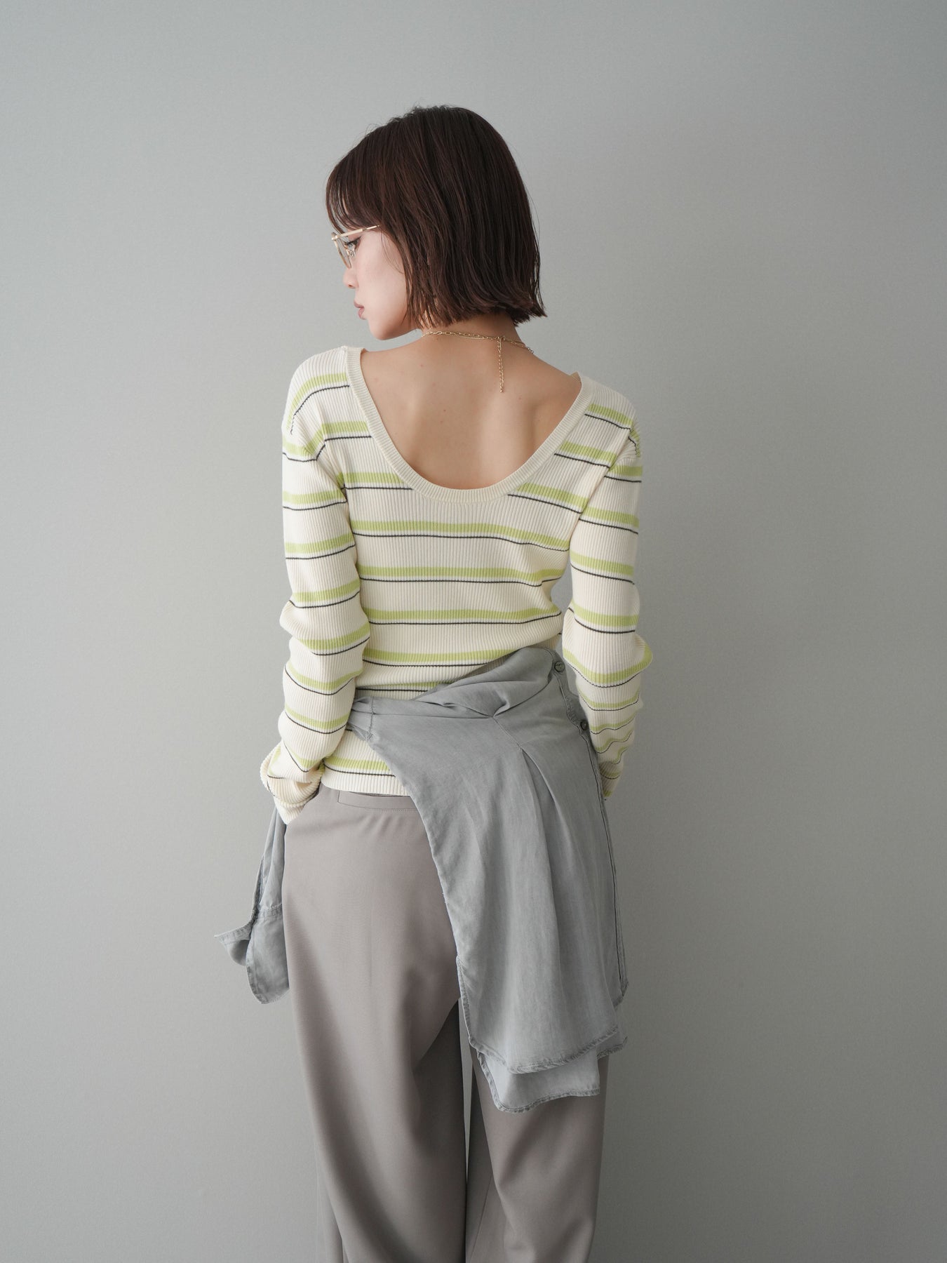 細やかなマルチボーダー柄が目を引く、テレコリブ素材のトップス。程よくフィットするシルエットが女性らしいラインを引き立てつつ、伸縮性のある生地で快適な着心地に仕上げています。バックオープンデザインがさりげない抜け感を演出し、後ろ姿まで印象的なスタイルに。シンプルなボトムスと合わせるだけでコーディネートの主役になる、デイリーに取り入れやすい一枚です。 ※ボトムス、キャミソール(インナー)以外の商品は一律でインナーは付属していません。