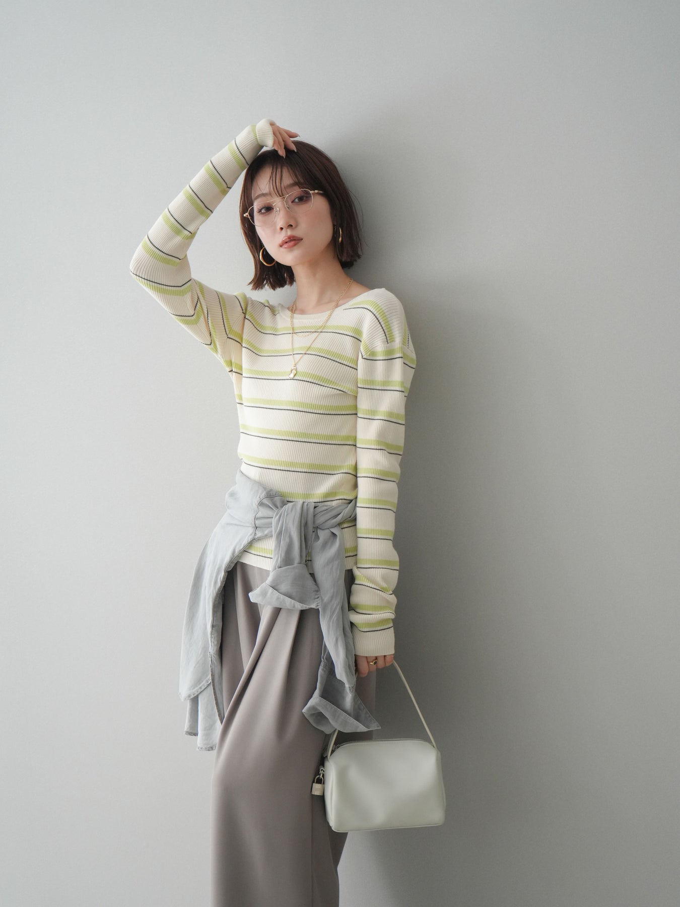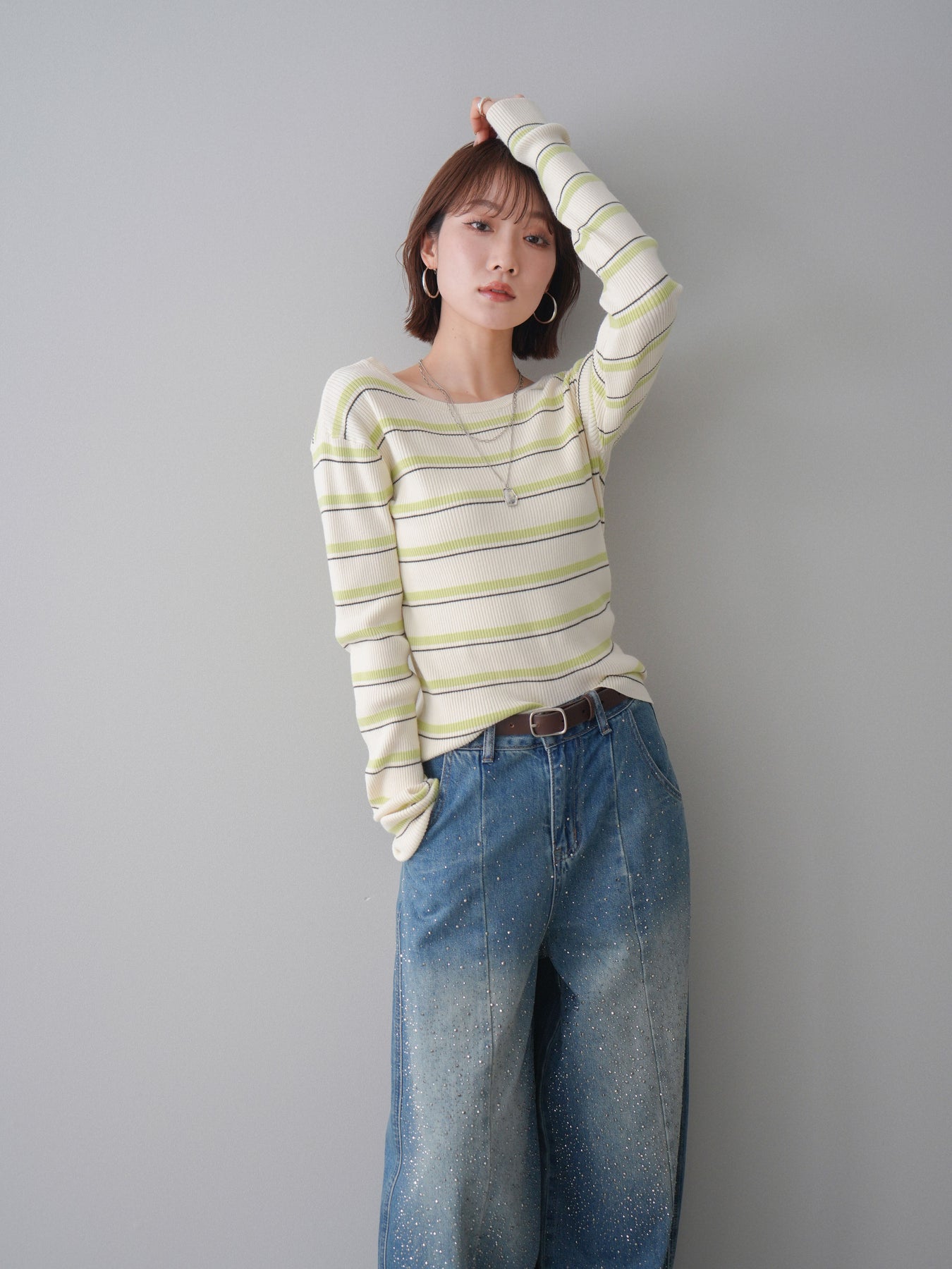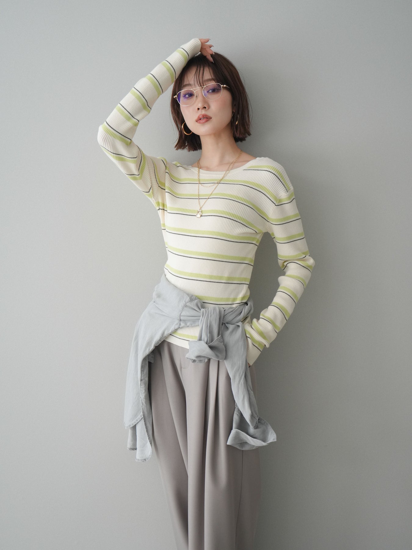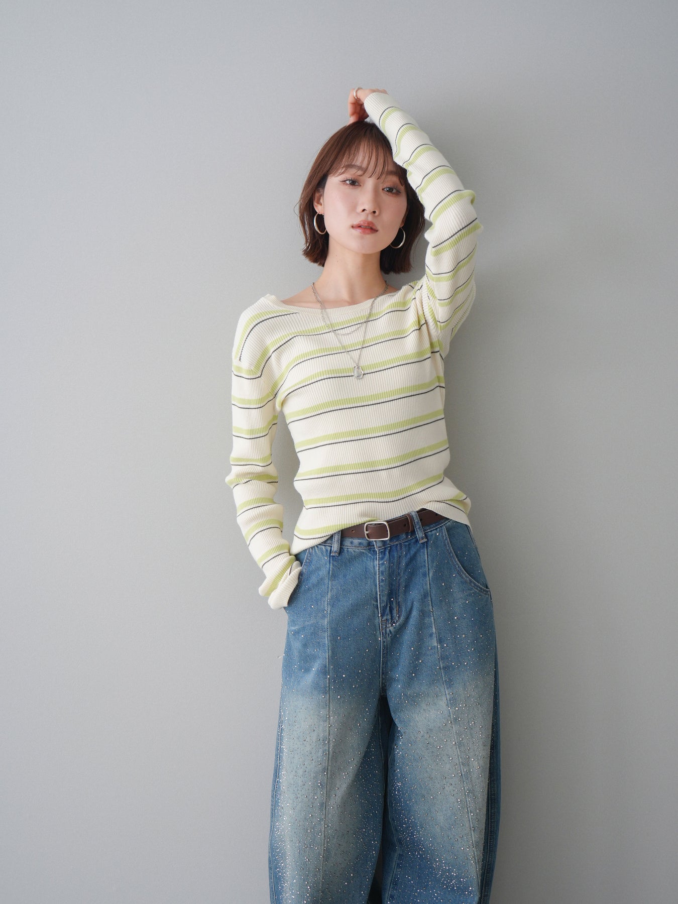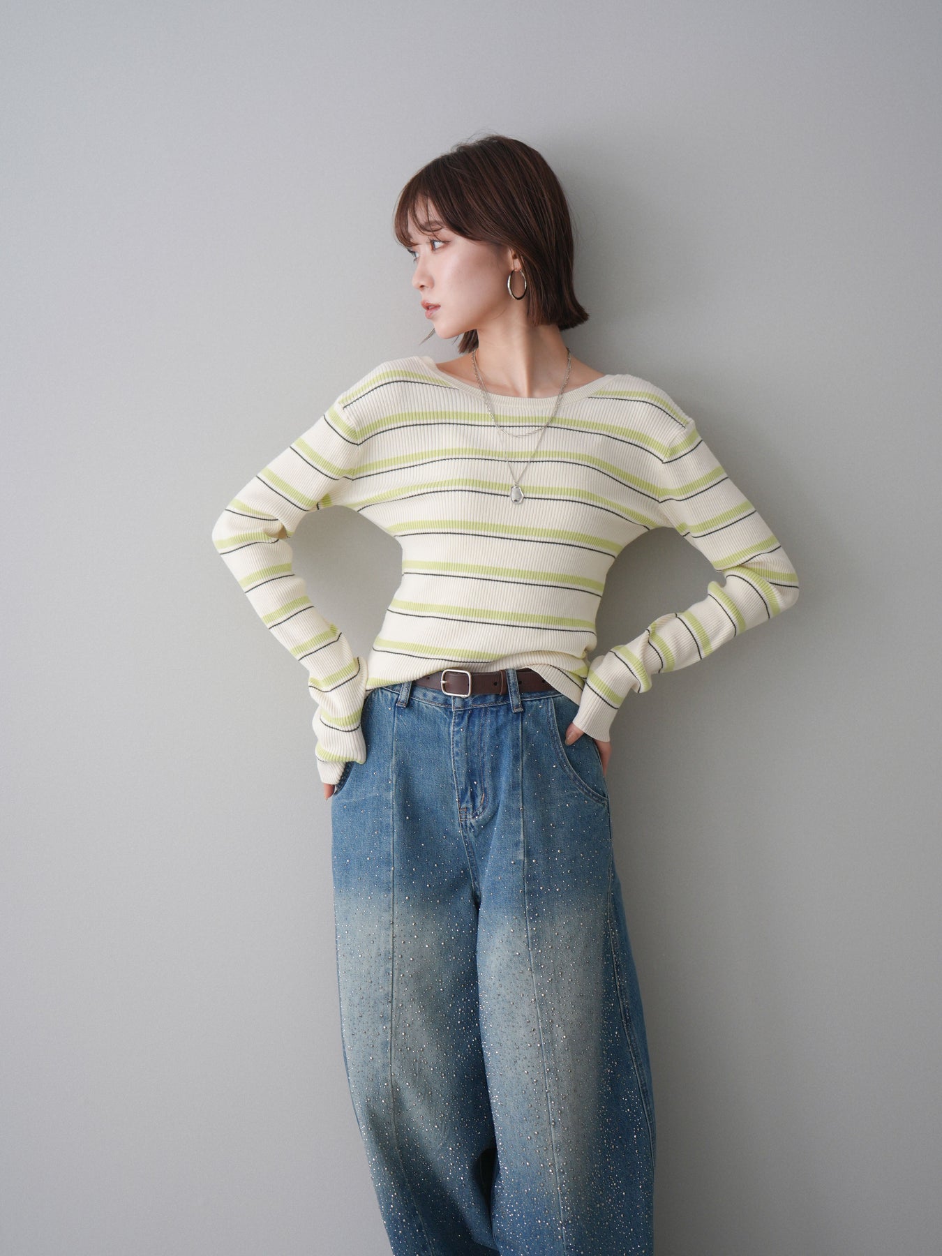 細やかなマルチボーダー柄が目を引く、テレコリブ素材のトップス。程よくフィットするシルエットが女性らしいラインを引き立てつつ、伸縮性のある生地で快適な着心地に仕上げています。バックオープンデザインがさりげない抜け感を演出し、後ろ姿まで印象的なスタイルに。シンプルなボトムスと合わせるだけでコーディネートの主役になる、デイリーに取り入れやすい一枚です。 ※ボトムス、キャミソール(インナー)以外の商品は一律でインナーは付属していません。