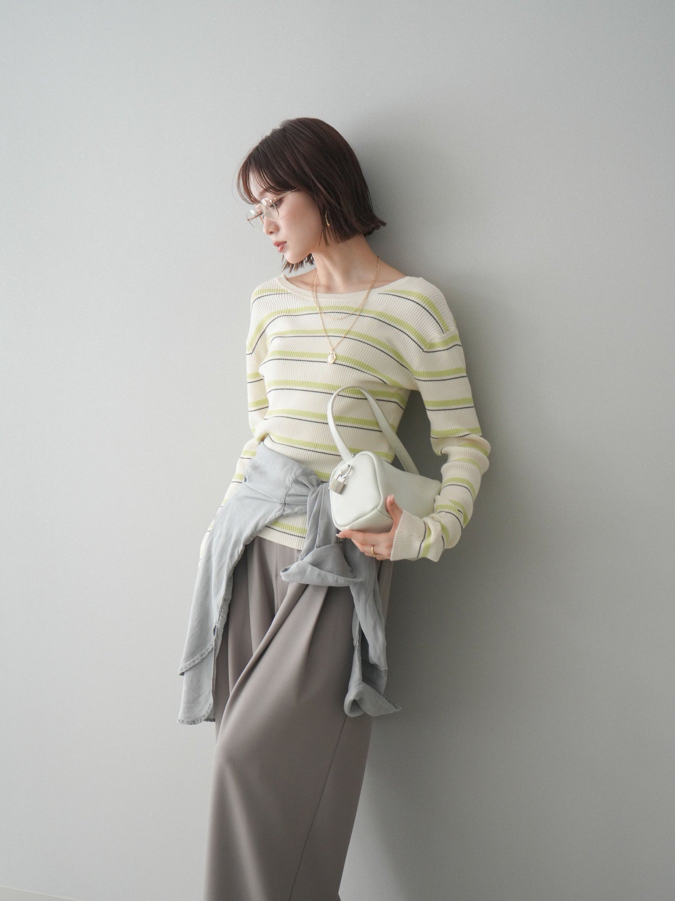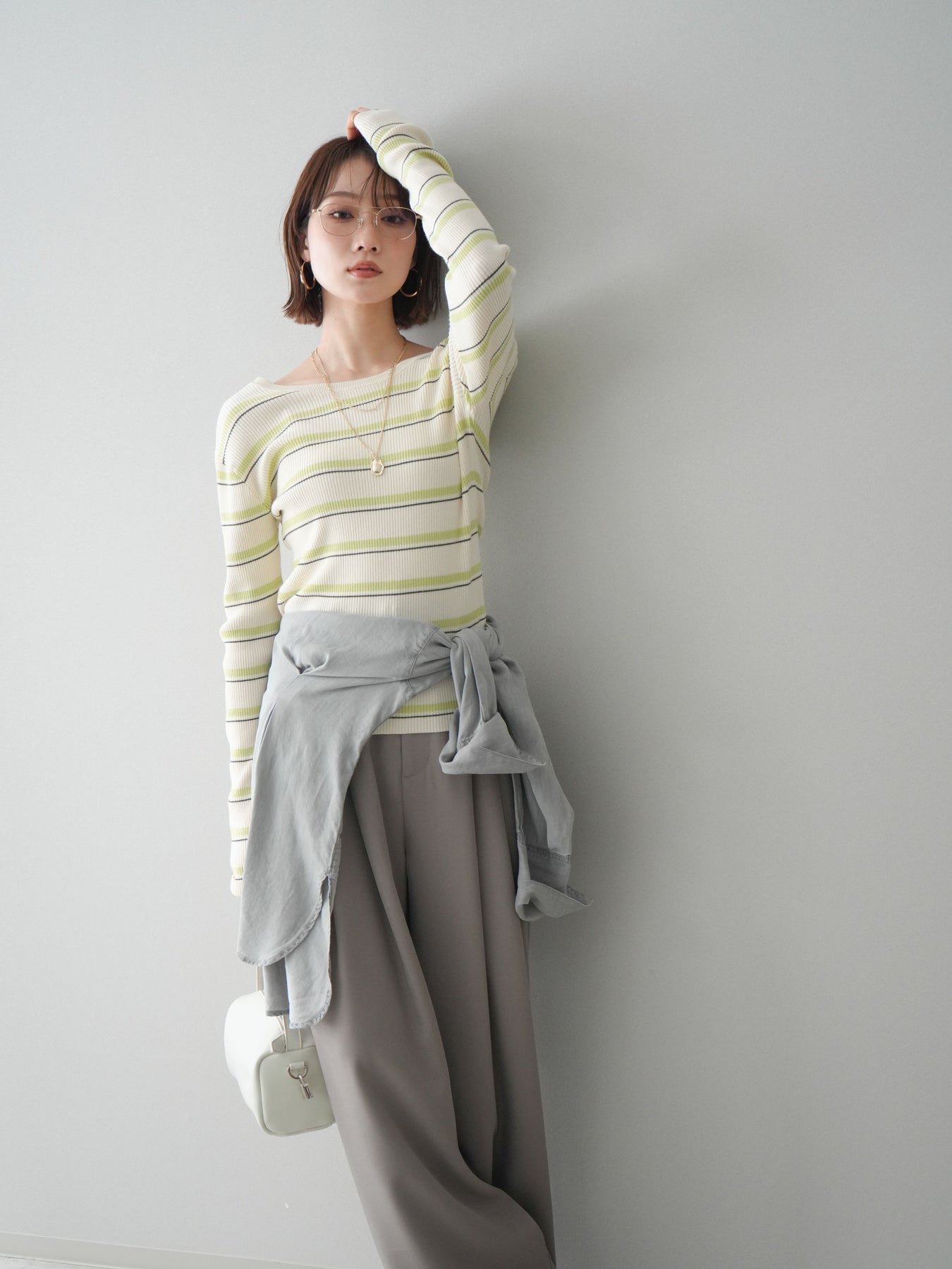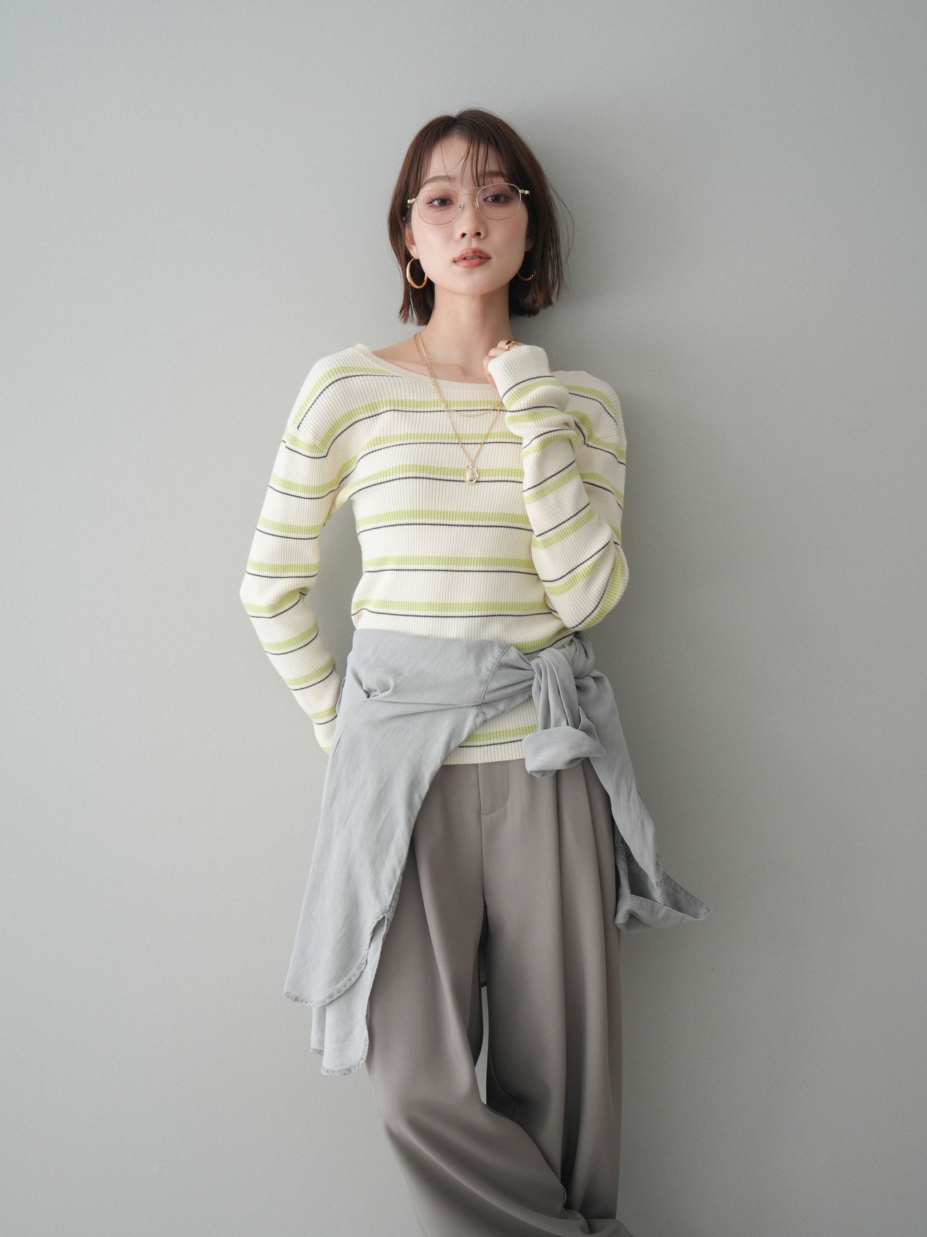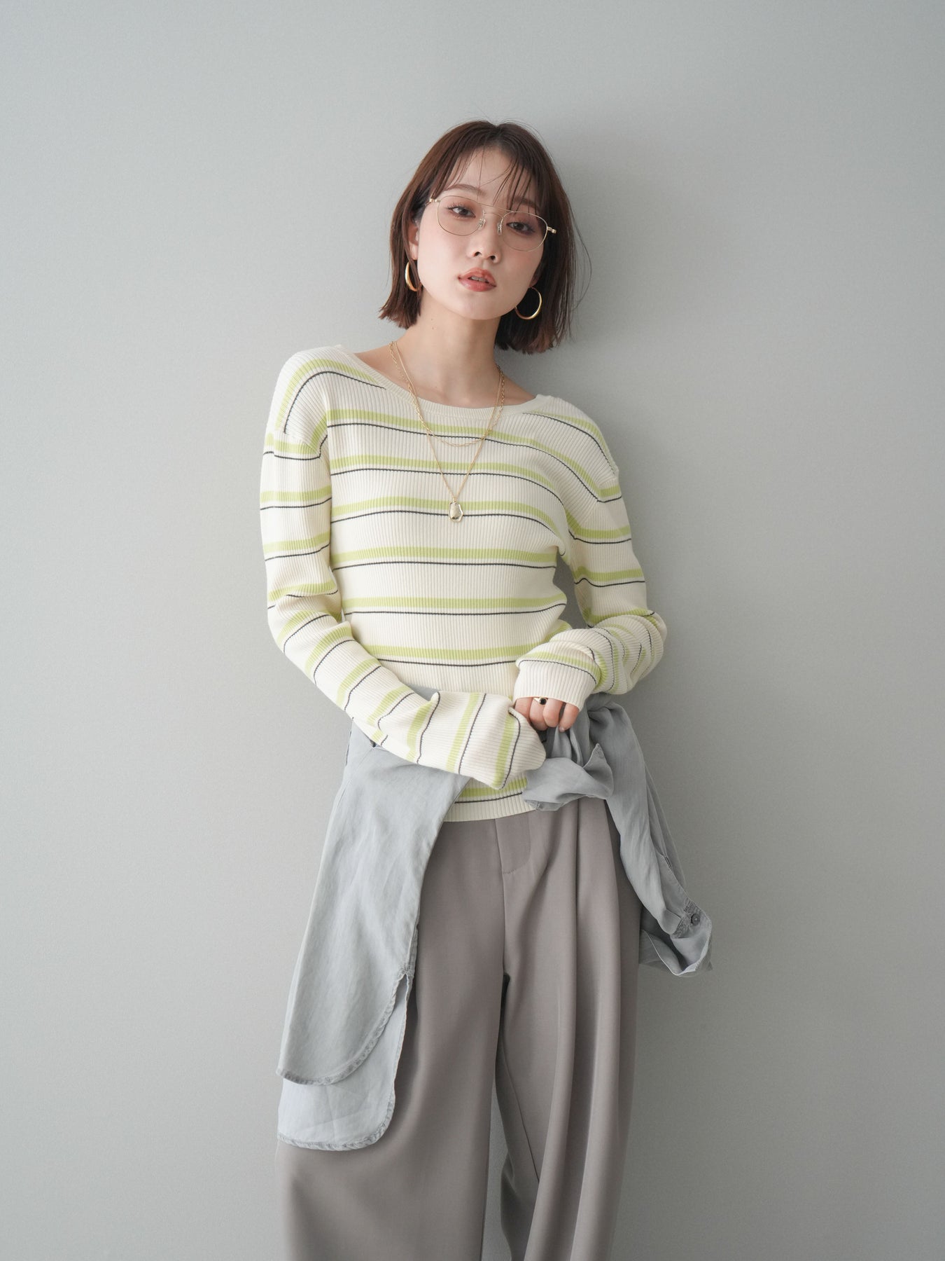 細やかなマルチボーダー柄が目を引く、テレコリブ素材のトップス。程よくフィットするシルエットが女性らしいラインを引き立てつつ、伸縮性のある生地で快適な着心地に仕上げています。バックオープンデザインがさりげない抜け感を演出し、後ろ姿まで印象的なスタイルに。シンプルなボトムスと合わせるだけでコーディネートの主役になる、デイリーに取り入れやすい一枚です。 ※ボトムス、キャミソール(インナー)以外の商品は一律でインナーは付属していません。