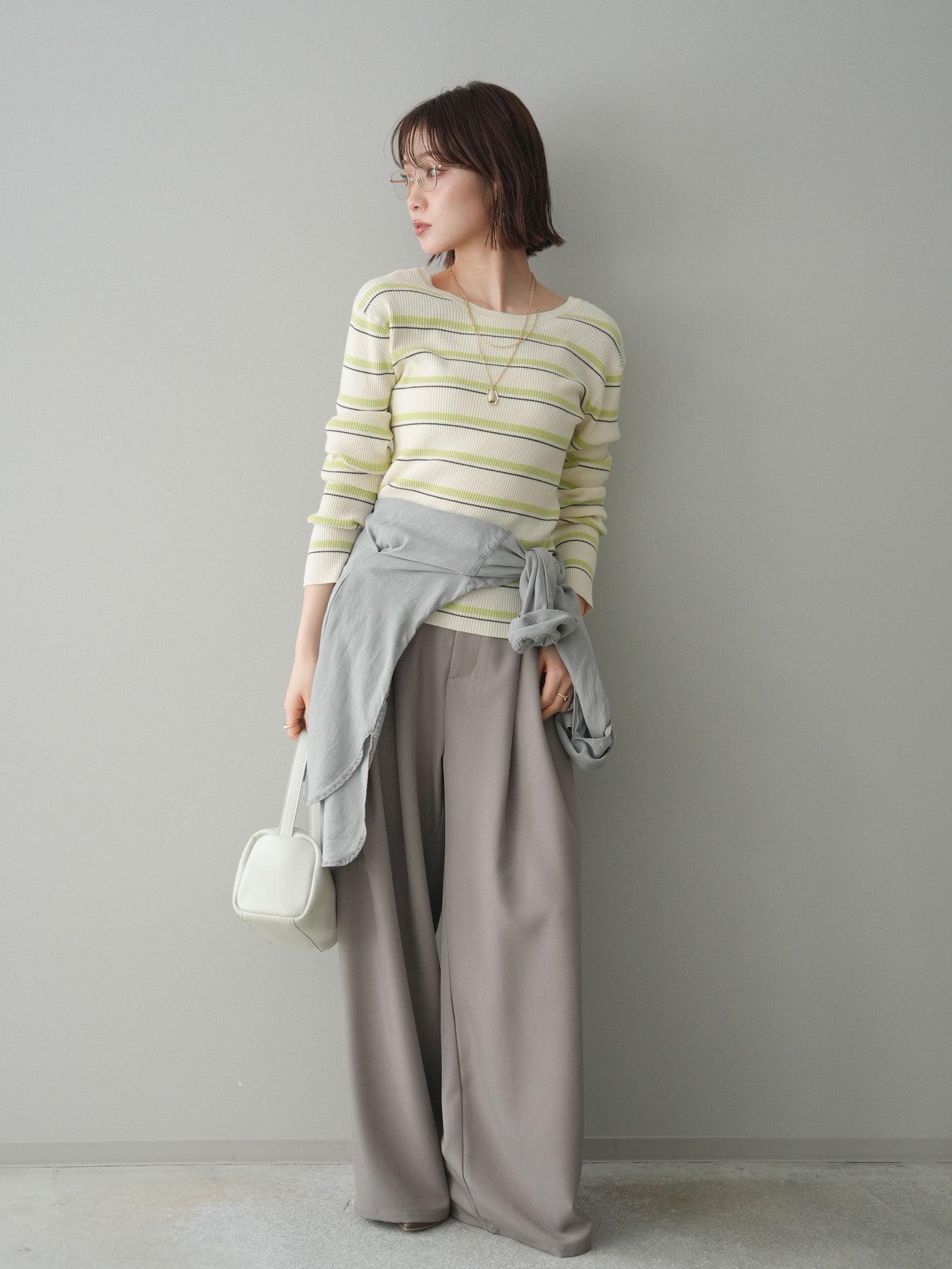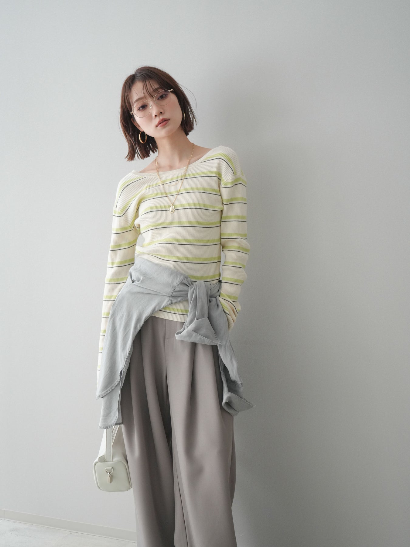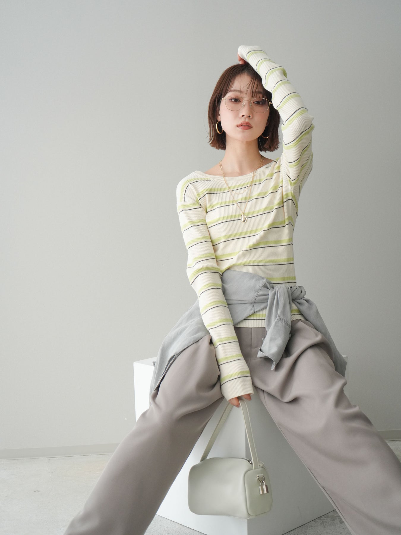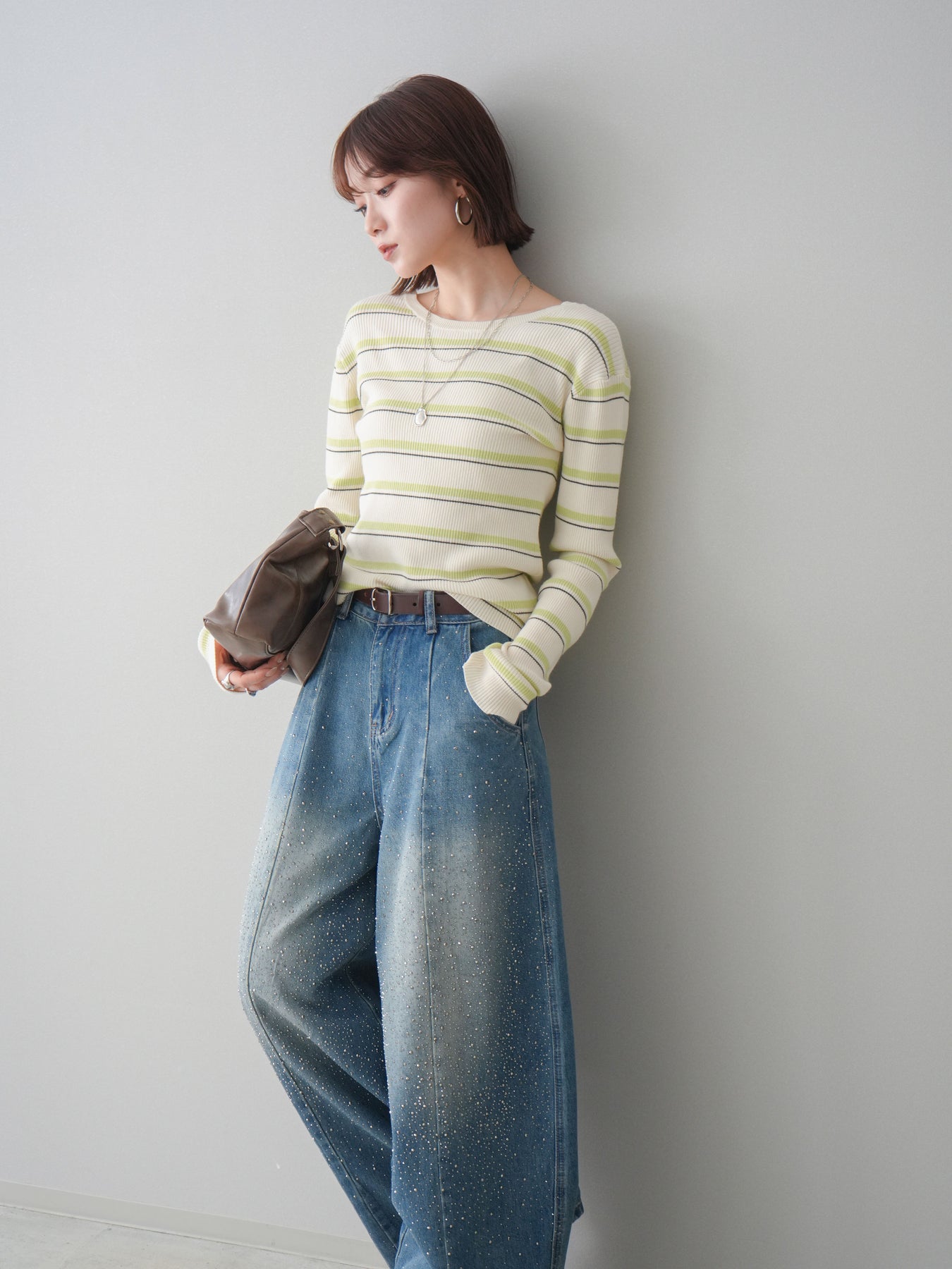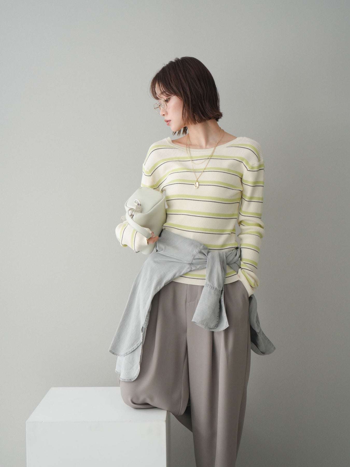 細やかなマルチボーダー柄が目を引く、テレコリブ素材のトップス。程よくフィットするシルエットが女性らしいラインを引き立てつつ、伸縮性のある生地で快適な着心地に仕上げています。バックオープンデザインがさりげない抜け感を演出し、後ろ姿まで印象的なスタイルに。シンプルなボトムスと合わせるだけでコーディネートの主役になる、デイリーに取り入れやすい一枚です。 ※ボトムス、キャミソール(インナー)以外の商品は一律でインナーは付属していません。