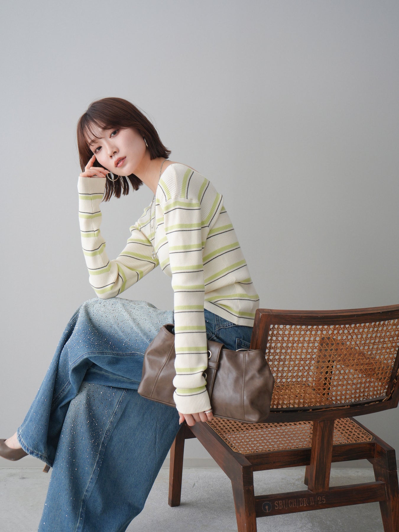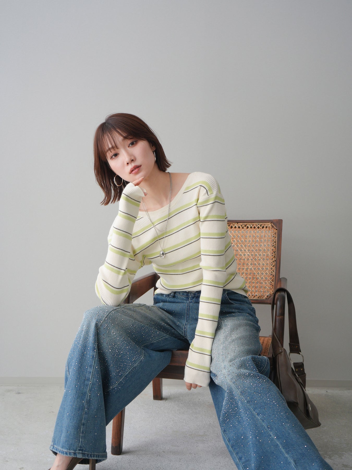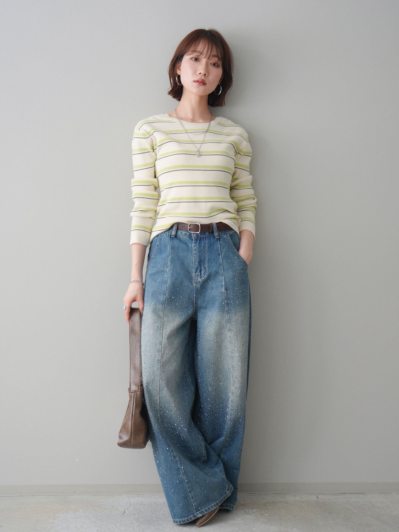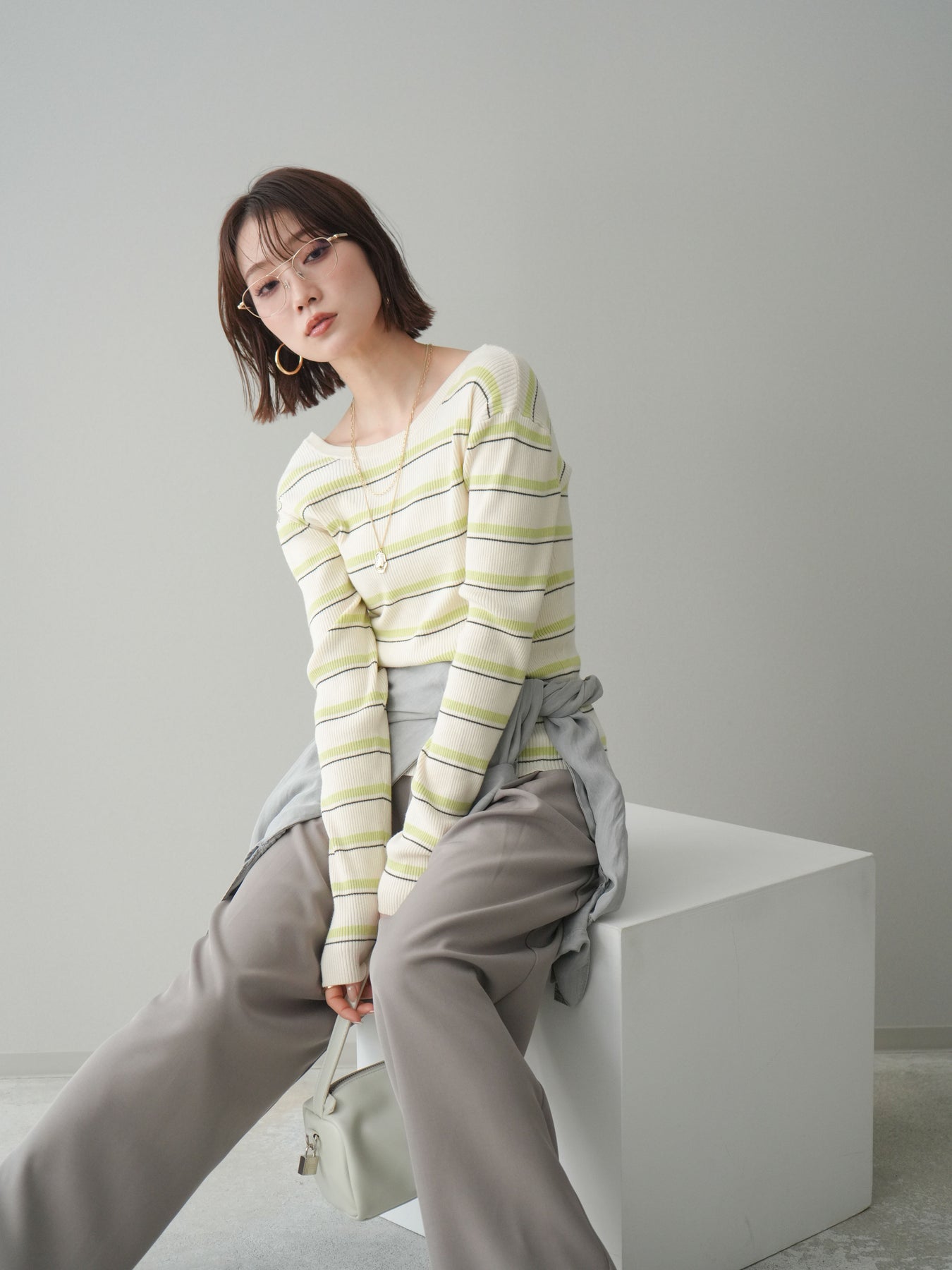細やかなマルチボーダー柄が目を引く、テレコリブ素材のトップス。程よくフィットするシルエットが女性らしいラインを引き立てつつ、伸縮性のある生地で快適な着心地に仕上げています。バックオープンデザインがさりげない抜け感を演出し、後ろ姿まで印象的なスタイルに。シンプルなボトムスと合わせるだけでコーディネートの主役になる、デイリーに取り入れやすい一枚です。 ※ボトムス、キャミソール(インナー)以外の商品は一律でインナーは付属していません。