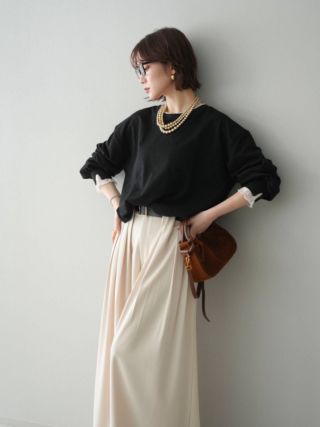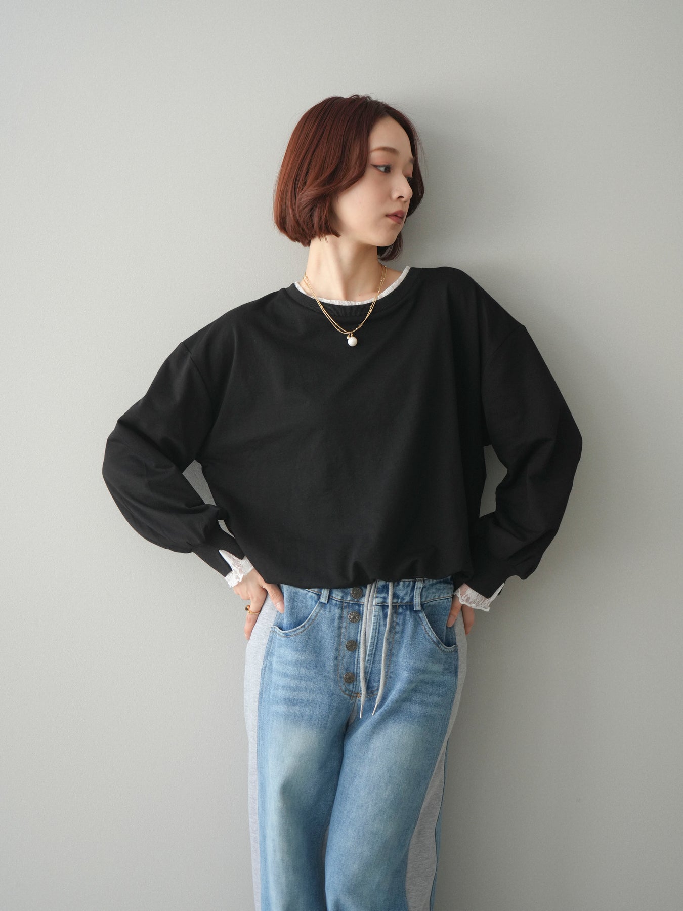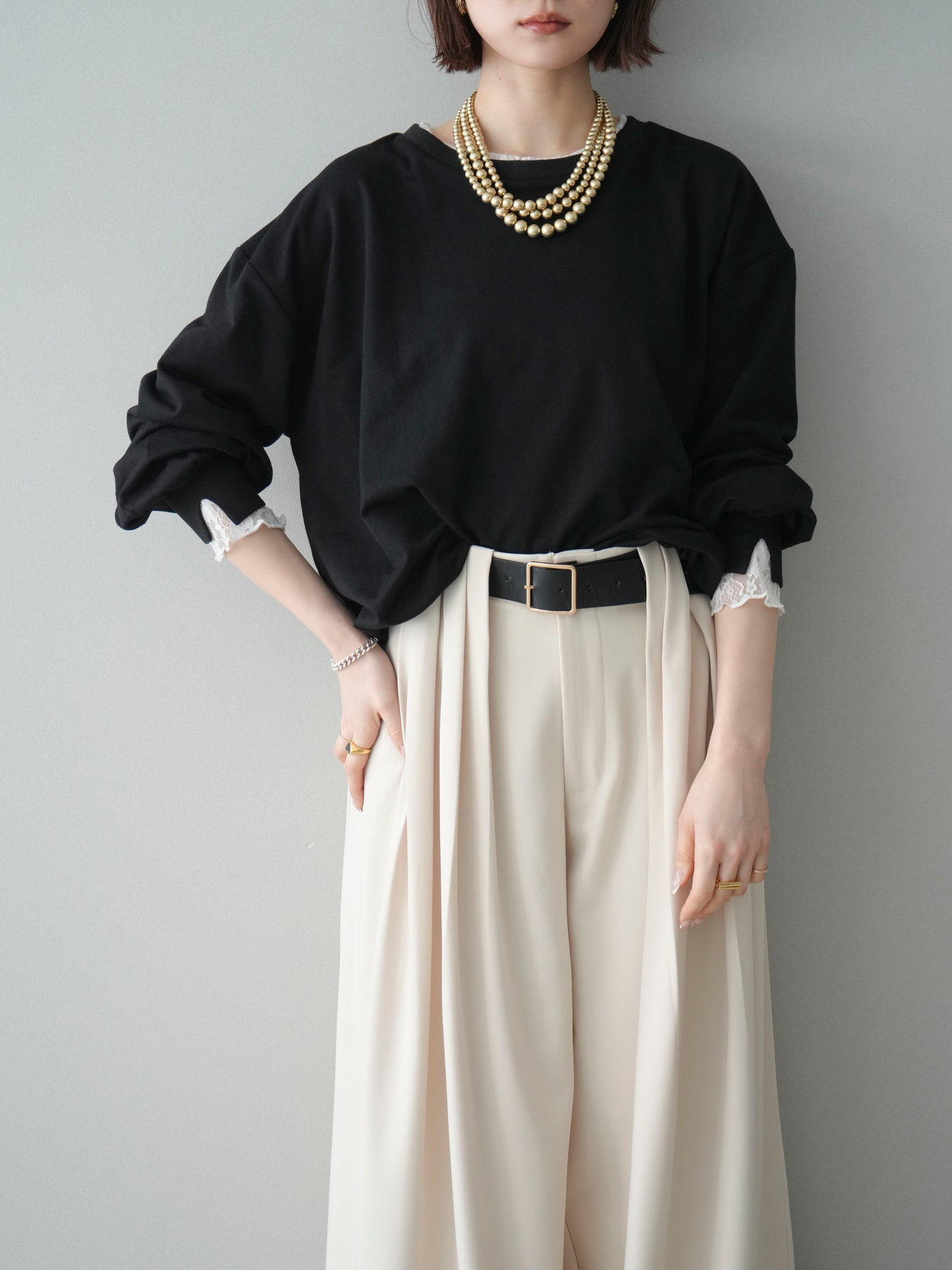 カットソー素材をベースに、袖口へ繊細なレースをあしらったバルーンシルエットのプルオーバー。ふんわりと丸みのあるフォルムが自然な立体感を生み、シンプルながらも着映えするデザインに仕上げています。程よくゆとりのあるサイズ感でリラックスした着心地ながら、レースの透け感が軽やかさと女性らしさをプラス。デイリー使いはもちろん、きれいめなスタイリングにも取り入れやすい一着です。 ※ボトムス、キャミソール(インナー)以外の商品は一律でインナーは付属していません。