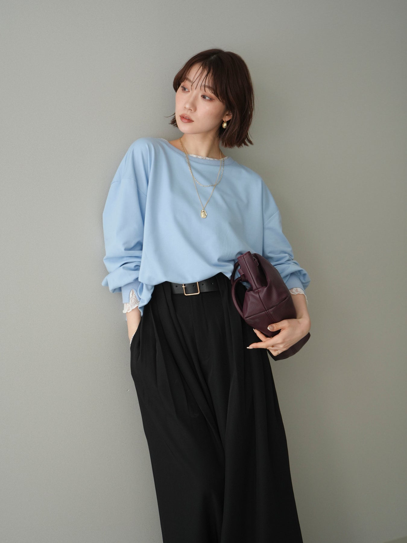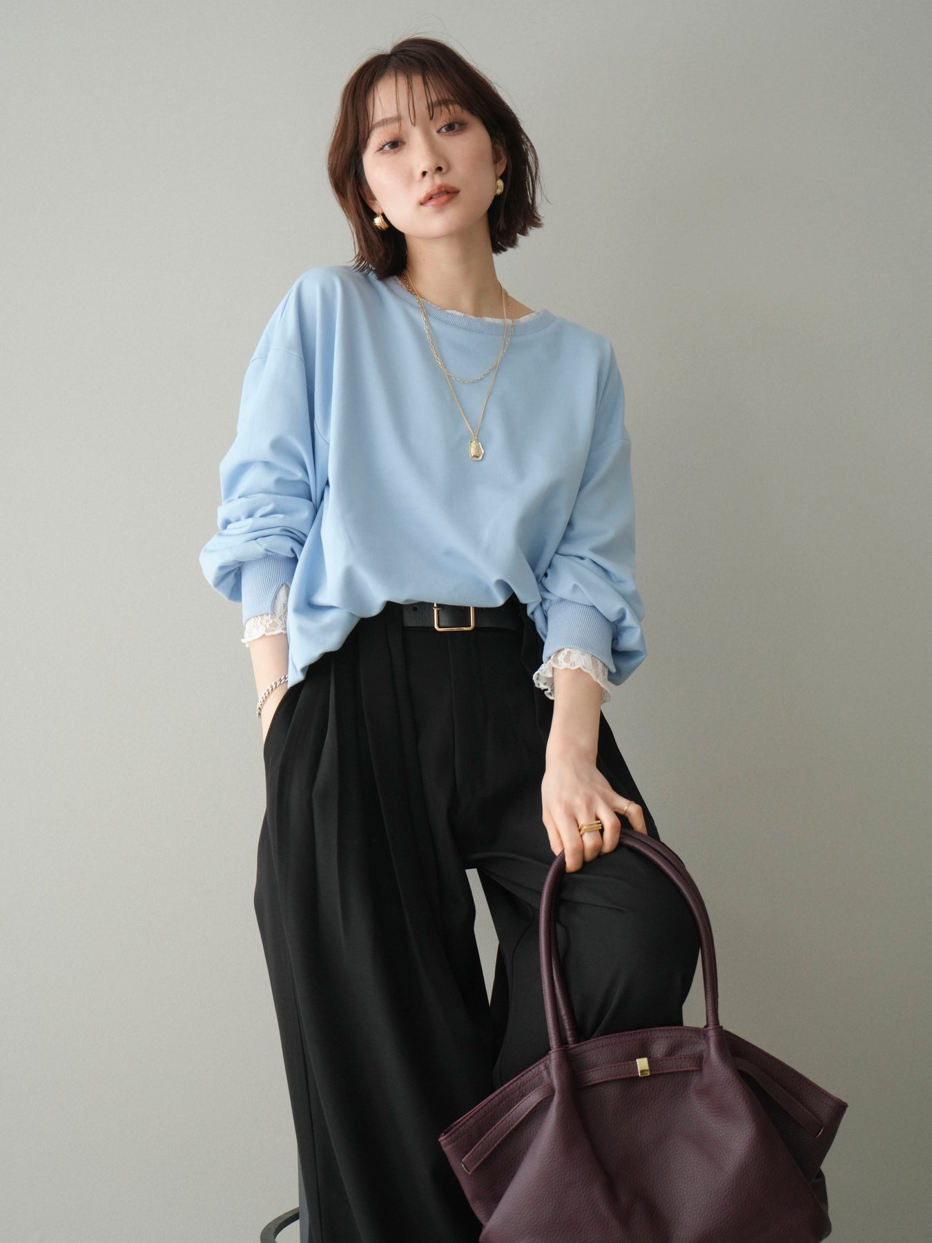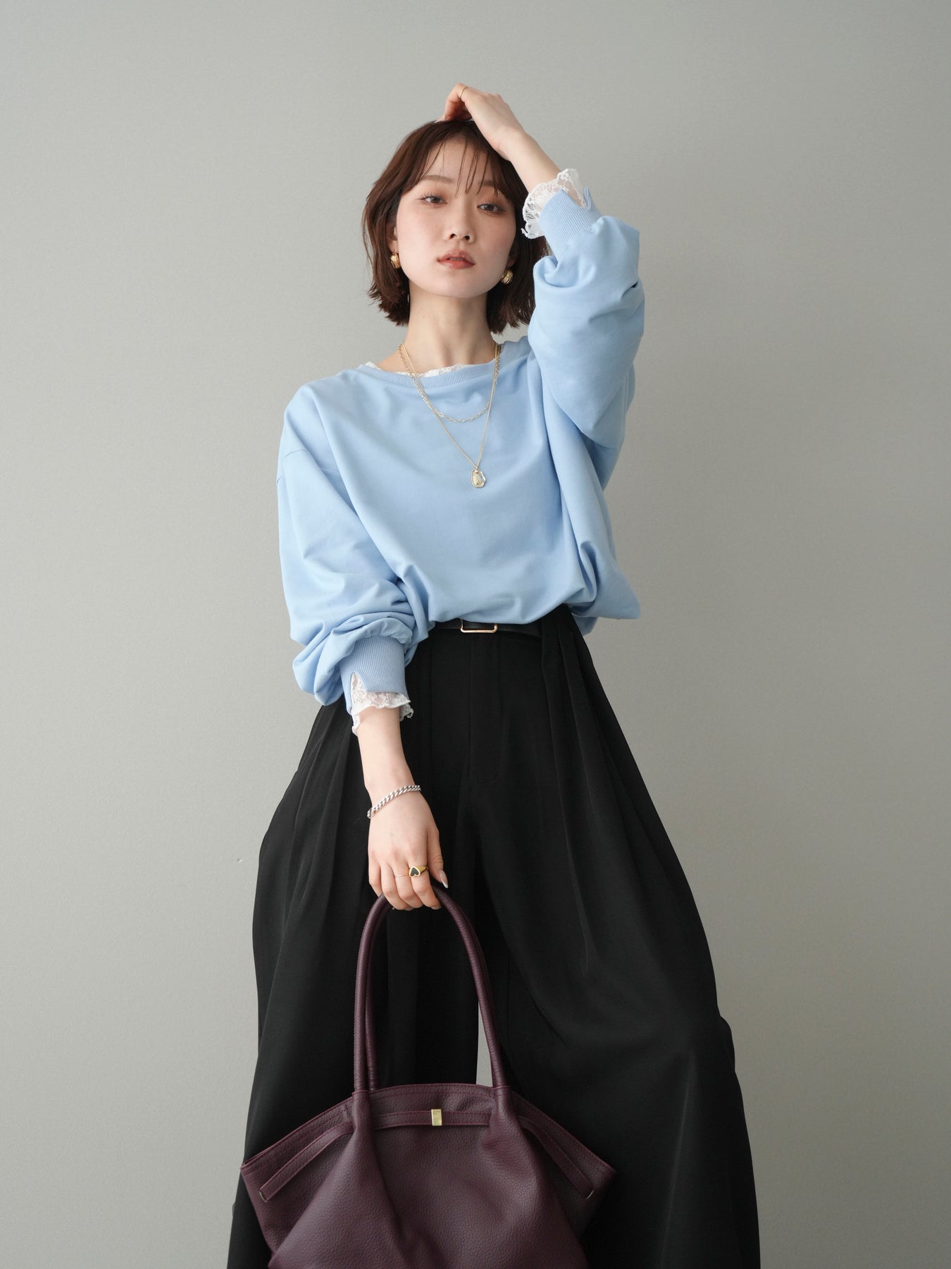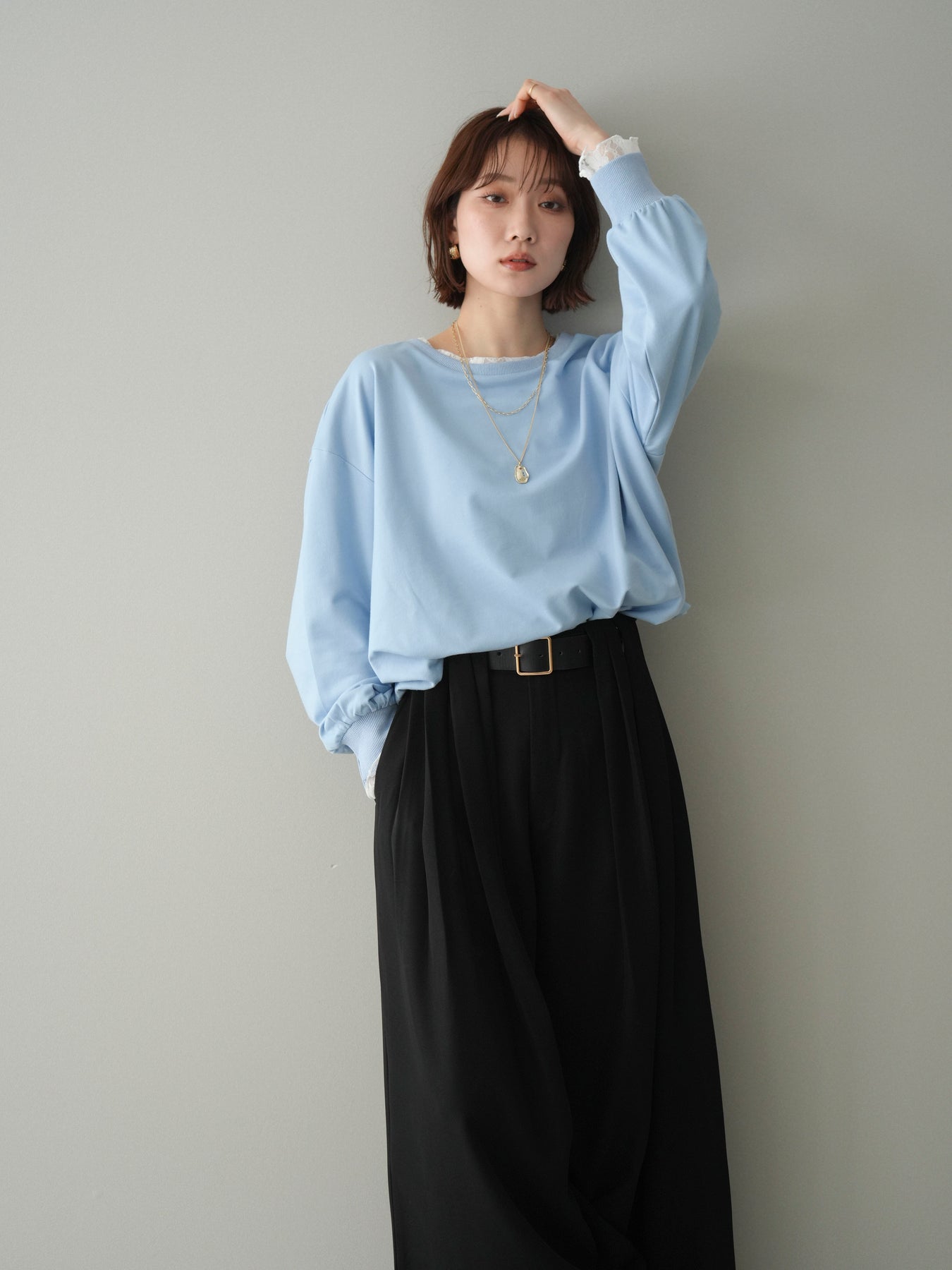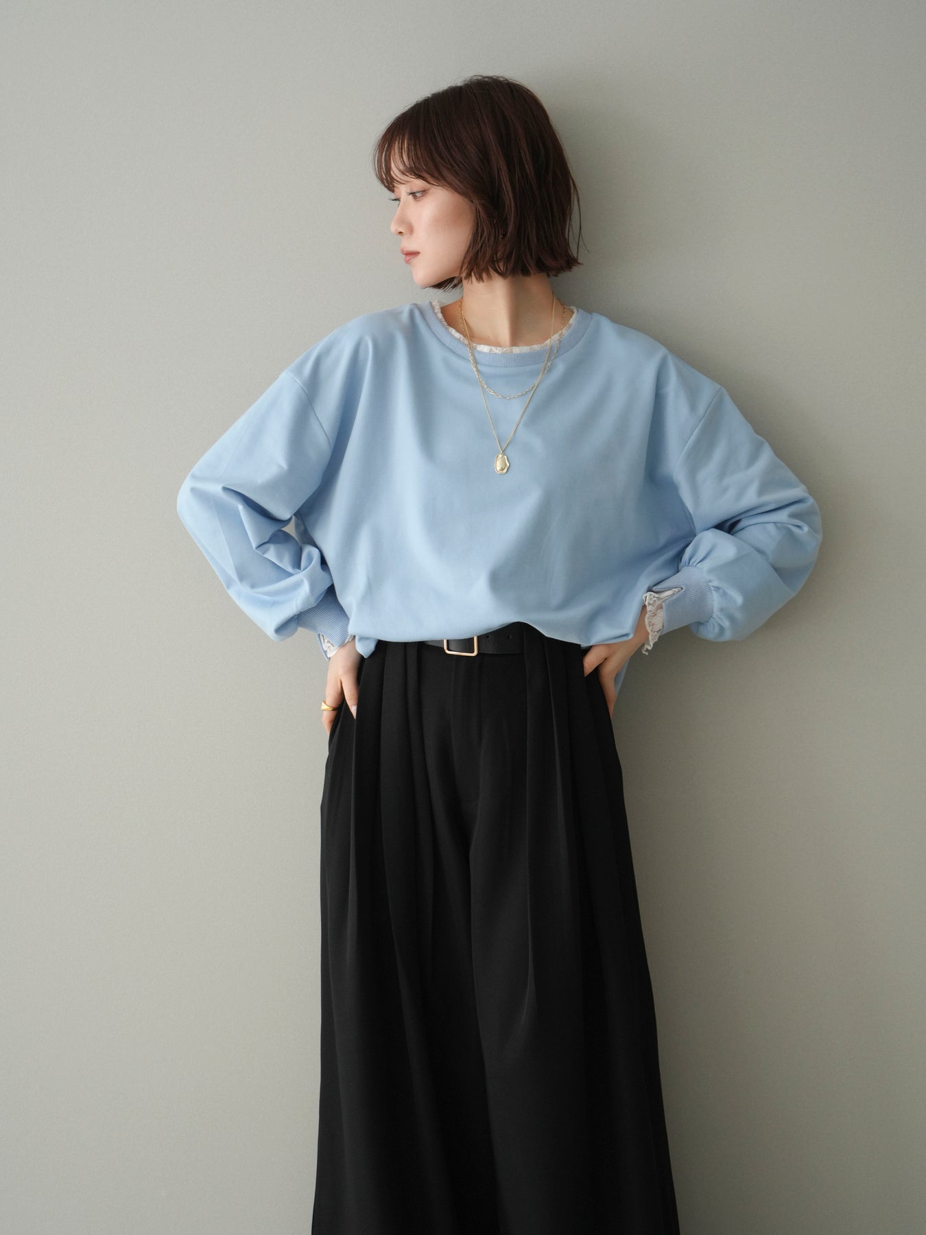 カットソー素材をベースに、袖口へ繊細なレースをあしらったバルーンシルエットのプルオーバー。ふんわりと丸みのあるフォルムが自然な立体感を生み、シンプルながらも着映えするデザインに仕上げています。程よくゆとりのあるサイズ感でリラックスした着心地ながら、レースの透け感が軽やかさと女性らしさをプラス。デイリー使いはもちろん、きれいめなスタイリングにも取り入れやすい一着です。 ※ボトムス、キャミソール(インナー)以外の商品は一律でインナーは付属していません。