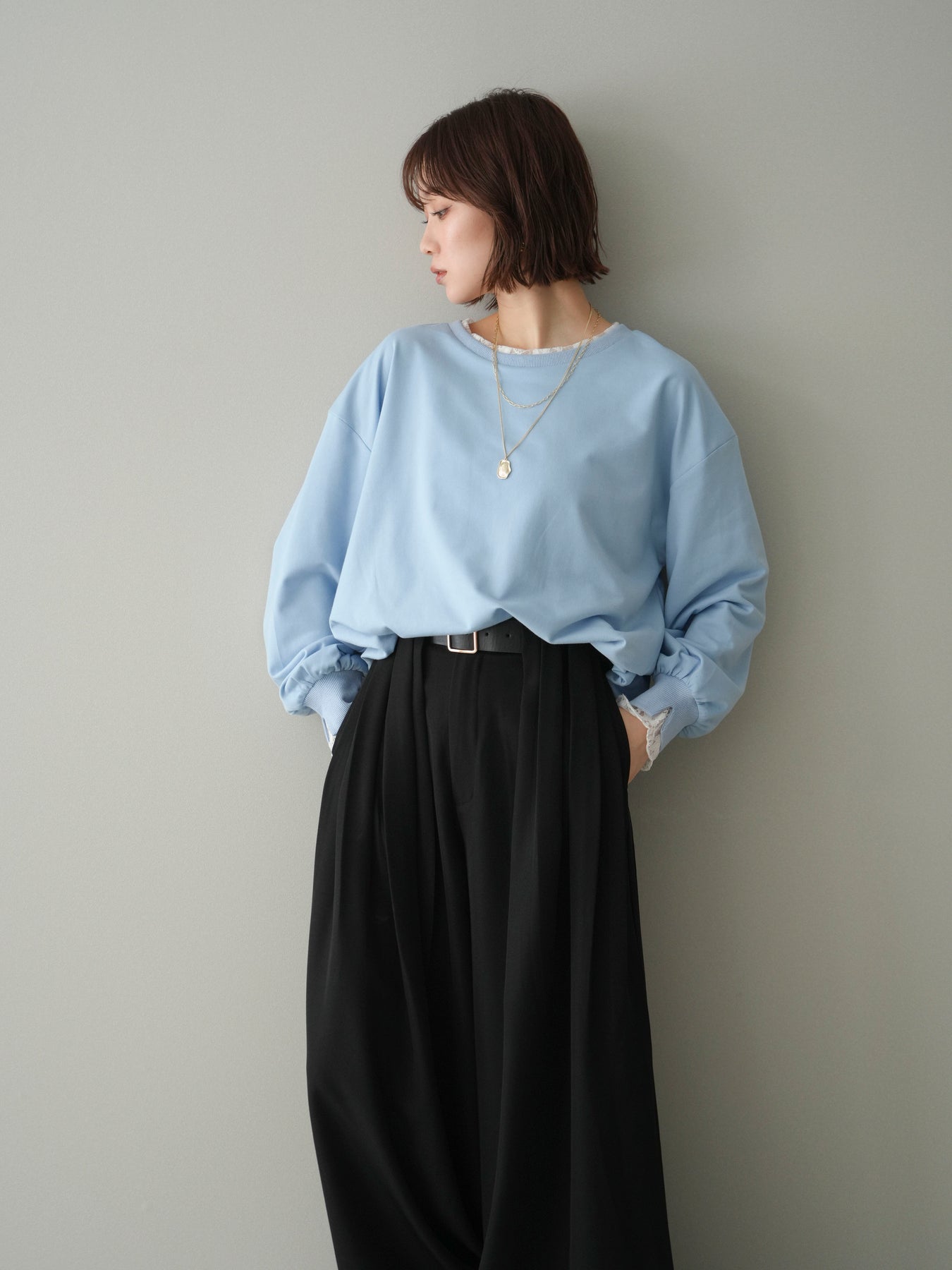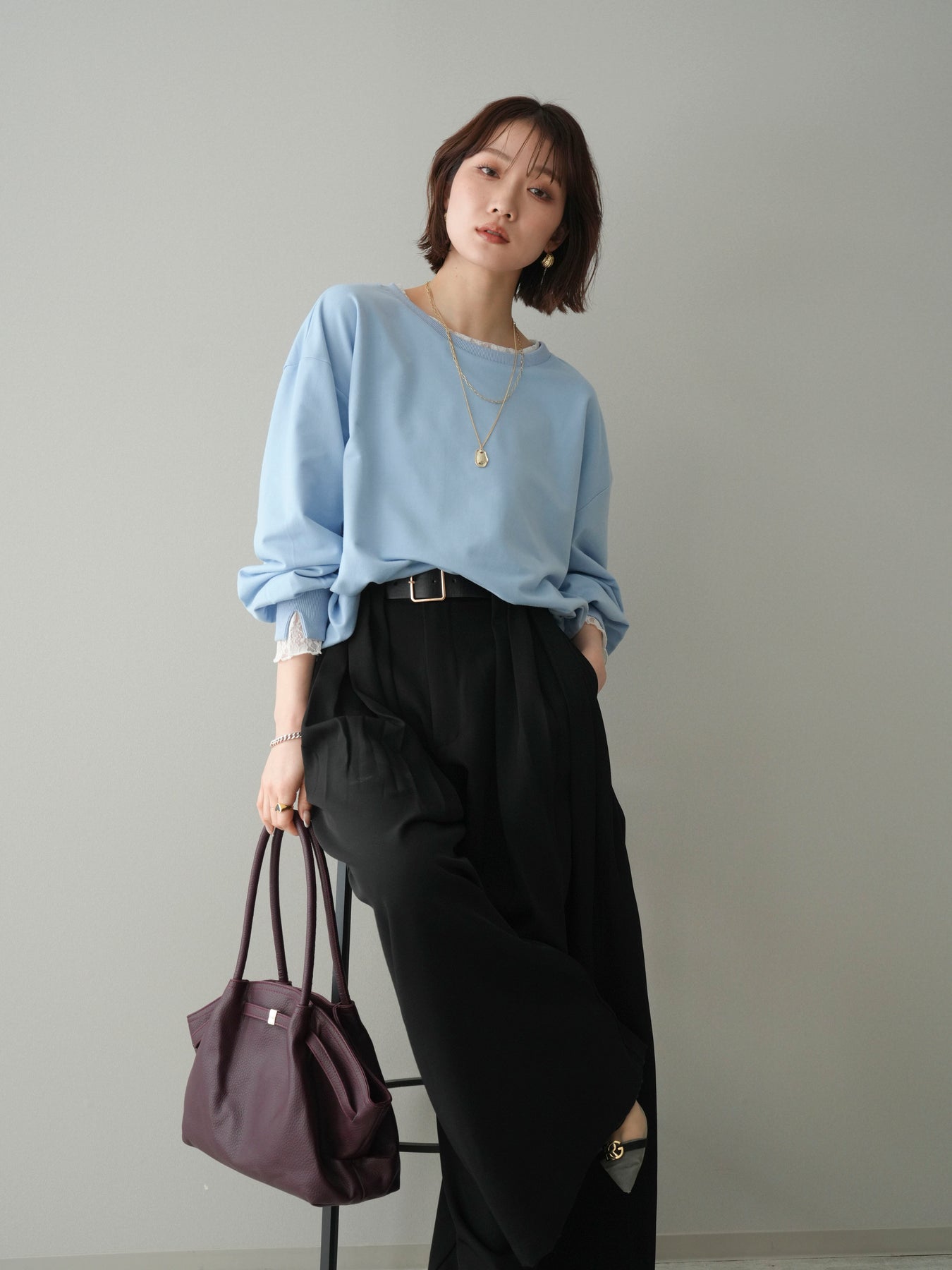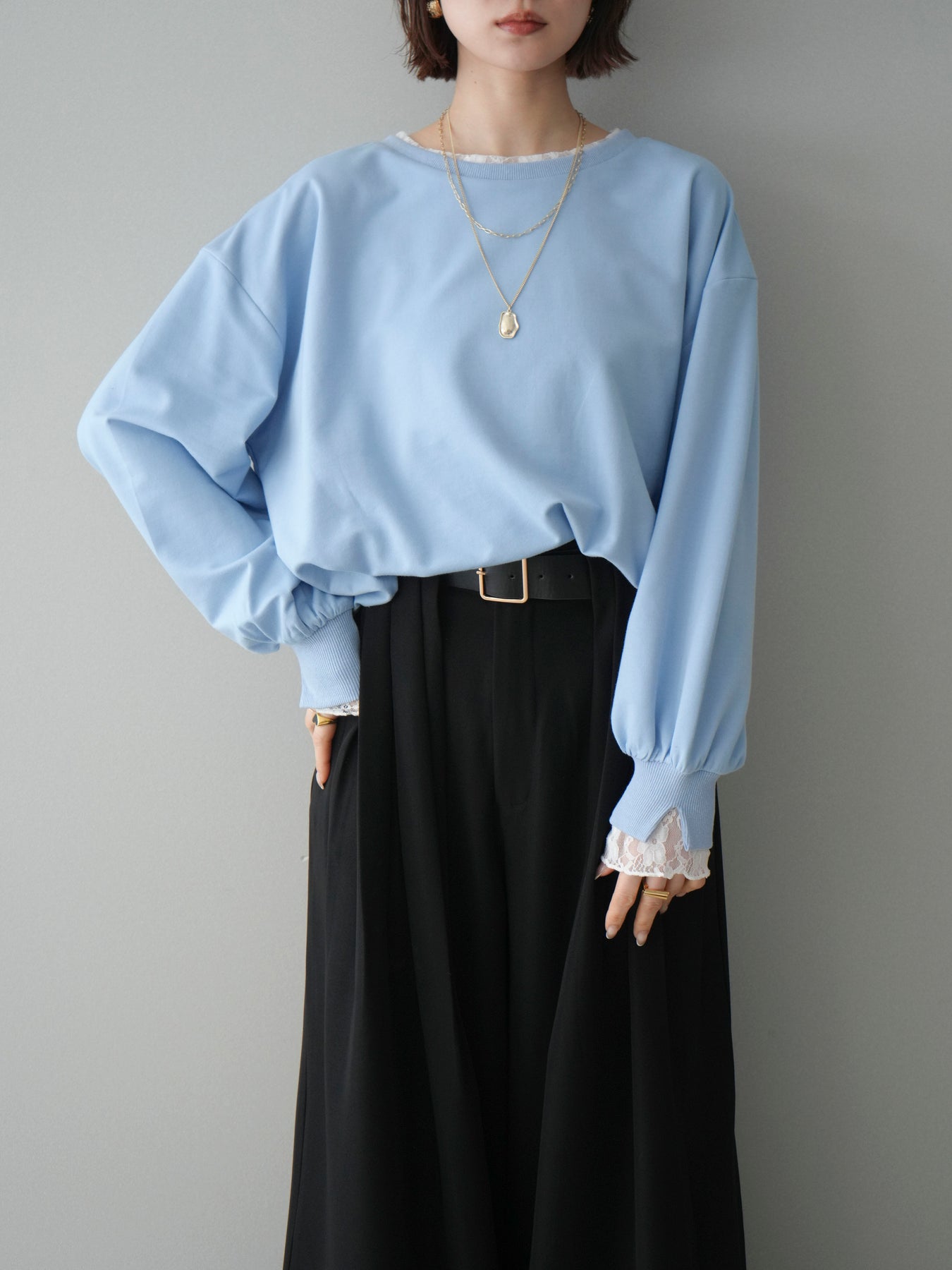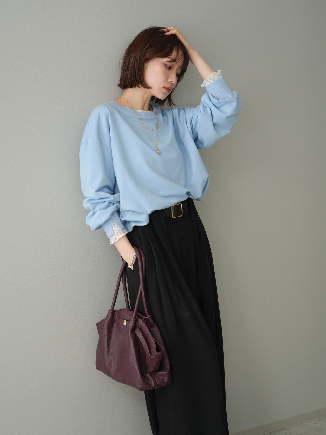 カットソー素材をベースに、袖口へ繊細なレースをあしらったバルーンシルエットのプルオーバー。ふんわりと丸みのあるフォルムが自然な立体感を生み、シンプルながらも着映えするデザインに仕上げています。程よくゆとりのあるサイズ感でリラックスした着心地ながら、レースの透け感が軽やかさと女性らしさをプラス。デイリー使いはもちろん、きれいめなスタイリングにも取り入れやすい一着です。 ※ボトムス、キャミソール(インナー)以外の商品は一律でインナーは付属していません。