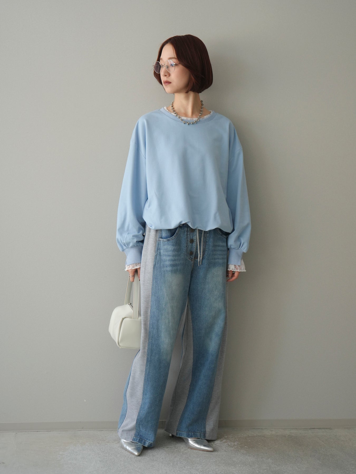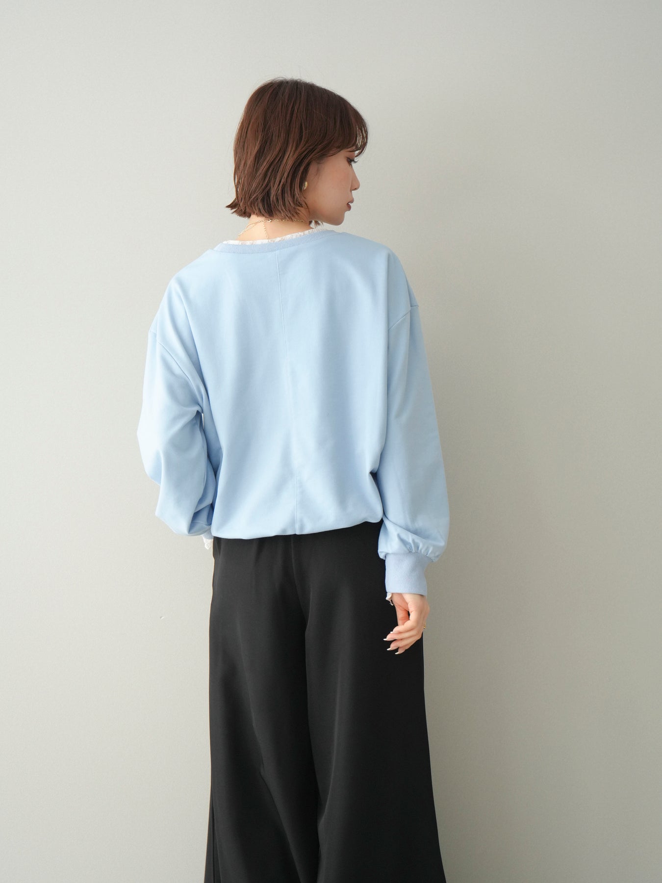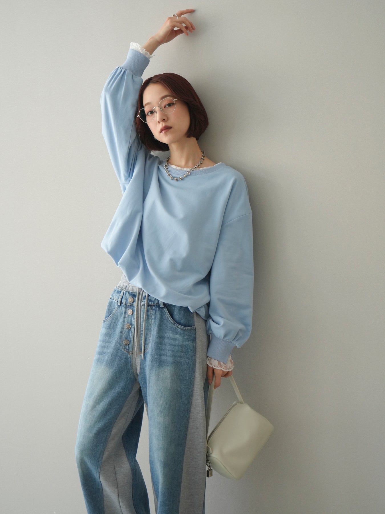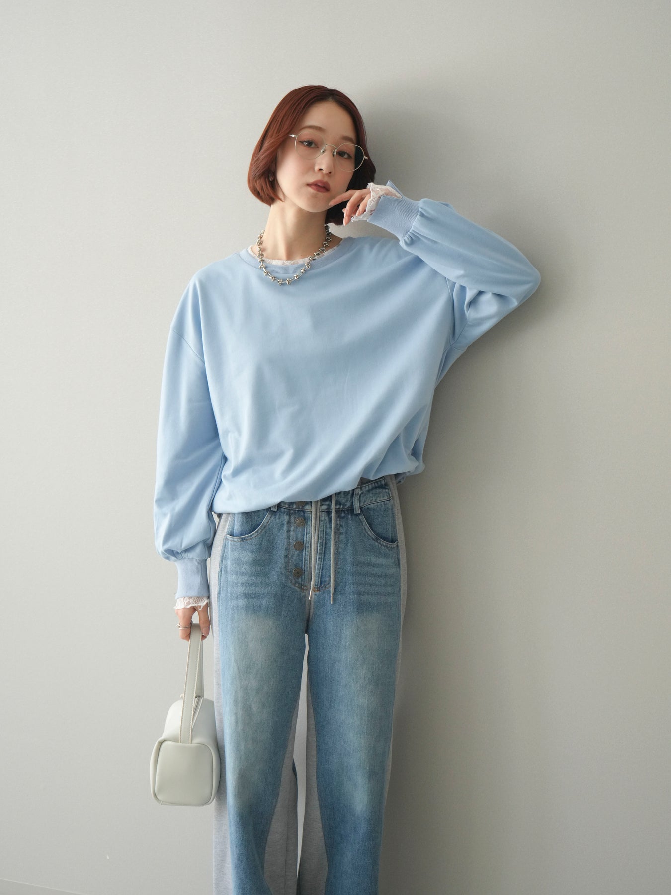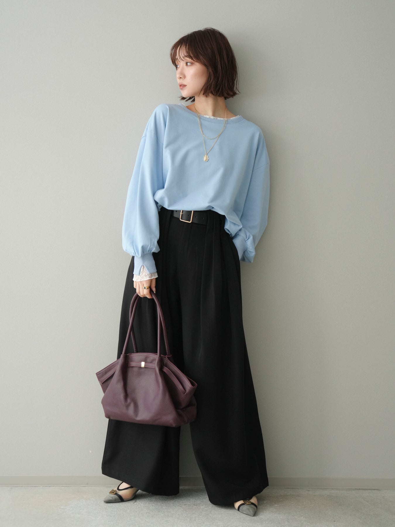 カットソー素材をベースに、袖口へ繊細なレースをあしらったバルーンシルエットのプルオーバー。ふんわりと丸みのあるフォルムが自然な立体感を生み、シンプルながらも着映えするデザインに仕上げています。程よくゆとりのあるサイズ感でリラックスした着心地ながら、レースの透け感が軽やかさと女性らしさをプラス。デイリー使いはもちろん、きれいめなスタイリングにも取り入れやすい一着です。 ※ボトムス、キャミソール(インナー)以外の商品は一律でインナーは付属していません。