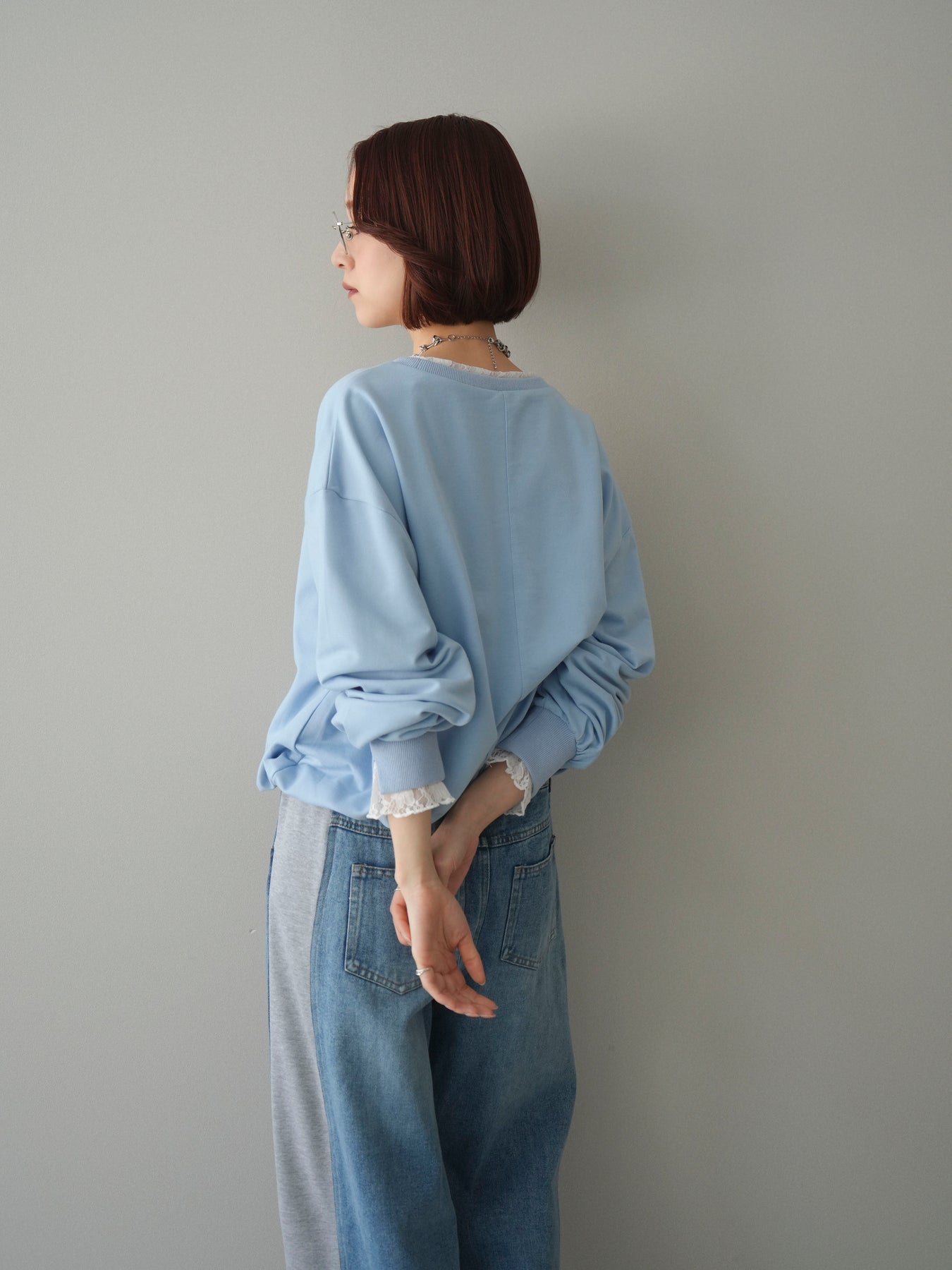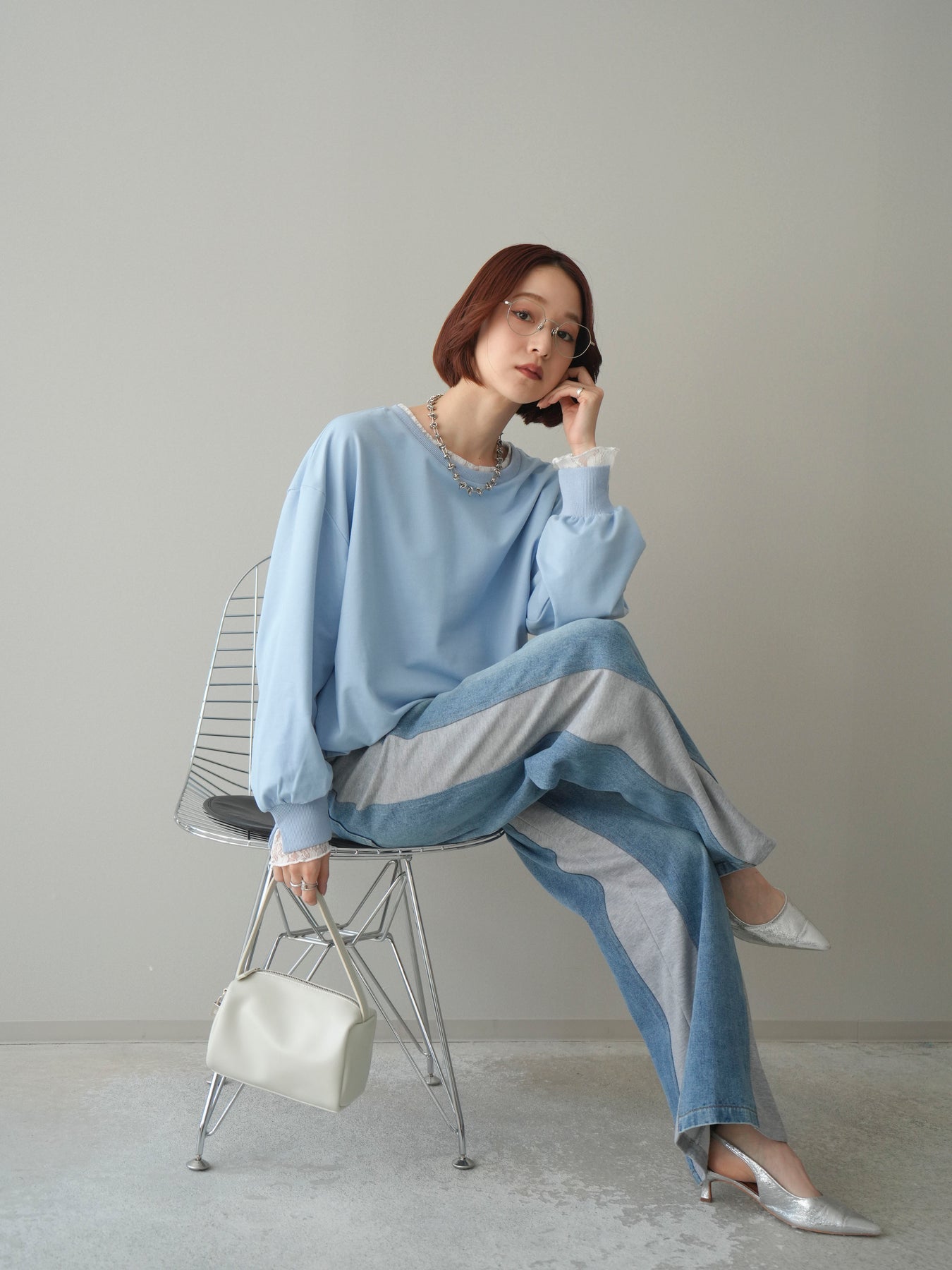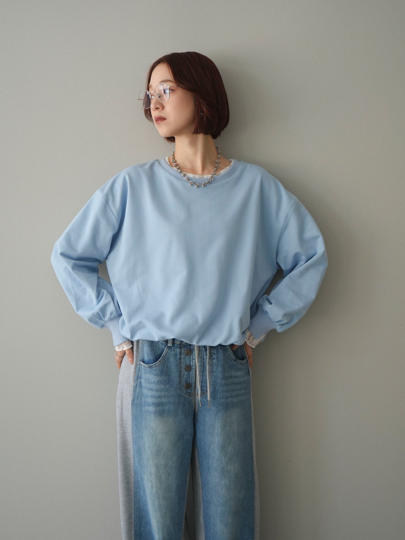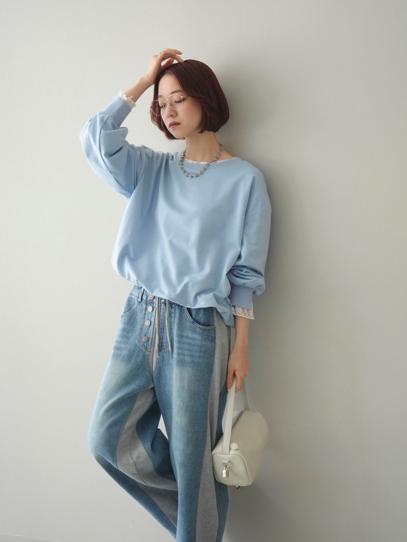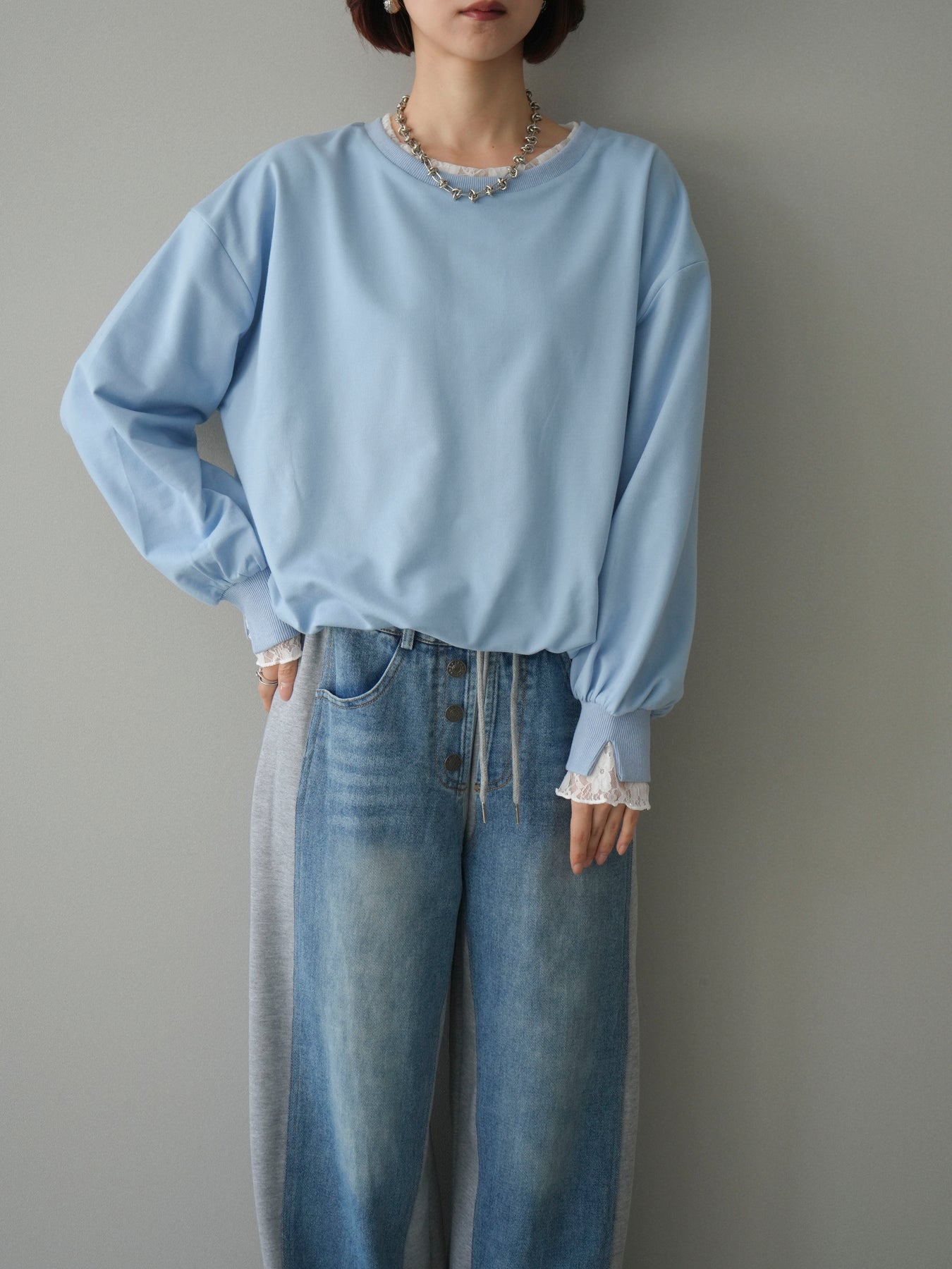 カットソー素材をベースに、袖口へ繊細なレースをあしらったバルーンシルエットのプルオーバー。ふんわりと丸みのあるフォルムが自然な立体感を生み、シンプルながらも着映えするデザインに仕上げています。程よくゆとりのあるサイズ感でリラックスした着心地ながら、レースの透け感が軽やかさと女性らしさをプラス。デイリー使いはもちろん、きれいめなスタイリングにも取り入れやすい一着です。 ※ボトムス、キャミソール(インナー)以外の商品は一律でインナーは付属していません。