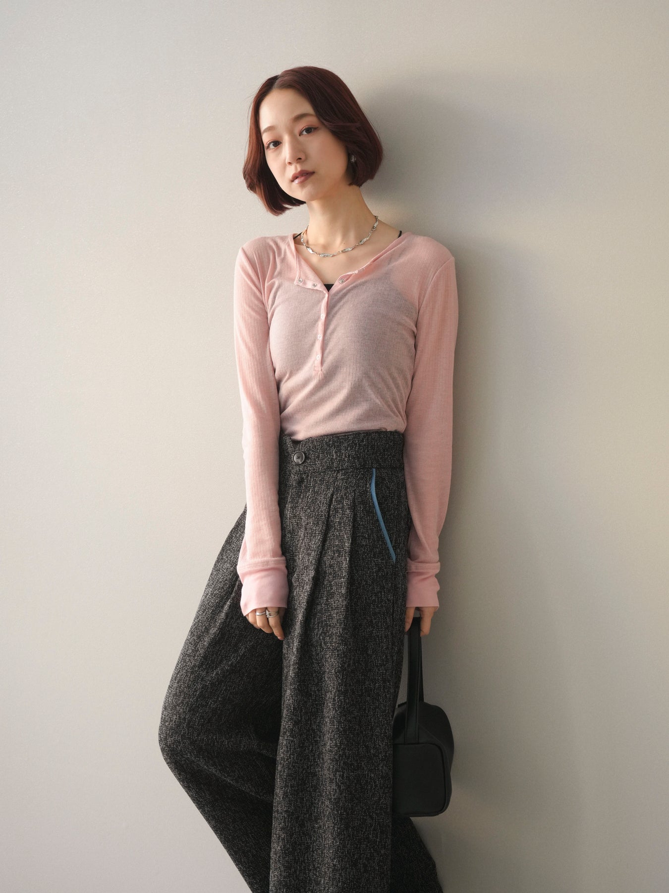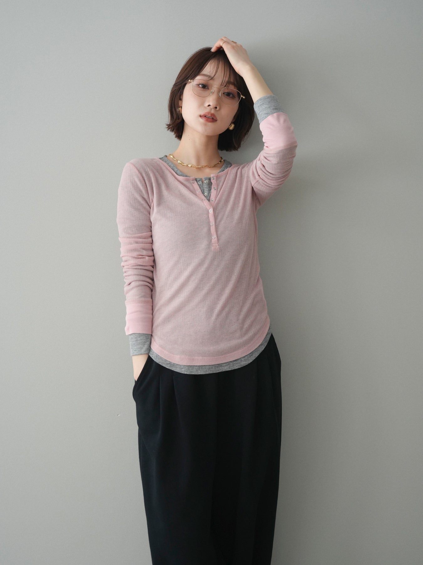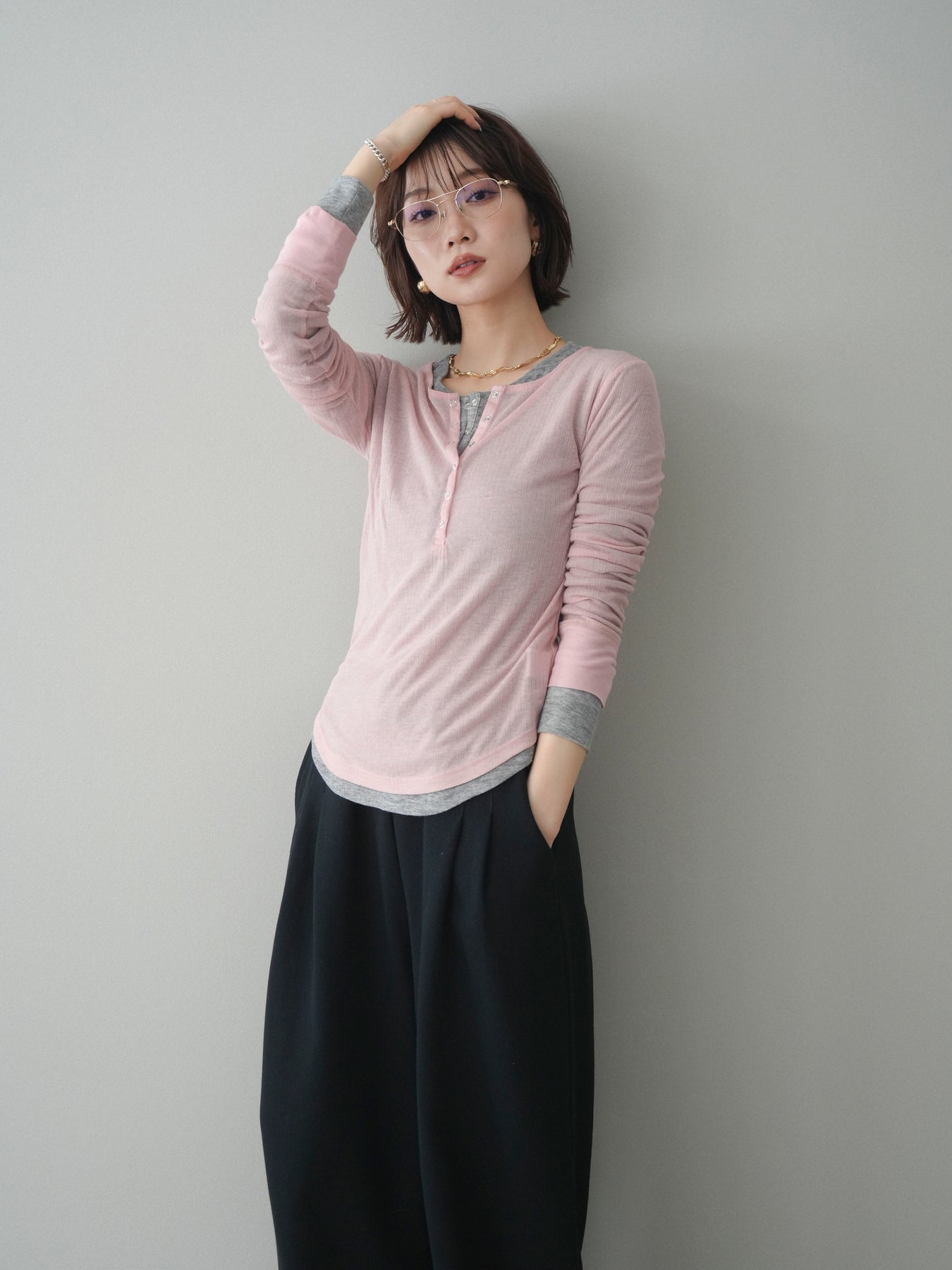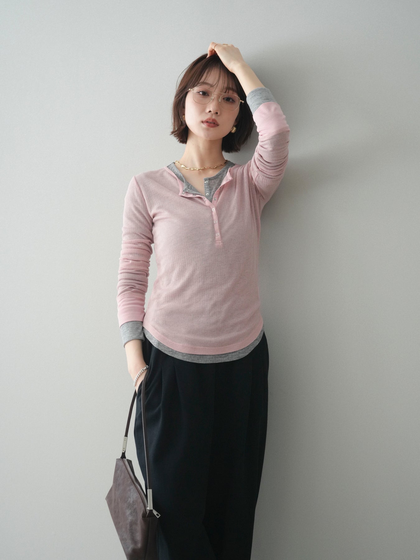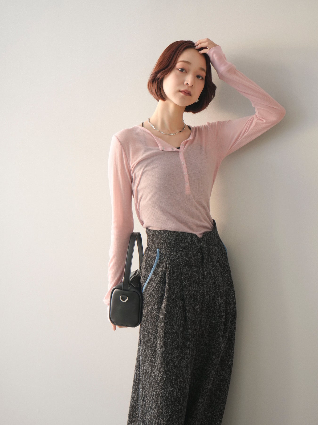 程よい透け感のあるシアーリブ素材を使用し、軽やかで抜け感のある印象に仕上げたヘンリーネックロンT。縦ラインを強調するリブ編みがすっきりとしたシルエットを演出し、フロントのヘンリーネックデザインがさりげないアクセントに。柔らかな着心地でレイヤードもしやすく、一枚着としてはもちろん、ジャケットやベストのインナーとしても活躍します。デイリーからきれいめまで幅広いスタイリングに取り入れやすい一着です。 ※ボトムス、キャミソール(インナー)以外の商品は一律でインナーは付属していません。